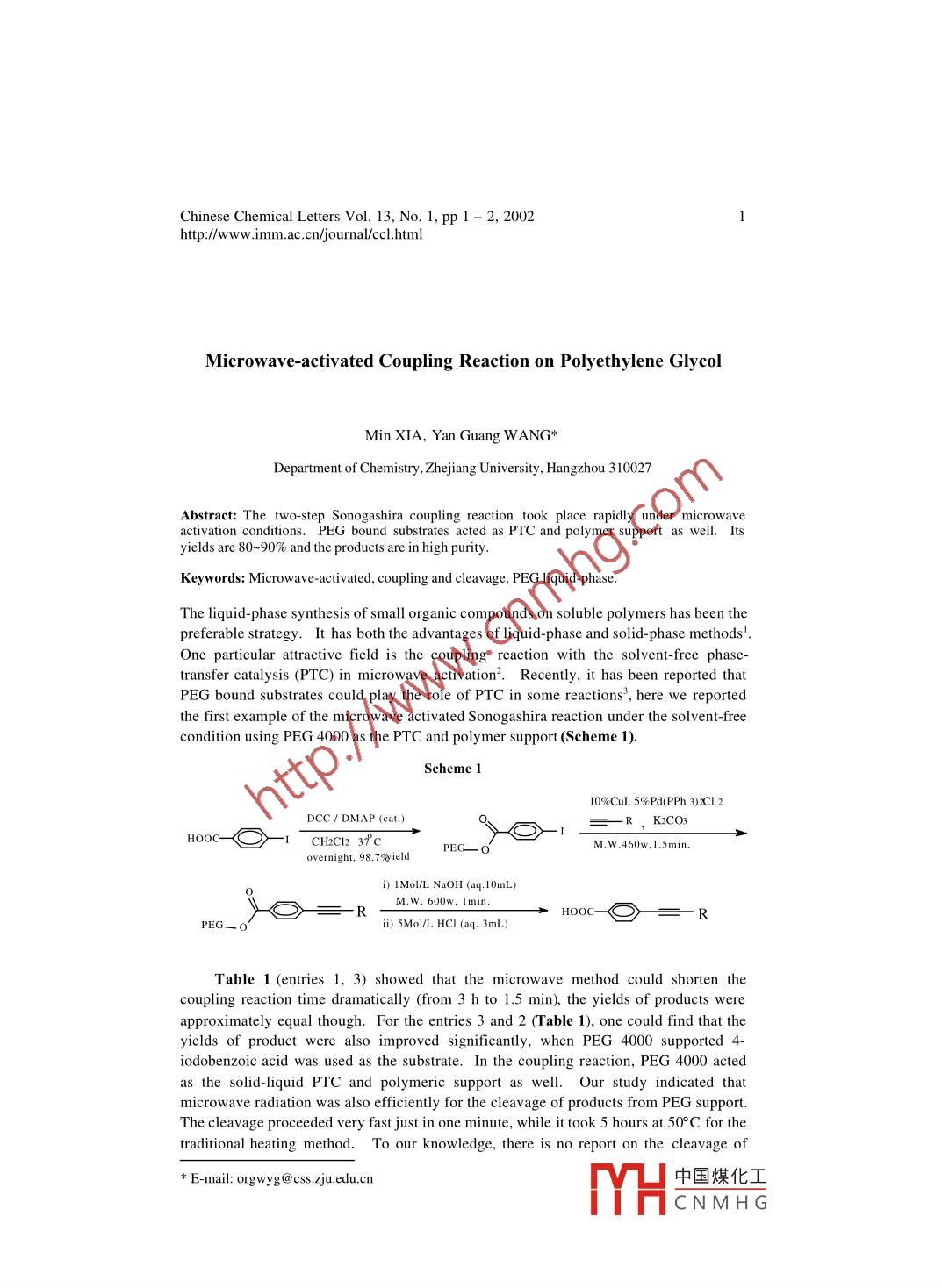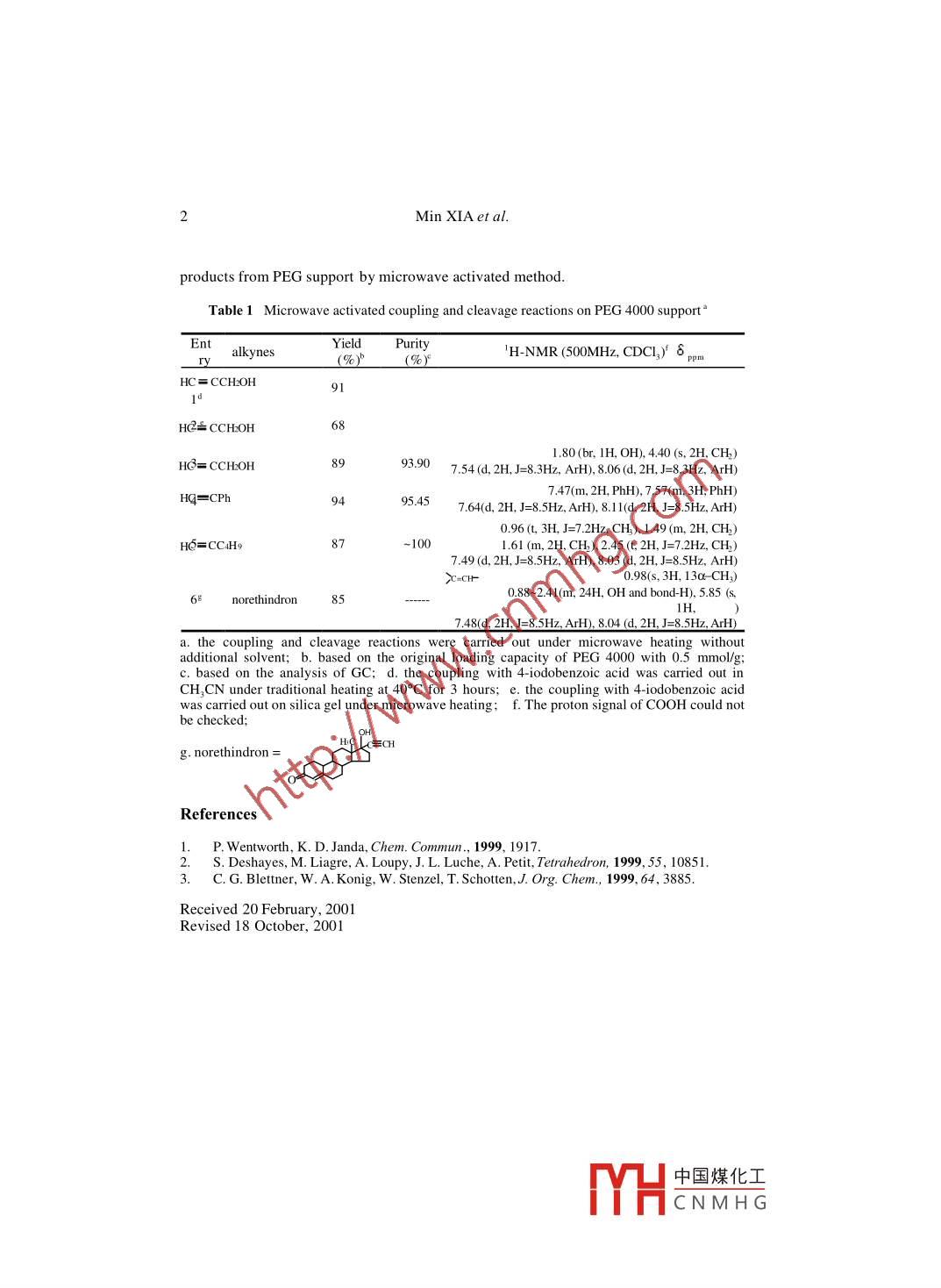 Chinese Chemical Letters Vol. 13, No.1, pp 1 - 2, 20021http://www.imm.ac.cn/journalcc.htmlMicrowave- activated Coupling Reaction on Polyethylene GlycolMin XIA, Yan Guang WANG*Department of Chemistry, Zhejiang University, Hangzhou 310027Abstract: The two-step Sonogashira coupling reaction took place rapidly under microwave :activation conditions. PEG bound substrates acted as PTC and polymer support as well. Itsyields are 80~90% and the products are in high purity.Keywords: Microwave activated, coupling and cleavage, PEG liquid- phase.The liquid-phase synthesis of small organic compounds on soluble polymers has been thepreferable strategy. It has both the advantages of liquid-phase and solid-phase methods'.One particular attractive field is the coupling reaction with the solvent-free phase-transfer catalysis (PTC) in microwave activation'. Recently, it has been reported thatPEG bound substrates could play the role of PTC in some reactions', here we reportedthe first example of the microwave activated Sonogashira reaction under the solvent-freecondition using PEG 4000 as the PTC and polymer support (Scheme 1).Scheme 110%Cul, 5%Pd(PPh 3)XCl 2DCC 1 DMAP (cat)=-R,K2CO3HOOC- ICH2Cl2 3fc<0-1M.W.460w,1.5min.PEG- o'overnight, 98.75vieldi) IMol/L NaOH (aq. 10mL)M.W.600w. lmin.一HOC-O>-=--Ri) 5Mol/L HCI (aq. 3mL)Table 1 (entries 1, 3) showed that the microwave method could shorten thecoupling reaction time dramatically (from 3 h to 1.5 min), the yields of products wereapproximately equal though. For the entries 3 and 2 (Table 1), one could find that theyields of product were also improved significantly, when PEG 4000 supported 4-iodobenzoic acid was used as the substrate. In the coupling reaction, PEG 4000 actedas the solid-liquid PTC and polymeric support as well. Our study indicated thatmicrowave radiation was also efficiently for the cleavage of products from PEG support.The cleavage proceeded very fast just in one minute, while it took 5 hours at 50°C for thetraditional heating method. To our knowledge, there is no report on the cleavage of* E-mail: orgwyg @ css.zju.edu.cn中國煤化工MHCNMH G.Min XIA et al.products from PEG support by microwave activated method.Table 1 Microwave activated coupling and cleavage reactions on PEG 4000 support°EntYield Purityalkynes'H-NMR (500MHz, CDCI,)' δ pm(%)(%)"HC = CCHOH91dHC= CCHOH681.80(br, lH, OH), 4.40 (s, 2H, CH2)HC= CCH2OH893.90 7.54 (d, 2H, J=8.3Hz ArH,8.067.47(m, 2H, PhH), 7.57(m, 3H, PhH)Hq=CPh95.457.64(d, 2H, J=8.5Hz, ArH), 8.1 l(d, 2H, J=8.5Hz, ArH)0.96 (1, 3H, J=7.2Hz, CH), 1.49 (m, 2H, CH2)HE=CCH9-1001.61 (m, 2H, CH), 2.45 (t, 2H, J=7.2Hz, CH)7.49 (d, 2H, J=8.5Hz, ArH), 8.03 (d, 2H, J=8.5Hz, ArH)c=CIH0.98(s, 3H, 130 CH)0.88~2.41(m, 24H, OH and bond-H), 5.85 (s,norethindron7.48(d, 2H, J=8.5Hz. ArH), 8.04 (d, 2H, J=8.5Hz, ArH)a. the coupling and cleavage reactions were carried out under microwave heating withoutadditional solvent; b. based on the original loading capacity of PEG 4000 with 0.5 mmol/g;c. based on the analysis of GC; d. the coupling with 4-iodobenzoic acid was carried out inCH.CN under traditional heating at 40°C for 3 hours; e. the coupling with 4 iodobenzoic acidwas carried out on silica gel under microwave heating; f. The proton signal of COOH could notbe checked;EkecHg. norethindron =ReferencesP. Wentworth, K. D. Janda, Chem. Commun, 1999, 1917.S. Deshayes, M. Liagre, A. Loupy, J. L. Luche, A. Petit, Tetrahedron,1999 .55. 10851.3. C. G. Blettner, W. A. Konig, W. Stenzel, T. Schotten,J. Org. Chem., 1999, 64, 3885.Received 20 February, 2001Revised 18 October, 2001中國煤化工MHCNMH G.