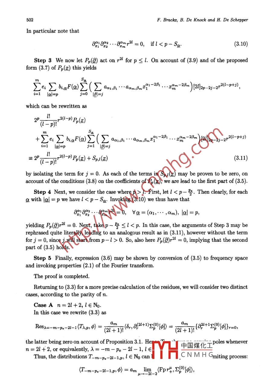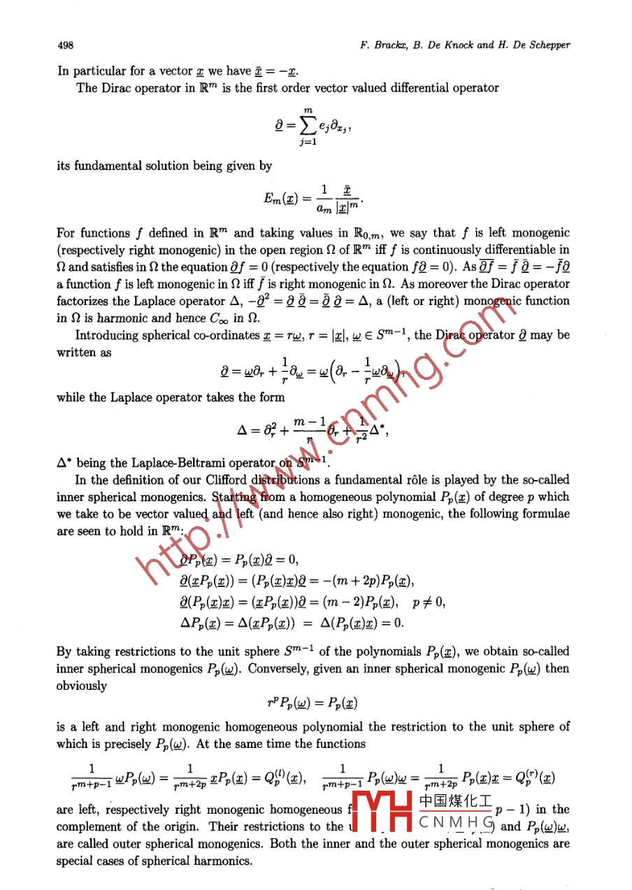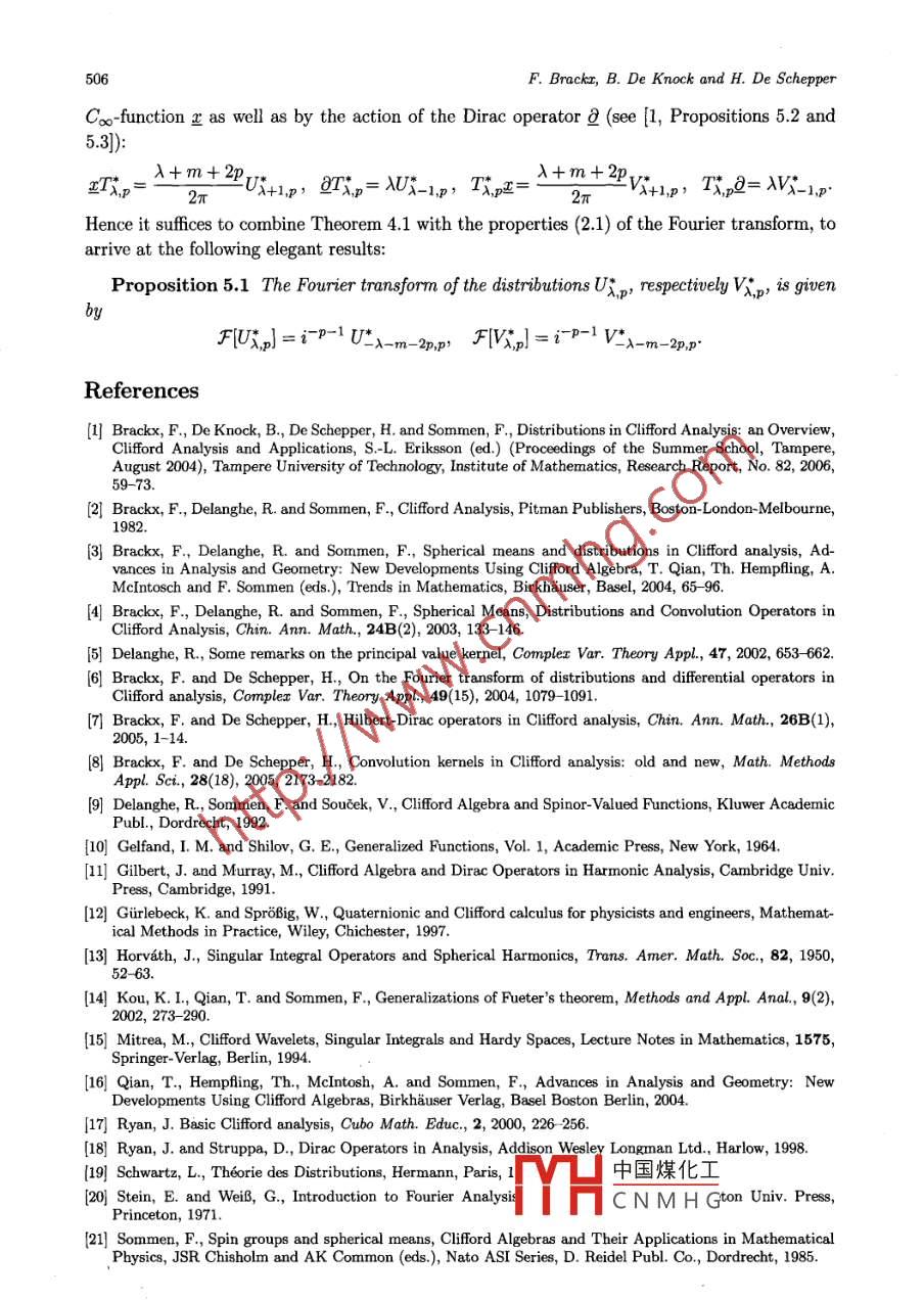 Chin. Ann. Math.27B(5), 2006, 495- -506Chinese Annals ofDOI: 10.1007/s11401-006-0053-3Mathematics, Series BC The Editorial Ofice of CAM andSpringer- Verlag Berlin Heidelberg 2006On the Fourier Spectra of Distributionsin Clifford AnalysisFred BRACKX* Bram De KNOCK* Hennie De SCHEPPER*Abstract In recent papers by Brackx, Delanghe and Sommen, some fundamental higherdimensional distributions have been reconsidered in the framework of Clifford analysis,eventually leading to the introduction of four broad classes of new distributions in Euclideanspace. In the current paper we continue the in-depth study of these distributions, morespecifically the study of their behaviour in frequency space, thus extending classical resultsof harmonic analysis.Keywords Fourier spectra, Distributions, Cliford analysis2000 MR Subject Classifcation 30G35, 46F101 IntroductionDuring the last fty years, Cliford analysis has gained interest as a comprehensive functiontheory offering a direct, elegant and powerful generalization to higher dimension of the theoryof holomorphic functions in the complex plane. In its most simple but still useful setting,fat m-dimensional Euclidean space, Cliford analysis is centered around so-called monogenicfunctions, i.e. null solutions of the Cliford-vector valued Dirac operatora=Ee38x,where (e1,... , em) forms an orthogonal basis for the quadratic space Rm underlying the con-struction of the Cliford algebra Ro,m. Monogenic functions have a special relationship withharmonic functions of several variables in that they are refining their properties. Note for in-stance that each harmonic function can be split into a so-called inner and an outer monogenicfunction, and that a real harmonic function is always the real part of a monogenic one, whichdoes not need to be the case for a harmonic function of several cqmplex variables. The reason isthat, as does the Cauchy -Riemann operator in the complex plane, the rotation- invariant Diracoperator factorizes the m-dimensional Laplace operator. It hence is not surprising that Cliffordanalysis often leads to refinements or generalizations of classical results from harmonic analysis.In [3] and [4] four broad families of distributions in Euclidean space T.,p,Ux,p, V.,p andWx,p, depending on parametersλ∈C andp∈No= {0,1, 2,..}, were introduced and studiedin the framework of Cliford analysis. These distributiqne ol1 errina from theoroady cassically中國煤化工known distributionT\= Fpr李TYHCNMHGManuscript received January 26, 2006.*Ciford Research Group, Department of Mathematical Analysis, Faculty of Engineering, Ghent University,GalgIaan 2, 9000 Gent, Belgium. E mail: fb@cage.UGent.be bdk@cage.UGent.be hds@cage.UGent.be496F. Brackx, B. De Knock and H. De Schepperdepending on the complex parameter 入. Here Fp is the fundamental distribution “initeparts" on the real line, and spherical co-ordinates have been used to convert an originallym-dimensional distribution into one acting on the real line. More precisely,(Tx,中) = QmFp/*,r)+m-1[[h J_ . 中)(S(@)]) = (r+)-1+0)101),m-1where am is the area of the unit sphere sm- 1 in IRm and 20[中] denotes the so-called sphericalmean of the testing function φ, obtained through integration over the unit sphere. In these,spherical co- ordinates not only reflect the“spherical" philosophy of the approach, encompassingall dimensions at once as opposed to a cartesian or tensorial approach with products of one-dimensional phenomena, but also enable to carry out the explicit calculations in one dimensionafter which they are exported again to the original setting of Euclidean space.An analogous approach underlies the definition of the four families of distributions men-tioned above, which respectively involve the inner spherical monogenics Pp(四) (p∈No), ie,restrictions to the unit sphere of monogenic polynomials which are vector valued and homogeneous of degree p, and the related outer spherical monogenics Pp(@)業(yè),業(yè)Pp(四) and業(yè)Pp(四)4.Here, the spherical philosophy requires the introduction of generalized spherical means, wherethe involved spherical monogenic (inner or outer) appears in the integrand over the unit sphere.However, in view of the Fourier transformations aimed at, the distributions TA,p and their nor-malized versions T*。are now reconsidered from a cartesian point of view in Section 3 of thepaper.Any of the distributions in these families may be considered as a kernel (K) for a convolu-tion operator (L): L[f]= K*f. As is well known, see [20], such an operator may be realizedin frequency space by a multiplication operator, its so- clldl Fourier symbo: F[f]] = aF[f],where a = F[K]. This underlines the importance of calculating the Fourier transforms of thedistributions under consideration. It is worth mentioning that, for specifc values of the para-meters λ∈C and p∈No, those distributions turn into known kernel functions in harmonic andClifford analysis: up to constants, U_ m,0 reduces to Pv荒,the higher dimensional analogue ofthe so- called "Principal Value" distribution on the real line which constitutes the convolutionkernel for the higher dimensional Hilbert transform (see [5- 8]); U_ m+1,0 reduces to the funda-mental solution of the Dirac operator 2, while T_ m+2,0 is nothing but the fundamental solutionof the Laplace operator; furthermore, for λ = -p the inner and outer spherical monogenicsPp(4), Pp(@)4 and wP(4) are recovered; etc. Moreover when λ = -m- P the four fami-lies provide examples of so calld principal value distributions (see [13, 20]), being tempereddistributions obtained by a limiting process:(K,φ) = lim) JRM\B(0,e)K(x)中(x)dV(),φ∈ S(R").In [13, 20] much attention is paid to the calculation of the Fourier transforms of the principalvalue distributions where the function K takes the formK(x)=NC,出中國煤化工YHCNMHGwith k∈L2(Sm-1) such thatJ_k()dS(四) = 0.On the Fourier Spectru of Distributions497Such kind of principal value distrib