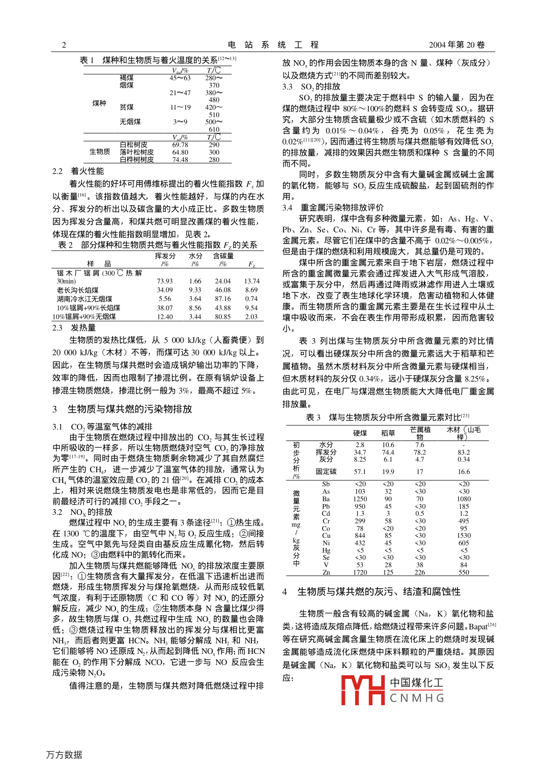 第20卷第1期電站系統(tǒng)工程VoL 20 No. 12004年1月Power System EngineeringJan.2004文章編號:1005-006X(2004)01-0001生物質(zhì)與煤共燃研究段菁春1肖軍2王杰林3莊新國2中國科學(xué)院廣州地球化學(xué)研究所,2中國地質(zhì)大學(xué)資源學(xué)院,3秦皇島岀入境檢驗檢疫局)摘要:簡要介紹生物質(zhì)與煤共燃的意義及其應(yīng)用前景。在此基礎(chǔ)上,深λ分析二者共燃的生物質(zhì)預(yù)處理、燃燒特性、污染物排放及共燃灰污、結(jié)渣和腐蝕性、共燃方式及共燃經(jīng)濟性。同時還對所面臨的冋題如:生物質(zhì)體密度、能量密度低,高堿金屬含量帶來的低灰熔點,高氯含量可能帶來的腐蝕,提岀了一些解決辦法。最后對二者共燃的實驗研究進行了較深入地分析。關(guān)鍵詞:生物質(zhì);煤;共燃;可持續(xù)發(fā)展中圖分類號:TK16文獻標識碼:BResearch on Co-firing of Biomass and CoalDUAN Jing-chun, XIAO Jun, WANG Jie-lin, ZHUAN Xin-guoAbstract: Based on the significance and prospect of co-firing of biomass and coal, their biomass preprocessing,combustion characteristics, contamination emission, and its properties of slagging, fouling and abrasiveness are analyzedIt also discusses co-firing modes and co-firing economic evaluation. Further more, it proposes some solutions to suchproblems in co-firing of biomass and coal as low bulk density and low energy density of biomass, low melting points ofthe ash due to high contents of alkali oxides and salts in biomass and the corrosion sometimes brought by chlorideFinally, it analyzes the laboratorial results of co-firing of biomass and coal in detailKey words: biomass; coal; co-firing; sustainable development利用煤炭等化石燃料發(fā)電,排放出大量的SO2、NO3CO2以及粉塵等污染物,它們是造成酸雨、臭氧空洞、溫1生物質(zhì)與煤共燃的預(yù)處理室效應(yīng)的罪魁禍首叫。20世紀60年代以來,許多發(fā)達國家為改善環(huán)境紛紛加強了對電廠污染物排放的限制,甚至對盡管生物質(zhì)資源量非常大,但由于生物質(zhì)資源較分散」其體積和能量密度小(如稻殼的體積密度一般為120kgm3CO排放征稅,如丹麥、芬蘭、荷蘭、挪威和瑞典等國左右,林業(yè)加工剩余木材為500kgm左右;而褐煤為560~中國是當今世界最大的煤炭生產(chǎn)和消費國。2001年中國年煤產(chǎn)量達到了1075億t,其中80%直接用于燃燒。近年來600kg/m,煙煤為800~900kgm,無煙煤達14001900在我國一次能源的利用中,煤炭發(fā)電份額一般都在75%左kgm),因此其運輸、儲存費用相對較高,且其利用半徑右,據(jù)預(yù)測以煤炭為主的能源結(jié)構(gòu)在相當長時間里不會有般為80~120km,這大大限制了大型電廠對其有效利用大的改變*~。我國作為燃煤大國,1992年排放CO2約達3.2億t,僅次于美國,列第二位。因此,中國作為一個如何提高生物質(zhì)的體積、能量密度已成為如何利用生溫室氣體排放大國,對全球氣候變暖也負有重大責(zé)任,積物質(zhì)的重要研究方向。目前采用的主要技術(shù)有打包、制作極減排CO2保護環(huán)境是當務(wù)之急,且有利于提高中國在國生物質(zhì)高壓成型塊及制作生物質(zhì)焦炭。打包的稻草體密度際上的聲望可達70~90kg/m,熱值可達260~360kWh/m,而稻草的生物質(zhì)被喻為即時利用的綠色煤炭,具有揮發(fā)分和炭生物質(zhì)高壓成型塊體密度更高達40~650kg熱值達1活性高,N、S含量低(含N量0.5%~3%,含S量0.1%800~2800kwhm;制作生物質(zhì)焦炭更能使生物質(zhì)接近煤某的體密度及熱值,并具有良好的研曆性。但是生物質(zhì)壓實1.5%)、灰分低(0.1%~3%),所以與煤共燃可以降低其硫技術(shù)需要附屬的生物質(zhì)壓實設(shè)備,尤其是生物質(zhì)高壓成型氧化物、氮氧化物及煙塵的含量。同時生物質(zhì)燃燒過程具設(shè)備及制作生物質(zhì)焦炭的設(shè)備價格昂貴,這無疑增加了生有CO3零排放的特點,這對于緩解日益嚴重的“溫室效應(yīng)”物質(zhì)的成本,限制了生物質(zhì)的利用,所以在使用時應(yīng)慎重有著特殊的意義。我國生物質(zhì)資源豐富,據(jù)統(tǒng)計,全國選擇。近年秸桿年產(chǎn)量約6億,薪柴年產(chǎn)量(包括木材砍伐的2生物質(zhì)與煤共燃的燃燒性能廢棄物)為2億t左右,還有大量的人畜糞便及工業(yè)排放的有機廢料、廢渣,毎年生物質(zhì)資源總量折合成標準煤221著火溫度4億r。因此加強對生物質(zhì)與煤共燃的研究具有重要的意生物質(zhì)燃料揮發(fā)分比例一般都較高,通??蛇_60%∞0‰,且熱解釋放揮發(fā)分的溫度較低(約250~350℃),因而生物質(zhì)與煤共燃可以大大降低煤的點火溫度。表1列目前,許多國家紛紛開展了生物質(zhì)與煤共燃發(fā)電的研出了部分煤與生物質(zhì)的擇揮發(fā)分含量與著火溫度。究。其中美國和歐洲在這方面的研究較深入,并已經(jīng)建立了許多示范工廠,而我國在這方面的研究則相對較少。般認為當不同燃料混合燃燒時,著火特性偏于易著火的燃料,因而在混燃中,即使混入小部分生物質(zhì)也可大收稿日期:2003-03-27段菁春(1974),男,博土。有機室,510640大降低煤的著火中國煤化工CNMHG2電站系統(tǒng)工程2004年第20卷表1煤種和生物質(zhì)與著火溫度的關(guān)系放NO的作用會因生物質(zhì)本身的含N量、煤種(灰成分)以及燃燒方式2的不同而差別較大煙煤370的排放煤種貧煤SO2的排放量主要決定于燃料中S的輸入量,因為在煤的燃燒過程中80%~100%的燃料S會轉(zhuǎn)變成SO。據(jù)研無煙煤究,