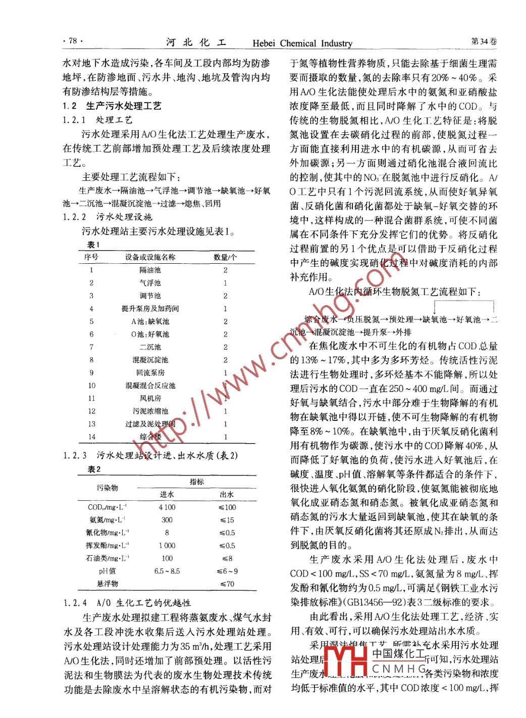 第34卷第12期阿北化工Vol.34,No.122011年12月HEBEI HUAGONGDec.2011焦化廠污水治理.高志(石家莊市井陘礦區(qū)環(huán)境保護局,河北石家莊050100)摘要:綜述了 焦化廠廢水(生產(chǎn)廢水和生活廢水)的處理方法。關鍵詞:焦化廠;生產(chǎn)廢水;生活污水;處理方法中圖分類號:X 784文獻標識碼:B文章編號: 1003-509520111-0077-03Wastewater Treatment of the Coking PlantGAO Zhi(Shijiazhuang City Jingxing Mining Area Environment Protection Bureau.,Shjjazhuang 050100,China)Abstract:To summary the treatment methods of the coking plant wastewater, including production wastewater and do-mestic wastewater.Key words:coking plant;production wastewater;domestic wastewater;treatment method在焦化生產(chǎn)工藝流程中,煤氣終冷的直接冷卻為COD、BOD。、氰化物氨、酚、油等,送污水處理站水、粗苯加工的直接蒸汽冷凝分離水、粗苯加工工處理。藝的直接蒸汽冷凝水,焦油精制加工過程的直接蒸(5)各工段沖洗水產(chǎn)生量為36m'/d,主要污染汽冷凝分離水、洗滌水、車間地坪或設備清洗水以物為COD、BODs、氰化物、氨、酚、油等,送污水處理及由煤中所含水形成的剩余氨水,被稱為酚氰廢站處理。水,這部分廢水不僅水量大而且成分復雜,是煉焦(6)篩焦除塵排水經(jīng)沉淀后循環(huán)使用,主要污化學工業(yè)中具有代表性的污水。染物為SS,不外排。(7)熄焦時產(chǎn)生的大量熄焦水,主要污染物為1生產(chǎn) 廢水的處理SS,排人沉淀池沉淀后復用。1.1工藝過程 中產(chǎn)生的廢水控制(8)設置事故水池,防止水污染。在煤氣凈化(1)冷卻循環(huán)水排污水排放量為432m/d,其車間設置了大容積的貯槽及地下放空槽,適應事故中, 144 m2/d回用于除塵灰加濕,剩余部分排水復用的貯存和調節(jié)需要,防止事故溢流造成水污染。于熄焦工段,不外排。(9)在工段內(nèi)設置放空槽,收集設備及管道放(2)蒸汽鍋爐軟化站廢水產(chǎn)生量為12 m'/d,排空廢液、地坪沖洗水、各分離器及油槽分離水等,統(tǒng)水復用于熄焦工段,不外排。一送煤 氣凈化焦油氨水分離裝置,分離出的廢水送(3)冷鼓工段產(chǎn)生的剩余氨水送蒸氨工段,經(jīng)蒸蒸氨工段進- - 步處理。氨后的廢水產(chǎn)生量為516 m2/d,主要污染物為COD、(10)脫硫工段、粗苯蒸餾工段各分離器及油槽BOD、氰化物、氨、酚、油等,送污水處理站處理。產(chǎn)生的少量分離水及各工段地下水放空液均集中(4)煤氣水封水排水量為72m/d,主要污染物后送至機械化氨中國煤化工產(chǎn)生的污YHCNMHG收稿日期: 2011-06-16作者簡介:高志(1982-),女 ,助工,從事環(huán)境保護工作, E-mail:lzh781 106@163.com。.78●河北化工Hebei Chemical Industry第34卷水對地下水造成污染,各車間及工段內(nèi)部均為防滲于氮等植物性營養(yǎng)物質,只能去除基于細菌生理需地坪,在防滲地面、污水井、地溝、地坑及管溝內(nèi)均要而攝取的數(shù)量,氮的去除率只有20% ~40%。采有防滲結構層等措施。用AO生化法能使處理后水中的氨氮和亞硝酸鹽1.2 生產(chǎn)污水處理工藝濃度降至最低,而且同時降解了水中的COD。與1.2.1 處理工藝傳統(tǒng)的生物脫氮相比,A/O生化工藝特征是:將脫污水處理采用A/O生化法工藝處理生產(chǎn)廢水,氮池設置在去碳硝化過程的前部,使脫氮過程一在傳統(tǒng)工藝前部增加預處理工藝及后續(xù)濃度處理方面能直接利用進水中的有機碳源,從而可省去工藝。外加碳源;另一方面則通過硝化池混合液回流比主要處理工藝流程如下:的控制,使其中的NO;在脫氮池中進行反硝化。A/生產(chǎn)廢水→隔油池-→氣浮池-→調節(jié)池-→缺氧池-+好氧0工藝中只有1個污泥回流系統(tǒng),從而使好氧異氧池→二沉池→混凝沉淀池-過濾- >熄焦、回用菌、反硝化菌和硝化菌都處于缺氧-好氧交替的環(huán)1.2.2 污水處理設施境中,這樣構成的一種混合菌群系統(tǒng),可使不同菌污水處理站主要污水處理設施見表1。屬在不同條件下充分發(fā)揮它們的優(yōu)勢。將反硝化表1過程前置的另1個優(yōu)點是可以借助于反硝化過程序號設備或設施名稱數(shù)量/個中產(chǎn)生的堿度實現(xiàn)硝化過程中對堿度消耗的內(nèi)部.隔油池補充作用。氣浮池Av0生化法內(nèi)循環(huán)生物脫氮I藝流程如下:調節(jié)池提升泵房及加藥間A池:缺氧池綜合廢水-→負壓脫氮- -預處理-→缺氧池- + 好氧池→二0池:好氧池沉池→混凝沉淀池-提升泵-外排二沉池在焦化廢水中不可生化的有機物占COD總量混凝沉淀池的13%~ 17% ,其中多為多環(huán)芳烴。傳統(tǒng)活性污泥9回流泵房法進行生物處理時,多環(huán)烴基本不能降解,所以處0混凝混合反應池理后污水的COD一直在250~ 400 mg/L間。而通過11風機房好氧與缺氧結合,污水中部分難于生物降解的有機2污泥濃縮池物在缺氧池中得以開鏈,使不可生物降解的有機物l3過濾及泥處理間降至8%~10%。在缺氧池中,由于厭氧反硝化菌利4綜合樓用有機物作為碳源,使污水中的COD降解40%,從1.2.3污水處理站設計進、 出水水質(表2)而降低了好氧池的負荷,使污水進人好氧池后,在表2堿度、溫度、pH值、溶解氧等條件都適合的條件下,指標污染物很快進人氧化氨氮的硝化階段,使氨氮能被徹底地進水出水COD/mg.L.'4100≤100氧化成亞硝態(tài)氮和硝態(tài)氮。被氧化成亞硝態(tài)氮和氨氮/mg.L'≤15硝態(tài)氮的污水大量返回到缺氧池,使其在缺氧的條氰化物/mg.L"8≤0.5件下,由厭氧反硝化菌將