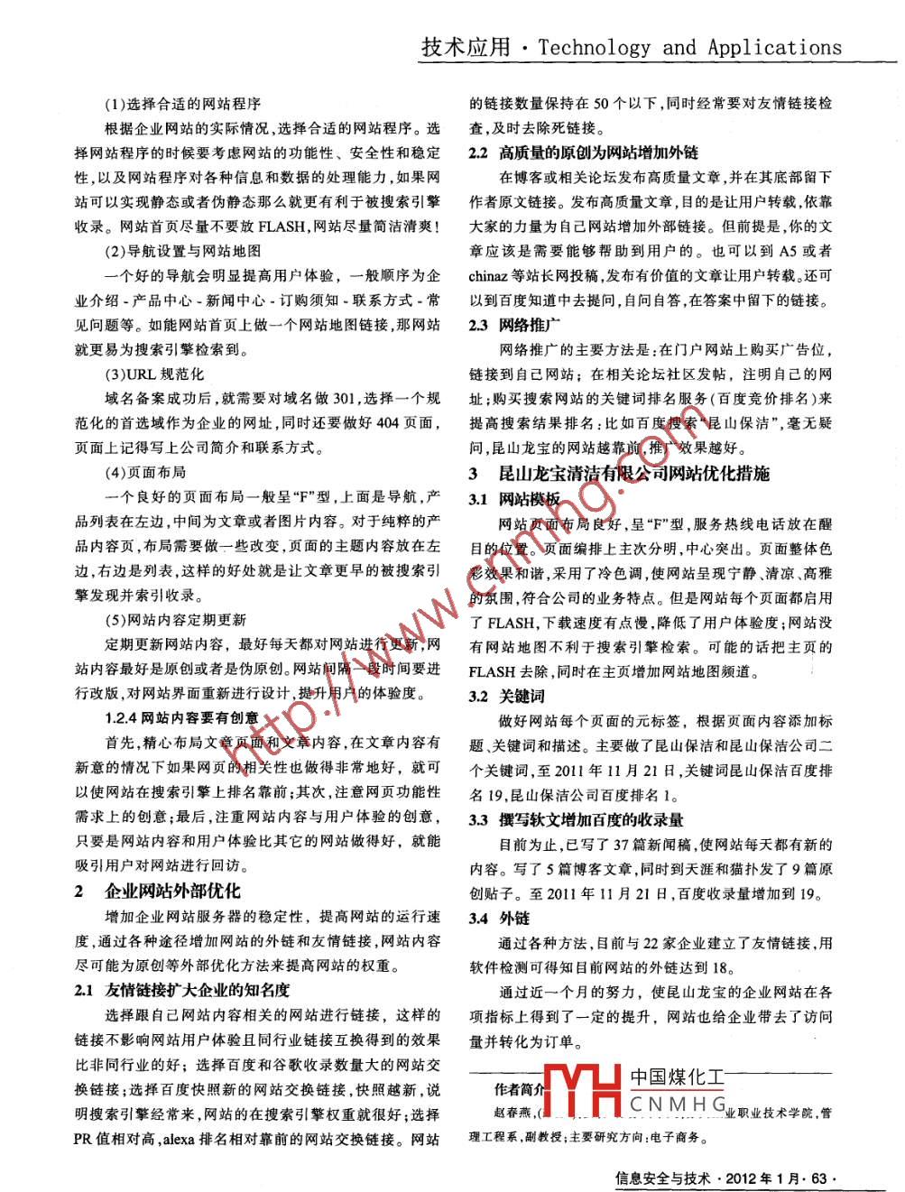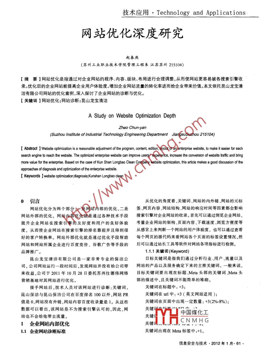 技術(shù)應(yīng)用●Technology and Appl icat ions網(wǎng)站優(yōu)化深度研究趙春燕(蘇州工業(yè)職業(yè)技術(shù)學(xué)院管理工程系江蘇蘇州215104)[摘要]網(wǎng)站優(yōu)化是指通過對企業(yè)網(wǎng)站的程序、內(nèi)容、版塊、布局進(jìn)行合理調(diào)整,從而使網(wǎng)站更容易被各搜索引擎收錄。優(yōu)化后的企業(yè)網(wǎng)站能提高企業(yè)用戶體驗(yàn)度,增加企業(yè)網(wǎng)站流量的轉(zhuǎn)化率進(jìn)而給企業(yè)帶來價(jià)值。本文依托昆山龍寶清潔有限公司網(wǎng)站的優(yōu)化案例,深入探討了企業(yè)網(wǎng)站的診斷與優(yōu)化。. [關(guān)鍵詞]網(wǎng)站優(yōu)化;網(wǎng)站診斷; 昆山龍寶清潔A Study on Website Optimization DepthZhao Chun-yan(Suzhou Institute of Industrial Technology Engineering Depatment JiangsuSuzhou 215104)[ Abstract ] Website optimization is a reasonable adjustment of the program, content, editin, layout of an enterprise website, to make it easier for eachsearch engine to reach the website. The optimized enterprise webite can improve users' experience, increase the conversion of website taffic and bringmore value for the enterprise. Based on the case of Kun Shan Longbao Clean Company website optimization, this article makes a good discussion of theapproaches of diagnosis and optimization of the enterprise website.[ Keywords ]website opiminonianosis;Kunshan Longbao clean0引言從優(yōu)化的角度看,關(guān)鍵詞、網(wǎng)站的內(nèi)外鏈、網(wǎng)站的元標(biāo)網(wǎng)站優(yōu)化分為兩個(gè)部分,-是網(wǎng)站內(nèi)部的優(yōu)化,二是簽、網(wǎng)頁內(nèi)容、網(wǎng)站結(jié)構(gòu)、網(wǎng)站的響應(yīng)時(shí)間等因素都會(huì)影響網(wǎng)站外部的優(yōu)化。網(wǎng)站內(nèi)部優(yōu)化就是通過各種技術(shù)手段搜索引擎對企業(yè)網(wǎng)站的收錄。首先可以通過瀏覽企業(yè)網(wǎng)站,提升企業(yè)網(wǎng)站在搜索引擎的友好度和用戶的良好體驗(yàn)考量企業(yè)網(wǎng)站的架構(gòu)、頁面內(nèi)容、下載速度瀏覽方便度等度,從而使企業(yè)網(wǎng)站在搜索引擎的排名靠前并且得到很從感官 上來判斷- -個(gè)網(wǎng)站的用戶體驗(yàn)度,也可以通過查看好的客戶轉(zhuǎn)換率。網(wǎng)站外部優(yōu)化就是通過優(yōu)化手段幫助每個(gè)網(wǎng)頁的源代碼來看網(wǎng)站各個(gè)頁面的標(biāo)簽設(shè)置情況,然網(wǎng)站和網(wǎng)站所屬企業(yè)進(jìn)行百度競價(jià)、谷歌廣告等手段的后可以通過站長工具等軟件對網(wǎng)站各項(xiàng)指標(biāo)進(jìn)行檢測。品牌推廣1.1.1 關(guān)鍵詞(Keyword)昆山龍寶清潔有限公司是一家非常專業(yè)的保潔公目標(biāo)關(guān)鍵詞是指我們通過分析行業(yè)、用戶、流量以及司,公司網(wǎng)站運(yùn)行-段時(shí)間后,發(fā)現(xiàn)網(wǎng)站并沒有給公司帶網(wǎng)站的產(chǎn)品以及服務(wù)確定下來的主推關(guān)鍵詞。-般來說,來收益,公司于2011年10月28日委托蘇州仕德偉網(wǎng)絡(luò)目標(biāo)關(guān)鍵詞要出現(xiàn)在標(biāo)題、Meta頭部的關(guān)鍵詞、Meta頭營銷基地對其網(wǎng)站進(jìn)行優(yōu)化。部的描述中,且關(guān)鍵詞不能簡單的堆砌。接手網(wǎng)站后,技術(shù)人員對該網(wǎng)站進(jìn)行診斷:關(guān)鍵詞,關(guān)鍵詞在標(biāo)題中: +3;昆山保潔與昆山保潔公司在百度排名100以外,網(wǎng)站PR關(guān)鍵詞在url中:+3(英文網(wǎng)站適用);值是0,網(wǎng)站沒有外鏈,網(wǎng)站內(nèi)容百度收錄量是1。從這些關(guān)鍵詞在頁面中出現(xiàn)- -定數(shù)量: +3(2%-8%);數(shù)據(jù)可以看出,該網(wǎng)站是不為搜索引擎認(rèn)可的,因此,網(wǎng)關(guān)鍵中國煤化工站也不會(huì)給他帶去流量。1企業(yè)網(wǎng)站內(nèi)部優(yōu)化CNMHG1.1 企業(yè)網(wǎng)站診斷標(biāo)準(zhǔn)關(guān)鍵詞出現(xiàn)在Meta標(biāo)簽中:+1。信息安全與技術(shù).2012年1月.61 .Technology and Applications ●技術(shù)應(yīng)用1.1.2 鏈接(Links)機(jī)器的當(dāng)機(jī)時(shí)間:-1;網(wǎng)站鏈接有網(wǎng)站的內(nèi)部鏈接和網(wǎng)站的外部鏈接,-Flash頁面: -2;般來說一個(gè)好的網(wǎng)站結(jié)構(gòu)應(yīng)該是一個(gè)扁平化的樹型網(wǎng)狀錯(cuò)誤的重定向:-3。結(jié)構(gòu),網(wǎng)站頁面要有一個(gè)良好的導(dǎo)航欄便于網(wǎng)站內(nèi)部鏈診斷上述各個(gè)項(xiàng)目,把相應(yīng)的分?jǐn)?shù)進(jìn)行累加,得到最接的通暢。而在做外鏈的時(shí)候要注意鏈接對象的權(quán)重,通后分?jǐn)?shù),通常分?jǐn)?shù)越高,說明在搜索結(jié)果中獲得好排名的常情況下,門戶網(wǎng)站>行業(yè)網(wǎng)站>專業(yè)網(wǎng)站>普通網(wǎng)站機(jī)會(huì)也就越大。>公司網(wǎng)站...存在這么一個(gè)從大到小的權(quán)重關(guān)系,所以1.2企業(yè)網(wǎng)站內(nèi)部優(yōu)化有時(shí)即使你的鏈接在門戶網(wǎng)站的內(nèi)頁,也有可能比在普通過對網(wǎng)站關(guān)鍵詞、導(dǎo)航、網(wǎng)站地圖、網(wǎng)站模板等進(jìn)通網(wǎng)站的首頁價(jià)值高,其鏈接更有價(jià)值。行優(yōu)化,使企業(yè)網(wǎng)站的質(zhì)量得到提升,從而可以增加搜索導(dǎo)人鏈接(inbound links)的錨文本:+3;引擎對網(wǎng)站內(nèi)容的收錄量。導(dǎo)人鏈接的來源: +3;1.2.1網(wǎng)站結(jié)構(gòu)從相似站點(diǎn)來的鏈接: +3;網(wǎng)站結(jié)構(g