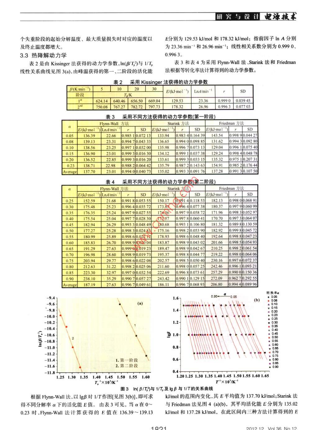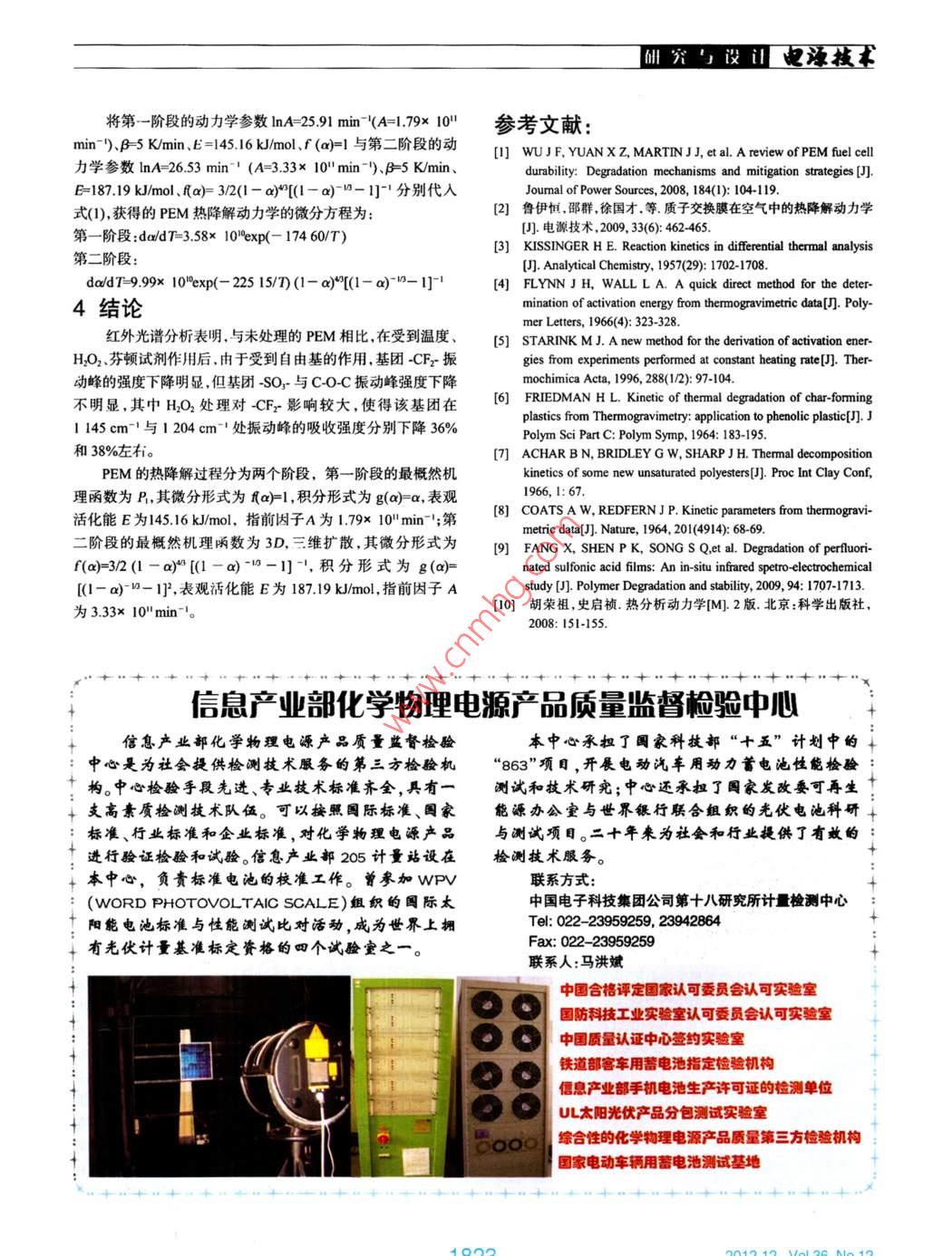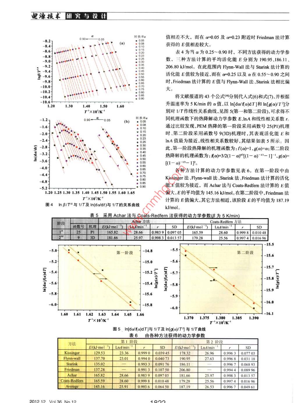 M究與設(shè)山也澡技質(zhì)子交換膜的熱降解行為魏風,魯伊恒*,劉偉龍,李寒旭,陳明強(安徽理工大學化工學院,安徽淮南232001)摘要:采用FTR與τG-DTG分析法研究了質(zhì)子交換膜的穩(wěn)定性和熱降解動力學。用 Kissinger法、Fynn-Wa法、Starink法和 Friedman法對非等溫動力學數(shù)據(jù)進行了分析,得到了熱降解的機理函數(shù)和動力學參數(shù)。紅外分析表明當-CFε-基團在受到HO2作用時,1145cm-1與1204cm-處吸收峰強度分別下降約36%和38%。熱重分析顯示熱降解過程經(jīng)歷兩個階段,第一階段的表觀活化能E為14516 k/mol,指前因子A為179×101min-',其熱降解受P1機理控制;第二階段的表觀活化能E為18719kJmo,指前因子A為3、33×10"min-',其熱降解受3D(三維擴散)機理控制關(guān)鍵詞:質(zhì)子交換膜;紅外光譜;熱降解動力學;燃料電池中圖分類號:TM911文獻標識碼:A文章編號:1002-087×(2012)12-181905Thermal degradation behavior of proton-exchange membraneWEI Feng, LU Yi-heng*, LIU Wei-long, LI Han-xu, CHEN Ming-qiangCollege of Chemical Engineering, Anhui University of Science and Technology, Huainan Anhui 232001. China)Abstract: The stability and thermal degradation kinetics of proton-exchange membrane were investigated by usingFTIR and TG-DTG analysis. The non-isothermal kinetic data were analyzed by using the Kissinger methodFlynn-Wall method, Starink method and Friedman method, the mechanism function and kinetic parameters of thermaldegradation were obtained. IR analysis shows that the maximum intensity of absorption decreases about 36% and38%, when -CF- group is attacked by H2O2 the thermogravimetric analysis shows that the thermal degradationprocess undergoes two stages. The apparent activation and pre-exponential factor of the first stage are 145. 16mol and 1.79 x 10min- respectively, and the thermal degradation is controlled by P1 mechanism. The apparentactivation and pre-exponential factor of the second stage are 187. 19 kJ/mol and 3. 33 x 10- respectively, andthe thermal degradation is controlled by 3D mechanismKey words: proton-exchange membrane: FT-IR spectroscopy thermal degradation kinetics: fuel cell質(zhì)子交換膜(簡稱PEM的物理和化學穩(wěn)定性直接決定了料電池的推廣應(yīng)用受到PEM性能和成本的制約,因此開展不燃料電池的性能與壽命,要求其具有良好的質(zhì)子導(dǎo)電性、氣體同國產(chǎn)PEM的熱穩(wěn)定性、熱降解動力學和機理研究,并提高在膜內(nèi)的滲透率盡可能小、在工作環(huán)境中具有較高的抗熱降其穩(wěn)定性能,對于實現(xiàn)燃料電池的產(chǎn)業(yè)化開發(fā)具有重要的實解和抗化學試劑氧化,對燃料和氧化劑有較好的阻隔作用。對際意義。于PEM熱降解機理與動力學的報道文獻較多,但其主要集中1實驗在杜邦的 Nafion系列質(zhì)子交換膜受空氣、HO2、芬頓試劑作用1.1原料與試劑下的熱穩(wěn)定性,其研究重點在于PEM在受氧氣、過氧化物以及自由基作用后的熱降解機理和動力學。而對于國產(chǎn)膜的報質(zhì)子交換膜(全氟磺酸離子膜),外觀無色透明,T業(yè)合格道較少,近年來對于國產(chǎn)PEM的熱穩(wěn)定性和熱分解動力學已品.膜厚度為80μm、EC為103 mmol/g、電導(dǎo)率為0.154Sm、拉伸性能為19MPa,由山東東岳集團高分子材料有限公有報道2。本文采用 Kissinger法 Flynn-Wal法、 Starink法、Fniedman法和傅里葉紅外光譜分析法,對國產(chǎn)PEM的穩(wěn)定性進司提供。30%HO2,分析純淮南試劑廠;六水合硫酸亞鐵,分析純,天津市標準科技有限公司。行了研究,推斷了可能的動力學參數(shù)與機理函數(shù)。鑒于國內(nèi)燃12傅里葉紅外光譜分析收稿日期:2012-05-15FTR光譜分析在Ⅴ ECTOR33型紅外光譜儀上進行,由德基金項目:安徽省國際科技合作計劃資助項目(06098018;淮南國布魯克公司生產(chǎn),其分辨率為4cm,掃描波數(shù)為40市科技計劃資助項目(2011A07923)4000cm。作者簡介:魏風(1984-),男安徽省人,碩士生,主要研究方向為待測樣制備:(1)200℃干燥箱中靜置0.5h;(2)3%HO燃料電池膜及電極材料。通信作者:魯伊恒,E-ma:yhu2000@163com溶液在80℃恒溫水浴中浸漬6h;(3)1%芬頓試劑(質(zhì)量分數(shù)屺技本M與設(shè)山1%HAO2,10Fe)溶液于80℃恒溫水浴中浸漬6h。將(2)(3)8.314Jmol-·K";fa)為描述分解反應(yīng)的微分函數(shù)。處理后的PEM用去離子水洗凈,干燥后做紅外光譜分析,其由式(1),可以得到熱分解動力學的 Kissinger法叫式2)、結(jié)果見圖1。Wa法叫(式3)、 Starink法(式4) Friedman法(式5Ach法(式6)與 Coats-Redferm法式7)。式中:T為峰溫,K;C為常數(shù);dadT為微分失重,%K;a)為描述分解反應(yīng)的積分函數(shù)。用這些方法處理TG和DTG數(shù)據(jù),可以分別獲得其動力學參數(shù)E與A:er法:架0.6nBITp-=In(AR/E]-E/RTp200Flynn-Wall法I"e Fetonlg=lg[AEg(a)R]-2313-0.4567E/RTStarink法:In(B/T.=C-E/RT140013001200110010波長m1Friedman法:圖1不同條件作用后PEM的FTR光譜圖In(da/dn =In [Afa)]-E/RT1.3熱失重分析AcharTG-DTG的測試是在日本 Shimadzu公司DTG60H型熱In(da fa)dm -In(AB)-E/RT重分析儀上進行,非等溫熱失重測定以aALO3做參比物,氣 Coats-Redfern法:氛為氮氣,流量為25mL/min,升溫速率分別為5、10、20、30In[g(a)TlIn(AR/BE)-E/RTKmin,升溫區(qū)間為25~600℃,試樣質(zhì)量為3~4mg,樣品池3結(jié)果與討論為AlO3密封坩堝,熱重分析結(jié)果見圖2(a)b)。10031介質(zhì)對質(zhì)子交換膜穩(wěn)定性的影響在圖1中,1145cm1與1處的吸收峰是CF2基團的對稱和反對稱伸縮振動峰,1055cm-1與1310cm-1處的吸收峰為SO基團的對稱與反對稱伸縮振動峰,而970cm處的吸收峰為
