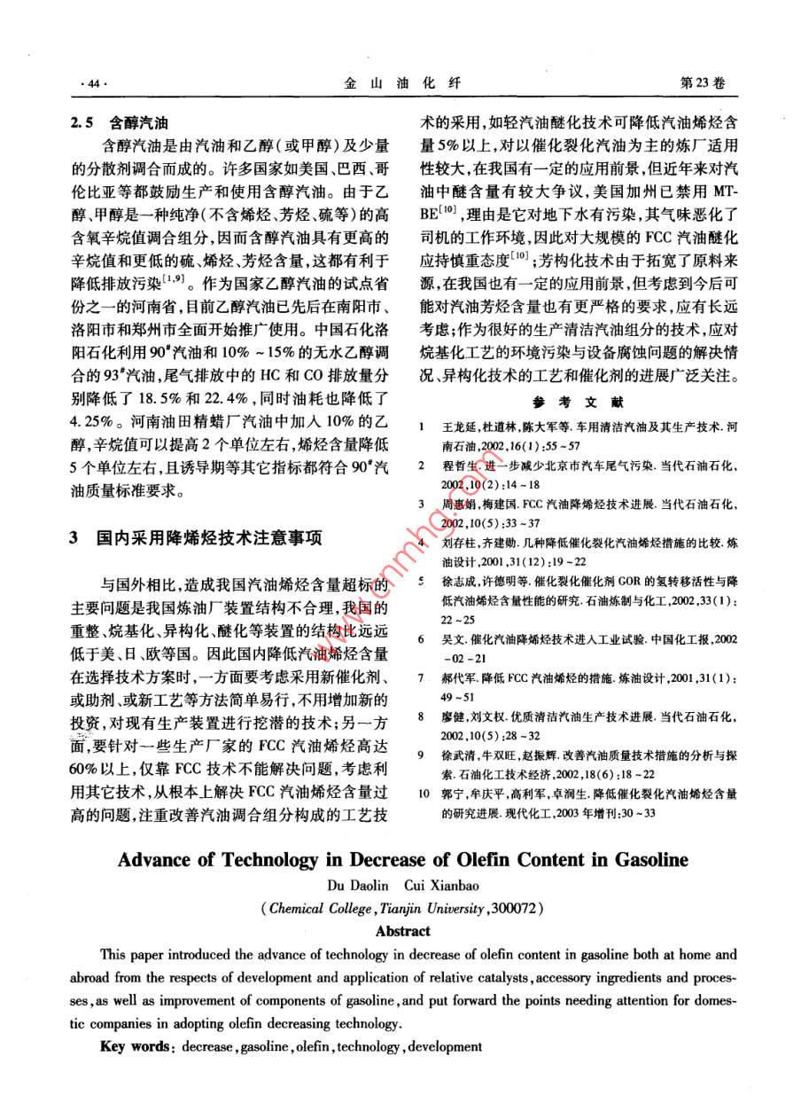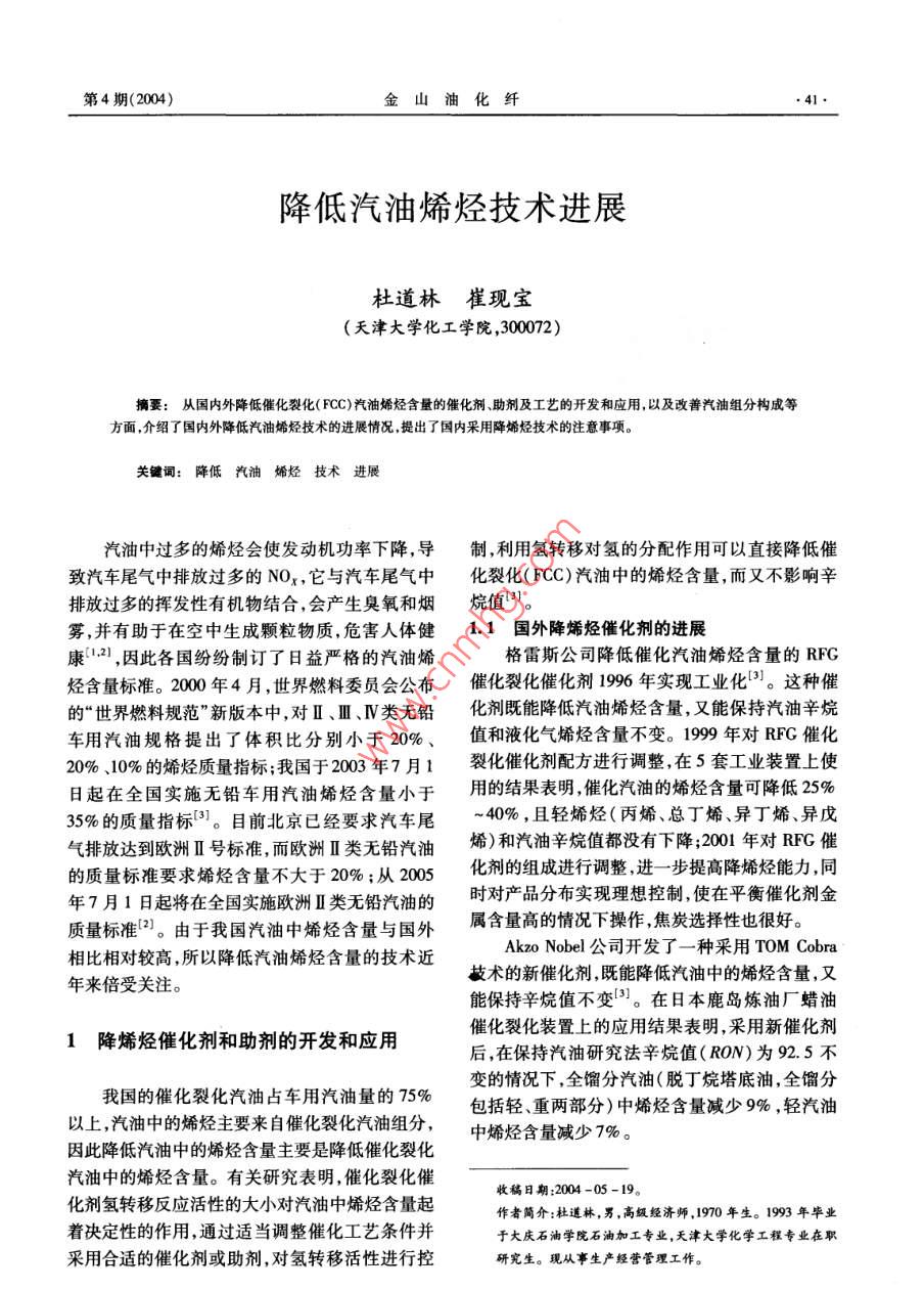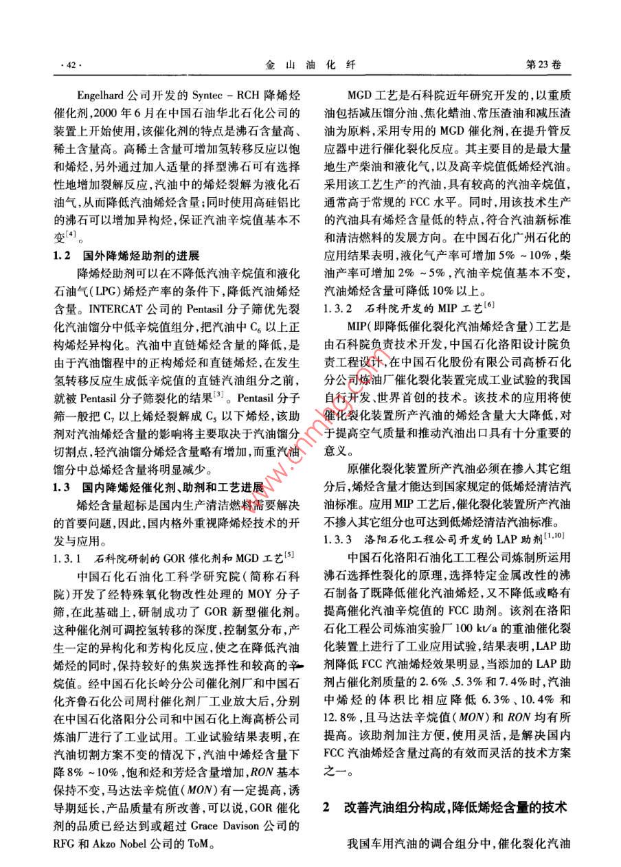 第4期(2004)金山油化纖.41●降低汽油烯烴技術進展杜道林崔現(xiàn)寶(天津大學化工學院,300072)摘要:從國內(nèi)外降低催 化裂化( FCC)汽油烯烴含量的催化劑、助劑及工藝的開發(fā)和應用,以及改善汽油組分構成等方面,介紹了國內(nèi)外降低汽油烯烴技術的進展情況,提出了國內(nèi)采用降烯烴技術的注意事項。關鍵詞:降低汽油烯烴技術進展汽油中過多的烯烴會使發(fā)動機功率下降,導制,利用氫轉移對氫的分配作用可以直接降低催致汽車尾氣中排放過多的NOx,它與汽車尾氣中化裂化( FCC)汽油中的烯烴含量,而又不影響辛排放過多的揮發(fā)性有機物結合,會產(chǎn)生臭氧和煙烷值)。霧,并有助于在空中生成顆粒物質(zhì),危害人體健1.1國外降 烯烴催化劑的進展康'[.2], 因此各國紛紛制訂了日益嚴格的汽油烯格雷斯公司降低催化汽油烯烴含量的RFG烴含量標準。2000 年4月,世界燃料委員會公布催化裂化催化劑1996年實現(xiàn)工業(yè)化B。這種催的“世界燃料規(guī)范”新版本中,對I、l、IV類無鉛化劑既能降低汽油烯烴含量,又能保持汽油辛烷車用汽油規(guī)格提出了體積比分別小于20%、值和液化氣烯烴含量不變。1999 年對RFG催化20%、.10%的烯烴質(zhì)量指標;我國于2003年7月1裂化催化劑配方進行調(diào)整,在5套工業(yè)裝置上使日起在全國實施無鉛車用汽油烯烴含量小于用的結果表明,催化汽油的烯烴含量可降低25%35%的質(zhì)量指標[5]。目前北京已經(jīng)要求汽車尾~40%,且輕烯烴(丙烯、總丁烯、異丁烯、異戊氣排放達到歐洲II號標準,而歐洲I類無鉛汽油烯)和汽油辛烷值都沒有下降;200年對RFG催的質(zhì)量標準要求烯烴含量不大于20% ;從2005化劑的組成進行調(diào)整,進-一步 提高降烯烴能力,同年7月1日起將在全國實施歐洲I類無鉛汽油的時對產(chǎn)品分布實現(xiàn)理想控制,使在平衡催化劑金質(zhì)量標準[”]。由于我國汽油中烯烴含量與國外屬含量高的情況下操作,焦炭選擇性也很好。Akzo Nobel公司開發(fā)了- -種采用TOM Cobra相比相對較高,所以降低汽油烯烴含量的技術近技術的新催化劑,既能降低汽油中的烯烴含量,又年來倍受關注。能保持辛烷值不變[”]。在日本鹿島煉油廠蠟油1降烯烴催化劑和助劑的開 發(fā)和應用催化裂化裝置上的應用結果表明,采用新催化劑后,在保持汽油研究法辛烷值(RON)為92.5不我國的催化裂化汽油占車用汽油量的75%變的情況下,全餾分汽油(脫丁烷塔底油,全餾分以上,汽油中的烯烴主要來自催化裂化汽油組分,包括輕、重兩部分)中烯烴含量減少9% ,輕汽油因此降低汽油中的烯烴含量主要是降低催化裂化中烯烴含量減少7%。汽油中的烯烴含量。有關研究表明,催化裂化催收稿日期:2004 -05 -19?;瘎滢D移反應活性的大小對汽油中烯烴含量起作者簡介:杜道林,男,高級經(jīng)濟師,1970年生。1993 年畢業(yè)著決定性的作用,通過適當調(diào)整催化工藝條件并于大慶石油學院石油加工專業(yè),天津大學化學工程專業(yè)在職采用合適的催化劑或助劑,對氫轉移活性進行控研究生。現(xiàn)從事生產(chǎn)經(jīng)營管理工作。●42.金山油化纖第23卷Engelhard 公司開發(fā)的Syntee - RCH降烯烴MCD工藝是石科院近年研究開發(fā)的,以重質(zhì)催化劑,2000年6月在中國石油華北石化公司的油包括減壓餾分油、焦化蠟油、常壓渣油和減壓渣裝置上開始使用,該催化劑的特點是沸石含量高、油為原料,采用專用的MGD催化劑,在提升管反稀土含量高。高稀土含量可增加氫轉移反應以飽應器中進行催化裂化反應。其主要目的是最大量和烯烴,另外通過加人適量的擇型沸石可有選擇地生產(chǎn)柴油和液化氣,以及高辛烷值低烯烴汽油。性地增加裂解反應,汽油中的烯烴裂解為液化石采用該工藝生產(chǎn)的汽油,具有較高的汽油辛烷值,油氣,從而降低汽油烯烴含量;同時使用高硅鋁比通常高于常規(guī)的FCC水平。同時,用該技術生產(chǎn)的沸石可以增加異構烴,保證汽油辛烷值基本不的汽油具有烯烴含量低的特點,符合汽油新標準變[41。和清潔燃料的發(fā)展方向。在中國石化廣州石化的1.2國外降 烯烴助劑的進展應用結果表明,液化氣產(chǎn)率可增加5% ~ 10% ,柴降烯烴助劑可以在不降低汽油辛烷值和液化油產(chǎn)率可增加2%~5%,汽油辛烷值基本不變,石油氣(LPG)烯烴產(chǎn)率的條件下,降低汽油烯烴汽油烯烴含量可降低10%以上。含量。INTERCAT公司的Pentasil 分子篩優(yōu)先裂1.3.2 石科院開發(fā)的MIP工藝[6]化汽油餾分中低辛烷值組分,把汽油中C%以上正MIP(即降低催化裂化汽油烯烴含量)工藝是構烯烴異構化。汽油中直鏈烯烴含量的降低,是由石科院負責技術開發(fā),中國石化洛陽設計院負由于汽油餾程中的正構烯烴和直鏈烯烴,在發(fā)生責工程設計,在中國石化股份有限公司高橋石化氫轉移反應生成低辛烷值的直鏈汽油組分之前,分公司煉油廠催化裂化裝置完成工業(yè)試驗的我國就被Pentasil分子篩裂化的結果3。Pentasil 分子自行開發(fā)、世界首創(chuàng)的技術。該技術的應用將使篩一般把C,以上烯烴裂解成Cs以下烯烴,該助催化裂化裝置所產(chǎn)汽油的烯烴含量大大降低,對劑對汽油烯烴含量的影響將主要取決于汽油餾分于提高空氣質(zhì)量和推動汽油出口具有十分重要的切割點,輕汽油餾分烯烴含量略有增加,而重汽油意義。餾分中總烯烴含量將明顯減少