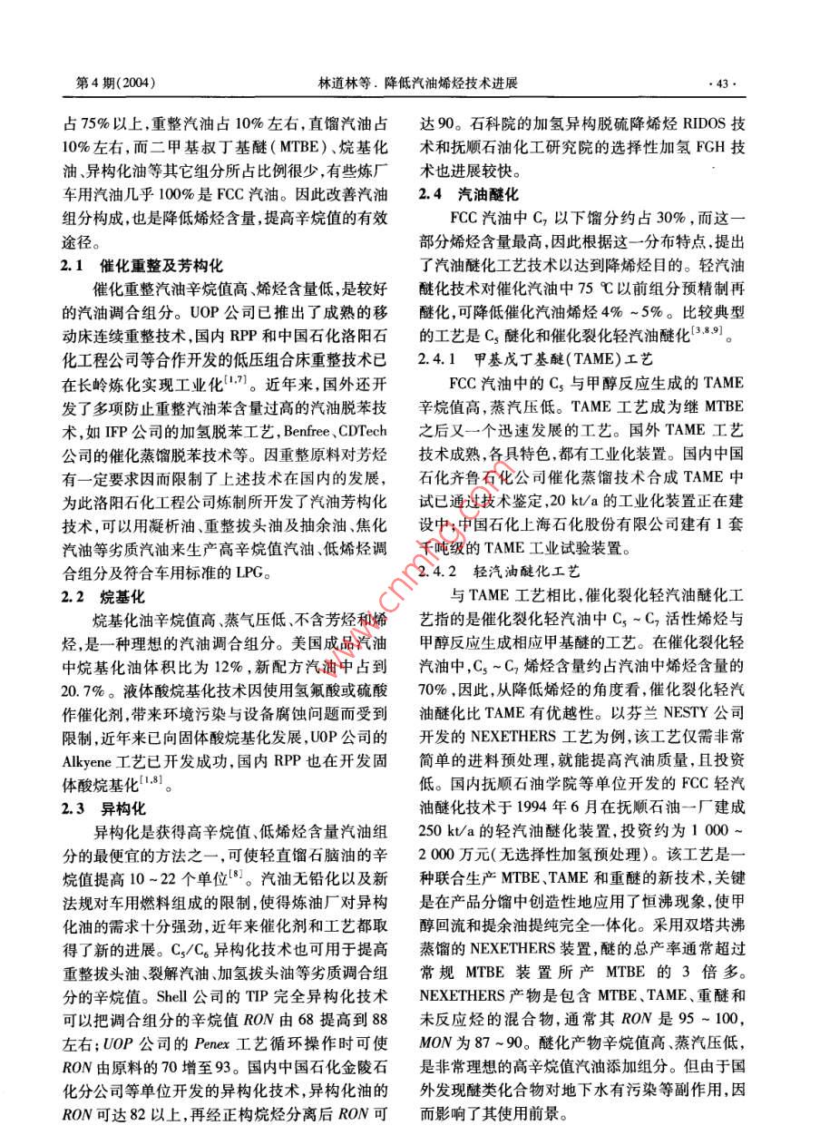 降低汽油烯烴技術進展