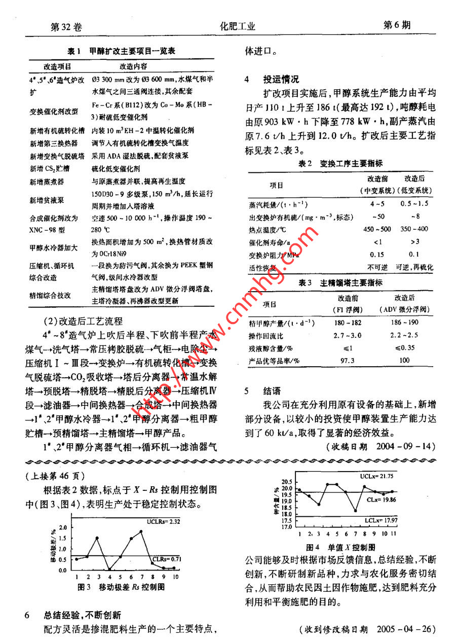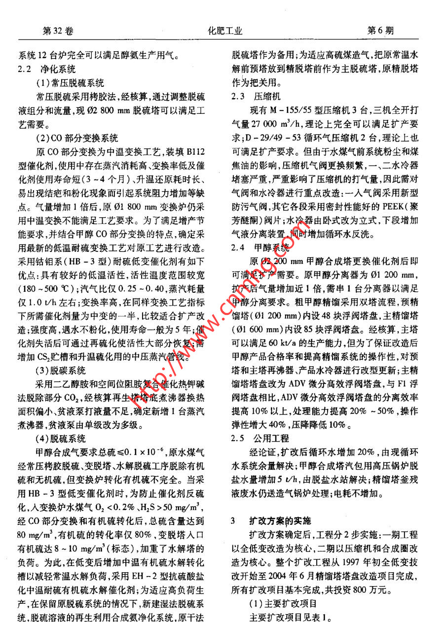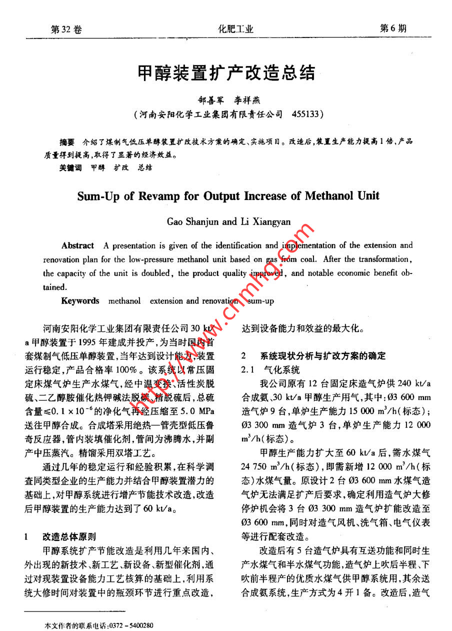 第32卷化肥工業(yè)第6期甲醇裝置擴產改造總結郜善軍李祥燕(河南安陽化學工業(yè)集團有限責任公司455133)摘要介紹了煤制氣低壓單酵裝置擴改技術方案的確定、實施項目。改造后,裝置生產能力提高1倍,產品質量得到提高,取得了顯著的經(jīng)濟效益。關鍵詞甲醇擴改總結Sum-Up of Revamp for Output Increase of Methanol UnitGao Shanjun and Li XiangyanAbstract A presentation is given of the identification and implementation of the extension andrenovation plan for the low-pressure methanol unit based on gas from coal. After the transformation ,the capacity of the unit is doubled, the product quality inproved ,and notable economic benefit ob-tained.Keywords methanol extension and renovation sum-up河南安陽化學工業(yè)集團有限責任公司30 kV達到設備能力和效益的最大化。a甲醇裝置于1995年建成并投產,為當時國內首套煤制氣低壓單醇裝置,當年達到設計能力,裝置2系統(tǒng)現(xiàn)狀分析 與擴改方案的確定運行穩(wěn)定,產品合格率100%。該系統(tǒng)以常壓固2.1氣化系統(tǒng)定床煤氣爐生產水煤氣,經(jīng)中溫變換、活性炭脫我公司原有12臺固定床造氣爐供240 kVa硫、二乙醇胺催化熱鉀堿法脫碳精脫硫后,總硫合成氨、30 kt/a 甲醇生產用氣,其中:03 600 mm含量≤0.1 x10-6的凈化氣再經(jīng)壓縮至5.0 MPa造氣爐9臺,單爐生產能力15 000 m/h(標態(tài));送往甲醇合成。合成塔采用絕熱- -管殼型低壓魯03 300 mm造氣爐3臺,單爐生產能力12 000奇反應器,管內裝填催化劑,管間為沸騰水,并副m'/h(標態(tài))。產中壓蒸汽。精餾采用雙塔工藝。甲醇生產能力擴大至60 kva后,需水煤氣通過幾年的穩(wěn)定運行和經(jīng)驗積累,在科學調24 750 m'/h(標態(tài)),即需新增12 000 m'/h(標.查同類型企業(yè)的生產能力并結合甲醇裝置潛力的態(tài))水煤氣量。原設計2臺03 600 mm水煤氣造基礎上,對甲醇系統(tǒng)進行增產節(jié)能技術改造,改造氣爐無法滿足擴產后要求,確定利用造氣爐大修后甲醇裝置的生產能力達到了60 kV/a。停爐機會將3臺03 300 mm造氣爐擴能改造至03 600 mm,同時對造氣風機、洗氣箱、電氣儀表1改造總體原則等進行配套改造。甲醇系統(tǒng)擴產節(jié)能改造是利用幾年來國內、改造后有5臺造氣爐具有互送功能和同時生外出現(xiàn)的新技術、新工藝、新設備、新型催化劑,通產水煤氣和半水煤氣功能,造氣爐上吹后半程、下過對現(xiàn)裝置設備能力工藝核算的基礎上,利用系吹前半程產的優(yōu)質水煤氣供甲醇系統(tǒng)用,其余送統(tǒng)大修時間對裝置中的瓶頸環(huán)節(jié)進行重點改造,合成氨系統(tǒng),生產方式為4開1備。改造后,造氣本文作者的聯(lián)系電話:0372 - 5400280第32卷化肥工業(yè)第6期系統(tǒng)12臺爐完全可以滿足醇氨生產用氣。脫硫塔作為備用;為適應高硫煤造氣,把原常溫水2.2凈化系統(tǒng)解前預塔放到精脫塔前作為主脫硫塔,原精脫塔(1)常壓脫硫系統(tǒng)作為把關用。常壓脫硫采用栲膠法,經(jīng)核算,通過調整脫硫2.3壓縮機液組分和流量,現(xiàn)02 800 mm脫硫塔可以滿足工現(xiàn)有M-155/55型壓縮機3臺,三機全開打藝需要。氣量27 000 m'/h,理論上完全可以滿足擴產要(2)CO部分變換系統(tǒng)求;D-29/49-53循環(huán)氣壓縮機2臺,理論上也.原CO部分變換為中溫變換工藝,裝填B112可滿足擴產要求。但由于水煤氣前系統(tǒng)粉塵和煤型催化劑,使用中存在蒸汽消耗高、變換率低及催焦油的影響,壓縮機氣閥更換頻繁,一、二水冷器化劑使用壽命短(3 ~4個月)、升溫還原耗時長、堵塞嚴重,嚴重影響了壓縮機的打氣量,因此需對易出現(xiàn)結疤和粉化現(xiàn)象而引起系統(tǒng)阻力增加等缺氣閥和水冷器進行重點改造:一人氣閥采用新型點。氣量增加1倍后,原01800mm變換爐仍采防污氣閥,其它各段采用密封性能好的PEEK(聚用中溫變換不能滿足工藝要求。為了滿足增產節(jié)芳醚酮)閥片;水冷器由臥式改為立式,下段增加能要求,并結合甲醇CO部分變換的特點,確定采氣液分離裝置,同時增加循環(huán)水反洗。用最新的低溫耐硫變換工藝對原工藝進行改造。2.4甲醇系統(tǒng)采用鈷鉬系(HB -3型)耐硫低變催化劑有如下原02200mm甲醇合成塔更換催化劑后即優(yōu)點:具有較好的低溫活性,活性溫度范圍較寬可滿足擴產需要。原甲醇分離器為01 200 mm,(180 ~500 C);汽氣比僅0.25 ~0.40,蒸汽耗量擴產后氣量增加近1倍,需串1臺分離器以滿足僅1.0 Vh左右;變換率高,在同樣變換工藝指標甲醇分離要求。粗甲醇精餾采用雙塔流程,預精下所需催化劑量為中變的- -半,比較適合擴產改餾塔( 01 200 mm)內設48塊浮閥塔盤,主精餾塔造;強度高,遇水不粉化,使用壽命- -般為5年;催(01 600 mm)內設85塊浮閥塔盤。經(jīng)核算,主塔化劑失活后可通過再硫化使活性大部分恢復;需可以滿足60 kt/a的生產能力,但為了保證改造后增加CS,貯槽和升溫硫化用的中壓蒸汽管線。甲醇產品合格率和提高精餾系統(tǒng)的操作性,對預(3)脫碳系統(tǒng)塔和主塔再沸器、產品水冷器進行改型更新;主精采用二乙醇胺和空間位阻胺復合催化熱鉀堿餾塔塔盤改為ADV微分高效浮閥塔盤,與F1浮法脫除部分CO2,經(jīng)核算再生塔塔底煮沸器換熱閥塔盤相比,ADV微分高效浮閥塔盤的分離效率面積偏小.貧液泵打液量不足,確定新增1臺蒸汽提高10%以上,處理能力提高20%~50%,操作煮沸器,貧液泵由單級改為多級。彈性增大40% ,壓降降低10%。(4)脫硫系統(tǒng