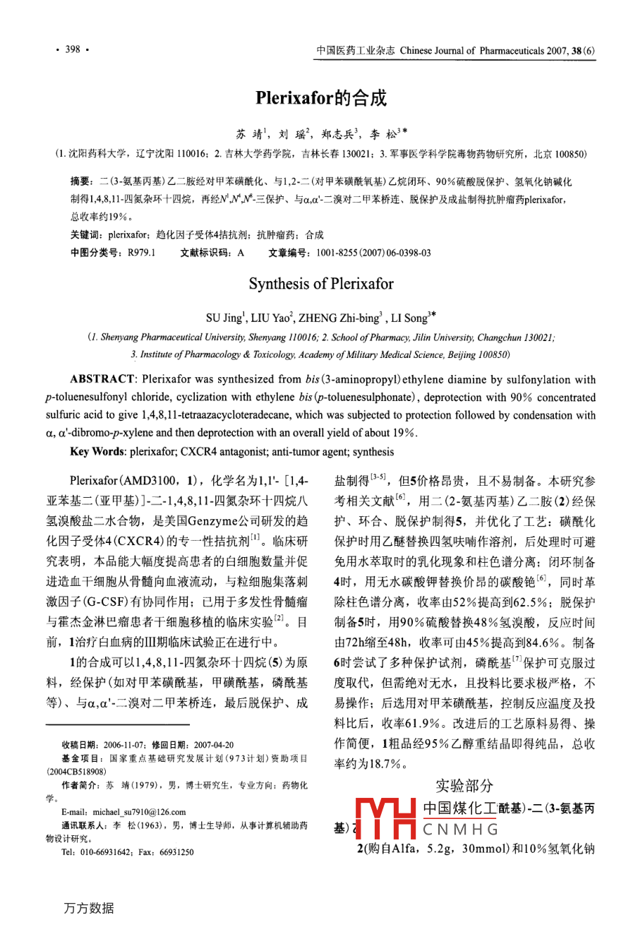 ●398●中國醫(yī)藥工業(yè)雜志Chinese Journal of Pharmaceuticals 2007, 38(6)Plerixafor的合成蘇靖',劉瑤,鄭志兵,李松3*(1.沈陽藥科大學(xué),遼寧沈陽1006; 2. 吉林大學(xué)藥學(xué)院,吉林長春130021; 3. 軍事醫(yī)學(xué)科學(xué)院毒物藥物研究所,北京100850)摘要:二(3-氨基丙基)乙二胺經(jīng)對甲苯碘酰化、與1,2-二 (對甲苯磺酰氧基)乙烷閉環(huán)、90%硫酸脫保護(hù)、氫氧化鈉堿化制得.4.8.11-四氨雜環(huán)十四烷,再經(jīng)N.V,NM-=三保護(hù)、 與a.,a-二溴對 二甲苯橋連、脫保護(hù)及成鹽制得抗腫瘤藥plriafor,總收率約19%。關(guān)鍵詞: plerixafor; 趨化因子受體4拮抗劑:抗腫瘤藥:合成中圖分類號: R979.1文獻(xiàn)標(biāo)識碼: A文章編號: 1001-8255 (2007)06-0398-03Synthesis of PlerixaforSU Jing', LIU Yao, ZHENG Zhi-bing,LI Song*(1. Shenyang Pharmaceutcal University, Shenyang 10016; 2. School of Pharmacy, Jilin University, Changchun 130021;3. Institute of Pharmacology & Torxicology, Academy of Miliary Medical Science, Beijing 100850)ABSTRACT: Plerixafor was synthesized from bis (3-aminopropyl) ethylene diamine by sulfonylation withp-toluenesulfonyl chloride, cyclization with ethylene bis (p-toluenesulphonate) , deprotection with 90% concentratedsulfuric acid to give 1,4,8,11-traazacycloteradecane, which was subjected to protection followed by condensation witha, a'-dibromo-p xylene and then deprotection with an overall yield of about 19%.Key Words: plerixafor; CXCR4 antagonist; anti-tumor agent; synthesisPlerixafor(AMD3100,1), 化學(xué)名為1,'- [1,4-鹽制得B.s), 但5價(jià)格昂貴,且不易制備。本研究參亞苯基二(亞甲基)]-二-1,4,8,11-四氮雜環(huán)十四烷八考 相關(guān)文獻(xiàn)',用二(2-氨基丙基)乙二胺(2)經(jīng)保氫溴酸鹽二水合物,是美國Genzyme公 司研發(fā)的趨護(hù)、環(huán)合、脫保護(hù)制得5,并優(yōu)化了工藝:磺?;蜃邮荏w4(CXCR4)的專- -性拮抗劑"。 臨床研保護(hù)時(shí)用乙醚替換四氫呋喃作溶劑,后處理時(shí)可避究表明,本品能大幅度提高患者的白細(xì)胞數(shù)量并促免用水萃取時(shí)的乳化現(xiàn)象和柱色譜分離:閉環(huán)制備進(jìn)造血干細(xì)胞從骨髓向血液流動,與粒細(xì)胞集落刺4時(shí),用無水碳酸鉀替換價(jià)昂的碳酸銫6,同時(shí)革激因子(G-CSF)有協(xié)同作用;已用于多發(fā)性骨髓瘤除柱色譜分離,收率由52%提高到62.5%;脫保護(hù)與霍杰金淋巴瘤患者干細(xì)胞移植的臨床實(shí)驗(yàn)21。目制備5時(shí),用90%硫酸替換48%氫溴酸,反應(yīng)時(shí)間前,1治療白血病的II期臨床試驗(yàn)正在進(jìn)行中。由72h縮至48h,收率可由45%提高到84.6%。制備1的合成可以1,4,8,11-四氮雜環(huán)十四烷(5)為原6時(shí)嘗試了多種保護(hù)試劑,磷?;?保護(hù)可克服過料,經(jīng)保護(hù)(如對甲苯磺?;?,甲磺?;?,磷?;热〈?,但需絕對無水,且投料比要求極嚴(yán)格,不等)、與a,a'-二溴對二甲苯橋連,最后脫保護(hù)、成易操作:后選用對甲苯磺?;刂品磻?yīng)溫度及投料比后,收率61.9%。改進(jìn)后的工藝原料易得、操收稿日期: 206-11-07; 修回日期: 2007-04-20作簡便,1粗品經(jīng)95%乙醇重結(jié)晶即得純品,總收基金項(xiàng)目:國家重點(diǎn)基礎(chǔ)研究發(fā)展計(jì)劃(973計(jì)劃)資助項(xiàng)目率約為18.7%。(2004CB518908)作者簡介:蘇靖(1979), 男,博士研究生,專業(yè)方向:藥物化實(shí)驗(yàn)部分學(xué)。E-mail: michael. su7910@126 com中國煤化工?;?-二(3-氨基丙通訊聯(lián)系人:李松(1963), 男,博士生導(dǎo)師,從事計(jì)算機(jī)輔助藥基)MYHCNMHG物設(shè)計(jì)研究。Tel: 010-66931642; Fax: 669312502(購自Alfa, 5.2g, 30mmol) 和10%氫氧化鈉中國醫(yī)藥工業(yè)雜志Chinese Journal of Pharmaceuticals 2007, 38(6)399●Ts后H NH:Ts-0 0-Ts1)90% HSO,H HNCHON, K.C2) NOH小Ts345]后PrTsCICH.CL心CH.CN, KCO,,NH HNCH,COOH, HBaNHH圖1 1的合成路線溶液(50ml)置250m1三頸瓶中,0C緩慢滴加對甲苯氧化鈉溶液(90ml),用氯仿提取(100m1x3),氯仿磺酰氯(25.0g, 130mmol) 的乙醚(100ml)溶液,2h層用無水硫酸鈉干燥,過濾,濾液減壓蒸除溶劑,,內(nèi)滴畢,室溫?cái)嚢柽^夜,過濾,濾餅依次用水、乙剩余物干燥后用甲苯重結(jié)晶,得白色固體5(2.2g, .醇、乙醚洗滌,減壓干燥,得白色固體3(19.2g,84.6%),mp 183~185"C (文獻(xiàn)[8]; 185~186'C)。80%),mp 161~163"C(文獻(xiàn)f: 162~164"C) 。'HNMR (CDCI)8: 1.72(t, 4H), 2.23(s, 4H), 2.68(s,1,4,8,11-四(對甲苯磺?;?-1,4,8,11-四氮雜環(huán)8H), 2.75(t, 8H)。FAB-MS (m/z): 201[M+H]*。十四烷(4)1,4,8,-三(對甲苯磺?;?-1,4,8,11-四氮雜環(huán)3(7.9g,10mmol)、 無水碳酸鉀(10.0g,十四烷(6)100mmo1)和無水乙腈(200m1)置500ml三頸瓶中,5(4.28g,21mmol)、 三乙胺(18ml)和二氯甲.攪拌加熱回流1h,緩慢滴加1,2-二(對甲苯磺酰氧烷(150ml)置1L三頸瓶中,室溫滴加對甲苯磺酰氯基)乙烷(3.7g, 10mmol) 的無水乙腈(100m1)溶(8.1g, 43mmo1)的二氯甲烷(300ml)溶液,滴畢室液,24h內(nèi)滴畢,加熱回流48h,靜置過夜,過濾,溫?cái)嚢柽^夜,加入水(40ml),靜置分層,有機(jī)相濾餅依次用水、乙酸乙酯洗滌,減壓干燥,得白用無水硫酸鈉干燥過夜,過濾,濾液減壓蒸除二氯色固體4(5.1g, 62.5%), mp 286~288C (文獻(xiàn)%):甲烷,剩余物用甲醇重結(jié)晶,得6(6.0g)。 母液減288 ~ 289°C)。壓蒸除溶劑,剩余油狀物中加入二氣甲烷(100m1)1,4,811-四氮雜環(huán)十四烷(5)和三乙胺(10ml),滴加對甲苯磺酰氯(2.0g,4(11.0g,13mmol) 和90%硫酸(33m1)置50ml10mmol)的二氯甲烷(50ml)溶液,室溫反應(yīng)2h,茄形瓶中,升溫至100C攪拌48h,冷卻至0C,緩減壓蒸除二氯甲烷,剩余物用