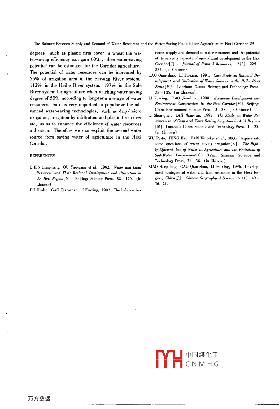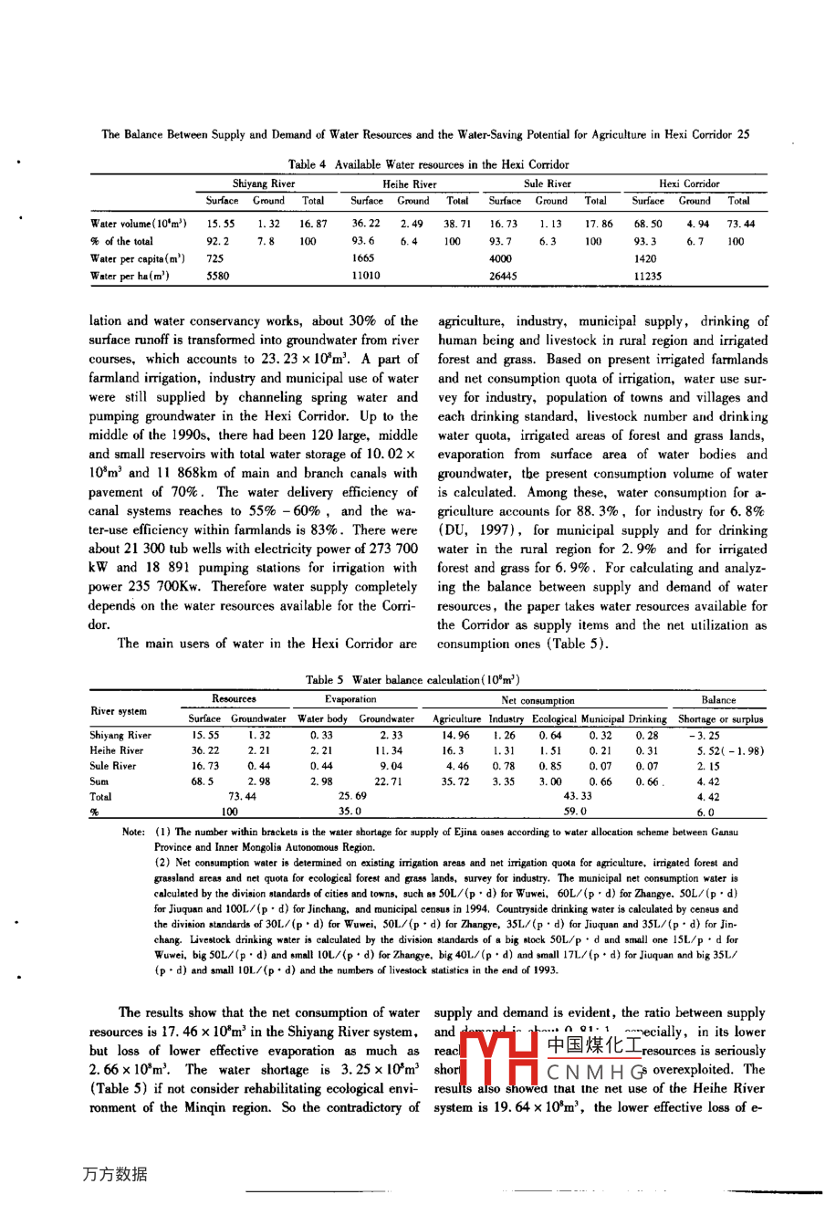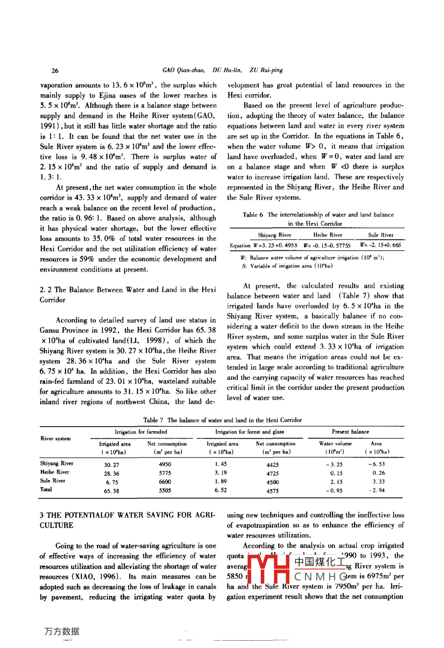 CHINESE GEOGRAPHICAL SCIENCEVolume 12. Number 1, pp. 23 - 29, 2002Science Press, Beijing, Chins一THE BALANCE BETWEEN SUPPLY AND DEMAND OFWATER RESOURCES AND THE WATER-SAVINGPOTENTIAL FOR AGRICULTURE IN THE HEXI CORRIDORGAO Qian-zhao,DU Hu-lin,ZU Rui-ping( Cold and Arid Regions Enrironmental and Engineering Ressearch Institute, the Chinese Academyof Sciences, Larzhou 730000, P. R. China)ABSTRACT: The Hexi Cormidor is an important base of agriculture development in Northwest China. Aecording to re-cent statistics, there are 65. 94 x 10'm' of waler resources available in the Hexi Corridor. Al present, net consumption indevelopment and uilization is 43. 33 x 10*m'. Water supply and demand reach a balance on the recent level of produc-tion, but loss of evaporation and evapotranspiration is as much as 25. 69 x 10*m'. So net use efciency of water resourcesis 59%。Based on analyzing balance belween water and land considering ecological environment at present, there existsthe serious waler shortage in the Shiyang River system where imigation lands have Ov erloaded. There is a comparative bal-ance between supply and demand of water resource in the Heihe River system; and the Sule River system has sume sur-plus water to extend imigation land. Use of agriculture water accounts for 83. 3% and ecological forest and gTass for6. 9% . The Hexi Corridor still has a great potential for water saving in agriculture production. w ater-saving eficiencey ofirrigation is about 10% by using such traditional technologies as furrow and border-dike irigation and small check iriga-tion, and water-saving with plastic flm cover and techniques of advanced sprinkler and drip/ micro imigation ete. cansave more than 60% of imigated water. Incremental imigation area for water-saving potential in the Hexi Corridor hasbeen estimated as 56% - 197% to original imigation area. So the second water sources can be developed from waler sav-ing agriculture in the Hexi Coridor under Development of the Westem Part of China in large scale. This potential can berealized step by step through developing the waler-saving measures, improving the euological condition of asis agmicul-ture, and optimizing allocation of water resources in three river systems.KEY WORDS: water resources; balance between supply and demand; water-saving potential of agriculture; Hexi Corri-lorCLC number: TV211Document code: AArticle ID: 1002-0063 (2002)01-0023-071 AVAILABLE WATER RESOURCESglacier and snow meled waler formed the river runoff.The inland river basins in the Hexi Corridor in-Situaled in Gansu Province,27. 1 x 10'km2 in area clude the Shiyang River system, the Heihe River systemor amount to 59. 7% of Gansu's total area(CHEN,and the Sule River syslem from east to west. There are1992). the Hexi Corridor is a main economic develop- 60 inland rivers in the Coridor and the lower reaches ofment region and an important marketable grain base the Heihe River runs into the Inner Mongolian Plateau.whose annual grain yield gains about 2.31 billion kgRunoff volume of rivers is from 0.01 x 10*m3 t(and therefore supplies the Gansu Province with over 16. 12x 10*m?. Among them, runoff volume of 2460% marketable grain,rivers in the hydrological observation accounts foLocaled in temperate anid zone in Northwest Chi- 91. 2% of the total surface water resources.na, the Hexi Corridor has scare rainfall ,dry elimate andstrong evaporation. So its agriculture completely de- 1. 1 Surface W ater Resourcespended on irrigation and most of water supply originatedfrom the southern Qilian Mountain where precipitation,中國煤化工Hexi Coridor consistRcceived date: 2001-03-19MHCNMHGFoundation item: Under the auspices of the Key innovation Project Engineering of Chinese Academy of Sciences(KZcx-1-10-03)Biography: GAO Qian-zhao(1942-), male, a native of Changzhou, Jiangsu, Professor and supervisor of Ph. D students. His researchinterestas include hydrology and rational utilization of water resources in the arid zone.24GAO Qian zhao, DU Hu-lin, ZU Rui-pingof surface and ground water. The surface water which system 36.83 x 10*m' and the Sule River system 17. 22mainly originated from the southem Qilian Mountain canx10*m', and the total add up to 69. 92 x 10*m'.be divided into the station- controlled river flow, theAccording to statistical data, the water volumenon-station-controlled streamflowand the flowing out from the Qilian Mountain area is 68. 5 x .front-mountains runoff , their surface runoffs respectively 108 m' because of consumption in the mountains (Tableamount to 91.2%,5.8% and 3. 0% of the surface 2), of which the Shiyang River system is 15. 55 xwater resources in Hexi Corridor. Among three river 10*m', the Heihe River syslem 36. 22 x 10*m' and thesystems(Table 1) in the Hexi Coridor, the Shiyang Sule River system 16. 73 x 10*m'.River system makes up 15. 87 x 10'm' , the Heihe RiverTable 1 The surface water resource in the Hexi CorridorShiyang RiverHeihe RiverSule RiverHexi CorridorRecord Survey Caleulete Total Record Survey Calculate Total Record Survey Calculate Total Record Survey Calculate TolalRunoft volume(I0*m")14.80.49 0.58 15.87 33.01 2.86 0.96 36.83 15.94 0.69 0.59 17.22 63.75 4.04 2.13 69. 92% of toltal93.3 3.1 3.6 100 89.6 7.8 2.6 10 92.6 4.0 3.4 100 91.2 s. 83 100Table 2 Surface water flowing oul from the mountains in the Hexi CororidorHexi CoridorSurface Consumption Total Surface Consumnption TotalSurface Consumption Totale Consumption Touarunoff in mountainsrunff in mountainsrunoff in mountsinsRunof volume(10'm') 15.550.32 15.87 36. 220.61 36.83 16.730.49 17.22 68.51.42 69.92呢o lotal98.02.0 100 98. 02.0 100 97. 22.81008.02.01. 2 Groundwater Resourcesable, which exclude the consumption in the QilianMountain area, are the surface water flowing out fromIn the Hexi Corridor, the natural groundwater re- the mountain area adding the non-repeated ground watersources mainly come from the leakage of the river (Table 4), of which, the Shiyang River system makescourses,