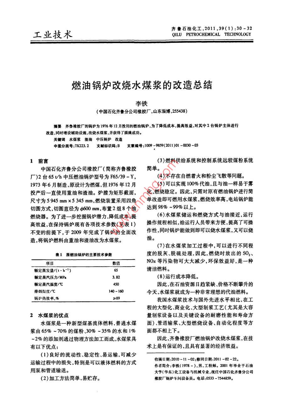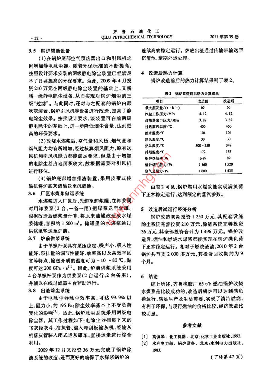 齊魯石油化工,2011,39(1):30-32工業(yè)技術(shù)QILU PETROCHEMICAL TECHNOLOGY燃油鍋爐改燒水煤漿的改造總結(jié)李鐵(中國石化齊魯分公司橡膠廠,山東淄博,255438)齊魯橡膠廠的鍋爐為1976年12月投用的燃油鍋爐,為了降低成本提高效益對其中2臺(tái)鍋爐主體進(jìn)行增設(shè)輔助設(shè)施改燒水煤漿,并獲得了圓滿成功關(guān)鍵詞水煤漿渣油中壓鍋爐改造中圖分類號(hào):1K22.2文獻(xiàn)標(biāo)識(shí)碼:B文章編號(hào):1009-9859(2011)01-0030-031前育(3)燃料供給系統(tǒng)和控制系統(tǒng)遠(yuǎn)較煤粉系統(tǒng)中國石化齊魯分公司橡膠廠(簡稱齊魯橡膠簡單廠)2臺(tái)65Uh中壓燃油鍋爐型號(hào)為F65/39-Y,(4)不存在自燃著火和粉塵飛散等問題1973年6月制造,原設(shè)計(jì)為燃煤,但1976年12月5)可以實(shí)現(xiàn)100%代油,且與油一樣易于霧投產(chǎn)后一直使用重油和渣油。爐膛為矩形截面,化燃燒穩(wěn)定。因此只需對原有燃油鍋爐進(jìn)行簡尺寸為5945mmx5345mm,燃燒裝置采用四角單改造即可燃用水煤漿燃燒效率高電站鍋爐能切圓方式,切圓直徑為4600m,布置2組8個(gè)油達(dá)到98%-99%以上。燃燒器。為了進(jìn)一步挖掘鍋爐潛力降低成本提(6)水煤漿儲(chǔ)運(yùn)和燃燒方式與油接近,運(yùn)行高效益在保持鍋爐現(xiàn)有各項(xiàng)技術(shù)參數(shù)(見表1)操作規(guī)程相似給運(yùn)行人員帶來方便提高了可操不變的前提下,于2000年完成了鍋爐的全面改作性同時(shí)鍋爐能做到即可以燒水煤漿又可以燒造,將鍋爐燃料由重油和渣油改為水煤漿油(7)在水煤漿加工過程中,可以進(jìn)行不同程表1原燃油鍋爐的主要技術(shù)參數(shù)度的脫灰、脫硫處理,因此,燃燒時(shí)放出的SO2、項(xiàng)目數(shù)值NOx等污染物可大大減少,環(huán)保效益好,是一種額定蒸發(fā)量/(t·h1)清潔燃料。額定燕汽壓力/MPa3.82(8)運(yùn)行成本降低。額定蒸汽溫度/℃因此,在石油資源日趨緊缺、價(jià)格不斷攀升的排煙溫度/℃140~160今天,水煤漿就成為一種非常理想的代油燃料。鍋爐熱效率%我國水煤漿技術(shù)與國外先進(jìn)水平相比,在工程的大型化、商業(yè)化、大型制漿工藝(尤其是大容2水煤漿的優(yōu)點(diǎn)量制漿設(shè)備以及關(guān)鍵設(shè)備的耐磨性能和壽命方水煤漿是一種新型煤基流體燃料,普通水煤面)、管道輸漿、大型燃燒設(shè)備、自動(dòng)化程度等方漿由65%-70%的煤粉、30%35%的水和1%面都不相上下。2%的添加劑通過物理方法加工而成水煤漿具因此,齊魯橡膠廠燃油鍋爐改燒水煤漿,在技有以下優(yōu)點(diǎn):術(shù)上是有保證的,且具有顯著的經(jīng)濟(jì)效益(1)良好的流動(dòng)性、穩(wěn)定性、易運(yùn)輸,可減少運(yùn)輸過程中的損失,特別是可以液體燃料的方式收稿日期:2010-11-02;修回日期:2011-02-2。作者簡介:李鐵(1978-),男,工程師。2001年畢業(yè)于石油用泵和管道輸送。大學(xué)(華東)化工設(shè)備與機(jī)械專業(yè)現(xiàn)任中國石化齊魯分公司(2)加工方法簡單,易貯存。橡膠廠鍋爐車間設(shè)備員。電話:0533-7544859。第1期李鐵.燃油鍋爐改燒水煤漿的改造總結(jié)3改造措施3.1爐膛(1)因水煤漿燃燒器高度和寬度要大于油燃上二次風(fēng)燒器,原水冷壁的開口要作相應(yīng)改變。(2)為了強(qiáng)化水煤漿著火,在爐膛燃燒器區(qū)域布置一定數(shù)量的衛(wèi)燃帶,其布置圖如圖1和圖上一次風(fēng)2所示。更換減溫器中二次風(fēng)19下一次風(fēng)下二次風(fēng)更換水煤漿燃燒器,數(shù)圖3單角燃燒器布置示意設(shè)衛(wèi)燃帶5733燃燒器四角切圓布置,兩層一次風(fēng)燃燒器中均布置水煤漿噴嘴,正常運(yùn)行時(shí)投用8個(gè)水煤漿噴嘴。鍋爐啟動(dòng)時(shí),處于下二次風(fēng)噴口的點(diǎn)火油槍首先投用,啟動(dòng)鍋爐到一定負(fù)荷時(shí)再逐個(gè)投入圖1鍋爐主體改造示意水煤漿主燃燒器,待鍋爐達(dá)到要求負(fù)荷并且水煤漿能穩(wěn)定燃燒時(shí),停用點(diǎn)火油槍。A My燃用水煤漿時(shí),鍋爐最低負(fù)荷約為50%3.3水煤漿噴嘴采用由浙江大學(xué)研制的撞擊式多級(jí)霧化型水煤漿噴嘴,如圖4所示,容量為1.6U/h。左側(cè)墻右側(cè)墻2級(jí)霧化頭撞擊頭混合室混合室2燃燒器區(qū)域衛(wèi)燃帶布置示意化氣霧化氣3級(jí)霧化氣(3)增加部分開孔,如燃燒器附近的打焦孔、吹灰孔等圖4水煤漿噴嘴結(jié)構(gòu)示意3.2燃燒器在原燃燒器位置安裝水煤漿燃燒器。設(shè)計(jì)燃3.4更換減溫器燒器共5層,一次風(fēng)2層,二次風(fēng)3層,自上而下根據(jù)熱力學(xué)計(jì)算,過熱器和省煤器等均不需分別為上二次風(fēng)、上一次風(fēng)、中二次風(fēng)、下一次風(fēng)要作改動(dòng)。由于減溫水量的要求有所變化,故更和下二次風(fēng)。其布局如圖3所示。換減溫器減溫器位置如圖1所示。齊魯石油化工QILU PETROCHEMICAL TECHNOLOGY2011年第39卷3.5鍋爐輔助設(shè)備連續(xù)高效穩(wěn)定運(yùn)行。爐底出渣通過傳輸帶輸送至(1)在鍋爐尾部空氣預(yù)熱器出口和引風(fēng)機(jī)之沉渣池,定期外運(yùn)處理。間增加靜電除塵器。隨著環(huán)保標(biāo)準(zhǔn)的不斷提高按照設(shè)計(jì)要求安裝的兩級(jí)靜電除塵裝置已經(jīng)滿足4改造后熱力計(jì)算不了日益提高的環(huán)保要求。為此,2009年4月投鍋爐改造前后的熱力計(jì)算結(jié)果列于表2。資210萬