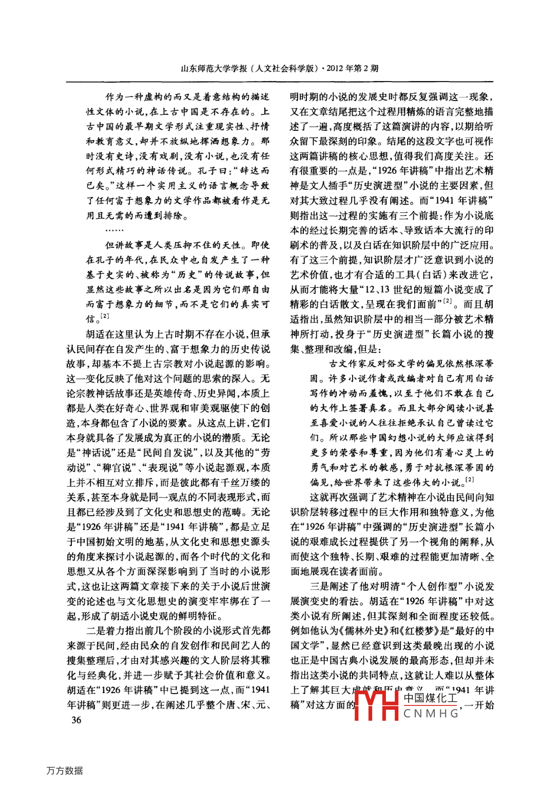 山東師范大學(xué)學(xué)報(人文社會科學(xué)版)2012年第57卷第2期(總第241期)JOURNAL OF SHANDONG NORMAL UNIVERSITY Humanities and Social Sciences)2012 Vol 57 No 2( Senal No 241)中國的小說(1941)胡適著,張揚2譯(2山東師范大學(xué)文學(xué)院,山東濟南,250014)摘要:中國的小說最初來自于民間、發(fā)展于民間,被保守的文人鄙視。但當它的流行程度和內(nèi)在美感達到了足夠的程度,它就要強迪自己引起知識階級的強烈關(guān)注了。知識階級從不識字的民眾中獲得了這些偉大的史詩般的傳說,潤飾之,修正之,某些情況下重構(gòu)之,從而使之成為中國傳奇中的偉大經(jīng)典。這些起源于流行的經(jīng)過修訂的名著變成了新藝術(shù)形式、新語言和新文學(xué)的老師,靠著它們的教導(dǎo),中國的上流階層專心學(xué)習(xí)創(chuàng)作他們的原創(chuàng)小說,不全是當作一種文學(xué)娛樂,也當作一種社會諷剌,當作一種社會批判和變革的工具。關(guān)鍵詞:胡適;小說史觀;《中國的小說》中圖分類號:D207.41文獻標識碼:A文章編號:1001-5973(2012)02-0030-08形式。小說和戲劇這樣在情和懸而未決處需要想象力支撐的文體,在上古作者的手中沒有發(fā)展起來。作為一種虛構(gòu)的而又是著意結(jié)構(gòu)的描述性文但講故事是人類壓抑不住的天性。即使在孔體的小說,在上古中國是不存在的。上古中國的子的年代,在民眾中也自發(fā)產(chǎn)生了一種基于史實最早期文學(xué)形式注重現(xiàn)實性、抒情和教育意義,卻的、被稱為“歷史”的傳奇故事,但顯然這些故事并不放縱地揮灑想象力。那時沒有史詩,沒有戲之所以出名是因為它們那自由而富于想象力的細劇,沒有小說,也沒有任何形式精巧的神話傳說。節(jié),而不是它們的真實可信。孔子曰:“文勝質(zhì)則孔子曰:“辭達而已矣?!边@樣一個實用主義的語史。”他可能指的是那些傳說帝國、開國君王、賢言概念導(dǎo)致了任何富于想象力的文學(xué)作品都被看臣名將的奇幻歷史傳說。傳說包含了大量的有趣作是無用且無需的而遭到排除。但不總是可信的細節(jié),就像戲劇、神諭、預(yù)言以及確實,在成百上千種上古文學(xué)作品中,沒有一想象出來的會話和演講。部是在落筆前就已經(jīng)計劃好了的。大部分上古作公元前4世紀的孟子不得不經(jīng)常指責(zé)他的學(xué)品是言論集、文選、事件記錄,散落在主題大多互生,因為他們引用那些流行的傳說故事,就像那些不相關(guān)的最好的散文中。精心計劃的文學(xué)作品,傳說故事是真實歷史的某些部分一樣。他也經(jīng)常例如古希臘悲劇或柏拉圖的《對話錄》,在上古中因為那些傳說故事是“齊東野人之語”或“好事者國并不存在。上古中國有兩種發(fā)達的文學(xué)形式,為之”而嘲諷他們。即抒情詩和散文。在公元前4世紀,實質(zhì)是為了我們現(xiàn)在大致確定一些已經(jīng)在歷史上消逝的闡明或爭論觀點的散文開始成型。中國的作者似事件的記錄,最初是屬于被孔子和孟子定性為幻乎認為不需要發(fā)展出更大的超越散文結(jié)構(gòu)的文體想歷史故事的。比如說“晉文公(公元前628年收稿日期:2011-12-01作者譯者簡介:1胡適(1891-1962),男,安徽績溪人,中國現(xiàn)代著名學(xué)者。2張揚(1977—),男,山東棗莊人,山東師范大學(xué)文學(xué)院博士研究生。①本文為胡適1941年在美國演講的講稿譯文。胡適研究中國小說史的作品極少,目前發(fā)現(xiàn)最完整、最有學(xué)術(shù)價值的也不是中文之作,而是他在1926年和1941年的兩部同名英文演講《中國的小說》。由于目前僅只1926年中國煤化工極少為人所知因此筆者特將該講稿譯出,以供學(xué)界參考。CNMHG胡適,等:中國的小說(1941)去世)的逃難旅程”和“趙氏孤兒”這樣的傳說。識階層的散文和詩歌作者造成了一些較大影響。后者經(jīng)常被后世搬上舞臺,并變成了伏爾泰的一位評論家指出白居易著名的《長恨歌》很顯然部著名戲劇受到了佛教“變文”的影響。但關(guān)于這種影響的這樣一來,中國的講故事者們在這些上古歷最有趣的證據(jù)是7至9世紀的古典作者們樂于創(chuàng)史傳說中獲得了最初的訓(xùn)練。這些歷史傳說故事作一些結(jié)構(gòu)發(fā)展得相當不錯的短篇故事。這些短不需要創(chuàng)作劇情,只需要搜集據(jù)說是傳記和年代篇故事沒有總稱,但有時被稱為“傳奇”,意思是記的素材,并圍繞其原始結(jié)構(gòu)組織、渲染和細化。怪異或新奇的故事”。這些故事描寫浪漫愛情、英雄事跡、良善得報或怪異破案。大概有上百種這些故事流傳了下來,其中最然后,一種來自印度的偉大宗教,與它那大量早的一篇是張鷟的《游仙窟》。公元700年左右的造像精美動人的儀式和極具想象力的文字與它在中國失傳,卻在日本得以保存。這個故事描哲思一起進入了中國。上古中國的傳統(tǒng)宗教很快述了作者是如何在一次去西北的奉使旅途中偶遇就被大乘佛教給擊敗超越了。這種新的宗教延續(xù)兩位美女,夜宿其家,雙方頻頻酬唱調(diào)情求歡之了2000年,從根本上影響甚至改變了中國人的宗詩。據(jù)說在7世紀的日本這個故事極為流行,并教、哲學(xué)和藝術(shù)生活。影響了該國的宮廷生活和文學(xué)潮流。著名的日本上古中國沒有天國或天界的概念,而印度給首部長篇小說——也許是世界