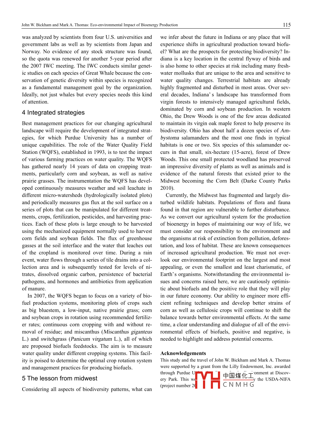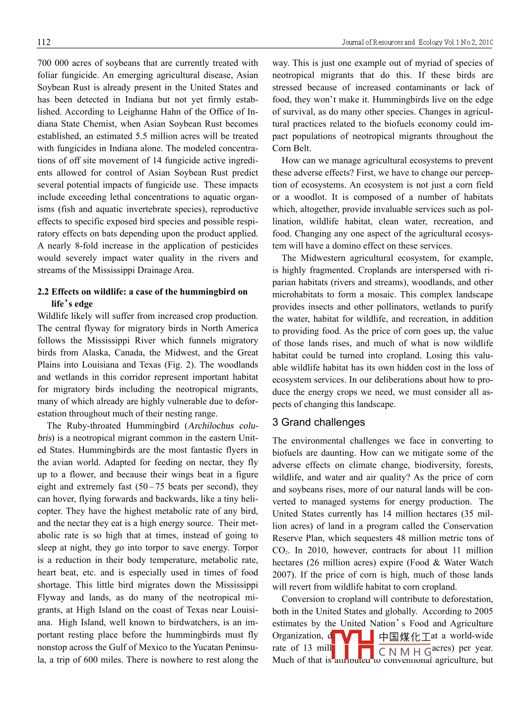 June 2010Journal of resources and EcologyVol 1. No. 2J. Resour.Eco.20101(2)110-116DO:103969/ J. Issn.1674-764×201002.002ArticleEco-environmental Impact of Bioenergy productionJohn W. Bickham' and Mark A. thomas1 Center for the Environment, Purdue University, 266 Mann Hall, 203 S Martin Jischke Drive, West Lafayette, IN 47907, U.S.A2 Department of Agricultural and Biological Engineering, Purdue University, 225 S. University Street, West Lafayette, IN 47907, U.S.AAbstract: This paper focuses on the eco-environmental aspects of u.s. biofuel production, a grand energyhallenge with an important role in addressing new alternative energy sources. Policy driven approacheshave made U.s. biofuels attractive for economic, environmental and strategic reasons with a potential toimprove national security issues. Despite the many potential benefits of biofuels we will examine causefor concerns relating to biofeedstock supplies, agro-chemical usage on intensively managed landscapesand potential impacts to terrestrial wildlife in North America. The environmental and economic effects offuture biofuels are generally perceived as positive; nonetheless, it will be critical to peruse and develop abiofuels economy with caution to safeguard systems sustainability.Key words: biodiversity; biofuels; wildlife; terrestrial habitats; conservation; agricultural ecosystems1 Introductioneconomy of rural America by providing additional itcome sources to local producers via feedstock productionBiofuels are attractive for economic, environmental and Notwithstanding that the environmental and economic ef-strategic reasons. Reducing our dependency on foreign oil fects of biofuels are generally perceived as positive: weis a key national security issue. The United States derives should develop our biofuels economy with caution. Therebiofuels from corn, to produce ethanol, and soybeans to exist causes for concern that suggest we must take care inproduce biodiesel. In some tropical countries, sugar cane how we manage and develop our biofuel systems in orderis used to produce ethanol. Brazil has derived great eco- to ensure that society reaps the maximum benefits withnomic benefit from sugar cane derived biofuels and has the least risk to the environment. As an example, in thelargely freed itself from dependence on foreign oil. In ad-case of cellulosic biofeedstock production, it will be critidition, biodiesel can be derived from palm oil and other cal to balance harvesting unprocessed agricultural cropplants that grow well in tropical countriesresidues or dedicated energy crops for biofuels owing toAlthough corn and soybeans are excellent sources of the need to protect soil and water resources(Engel et albiofuels, cellulosic feedstocks clearly are the wave of the 2010: Cruse et al. 2009)future. However, regional adaptability, productivity andsustainability are factors that will influence feedstock se-2 Causes for concernlection, which is expected to vary across geographic land- In 2008, there were six existing ethanol refineries in Indiscapes(Engel et al. 2010). Hybrid poplar(populus hybrid ana, six new refineries under construction, and plans foL ) switchgrass(Panicum virgatum L ) miscanthus(Mis- 16 more. Once the 12 plants, existing and under construc-canthus giganteus L ) and even managed prairie ecosys- tion are on line, they will produce 800 million gallons oftems are potential sources of cellulosic biofuels. If we can ethanol per year and consume 300 million bushels ofsolve the problems of effectively transforming this bio- corn; roughly 30 percent of Indiana's 2008 corn produc-mass into cellulosic ethanol or other fuels, there will be tion. If the 16 planned refineries are built, then about 75significant environmental gains in greenhouse gas reduc- percent of Indianas corn crop could be used to producetions as opposed to grain-based feedstocks and processes grain-based biofuels. In the absence of new technologiescurrently availableand alternative feedstock sources, the potential effects ofProduction of biofuels would potentially benefit the biofuel demands on grain-for-food production would be中國(guó)煤化工Received: 2010-05-18 Accepted: 2010-06-07CNMHGCorresponding author: John w. Bickham. Email: bickham(@purdue. eduJohn W. Bickham and Mark A. Thomas: Eco-environmental Impact of Bioenergy Productienormous. Another cause for concern is simply the scale cides, and herbicides, which will further impair waterof our consumption of fuel for transportation. If 100 per- quality. The Corn Belt contains some of the most producent of U.S. corn and soybean production as it stands to- tive agricultural land in the United States, and is a primeday were used to produce biofuels, it would produce only target for production of biofuels. The Corn Belt also overenough to replace 12 percent of gasoline and 6 percent of lays an area drained by several major tributaries to thebiodiesel based on current usage(Hill et al. 2006)Mississippi river, the largest river in the United StatesMany of the anticipated environmental benefits could (Fig. 1). This is the sewage system, if you will, that drainsbe partially offset by negative impacts, especially if corn the agricultural heartland of the country. As the biofuelsis the main source of biofuels(Engel et al. 2010; Thomas economy grows, there will likely be a need to rely onet al. 2009). If corn production significantly increases, the more intensive use of nitrogen and pesticides which wiresult will be more air pollution from the fossil fuels used impact water quality. a hypoxic zone appears each year inin farming and transporting. In addition, some ethanol the Gulf of Mexico, which is thought to be the result ofplants use approximately four gallons of water for every fertilizers from the Corn Belt that drain into the Mississipgallon of ethanol produced, so water usage will be an im- pi river, it is decimating to fisheries in the Gulf and im-portant issue in some states until better methods a