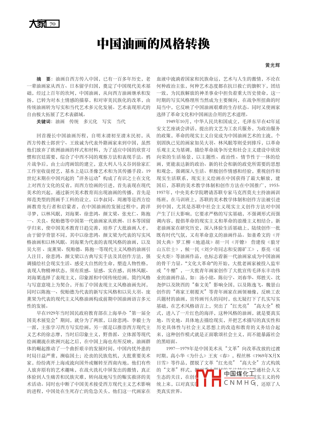 MERO中國(guó)油畫(huà)的風(fēng)格轉(zhuǎn)換黃光輝摘要:油畫(huà)自西方傳入中國(guó),已有一百多年歷史,老血液中流淌著國(guó)家和民族命運(yùn),藝術(shù)與人生的激情,不論在輩油畫(huà)家從西方、日本留學(xué)歸國(guó),奠定了中國(guó)現(xiàn)代美術(shù)基何種政治主張,何種藝術(shù)態(tài)度都在抗日救亡的旗幟下,團(tuán)結(jié)礎(chǔ),經(jīng)過(guò)上百年的坎坷,中國(guó)油畫(huà),從向西方油畫(huà)繼承和發(fā)一致,為民族解放的神圣事業(yè)中擔(dān)負(fù)著重大歷史使命,這揚(yáng),已轉(zhuǎn)為對(duì)本土情感的描摹,和對(duì)審美民族化的改革,由時(shí)期的寫(xiě)實(shí)風(fēng)格理所當(dāng)然成為主要傾向,在戰(zhàn)爭(zhēng)所扭曲的時(shí)傳統(tǒng)油畫(huà)轉(zhuǎn)為寫(xiě)實(shí)和當(dāng)代藝術(shù)多元化發(fā)展。藝術(shù)表現(xiàn)形式的局當(dāng)中,它反映了中國(guó)油畫(huà)艱難的生存狀態(tài)。同時(shí)又使畫(huà)家自由極大拓展了藝術(shù)表疆域選擇了革命文化和中國(guó)畫(huà)法合用的藝術(shù)道理。關(guān)鍵詞:油畫(huà)傳統(tǒng)多元化寫(xiě)實(shí)當(dāng)代1949年10月,中華人民共和國(guó)成立,毛澤東早在42年延安文藝座談會(huì)講話(huà),提出的文藝為工農(nóng)兵服務(wù),為政治服務(wù)回首漫長(zhǎng)中國(guó)油畫(huà)歷程,自明末清初至清末民初,從的政策,革命的現(xiàn)實(shí)主義自覺(jué)成為中國(guó)油畫(huà)藝術(shù)的主流,個(gè)西方傳教士郎世寧、王致誠(chéng)為代表外籍畫(huà)家來(lái)到中國(guó),雖然別固執(zhí)己見(jiàn)的畫(huà)家如吳大羽、林風(fēng)眠等則受到排斥,以革命他們放棄了歐洲油畫(huà)的樣式和材料,為了適應(yīng)中國(guó)的欣賞習(xí)樂(lè)觀主義為基調(diào),描繪革命戰(zhàn)爭(zhēng)歷史和社會(huì)主義建設(shè)中欣欣慣和宮廷需要,綜合了中西不同的觀察方法和表現(xiàn)手法。鴉向榮的生活場(chǎng)景,以主題性、政治性、情節(jié)性于一體的繪片戰(zhàn)爭(zhēng)后,由土山灣畫(huà)館的建立,意大利人馬義谷到徐家匯畫(huà),更能表達(dá)新的政治、新的社會(huì)和新的政黨所需要的思想工作室收徒授藝,基本上是以圣像藝術(shù)和為其傳播手段。19和觀念,強(qiáng)調(diào)深入生活、積極創(chuàng)作情感和經(jīng)驗(yàn),重視創(chuàng)作和世紀(jì)末期在中國(guó)興起的“洋務(wù)運(yùn)動(dòng)”構(gòu)成了有識(shí)之士在文化現(xiàn)實(shí)生活聯(lián)系,現(xiàn)實(shí)主義繪畫(huà)在中國(guó)獲得了最大解放,建上對(duì)西方文化的反省,而西方繪畫(huà)的引進(jìn),首先表現(xiàn)在現(xiàn)代國(guó)后,蘇聯(lián)的美術(shù)教學(xué)體制和創(chuàng)作方法在中國(guó)推廣,1955美術(shù)的興起,通過(guò)新興美術(shù)教育而出現(xiàn)油畫(huà)的傳播,首先是1957年,中央美術(shù)學(xué)院聘請(qǐng)?zhí)K聯(lián)專(zhuān)家馬克西莫夫主持油畫(huà)訓(xùn)師范類(lèi)型的圖畫(huà)手工科的設(shè)立,以李叔同、周湘等是西方繪練班,在馬訓(xùn)班上,蘇聯(lián)的美術(shù)教學(xué)體制和創(chuàng)作方法被引進(jìn)畫(huà)教育先行者和啟蒙者,在中國(guó)油畫(huà)的發(fā)展過(guò)程中,跨洋到中國(guó),尤其是蘇聯(lián)中社會(huì)主義現(xiàn)實(shí)主義創(chuàng)作方法對(duì)中尋夢(mèng),以林風(fēng)眠,劉海粟、徐悲鴻、顏文梁、張充仁、陳抱產(chǎn)生了巨大影響,它要求嚴(yán)格的寫(xiě)實(shí)基礎(chǔ),不強(qiáng)調(diào)形式而強(qiáng)關(guān)良、倪貽德等中國(guó)第一代油畫(huà)家從歐洲、日本等國(guó)留調(diào)內(nèi)容,提倡革命的現(xiàn)實(shí)主義和革命的浪漫主義相結(jié)合,新學(xué)歸來(lái),使中國(guó)美術(shù)教育日趨完善,培養(yǎng)了大批油畫(huà)人才,老油畫(huà)家在研究歷史,深入體驗(yàn)生活基礎(chǔ)上,陸續(xù)創(chuàng)作一批由于留學(xué)背景不同,其中以徐悲鴻、顏文梁為代表的寫(xiě)實(shí)風(fēng)既有時(shí)代氣氛,又有革命意義的油畫(huà)作品。如董希文的《開(kāi)格油畫(huà)和以林風(fēng)眠、劉海粟為代表的表現(xiàn)風(fēng)格的油畫(huà),以及國(guó)大典》羅工柳《地道戰(zhàn)》胡一川《開(kāi)鐐》詹建俊《狼牙吳大羽、龐薰琹、倪貽德、陳抱-等現(xiàn)代主義風(fēng)格的油畫(huà)引山五壯士》,候一民《劉少奇同志和安源礦工》,蔡亮《延人注目,徐悲鴻、顏文梁以古典寫(xiě)實(shí)手法及其創(chuàng)作方法,強(qiáng)安火炬》等油畫(huà)作品,也標(biāo)志著新一代油畫(huà)家成為中國(guó)油畫(huà)調(diào)描繪社會(huì)現(xiàn)實(shí)生活、感受大自然的生命,塑造人物性格,的骨干力量。"文化大革命"的開(kāi)始,大批老畫(huà)家被投入監(jiān)牢表現(xiàn)人物精神狀態(tài),須有質(zhì)感、量感、實(shí)在感,而林風(fēng)眠、或“牛棚”,一大批青年畫(huà)家創(chuàng)作了大批宣傳毛澤東豐功偉劉海粟選擇了表現(xiàn)主義,印象派和中國(guó)傳統(tǒng)繪畫(huà),簡(jiǎn)約風(fēng)格業(yè)的油畫(huà)作品,如:湯小銘、陳衍寧、劉春華、鄭勝天、沈與寫(xiě)意意境上為契合,開(kāi)拓了中國(guó)表現(xiàn)主義風(fēng)格油畫(huà)先河,堯伊以及陜西的“秦文美”影響全國(guó),以及陳逸飛、魏景山同時(shí)以陳