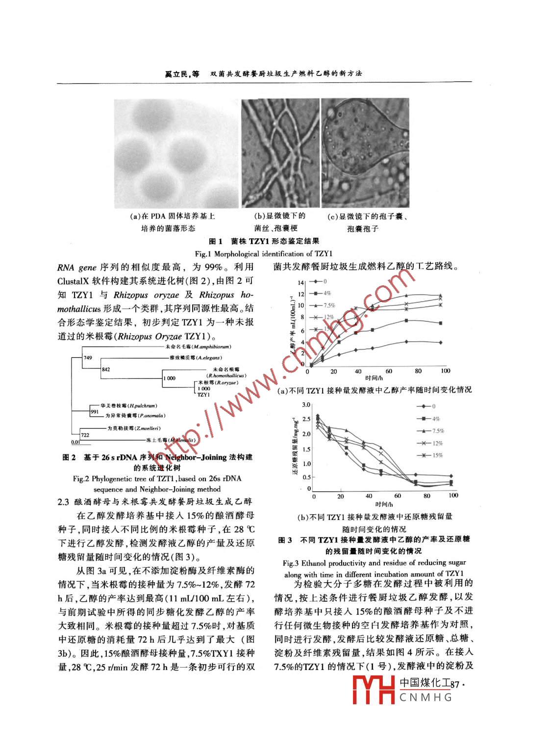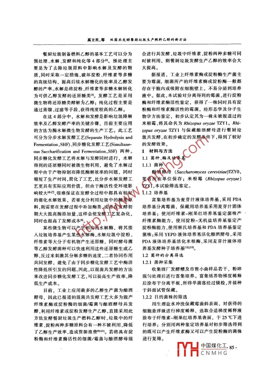 第29卷第5期可再生能源Vol 29 No52011年10月Renewable Energy Resources0ct.2011雙菌共發(fā)酵餐廚垃圾生產(chǎn)燃料乙醇的新方法奚立民,張昕欣,柯中爐,于紅艷,曹樹勇(臺州職業(yè)技術(shù)學院生物與化學工程系,浙江臺州318000摘要:試驗對分離得到的霉菌進行淀粉酶和纖維素酶活性鑒定,獲得了一株同時具有淀粉酶和纖維素酶活性的新霉菌。經(jīng)形態(tài)學及分子生物學方法鑒定,初步認定其為一株未被報道過的米根霉,將其命名為 Rhizopusoryzae TZY1。 Rhizopus oryzae TZY與保藏釀酒酵母進行餐廚垃圾共發(fā)酵在沒有外加任何酶類的條件下發(fā)酵后大部分的淀粉及纖維素被利用,發(fā)酵乙醇產(chǎn)率與糖化發(fā)酵結(jié)果大致相等。發(fā)酵后經(jīng)檢測,淀粉的利用率在88%以上,纖維素的利用率在84%左右,較之同步糖化發(fā)酵,該方法可以部分避免由于酶失活而使乙醇產(chǎn)率降低的問題,并且不需外加糖化酶類,節(jié)約了成本,具有良好的產(chǎn)業(yè)化應(yīng)用前景。關(guān)鍵詞:共發(fā)酵;餐廚垃圾;米根霉;燃料乙醇;乙醇產(chǎn)率中圖分類號:TK6;X705文獻標志碼:A文章編號:1671-5292(2011)05-0084-0The co-fermentation of fuel ethanol produced from kitchengarbage by double strainsXI Li-min, ZHANG Xin-xin, KE Zhong-lu, YU Hong-yan, CAO Shu-yongDepartment of Biology and Chemistry Engineering, Taizhou Vocation Technical College, Taizhou 318000, China)Abstract: A mildew which had the amylase and cellulase activities simultaneously was screenedy activity identification of fungi sample. The result of morphological and molecular identification showed that the strain was a new Rhizopus oryzae(named TZY 1). Rhizopus oryzae tZY1 andaccharomyce scerevisiae were co-inoculated into the kitchen garbage for fuel ethanol fermentation. Without any enzymes addition, most starch and cellulose were consumed after fermentationAccording to the result of detection, the ethanol productivity was approximately equal to the si-multaneous saccharification fermentation (SSF), the utilization of starch was more than 88%, andcellulose was about 84%. Compared with SSF, the method could partly avoid the decrease ofethanol production caused by inactivation of enzymes. For it is relatively simple and inexpensive,the method in the paper provided a good prospect of industrialized applicationKeywords: co-fermentation; kitchen garbage; Rhizopus oryzae; fuel ethanol; ethanol productiv-0引言不適于傳統(tǒng)的焚燒、填埋方法處理;由于其含鹽量餐廚垃圾是指產(chǎn)生于餐飲經(jīng)營與居民生活的高,用于做堆肥原料也受到很大的限制叫。因此食物加工下腳料(廚余)和食用殘余(泔腳),主要利用餐廚垃圾生產(chǎn)燃料乙醇具有環(huán)境保護及可再含有淀粉、纖維素、蛋白質(zhì)和動植物油等有機質(zhì),生能源開發(fā)的雙重意義。收稿日期:2010-08-12?;痦椖?浙江省臺州市科研計劃項日(08KY13)。作者簡介;奚立民(1957-),男,教授,從事有機合成與催化專業(yè)技術(shù)的研究與教學。E-mil;xilm@Ptzvtc.com中國煤化工CNMHG奚立民,等雙茵共發(fā)酵餐廚垃媛生產(chǎn)燃料乙醇的新方法餐廚垃圾制備燃料乙醇的基本工藝可以分為合進行共發(fā)酵,垃圾中纖維素淀粉兩種多糖可同預處理、水解發(fā)酵和純化等4部分。預處理主時被利用,則餐廚垃圾發(fā)酵生產(chǎn)乙醇的效率會大要是為了去除垃圾原料中影響水解及發(fā)酵的物大提高。質(zhì),同時采取一定措施,破壞淀粉、纖維素等多糖據(jù)報道,工業(yè)上纖維素酶或淀粉酶生產(chǎn)菌主的高級結(jié)構(gòu),提高后續(xù)水解糖化的效率及乙醇發(fā)要為霉菌,細菌所產(chǎn)的纖維素酶或淀粉酶一般都酵的產(chǎn)率。水解是將淀粉、纖維素等多糖水解轉(zhuǎn)化存在于胞內(nèi)或吸附在細胞壁上,不易分泌到培養(yǎng)為可供乙醇發(fā)酵的還原糖類國。發(fā)酵工藝是采用液中。據(jù)此,本試驗對分離得到的霉菌,進行淀粉微生物將還原糖類酵解為乙醇;純化過程主要是酶和纖維素酶活性鑒定,獲得了一株同時具有淀通過蒸餾、過濾等手段,獲得純度較高的乙醇粉酶和纖維素酶活性的霉菌。經(jīng)形態(tài)學及分子生在這4部分中,水解和發(fā)酵是影響垃圾降解物學方法鑒定,初步認定其為一株未被報道過的效率及乙醇發(fā)酵產(chǎn)率的關(guān)鍵步驟,目前主要應(yīng)用米根霉,將其命名為 Rhizopus oryzae TErI。Rhi的方法為酶水解微生物發(fā)酵的生產(chǎn)工藝。此工藝 opus oryzae TZY1與保藏釀酒酵母進行餐廚垃可分為分步水解發(fā)酵工藝 (Separate Hydrolysis and圾共發(fā)酵,在初步確定的發(fā)酵條件下,得到了較好Fermentation,SHF)、同步糖化發(fā)酵工藝 Simultane的發(fā)酵效果ous Saccharification and Fermentation,SF)兩種。1材料與方法同步糖化發(fā)酵工藝將水解與發(fā)酵同時進行,水解1.1菌種、酶及培養(yǎng)基得到的還原糖同時被微生物利用,避免了水解過111菌種程中由于產(chǎn)物抑制而降低酶解效率的問題,同時釀酒酵母( Saccharomyces cerevisiae)TZY0縮短了生產(chǎn)時間,簡化了工藝,比分步水解發(fā)酵工筆者所在單位保存;米根霉( Rhizopus oryzae)藝更具有實際應(yīng)用價值。但由于酶活性受環(huán)境影T%Y1,本試驗篩選鑒定。響較大四,很難保證在發(fā)酵全過程中都具有較好1.12培養(yǎng)基的催化水解效果,若要充分利用垃圾中的糖類原富集培養(yǎng)基為麥芽汁液體培養(yǎng)基,采用PDA料,則需要在發(fā)酵過程中補加酶類,或者在發(fā)酵
