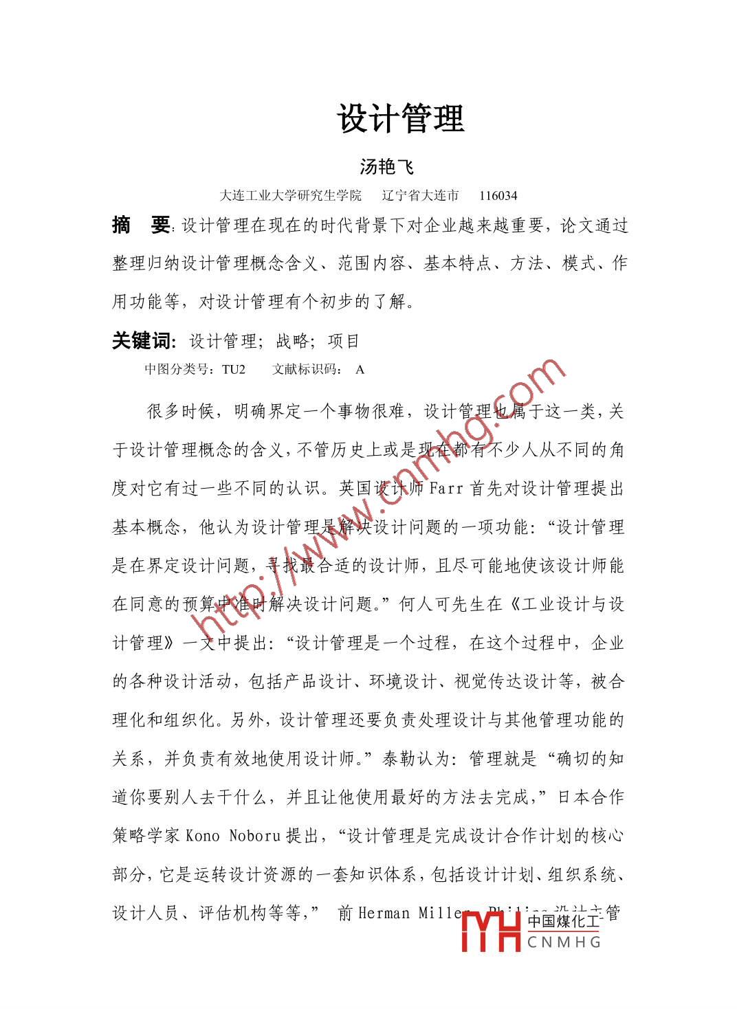 設計管理湯艷飛大連工業(yè)大學研究生學院遼寧 省大連市116034摘要: 設計管理在現(xiàn)在的時代背景下對企業(yè)越來越重要,論文通過整理歸納設計管理概念含義、范圍內(nèi)容、基本特點、方法、模式、作用功能等,對設計管理有個初步的了解。關鍵詞:設計管理;戰(zhàn)略;項目中圖分類號: TU2文獻標識碼: A很多時候,明確界定一個事物很難,設計管理也屬于這一類,關于設計管理概念的含義,不管歷史上或是現(xiàn)在都有不少人從不同的角度對它有過一些不同的認識。英國設計師Farr首先對設計管理提出基本概念,他認為設計管理是解決設計問題的一項功能:“設計管理是在界定設計問題,尋找最合適的設計師,且盡可能地使該設計師能在同意的預算中準時解決設計問題?!焙稳丝上壬凇豆I(yè)設計與設計管理》-文中提出:“設計管理是一個過程,在這個過程中,企業(yè)的各種設計活動,包括產(chǎn)品設計、環(huán)境設計、視覺傳達設計等,被合理化和組織化。另外,設計管理還要負責處理設計與其他管理功能的關系,并負責有效地使用設計師?!碧├照J為:管理就是“確切的知道你要別人去干什么,并且讓他使用最好的方法去完成,”日本合作策略學家KonoNoboru提出,“設計管理是完成設計合作計劃的核心部分,它是運轉(zhuǎn)設計資源的一套知識體系,包括設計計劃、組織系統(tǒng)、設計人員、評估機構(gòu)等等,”前 Herman Mille中國煤花主管TYHCNMH GRobert Blaich 提出,“設計管理是一個正式程序設計活動的完成,在公司內(nèi)通過長期合作項目的溝通來調(diào)節(jié)設計資源,以使所有合作活動達到一定水準,”韓國產(chǎn)業(yè)設計振興院院長鄭慶源提出,“設計管理是一個研究領域,它把設計管理作為一個管理的戰(zhàn)略工具,研究管理者、設計師和專家的知識結(jié)構(gòu),用以實現(xiàn)組織目標并創(chuàng)造有生命力的產(chǎn)品。設計管理旨在有組織地聯(lián)合創(chuàng)造性及合理性去完成組織戰(zhàn)略,并最終為促進環(huán)境文化做出貢獻?!笨偨Y(jié)來說,設計管理就是對設計過程的控制,設計管理者通過計劃、組織、領導和控制等職能合理利用一切可用資源,達到滿足用戶需求的目的。設計管理一般來說,它包含兩個層次,一是戰(zhàn)略層面的二是功能層面的。戰(zhàn)略層面的是指在戰(zhàn)略的高度上,把企業(yè)理念貫注到整個企業(yè)各項活動中,對企業(yè)各項活動進行引導。戰(zhàn)略是什么?戰(zhàn)略是企業(yè)的形象,是企業(yè)的發(fā)展目標,是企業(yè)未來十年幾十年的發(fā)展綱要,指導企業(yè)接下來要做什么和不做什么,發(fā)現(xiàn)自身優(yōu)勢,洞察先機。就是把企業(yè)戰(zhàn)略物化、視覺化的過程,把企業(yè)戰(zhàn)略化為視覺形象,制定完整的設計指導文件,以達到統(tǒng)一企業(yè)形象的目的。全球化的今天企業(yè)形象、品牌形象、產(chǎn)品形象等構(gòu)成了企業(yè)的軟實力,競爭的戰(zhàn)場已經(jīng)從企業(yè)的硬實力轉(zhuǎn)到了企業(yè)的軟實力,上,軟實力的優(yōu)劣成了企業(yè)競爭的關鍵。在市場競爭中,順應時代的發(fā)展戰(zhàn)略,良好的企業(yè)形象以及有力的執(zhí)行能力,企業(yè)將會獲得更加廣闊的發(fā)展空間、更加優(yōu)良的生存環(huán)境、更加強大的生命力。功能層面的是確保企業(yè)設計部門運轉(zhuǎn)良好中國煤化工具體MHCNMHG任務。功能性設計管理的主要內(nèi)容有三個方面,即設計事務管理、設計師管理和設計項目管理。為使 企業(yè)的設計活動能正常進行、設計效率的最大發(fā)揮,不僅要對設計組織設置管理,還要協(xié)調(diào)各部門的關系。由于企業(yè)及其產(chǎn)品自身性質(zhì)、特點的不同,規(guī)模、組織、管理模式也存在相應的差別。不同的企業(yè)應根據(jù)自身的情況選擇合適的設計管理模式。要對企業(yè)不同機構(gòu)人員的的工作進行協(xié)調(diào),以及對設計師的管理,如制定獎勵政策、競爭機制等,以此提高設計師的工作熱情和效率,保證他們在合作的基礎上競爭。只有在這樣的基礎上,設計師的創(chuàng)作靈感才能得到充分的發(fā)揮。隨著知識經(jīng)濟時代的到來,知識產(chǎn)權(quán)的價值對企業(yè)經(jīng)營有著特殊的意義。對設計工作者來說,首先要保證設計的創(chuàng)造性,避免出現(xiàn)模仿、類似甚至侵犯他人專利的現(xiàn)象,其次,要及時有效地對自己的創(chuàng)新成果進行保護。設計的本質(zhì)在 于創(chuàng)新,而風險與創(chuàng)新總是相伴而生,如影隨形。通過設計管理,查找設計創(chuàng)新的源頭,用科學的方法和工具規(guī)避設計風險,提高設計成功率。設計成果轉(zhuǎn)入生產(chǎn)以后的管 理對確保設計的實現(xiàn)至關重要。在生產(chǎn)過程中設計部門應當與生產(chǎn)部門密切合作,通過一定的方法對生產(chǎn)過程及最終產(chǎn)品實施監(jiān)督。設計在設計管理中具有重要的作用,所謂設計管理就是設計過程.的控制,核心是“人”也就是設計師,中心是“事”也就是設計,設計管理的特點離不開這“人”和“事”。設計管理高度重視設計。在企業(yè)中中設計是否戰(zhàn)略計劃的一部分,設計是否得到企業(yè)高層的重視并進入他們中國煤化工政策YHCNM HG是否深入企業(yè)的各個階層,這些可以看出設計在企業(
