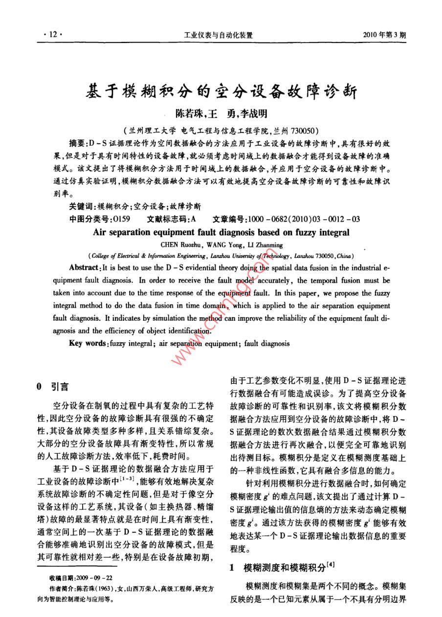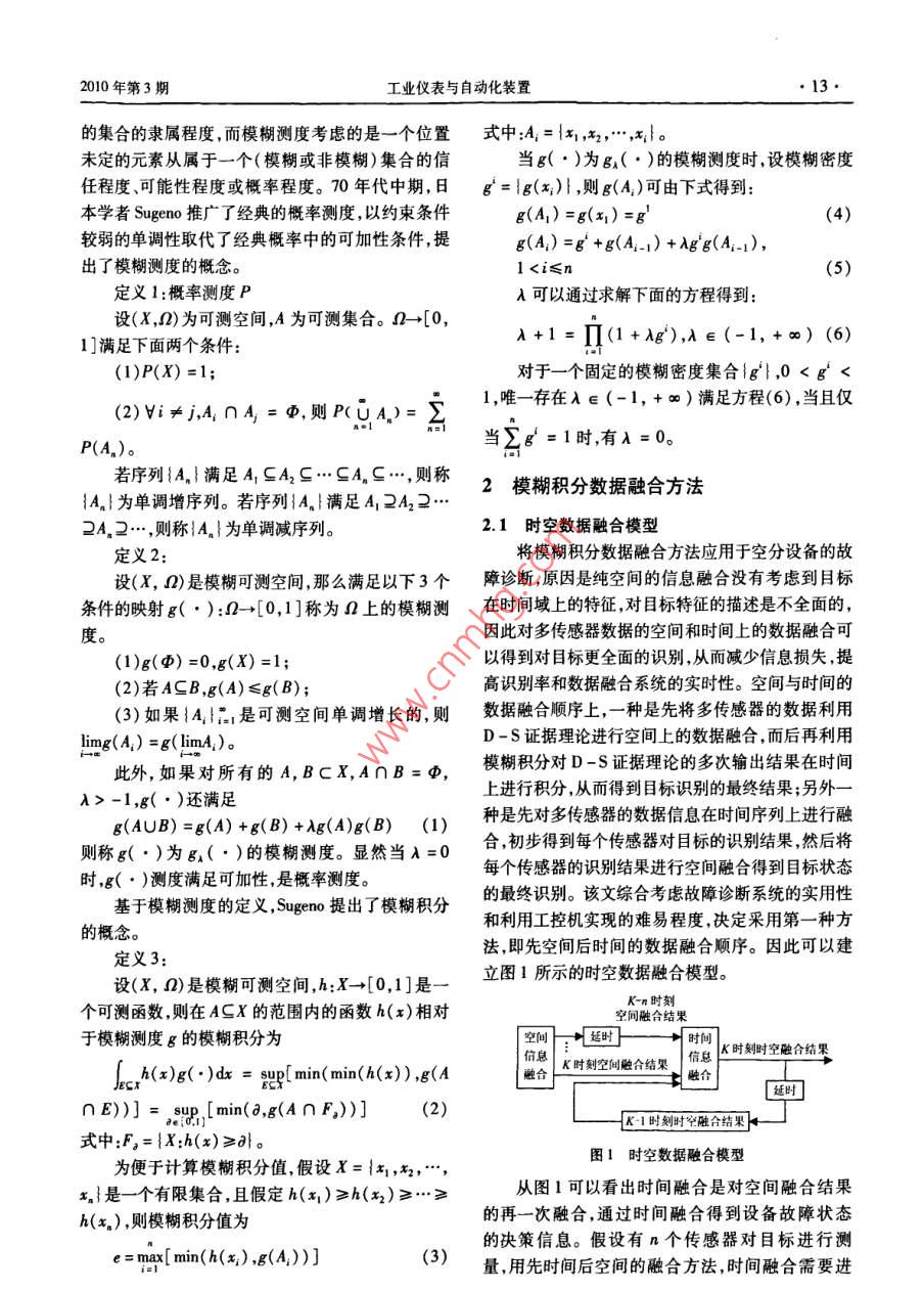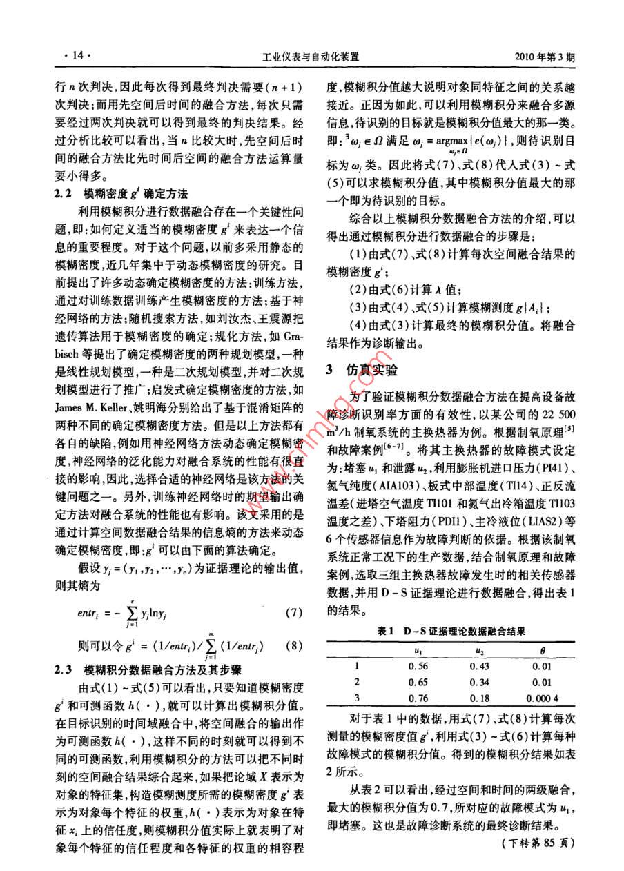 工業(yè)儀表與自動化裝置2010年第3期基于模糊積分的空分設(shè)備故障診新陳若珠,王勇,李戰(zhàn)明蘭州理工大學(xué)電氣工程與信息工程學(xué)院,蘭州70050)摘要:D-S證據(jù)理論作為空間數(shù)據(jù)融合的方法應(yīng)用于工業(yè)設(shè)備的故障診斷中,具有很好的效果,但是對于具有時(shí)間特性的設(shè)備故障,就必須考慮時(shí)間域上的數(shù)據(jù)融合才能得到設(shè)備故障的準(zhǔn)確模式。該文提出了將模糊積分方法用于時(shí)間域上的數(shù)據(jù)融合,并應(yīng)用于空分設(shè)備的故障診斷中。通過仿真實(shí)驗(yàn)證明,模糊積分?jǐn)?shù)據(jù)融合方法可以有效地提高空分設(shè)備故障診斷的可靠性和故障識別率。關(guān)鍵詞:模糊積分;空分設(shè)備;故障診斷中圖分類號:0159文獻(xiàn)標(biāo)志碼:A文章編號:1000-0682(2010)03-0012-03Air separation equipment fault diagnosis based on fuzzy integralCHEN Ruozhu, WANG Yong, LI ZhanmingCollege of Electrical& Information Erg, Lanzhou Uninersity of Technology, Lanzhou 730050, China)Abstract: It is best to use the d-s evidential theory doing the spatial data fusion in the industrial e-quipment fault diagnosis. In order to receive the fault model accurately, the temporal fusion must betaken into account due to the time response of the equipment fault. In this paper, we propose the fuzzyintegral method to do the data fusion in time domain, which is applied to the air separation equipmentfault diagnosis. It indicates by simulation the method can improve the reliability of the equipment fault di-agnosis and the efficiency of object identificationKey words: fuzzy integral; air separation equipment; fault diagnosis0引言由于工藝參數(shù)變化不明顯,使用D-S證據(jù)理論進(jìn)行數(shù)據(jù)融合有可能造成誤診。為了提高空分設(shè)備空分設(shè)備在制氧的過程中具有復(fù)雜的工藝特故障診斷的可靠性和識別率,該文將模糊積分?jǐn)?shù)性,因此空分設(shè)備的故障診斷具有很強(qiáng)的不確定據(jù)融合方法應(yīng)用到空分設(shè)備的故障診斷中,將D性,其設(shè)備故障類型多種多樣,且關(guān)系錯(cuò)綜復(fù)雜。S證據(jù)理論的數(shù)次數(shù)據(jù)融合結(jié)果通過模糊積分?jǐn)?shù)大部分的空分設(shè)備故障具有漸變特性,所以常規(guī)據(jù)融合方法進(jìn)行再次融合,以便完全可靠地識別的人工故障診斷方法,效率低下,耗費(fèi)時(shí)出待測目標(biāo)。模糊積分是定義在模糊測度基礎(chǔ)上基于D-S證據(jù)理論的數(shù)據(jù)融合方法應(yīng)用于的一種非線性函數(shù),它具有融合多信息的能力工業(yè)設(shè)備的故障診斷中山-3,能夠有效地解決復(fù)雜針對利用模糊積分進(jìn)行數(shù)據(jù)融合時(shí),如何確定系統(tǒng)故障診斷的不確定性問題,但是對于像空分模糊密度g的難點(diǎn)問題該文提出了通過計(jì)算D設(shè)備這樣的工藝系統(tǒng),其設(shè)備(如主換熱器、精餾s證據(jù)理論輸出值的信息嫡的方法來動態(tài)確定模糊塔)故障的最顯著特點(diǎn)就是在時(shí)間上具有漸變性,密度g。通過該方法獲得的模糊密度g能夠有效通??臻g上的一次基于D-S證據(jù)理論的數(shù)據(jù)融地表達(dá)某一個(gè)D-S證據(jù)理論輸出數(shù)據(jù)信息的重要合能夠準(zhǔn)確地識別出空分設(shè)備的故障模式,但是程度。其可靠性就相對差一些,特別是在設(shè)備故障初期1模糊測度和模糊積分收稿日期:2009-09-22作者簡介:陳若珠(1963),女,山西萬榮人,高級工程師研究方模糊測度和模糊集是兩個(gè)不同的概念。模糊集向?yàn)橹悄芸刂评碚撆c應(yīng)用等反映的是一個(gè)已知元素從屬于一個(gè)不具有分明邊界2010年第3期工業(yè)儀表與自動化裝置的集合的隸屬程度,而模糊測度考慮的是一個(gè)位置式中:A,={x1,x2,…,x1}。未定的元素從屬于一個(gè)(模糊或非模糊)集合的信當(dāng)g(·)為gA(·)的模糊測度時(shí)設(shè)模糊密度任程度、可能性程度或概率程度。70年代中期,日g=1g(x),則g(A)可由下式得到:本學(xué)者 Sugeno推廣了經(jīng)典的概率測度,以約束條件(A1)=g(x1)=g(4)較弱的單調(diào)性取代了經(jīng)典概率中的可加性條件,提g(A)=8+g(A1-1)+Ag(A-1),出了模糊測度的概念l-1,g(·)還滿足上進(jìn)行積分,從而得到目標(biāo)識別的最終結(jié)果;另外一8(AUB)=g(A)+g(B)+g(A)(B)(1)種是先對多傳感器的數(shù)據(jù)信息在時(shí)間序列上進(jìn)行融則稱g(·)為6(·)的模糊測度。顯然當(dāng)A=0合初步得到每個(gè)傳感器對目標(biāo)的識別結(jié)果然后將時(shí),g(·)測度滿足可加性是概率測度。每個(gè)傳感器的識別結(jié)果進(jìn)行空間融合得到目標(biāo)狀態(tài)基于模糊測度的定義, Sugeno提出了模糊積分的最終識別。該文綜合考慮故障診斷系統(tǒng)的實(shí)用性的概念。和利用工控機(jī)實(shí)現(xiàn)的難易程度,決定采用第一種方定義3:法即先空間后時(shí)間的數(shù)據(jù)融合順序。因此可以建設(shè)(X,Q)是模糊可測空間,h:X→[0,1]是立圖1所示的時(shí)空數(shù)據(jù)融合模型。個(gè)可測函數(shù),則在AX的范圍內(nèi)的函數(shù)h(x)相對空間融合結(jié)果于模糊測度g的模糊積分為空向},延時(shí)葉時(shí)間融合k時(shí)刻空間融合結(jié)果信總?cè)藭r(shí)刻時(shí)空融合結(jié)果信息h(x)g(. )dx= supl min( min(h(x)),8(A延時(shí)∩E))]=,su,min(a,g(A∩F)]「κ1時(shí)刻時(shí)空融合