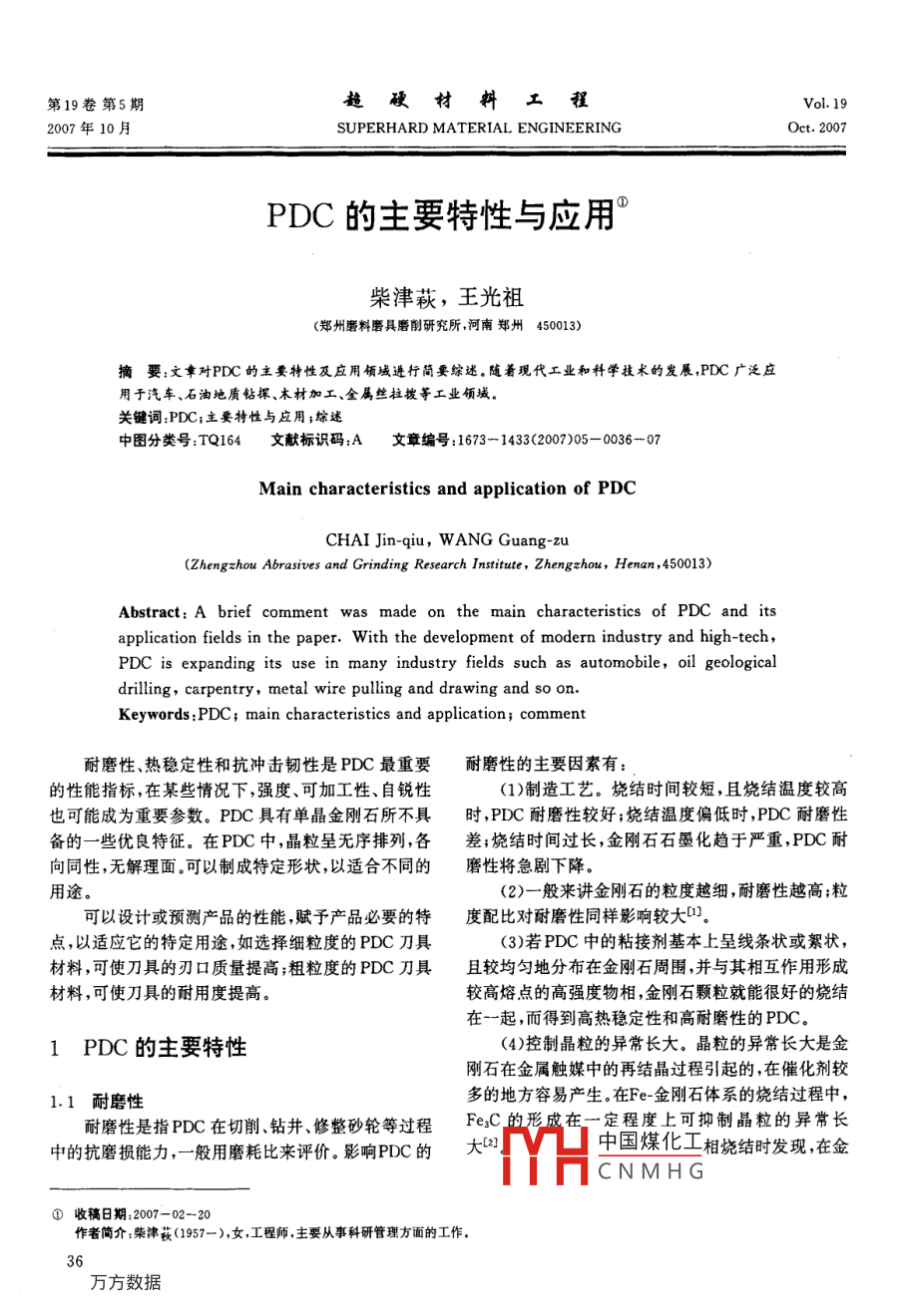 第19卷第5期越硬村料程Vol 192007年10月SUPERHARD MATERIAL ENGINEERINGOct.2007PDC的主要特性與應用柴津萩,王光祖(鄭州磨料磨具磨削研究所,河南鄭州450013)摘要:文章對PDC的主要特性及應用領(lǐng)域進行簡要綜述。隨著現(xiàn)代工業(yè)和科學技術(shù)的發(fā)展,PDC廣泛應用于汽車、石油地質(zhì)鉆探、木材加工、金屬絲拉撥等工業(yè)領(lǐng)域。關(guān)鍵詞:PDC;主要特性與應用;綜述中圖分類號:TQ164文獻標識碼:A文章編號:1673-1433(2007)05-036-07Main characteristics and application of pDcCHAI Jin-qiu, WANG Guang-zu(Zhengzhou Abrasives and Grinding Research Institute, Zhengzhou, Henan, 450013)Abstract:a brief comment was made on the main characteristics of PDC and itsapplication fields in the paper. With the development of modern industry and high-techPDC is expanding its use in many industry fields such as automobile, oil geologicadrilling, carpentry, metal wire pulling and drawing and so onKeywords: PDC; main characteristics and application; comment耐磨性、熱穩(wěn)定性和抗沖擊韌性是PDC最重要耐磨性的主要因素有的性能指標,在某些情況下,強度、可加工性、自銳性(1)制造工藝。燒結(jié)時間較短,且燒結(jié)溫度較高也可能成為重要參數(shù)。PDC具有單晶金剛石所不具時,PDC耐磨性較好;燒結(jié)溫度偏低時,PDC耐磨性備的一些優(yōu)良特征。在PDC中,晶粒呈無序排列,各差;燒結(jié)時間過長,金剛石石墨化趨于嚴重,PDC耐向同性,無解理面??梢灾瞥商囟ㄐ螤?以適合不同的磨性將急劇下降。用途。(2)一般來講金剛石的粒度越細,耐磨性越高;粒可以設(shè)計或預測產(chǎn)品的性能,賦予產(chǎn)品必要的特度配比對耐磨性同樣影響較大點,以適應它的特定用途,如選擇細粒度的PDC刀具(3)若PDC中的粘接劑基本上呈線條狀或絮狀,材料,可使刀具的刃口質(zhì)量提高;粗粒度的PDC刀具且較均勻地分布在金剛石周圍,并與其相互作用形成材料,可使刀具的耐用度提高。較髙熔點的高強度物相,金剛石顆粒就能很好的燒結(jié)在一起,而得到高熱穩(wěn)定性和高耐磨性的PDC1PDC的主要特性(4)控制晶粒的異常長大。晶粒的異常長大是金剛石在金屬觸媒中的再結(jié)晶過程引起的,在催化劑較1.1耐磨性多的地方容易產(chǎn)生。在Fe-金剛石體系的燒結(jié)過程中,中的抗磨損能力,一般用磨耗比來評價影響PDC的和的形成在一定程度上可抑制晶粒的異常長耐磨性是指PDC在切削、鉆井、修整砂輪等過程FeC中國煤化工相燒結(jié)時發(fā)現(xiàn)在金CNMHG①收稿日期:2007-02-20作者簡介柴津秋(1957—),女,工程師主要從事科研管理方面的工作,36剛石與鈷的混料中添加碳化物粉有助于減少液相存氧化溫度、石墨化溫度。(在,遏制晶粒的異常長大。另外,在燒結(jié)PDC時,添加總之,PDC的熱穩(wěn)定性與許多因素有關(guān),而且各適量細粒度cBN(粒徑小于0.5m),可抑制金剛石晶因素之間相互影響。比如,與所處環(huán)境的關(guān)系、與粘接粒的異常長大{3劑的關(guān)系、與金剛石微晶粒度的關(guān)系等1.2機械磨損機理提高熱穩(wěn)定性的一些方法有般來說,金剛石聚晶純機械磨損機理可以大致(1)選擇適當?shù)恼辰觿?并調(diào)節(jié)粘接劑的含量;分為四種類型:研磨磨損、沖擊磨損、切削磨損和混合(2)選擇適當?shù)慕饎偸6刃湍p(3)加入適量的硼;(1)研磨磨損金剛石聚晶層的磨損大都發(fā)生在(4)通過酸處理,鋅液吸收,電解等方法除掉金屬切削力不大的連續(xù)切削/磨削場合。磨損方式以中間相相的磨損及脫落開始,使得金剛石顆粒裸露出來。在1.3抗沖擊韌性反復摩擦作用力的作用下,金剛石表面產(chǎn)生裂紋。隨抗沖擊韌性是指PDC承受沖擊載荷的能力,主著切削過程的進行,裂紋不斷地擴展,新的裂紋的不要體現(xiàn)為在沖擊力作用下金剛石顆粒不脫落,金剛石斷產(chǎn)生,并連成網(wǎng),導致細小的金剛石碎片剝落,產(chǎn)生層不裂紋崩刃,不分層。磨損。抗沖擊韌性作為PDC的重要性能指標之一,被(2)沖擊磨損沖擊磨損通常發(fā)生在切削力較廣泛關(guān)注。業(yè)已研究出若干提高PDC的抗沖擊韌性大,被加工材料組織不均勻或斷續(xù)切削場合。由于沖的方法,如在PDC層上覆蓋一層粘接劑或類似材料擊力較大,金剛石聚晶的破壞主要取決于材料的斬斷作保護層,像一層致密的網(wǎng)罩住所有金剛石,形成裂強度、中間相對金剛石顆粒的把持力及聚晶的斷裂個完整、穩(wěn)定的結(jié)構(gòu),從而提高它的抗沖擊韌性韌性。對斷裂表面的觀察可見到金剛石顆粒的整體破PDC界面最初為一個平面,在實際使用過程中證明碎及較大塊金剛石的脫落現(xiàn)象。很明顯,較小的金剛這種結(jié)構(gòu)并不是很理想,因為在界面處很容易因為強石顆粒尺寸和韌性較好的中間相對提高聚晶的沖擊度不夠而出現(xiàn)金剛石層的剝落損壞,針對這一現(xiàn)象,磨損能力是有益的。眾多研究人員提出了多種解決方案,如在金剛石和基(3)切削磨損切削磨損通常發(fā)生在切削力較體之間添加鎢片;將基體界面做成溝槽或鋸齒狀;把大、切削速度較高的場合。此時,在較大摩擦力的作用溝槽或鋸齒做成環(huán)形,并把尖角改成圓角;降低鋸齒下,金剛石與工件接觸表面的溫度較高金剛石變軟,尖端粘接劑的含量;把界面做成波浪形等等在磨削力的作用下金剛石自身被切削。這種情況通常1.4PDC的主要缺陷伴隨有工件與金剛石之間的化學反應發(fā)