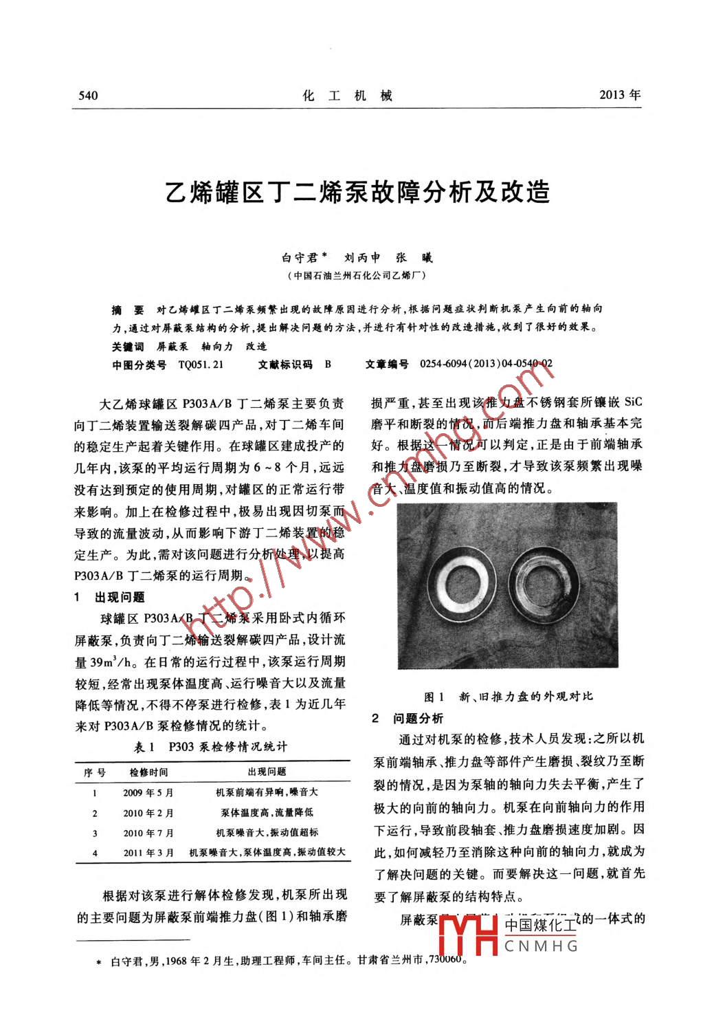 540化工機(jī)械2013年.乙烯罐區(qū)丁二烯泵故障分析及改造白守君*劉丙申張曦(中國石油蘭州石化公司乙烯廠)摘要對(duì)乙烯罐區(qū)丁二烯泵頻繁出現(xiàn)的故障原因進(jìn)行分析,根據(jù)問題癥狀判斷機(jī)泵產(chǎn)生向前的軸向力,通過對(duì)屏蔽泵結(jié)構(gòu)的分析,提出解決問題的方法,并進(jìn)行有針對(duì)性的改造措施,收到了很好的效果。.關(guān)鍵詞屏蔽泵軸向力改造中圖分類號(hào)TQ051. 21文獻(xiàn)標(biāo)識(shí)碼B文章編號(hào)0254-6094( 2013)04-0540-02大乙烯球罐區(qū)P303A/B丁二烯泵主要負(fù)責(zé)損嚴(yán)重,甚至出現(xiàn)該推力盤不銹鋼套所鑲嵌SiC向丁二烯裝置輸送裂解碳四產(chǎn)品,對(duì)丁二烯車間磨平和斷裂的情況,而后端推力盤和軸承基本完的穩(wěn)定生產(chǎn)起著關(guān)鍵作用。在球罐區(qū)建成投產(chǎn)的好。根據(jù)這一情況可以判定,正是由于前端軸承幾年內(nèi),該泵的平均運(yùn)行周期為6~8個(gè)月,遠(yuǎn)遠(yuǎn)和推力盤磨損乃至斷裂,才導(dǎo)致該泵頻繁出現(xiàn)噪沒有達(dá)到預(yù)定的使用周期,對(duì)罐區(qū)的正常運(yùn)行帶音大、溫度值和振動(dòng)值高的情況。來影響。加上在檢修過程中,極易出現(xiàn)因切泵而導(dǎo)致的流量波動(dòng),從而影響下游丁二烯裝置的穩(wěn)定生產(chǎn)。為此,需對(duì)該問題進(jìn)行分析處理,以提高P303A/B丁二烯泵的運(yùn)行周期。出現(xiàn)問題球罐區(qū)P303A/B丁二烯泵采用臥式內(nèi)循環(huán)屏蔽泵,負(fù)責(zé)向丁二烯輸送裂解碳四產(chǎn)品,設(shè)計(jì)流量39m'/h。在日常的運(yùn)行過程中,該泵運(yùn)行周期較短,經(jīng)常出現(xiàn)泵體溫度高、運(yùn)行噪音大以及流量圖1新、舊推力盤的外觀對(duì)比降低等情況,不得不停泵進(jìn)行檢修,表1為近幾年2問題分析來對(duì)P303A/B泵檢修情況的統(tǒng)計(jì)。通過對(duì)機(jī)泵的檢修,技術(shù)人員發(fā)現(xiàn):之所以機(jī)表1 P303 泵檢修情況統(tǒng)計(jì)泵前端軸承、推力盤等部件產(chǎn)生磨損、裂紋乃至斷序號(hào)檢修時(shí)間12009年5月機(jī)泵前端有異響,噪音大裂的情況,是因?yàn)楸幂S的軸向力失去平衡,產(chǎn)生了2010年2月泵體溫度高,流量降低極大的向前的軸向力。機(jī)泵在向前軸向力的作用2010年7月.機(jī)泵噪音大,振動(dòng)值超標(biāo)下運(yùn)行,導(dǎo)致前段軸套、推力盤磨損速度加劇。因2011年3月機(jī)泵噪音大,泵體溫 度高,振動(dòng)值較大此,如何減輕乃至消除這種向前的軸向力,就成為了解決問題的關(guān)鍵。而要解決這一問題,就首先根據(jù)對(duì)該泵進(jìn)行解體檢修發(fā)現(xiàn),機(jī)泵所出現(xiàn)要了解屏蔽泵的結(jié)構(gòu)特點(diǎn)。的主要問題為屏蔽泵前端推力盤(圖1)和軸承磨屏蔽泵中國煤化工的-體式的DYHCNMHG*白守君,男,1968年2月勝,助理工程師,車間主任。甘肅省蘭州市,730060.