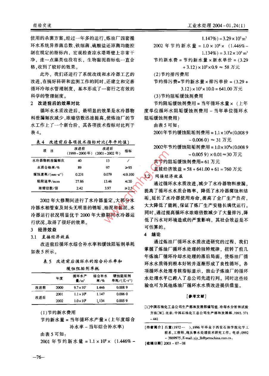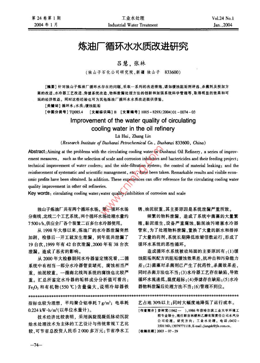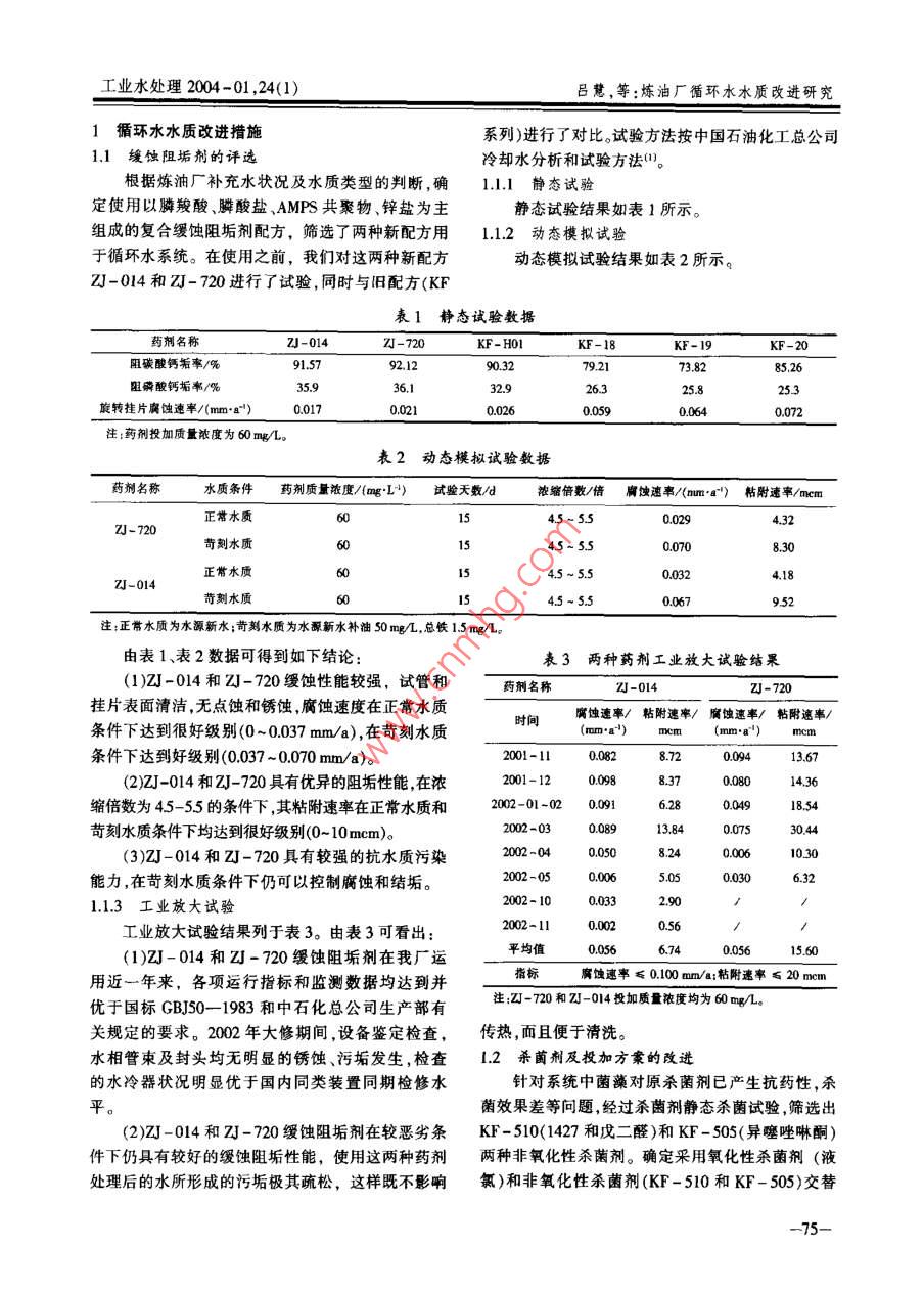 第24卷第1期工業(yè)水處理Vol 24 No I2004年1月Industrial Water TrealmentJan.,2004煉油廠循環(huán)水水質(zhì)改進研究呂慧,張林獨山子石化公司研究院,新疆獨山子833600)[搞要]針對獨山子煉油廠循環(huán)水存在的問題采取一系列的改進揹施,諸如緩蝕阻垢劑評選殺菌劑及投加方案的改進、水冷器工藝改進、旁濾系統(tǒng)改造、物料泄漏處理方法的創(chuàng)新和加強系統(tǒng)科學管理等,取得明顯的效果和可觀的經(jīng)濟效益。同時這些經(jīng)驗也可為其他煉油廠循環(huán)水水質(zhì)改進提供借鑒關鵪詞]循環(huán)水;水質(zhì);緩蝕阻垢[中圈分類號]TQ0854[文獻標識碼]B[文章編號]1005-829X(2004)01-0074-03Improvement of the water quality of circulatingcooling water in the oil refinery(Research institute of Dushanzi Petrochemical Co,, Dushanzi 833600, China)Abstract: Aiming at the problems with the circulating cooling water in Dushanzi Oil Refinery, a series of improement measures, such as the selection of scale and corrosion inhibitors and bactericides and their feeding projectechnical improvement of water coolers; and the side-filtration system; the control of material leaking; and thereinforcement of systematic and scientific management, etc, have been taken. Remarkable results and visible econ-omic profits have been obtained. In addition. These experiences can offer reference for the circulating cooling waterquality improvement in other oil refineriesKey words: circulating cooling water; water quality; inhibition of corrosion and scale獨山子煉油廠共有兩個循環(huán)水場。第一循環(huán)水場銹、油泥較重,其主要原因是系統(tǒng)泄漏嚴重所致。分南線、北線二個工藝系統(tǒng)。兩個循環(huán)水場處理水量約頻繁的物料泄漏,造成了系統(tǒng)中菌藻的大量繁7500th,供應全廠各個裝置二百多臺水冷器使用。殖,黏泥滋生,設備嚴重腐蝕,黏泥油污堵塞水冷器從1998年大修以來,煉油廠的水冷器泄漏突然管束,為了處理物料泄漏,置換了大量的新水和排掉加劇,檢修后一開工就發(fā)生泄漏,到年底共泄漏了了大量的藥劑,系統(tǒng)長期降低濃縮倍數(shù)運行,形成了19臺次,1999年有42臺次泄漏,2000年有38臺次循環(huán)水系統(tǒng)的惡性循環(huán)泄漏。造成了惡劣的影響。造成循環(huán)水系統(tǒng)被動局面的主要原因有:(1)緩從2000年大檢修期間水冷器鑒定情況看,二循蝕阻垢劑配方的阻垢緩蝕效果差,抗沖擊和污染能力系統(tǒng)中有相當一部分水冷器管束堵死,腐蝕相當嚴差:(2)菌藻對殺菌劑已產(chǎn)生了抗藥性,殺菌效果差重,油泥較重,一循南北線兩系統(tǒng)的腐蝕也比較嚴同時殺菌方法也不當;(3)水冷器工藝存在缺陷,導致重。匯總所鑒定水冷器的垢樣成分分析值可看出:循環(huán)水流速低,溫度超標;(4)旁濾存在缺陷;(5)水冷Fe2O3和有機物(550℃)含量偏大,說明冷卻器鐵器物料泄漏后處理方法不當;(6)管理不到位。事染牽辛奪脊奪親姿牽牽脊辛姿辛謝雜親雜修雜奈姿你奪雜你親奪摩你雜親雜奪雜雜章奪豪雜摩奪脊牽章章卞牽親雜親豪親親漸夸幸幸海雜咨雜指標也較為理想,平均聚合鋁單耗7g/m;電單耗藝占地30%以上;同時大幅度地降低了運行成本0224kWh/m3(以單位水量計)。作者簡介]姜樹寬(1962一),1986年獲哈爾濱工業(yè)大學環(huán)境工技術經(jīng)濟比較表明,采用渦旋混凝低脈動沉淀程專業(yè)硬士,現(xiàn)任職吉林燃料乙醇有限責任公司水汽分給水處理技術為主體的工藝設計與傳統(tǒng)常規(guī)T藝比同經(jīng)理。研究方向:工業(yè)水處理。電話:0432-350160:13079771118. E-mail: jiangsk@較,可節(jié)省總投資人民幣2000多萬元;節(jié)省凈水工[收稿日期]2001-07-29工業(yè)水處理2004-01,24(1)呂慧,等:煉油廠循環(huán)水水質(zhì)改進研究1循環(huán)水水質(zhì)改進措施系列)進行了對比。試驗方法按中國石油化工總公司1.1緩蝕阻垢劑的評選冷卻水分析和試驗方法(1。根據(jù)煉油廠補充水狀況及水質(zhì)類型的判斷,確1.11靜態(tài)試驗定使用以膦羧酸、膦酸鹽、AMFS共聚物、鋅鹽為主靜態(tài)試驗結果如表1所示。組成的復合緩蝕阻垢劑配方,篩選了兩種新配方用1.12動態(tài)模擬試驗于循環(huán)水系統(tǒng)。在使用之前,我們對這兩種新配方態(tài)模擬試驗結果如表2所示。-014和幻J-720進行了試驗,同時與舊配方(KF表1靜態(tài)試驗數(shù)據(jù)藥劑名稱ZJ-0zJ-720KF-HOIKF-19阻碳酸鈣垢率/%92.1290.3273828526阻磷酸鈣垢率/%旋轉(zhuǎn)掛片腐蝕速率/(mm·a-)0.0170021060090640022注藥劑投加質(zhì)量濃度為60mg/L表2動態(tài)模擬試驗數(shù)據(jù)藥劑名稱水質(zhì)條件藥劑質(zhì)量濃度/agL)試驗天數(shù)d濃縮倍數(shù)/倍腐蝕速率/(muma")粘附速率/mcm正常水質(zhì)4.5·5.50029ZJ-720苛刻水質(zhì)4.5~5.5zJ-014苛刻水質(zhì)4.5-550067952注:正常水質(zhì)為水源新水;苛刻水質(zhì)為水源新水補油50mgL,總鐵15mg/L由表1、表2數(shù)據(jù)可得到如下結論表3兩種藥劑工業(yè)放大試驗結果(1)幻J-014和幻-720緩蝕性能較強,試管和藥劑名稱-014掛片表面清潔,無點蝕和銹蝕腐蝕速度在正常水質(zhì)腐蝕速率/粘附速率/腐蝕速率/粘附速率/條件下達到很好級別(0~0.037mm/a),在苛刻水質(zhì)時間條件下達到好級別(0037~0070mm/a)。2001-1113.67(2)zJ-014和幻J-720具有優(yōu)異的阻垢性能,在濃1436縮倍數(shù)為45-55的條件下,其粘附速率在正常水質(zhì)和002-01-0200911854苛刻水質(zhì)條件下均達到很好級別(0-10mcm)。(3)zJ-014和-720具有較強的