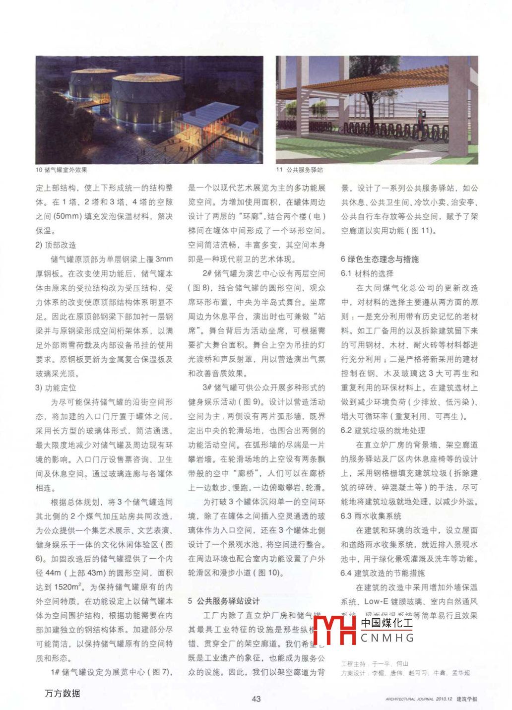 大同煤氣化總公司保護與更新改造于一平1何山’李楣?1項目背景交通十分便利。廠區(qū)占地為28.1hm2, .摘要/通過對工業(yè)遺產(chǎn)大同煤氣化總公司保護與更新改造設(shè)計,探討了工業(yè)遺址的開發(fā)1.1項目概況廠區(qū)周邊設(shè)有3萬居民的社區(qū)。策略.改造模式、開發(fā)主題及主要廠房的評大同市煤氣化總公司位于大同市開現(xiàn)狀功能分區(qū)分為辦公區(qū)、生產(chǎn)流價體系,同時重點介紹了直立爐廠房和儲氣源街1 號, 1986年7月開始籌建,1990程區(qū)、生產(chǎn)輔助區(qū)3個部分。大部分建罐的更新改造設(shè)計。年8月經(jīng)驗收合格后正式投產(chǎn)。生產(chǎn)筑為1980年代所建,主要建筑為鋼筋關(guān)鍵詞/工業(yè)遺產(chǎn)更新直立爐儲氣罐工藝采用我國首創(chuàng)具有世界先進水平的混凝土框架結(jié)構(gòu),-般性單層建筑為磚ABSTRACT/ By conservation and renewalJLH-D型帶蓄熱室復熱式直立炭化爐,混結(jié)構(gòu)。廠區(qū)大部分建筑保存完好,具design for industrial heritage of DatongCoal Gasitication Corp.. this paper makes規(guī)模為6x20門。 生產(chǎn)原料采用馳名中有較高再利用價值。工廠內(nèi)現(xiàn)狀交通布exploration of nustial relies in terms othle外的優(yōu)質(zhì)大同侏羅紀弱粘煤, 設(shè)計日產(chǎn)局為典型的三橫三縱道路交通體系,道theme and tactis of development, the patterm煤氣36萬m',同時年產(chǎn)氣焦30萬能噸.路寬分別為7m. 4m兩級,路面質(zhì)量良of remodeling and the evaluation system formain plant. It als emphatcally makes account焦油1.5萬能噸及硫磺. 硫銨、粗苯等好。工廠內(nèi)部主要道路兩側(cè)綠植茂盛,of the renewal design for the plant of vertical化工副產(chǎn)品。2008 年10月因國家能源樹種豐富,富有景觀層次。furnace and gas tank.KEY WORDS/ industrial heritage, renewal,結(jié)構(gòu)調(diào)整而停產(chǎn)。市政府決定在工廠原工廠內(nèi)部原有工業(yè)設(shè)施保存完好,vertical furnace, gas tank址以保護工業(yè)遺產(chǎn)為目標進行綜合開發(fā)具有較好的工業(yè)景觀風貌。特別是工廠(圖1)。內(nèi)部沿主要道路設(shè)有架空管廊,縱橫交1.2工廠現(xiàn)狀錯的管廊由高大的鋼筋混凝土支架支大同市煤氣化總公司位于規(guī)劃城市撐,形成了獨特的空間體系和工業(yè)景觀主干道和遠景軌道3號線交匯處,交通氛圍。條件便利。工廠內(nèi)部設(shè)有鐵路專用線,東接大秦鐵路、大塘公路,南連北同蒲2開發(fā)策略與改造模式鐵路、大運公路,北依京包鐵路和109大同是國務(wù)院首批公布的歷史文化國道,京大高速公路及太原高速公路,名城,有著彌足珍貴的歷史文化遺產(chǎn)和中國煤化工fHCNMHG作者單位: 1中國中元國際工程公司(北京.100002北京建筑工程學院(北京,10045)1大同煤氣化總公司總平面收稿日期: 2010-11- 1539AOHTECURAL OURNAL 2010.12 建筑學報