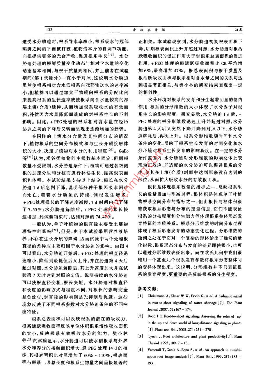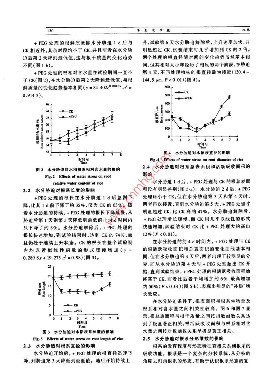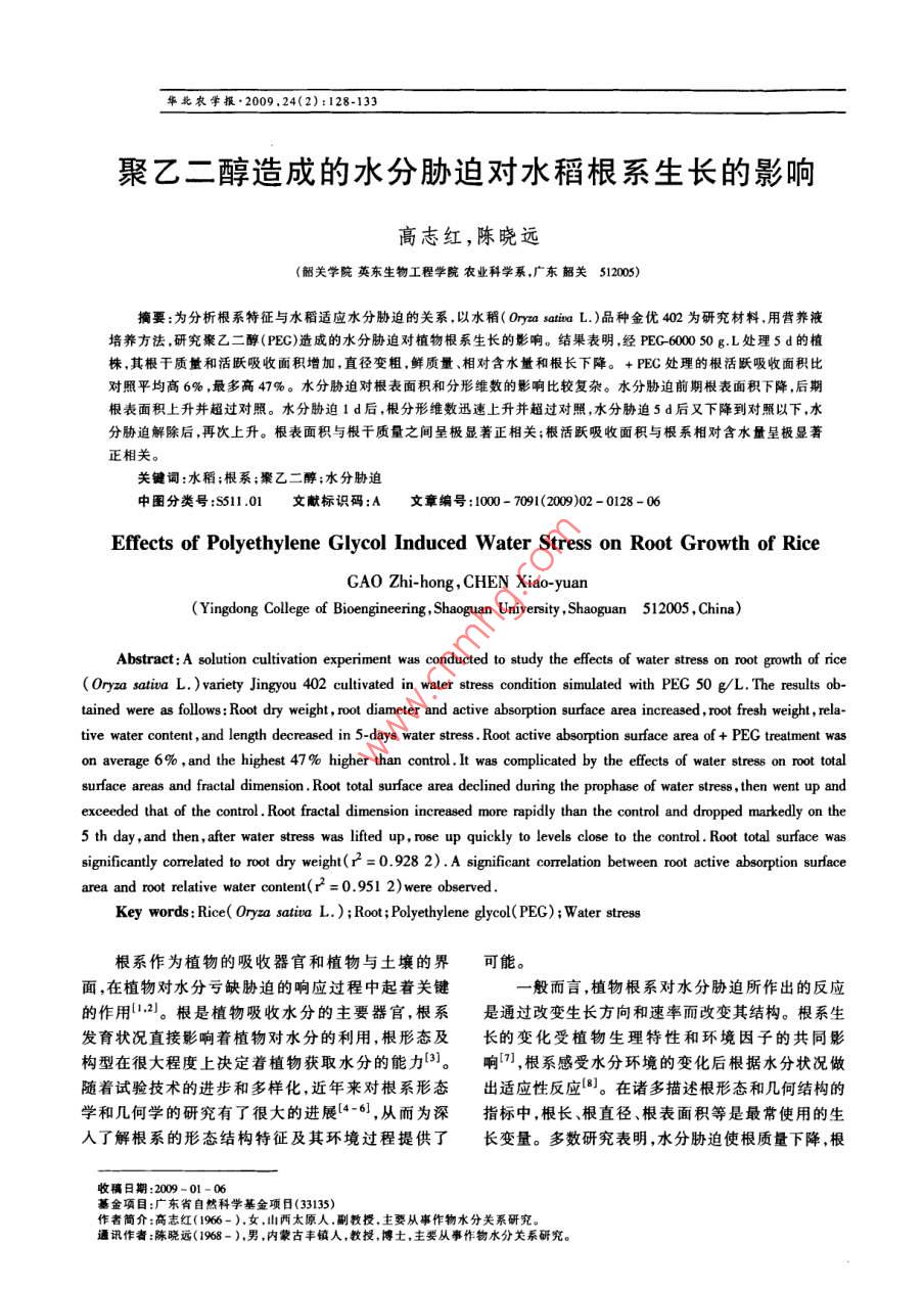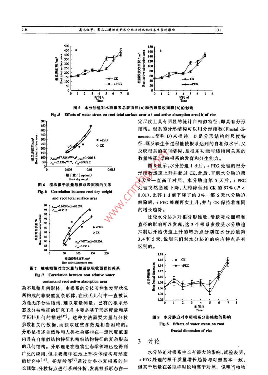 華農(nóng)學(xué)報2009,24(2):128-133聚乙二醇造成的水分脅迫對水稻根系生長的影響高志紅,陳曉遠韶關(guān)學(xué)院英東生物工程學(xué)院農(nóng)業(yè)科學(xué)系廣東韶關(guān)512005)摘要:為分析根系特征與水稻適應(yīng)水分脅迫的關(guān)系,以水稻( Oryza satioa.)品種金優(yōu)402為研究材料,用營養(yǎng)液培養(yǎng)方法,研究聚乙二醇(PEG)造成的水分脅對植物根系生長的影響。結(jié)果表明,經(jīng)PEC600050g.l處理5d的植株,其根干質(zhì)量和活躍吸收面積增加,直徑變粗,質(zhì)量、相對含水量和根長下降。+PEC處理的根活躍吸收面積比對照平均高6%,最多高47%。水分脅迫對根表面積和分形維數(shù)的影響比較復(fù)雜。水分脅迫前期根表面積下降,后期根表面積上升并超過對照。水分脅迫1d后,分形維數(shù)迅速上升并超過對照,水分脅迫5d后又下降到對照以下,水分脅迫解除后,再次上升。根表面積與根干質(zhì)量之間呈極顯著正相關(guān);根活躍吸收面積與根系相對含水量呈極顯著正相關(guān)。關(guān)鍵詞:水稻;根系;聚乙二醇;水分脅迫中圖分類號:511.01文獻標識碼:A文章編號:1000-7091(2009)02-0128-06 Effects of Polyethylene Glycol Induced Water Stress on Root Growth of Rice GAO Zhi-hong, CHEN Xiao-yuan (Yingdong College of Bioengineering, Shaoguan University, Shaoguan 512005, China) Abstract: A solution cultivation experiment was conducted to study the effects of water stress on root growth of rice (Oryza sativa L. )variety Jingyou 402 cultivated in water stress condition simulated with PEG 50 g/L. The results ob- tained were as follows: Root dry weight, root diameter and active absorption surface area increased, root fresh weight, rela- tive water cor ength decreased in 5-days water stress. Root active absorption surface area of+ PEG treatment was on average 6%, and the highest 47% higher than control. It was complicated by the effects of water stress on root total surface areas and fractal dimension. Root total surface area declined during the prophase of water stress, then went up and exceeded that of the control. Root fractal dimension increased more rapidly than the control and dropped markedly on the 5 th day and then, after water stress was lifted up, rose up quickly to levels close to the control. Root total surface was significantly correlated to root dry weight( ?=0.928 2). A significant correlation between root active absorption surface area and root relative water content (=0.951 2)were observed. Key words: Rice( Oryza sativa L. Root Polyethylene glycol( PEG); Water stress根系作為植物的吸收器官和植物與土壤的界可能。面,在植物對水分虧缺脅迫的響應(yīng)過程中起著關(guān)鍵一般而言,植物根系對水分脅迫所作出的反應(yīng)的作用2根是植物吸收水分的主要器官,根系是通過改變生長方向和速率而改變其結(jié)構(gòu)。根系生發(fā)育狀況直接影響著植物對水分的利用,根形態(tài)及長的變化受植物生理特性和環(huán)境因子的共同影構(gòu)型在很大程度上決定著植物獲取水分的能力3。響7,根系感受水分環(huán)境的變化后根據(jù)水分狀況做隨著試驗技術(shù)的進步和多樣化近年來對根系形態(tài)出適應(yīng)性反應(yīng)8。在諸多描述根形態(tài)和幾何結(jié)構(gòu)的學(xué)和幾何學(xué)的研究有了很大的進展4-61,從而為深指標中,根長、根直徑、根表面積等是最常使用的生入了解根系的形態(tài)結(jié)構(gòu)特征及其環(huán)境過程提供了長變量。多數(shù)研究表明,水分脅迫使根質(zhì)量下降,根收璃日期:2009-01-06基金項目:廣東省自然科學(xué)基金項日(33135)作者簡介:高志紅(1966-),女,山西太原人,教授,主要從事作物水分關(guān)系研究。通訊作者:陳曉遠(1968-),男,內(nèi)蒙古豐鎮(zhèn)人,教授,博土主要從事作物水分關(guān)系研究。2期高志紅等:聚乙二醇造成的水分脅迫對水稻根系生長的影響129的伸長與分生能力減弱,根條數(shù)減少,根長縮取樣方法為:處理前,先把水稻分成兩份,分別短但也有研究結(jié)果顯水分脅迫雖然影響取樣測定其根系的各項指標,取樣完成后,一份用作根系發(fā)育但適度的脅迫可以使同化物更多地向根水分脅迫處理,另一份用作對照。脅迫開始后第2d系分配,促進根系的分枝和下扎,提高根冠比脅迫進行取樣測定,每天取樣1次,連續(xù)取樣5d;水分脅解除后,根系會產(chǎn)生補償生長1-1由此可見,關(guān)迫解除后再連續(xù)2天每天取樣測定。研究水分脅迫于根系生長對水分脅迫的響應(yīng)規(guī)律,尚不完全清及脅迫解除對水稻根系生長的影響。楚,有待進一步的研究。1.3根系參數(shù)的測定方法聚乙二醇(Polyethylene glycol,pG)是一種情性將收獲的水稻根系用清水沖洗干凈后小心取的、非離子型的滲透調(diào)節(jié)劑,可用來人為模擬水分滲出,用鑷子拉直,使各分枝彼此不重疊,然后用加拿透脅迫16本研究以水稻品種金優(yōu)402為材料,通大 REGEN根系圖象分析系統(tǒng)(由廣州華粵行儀器公過室內(nèi)營養(yǎng)液培養(yǎng)方式,測定聚乙二醇造成的水分司提供)獲取根系的三維圖像,并測定其直徑、長度、脅迫對水稻根系生長的影響,分析根系特征與水稻表面積、活性吸收面積和分形維數(shù)。測定完畢后,放適應(yīng)水分脅迫的關(guān)系。置在濾紙上吸干水分,稱得其鮮質(zhì)量;在105℃下殺1材料和方法青30min,70℃烘干至恒重,稱其干質(zhì)量。根相對含水量=(根原初鮮質(zhì)量-根干質(zhì)量)1.1試驗材料(水飽和以后根鮮