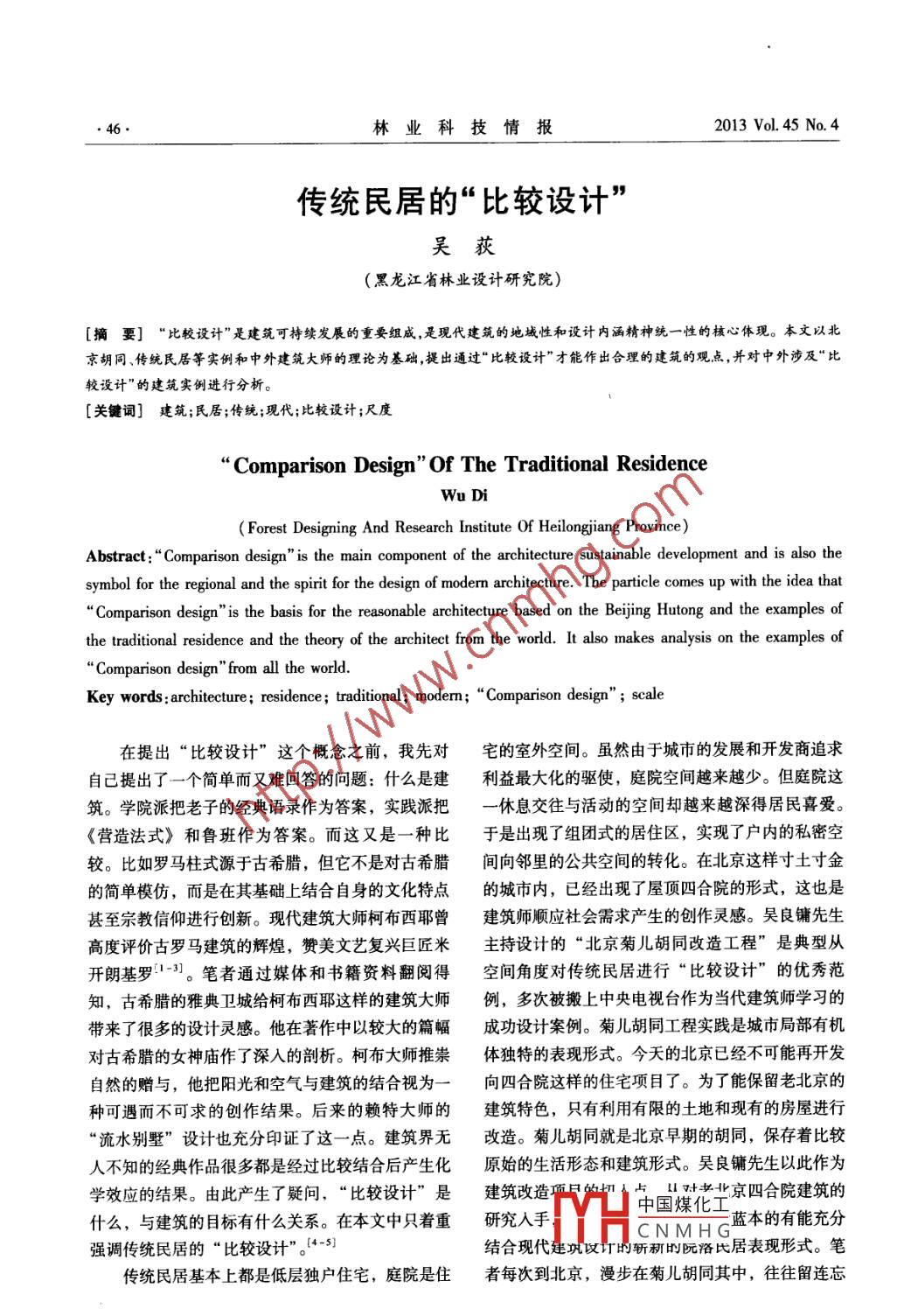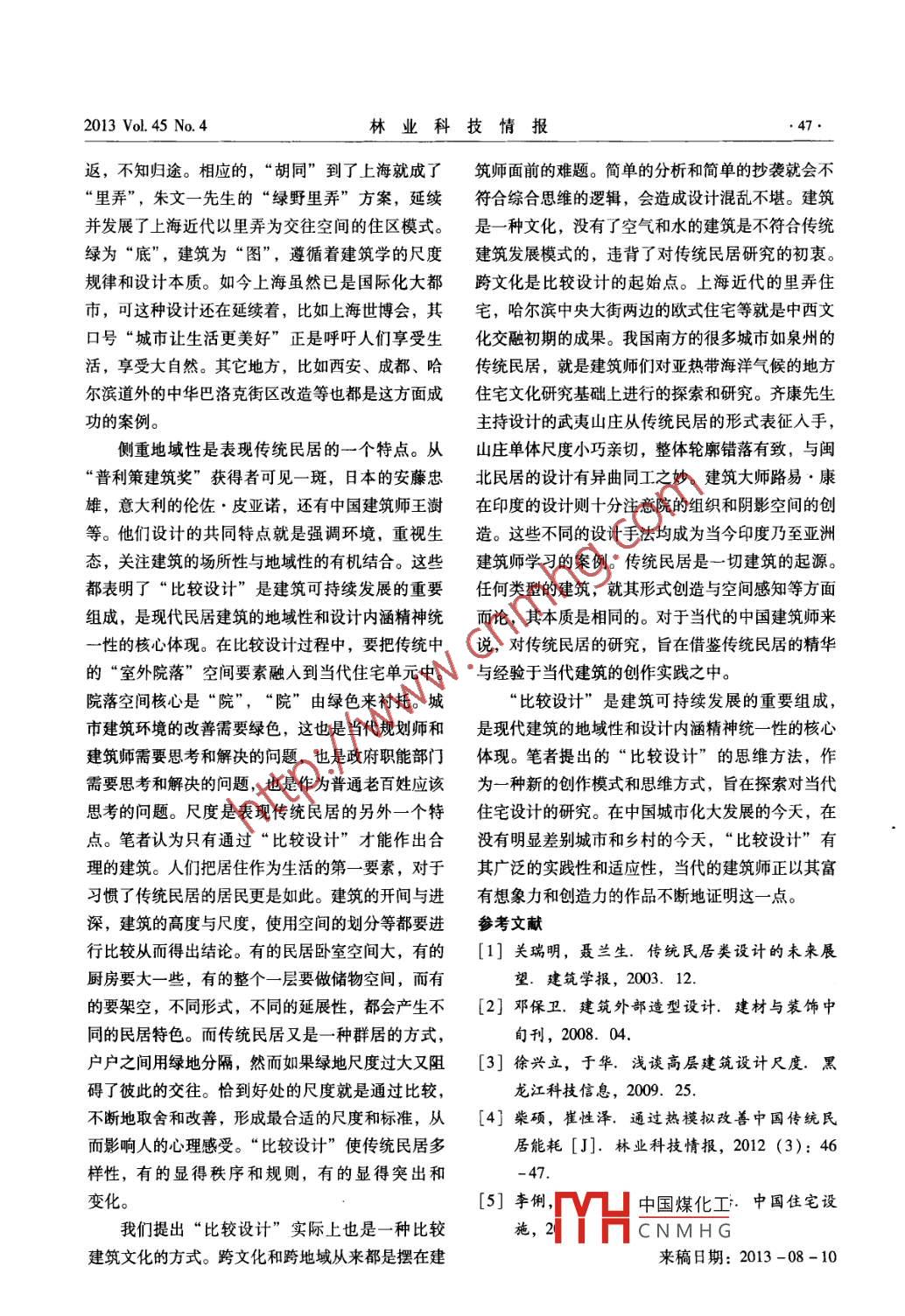 , 46.林業(yè)科技情報(bào)2013 Vol. 45 No. 4傳統(tǒng)民居的“比較設(shè)計(jì)”吳荻(黑龍江省林業(yè)設(shè)計(jì)研究院)[摘要]“比較設(shè)計(jì)”是建筑可持續(xù)發(fā)展的重要組成,是現(xiàn)代建筑的地域性和設(shè)計(jì)內(nèi)涵精神統(tǒng)一 性的核心體現(xiàn)。本文以北京胡同.傳統(tǒng)民居等實(shí)例和中外建筑大師的理論為基礎(chǔ),提出通過(guò)“比較設(shè)計(jì)”才能作出合理的建筑的觀點(diǎn),并對(duì)中外涉及“比較設(shè)計(jì)”的建筑實(shí)例進(jìn)行分析。[關(guān)鍵詞]建筑;民居 ;傳統(tǒng);現(xiàn)代;比較設(shè)計(jì);尺度“Comparison Design”O(jiān)f The Traditional ResidenceWu Di( Forest Designing And Research Institute Of Heilongjiang Province)Abstract:“Comparison design" is the main component of the architecture sustainable development and is also thesymbol for the regional and the spirit for the design of moderm architecture. The particle comes up with the idea that“Comparison design" is the basis for the reasonable architecture based on the Beijing Hutong and the examples ofthe traditional residence and the theory of the architect from the world. It also makes analysis on the examples of“Cormparison design' from all the world.Key words: architecture; residence; traitional; modem;“Comparison design" ; scale在提出“比較設(shè)計(jì)”這個(gè)概念之前,我先對(duì)宅的室外空間。雖然由于城市的發(fā)展和開發(fā)商追求自己提出了一個(gè)簡(jiǎn)單而又難回答的問(wèn)題:什么是建利益最大化的驅(qū)使,庭院空間越來(lái)越少。但庭院這筑。學(xué)院派把老子的經(jīng)典語(yǔ)錄作為答案,實(shí)踐派把--休息交往與活動(dòng)的空間卻越來(lái)越深得居民喜愛。《營(yíng)造法式》和魯班作為答案。而這又是一種比于是出現(xiàn)了組團(tuán)式的居住區(qū),實(shí)現(xiàn)了戶內(nèi)的私密空較。比如羅馬柱式源于古希臘,但它不是對(duì)古希臘間向鄰里的公共空間的轉(zhuǎn)化。在北京這樣寸土寸金的簡(jiǎn)單模仿,而是在其基礎(chǔ)上結(jié)合自身的文化特點(diǎn)的城市內(nèi),已經(jīng)出現(xiàn)了屋頂四合院的形式,這也是甚至宗教信仰進(jìn)行創(chuàng)新。現(xiàn)代建筑大師柯布西耶曾建筑師順應(yīng)社會(huì)需求產(chǎn)生的創(chuàng)作靈感。吳良鏞先生高度評(píng)價(jià)古羅馬建筑的輝煌,贊美文藝復(fù)興巨匠米主持設(shè)計(jì)的“北京菊兒胡同改造工程”是典型從開朗基羅(1-3]。筆者通過(guò)媒體和書籍資料翻閱得空間角度對(duì)傳統(tǒng)民居進(jìn)行“比較設(shè)計(jì)”的優(yōu)秀范知,古希臘的雅典衛(wèi)城給柯布西耶這樣的建筑大師例,多次被搬上中央電視臺(tái)作為當(dāng)代建筑師學(xué)習(xí)的帶來(lái)了很多的設(shè)計(jì)靈感。他在著作中以較大的篇幅成功設(shè)計(jì)案例。菊兒胡同工程實(shí)踐是城市局部有機(jī)對(duì)古希臘的女神廟作了深人的剖析??虏即髱熗瞥珞w獨(dú)特的表現(xiàn)形式。今天的北京已經(jīng)不可能再開發(fā)自然的贈(zèng)與,他把陽(yáng)光和空氣與建筑的結(jié)合視為一向四合院這樣的住宅項(xiàng)目了。為了能保留老北京的種可遇而不可求的創(chuàng)作結(jié)果。后來(lái)的賴特大師的建筑特色,只有利用有限的土地和現(xiàn)有的房屋進(jìn)行“流水別墅”設(shè)計(jì)也充分印證了這一點(diǎn)。建筑界無(wú)改造。菊兒胡同就是北京早期的胡同,保存著比較人不知的經(jīng)典作品很多都是經(jīng)過(guò)比較結(jié)合后產(chǎn)生化原始的生活形態(tài)和建筑形式。吳良鏞先生以此作為學(xué)效應(yīng)的結(jié)果。由此產(chǎn)生了疑問(wèn),“ 比較設(shè)計(jì)”是建筑改造項(xiàng)目的切入占。u 對(duì)共業(yè)京四合院建筑的中國(guó)煤化工什么,與建筑的目標(biāo)有什么關(guān)系。在本文中只著重研究人手藍(lán)本的有能充分YHCNMH G強(qiáng)調(diào)傳統(tǒng)民居的“ 比較設(shè)計(jì)”。(4-5)結(jié)合現(xiàn)代建鞏設(shè)訂的斬和的阮路民居表現(xiàn)形式。筆傳統(tǒng)民居基本上都是低層獨(dú)戶住宅,庭院是住者每次到北京,漫步在菊兒胡同其中,往往留連忘.2013 Vol. 45 No. 4林業(yè)科技情報(bào).47.返,不知?dú)w途。相應(yīng)的,“胡同”到了上海就成了筑師 面前的難題。簡(jiǎn)單的分析和簡(jiǎn)單的抄襲就會(huì)不“里弄”,朱文- -先生的“綠野里弄”方案,延續(xù)符合綜 合思維的邏輯,會(huì)造成設(shè)計(jì)混亂不堪。建筑并發(fā)展了上海近代以里弄為交往空間的住區(qū)模式。是- -種文化,沒有了空氣和水的建筑是不符合傳統(tǒng)綠為“底”,建筑為“圖”,遵循著建筑學(xué)的尺度建筑發(fā)展模式的,違背了對(duì)傳統(tǒng)民居研究的初衷。規(guī)律和設(shè)計(jì)本質(zhì)。如今上海雖然已是國(guó)際化大都.跨文化是比較設(shè)計(jì)的起始點(diǎn)。上海近代的里弄住市,可這種設(shè)計(jì)還在延續(xù)著,比如上海世博會(huì),其宅, 哈爾濱中央大街兩邊的歐式住宅等就是中西文口號(hào)“城市讓生活更美好”正是呼吁人們享受生化交融初期的成果。我國(guó)南方的很多城市如泉州的活,享受大自然。其它地方,比如西安、成都、哈傳統(tǒng)民居,就是建筑師們對(duì)亞熱帶海洋氣候的地方爾濱道外的中華巴洛克街區(qū)改