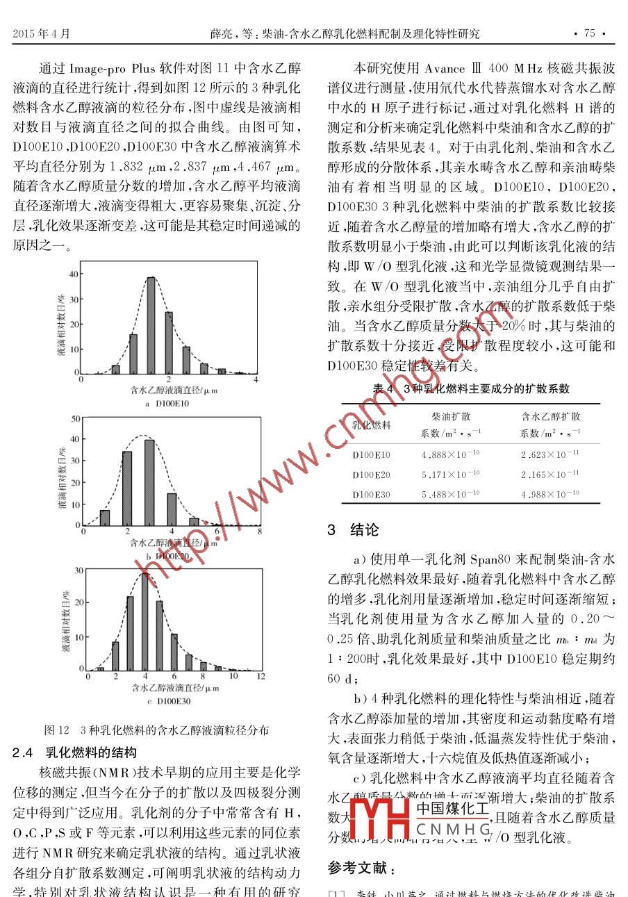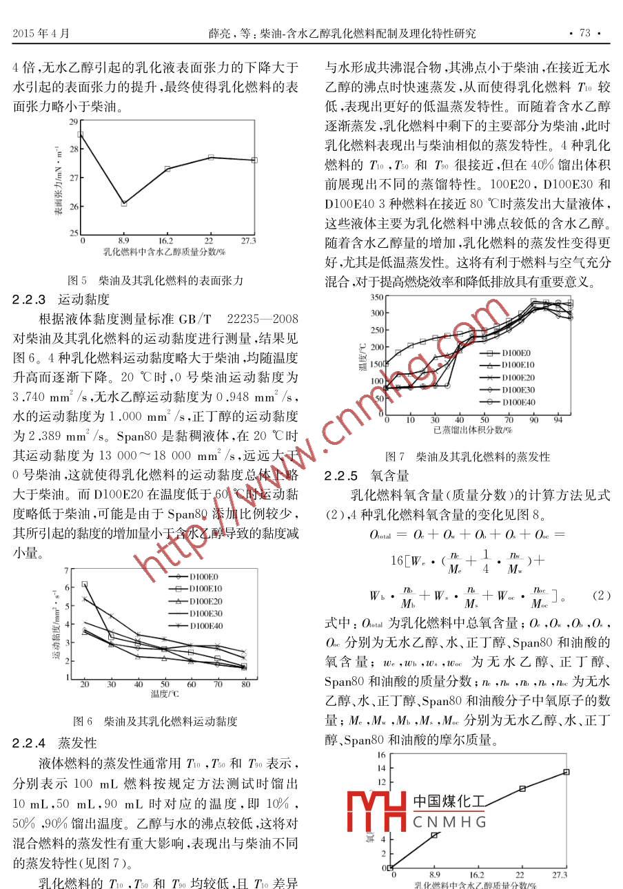 第2期(總第217期)車用發(fā)動機2015年4月VEHICLE ENGINEApr.2015柴油-含水乙醇乳化燃料配制及理化特性研究薛亮,李鐵(上海交通大學(xué)海洋工程國家重點實驗室,上海200240)摘要:以柴油作為乳化燃料主要成分,配制了含水乙醇質(zhì)量分數(shù)分別為8.9%,16.1%,22.%和27.3%4種乳化燃料,并對這些乳化燃料和柴油的理化特性、微觀分布及結(jié)構(gòu)進行觀測和研究。實驗結(jié)果表明:單一乳化劑span8o乳化效果較好;隨著含水乙醇質(zhì)量分數(shù)増大,乳化燃料的密度和運動黏度略冇増加,表面張力略有減小,蒸發(fā)性變得更妤,初始餾岀溫度明昰降低,含氧量増加,十六烷值和低熱值逐漸降低;含水廴醇均勻地分散在柴油中形成油包水型乳化液,分散相液滴平均直徑逐漸増大,乳化燃料穩(wěn)定性逐漸變差關(guān)鍵詞:柴油;含水乙醇;乳化燃料;理化特性DOI:10.3969/iss.1001-222.2015.02.015中圖分類號:TK411.71文獻標(biāo)志碼:B文章編號:1001-2222(2015)02-0070-07隨著我國汽車工業(yè)的飛速發(fā)展和汽車保有量的大增加了乙醇精制過程的能耗與成本。 Flowers急劇攀升,石油資源短缺與環(huán)境污染等問題日益凸等-硏究了以玉米為原料精制生產(chǎn)燃料乙醇時的顯,尤其是近年來全國范圍內(nèi)持續(xù)性的霧霾天氣,更能量收支,發(fā)現(xiàn)最終乙醇的凈能量僅占原料總能量加引起了人們對清潔能源、替代能源的廣泛關(guān)注。的6%,而蒸餾脫水工程能耗占37%之多。當(dāng)乙醇柴油機的主要排放物—固體顆粒物和氮氧化物被濃縮程度在80%左右時,即含水量為20%時,最終認為是霧霾污染的主要組成部分所得乙醇的能量收支將會得到大幅改善。在柴油中加入水或醇類燃料形成柴油乳化燃本研究將含水量為20%(質(zhì)量分數(shù))的含水乙料,能夠有效降低炭煙(Sσot)和氮氧化物(NO-)排醇與柴油按照一定的比例進行混合,配制多種柴油-放,同時提高指示熱效率。早期的國內(nèi)外研究表含水乙醇乳化燃料,并對其理化特性進行比較明柴油中摻入甲醇可以實現(xiàn)較穩(wěn)定的甲醇水柴研究。油三組元乳化混合。劉永啟、盛世承、傅茂林等學(xué)者通過試驗研究發(fā)現(xiàn),水對乳化液的穩(wěn)定性有1實驗儀器及方法重要影響,當(dāng)甲醇中摻水15%時,通過選擇適當(dāng)?shù)?實驗試劑及儀器乳化劑,柴油-甲醇水復(fù)合乳液可穩(wěn)定35~50d,其本研究所使用的實驗用品和儀器見表1和表2。黏度高于柴油,低熱值低于柴油,展示了良好的應(yīng)用表1中的實驗試劑主要用于乳化燃料的配制前景。乙醇同甲醇物性相近,但相對甲醇而言,目前其中氘代水用來對含水乙醇中的H原子進行標(biāo)記以關(guān)于柴油-含水乙醇乳化燃料的研究較少。黃震。、表1實驗試劑卓斌等研究了乙醇-柴油混合燃料的理化特性;盛宏至、焦緯洲等學(xué)者對柴油-乙醇水乳化燃料的流變特性進行了研究。然而,目前關(guān)于含水量較0號柴油高的柴油-含水乙醇乳化燃料的制備、理化特性及微無水乙醇(>99,5%,化學(xué)純)觀特性分析等全面系統(tǒng)的研究較為罕見蒸餾水(H2O)乙醇與柴油混合時,為了保持相溶性,通常采用氘代水(D2O無水乙醇。乙醇與水為共沸混合物,為得到高純度的乙醇除蒸餾工程外還需要進一步的脫水工程,大H中國煤化工醇CNMHGTween60、OP-10、AEO3收稿日期:2014-09-17;修回日期:201基金項目:國家自然科學(xué)基金(51276作者簡介:薛亮(1988—),男,碩士,主要研究方向為發(fā)動機噴霧與燃燒特性研究; jiuxi situ,edu,cn通訊作者:李鐵(1974-),男,研究員,主要研究方向為先進內(nèi)燃機燃燒、代用燃料技術(shù)等;liti@sjtu.edu,cn。2015年4月薛亮,等:柴油-含水乙醇乳化燃料配制及理化特性研究確定其擴散系數(shù)。表2中的實驗儀器主要用于柴油性測定法》進行。氧含量、十六烷值和低熱值等物性及乳化燃料的物性測量,主要包括表面張力、運動黏通過經(jīng)驗公式來定性分析。通過光學(xué)顯微鏡和度、蒸發(fā)性等理化特性。核磁共振波譜儀觀察、分析燃料的微觀分布和結(jié)構(gòu)。表2實驗儀器2實驗結(jié)果與討論序號名稱2.1乳化燃料的配制電子天平Y(jié)P200022.1.1乳化劑的選擇電動攪拌器7312-1旋轉(zhuǎn)黏度儀親水親油平衡值(h)是乳化劑的重要指標(biāo),油NDJ-SSBZY-201包水型乳化液的h值為3~6,據(jù)此可初步選擇乳化劑。為了比較復(fù)配乳化劑和單一乳化劑乳化效果的恒溫槽CH10255678優(yōu)劣,初步選用表1中的幾種乳化劑,其中包括3種蒸餾測定儀DLYS-101親水性乳化劑,與親油性乳化劑復(fù)配,保證復(fù)配后乳光學(xué)顯微鏡DM4000化劑的h值仍在3~6之間。兩種或多種乳化劑復(fù)核磁共振波普儀 A vanceⅢ400MHz配后的h值可根據(jù)式(1)計算。1.2實驗方法柴油與無水乙醇可互溶,但一旦有水存在,就會逐漸分層,因此需要加入適量乳化劑和助乳化劑。本研究先將無水乙醇與蒸餾水按照質(zhì)量比為41的式中:h和h分別為復(fù)合乳化劑和第種乳化劑親比例進行混合,得到含水量為20%(質(zhì)量分數(shù))的含水親油平衡值;v;為復(fù)合乳化劑中乳化劑i的質(zhì)量水乙醇,然后在環(huán)境溫度25℃、濕度40RH的條件分數(shù)。下將該含水乙醇與柴油混合,配制了多組乳化燃料表3列出實驗環(huán)境、柴油、助乳化劑、攪拌時間最終選擇乳化效果較好的配方,配制含水乙醇質(zhì)量等條件相同的情況下使用不同乳化劑