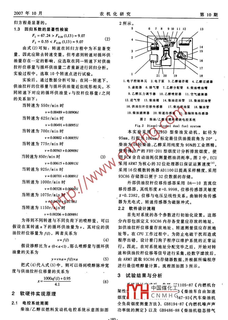 2007年10月農(nóng)機(jī)化研究第10期柴油/乙醇雙燃料發(fā)動(dòng)機(jī)電控系統(tǒng)性能優(yōu)化試驗(yàn)研究劉存香,韋志康,劉學(xué)軍(1.廣西交通職業(yè)技術(shù)學(xué)院,南寧530023;2.廣西大學(xué)機(jī)械工程學(xué)院,南寧530004)摘饔:利用LabⅥIEW軟件建立了噴醇量與發(fā)動(dòng)機(jī)負(fù)荷、轉(zhuǎn)速間的優(yōu)化數(shù)學(xué)模型,利用以ARM7為核心的處理器對(duì)模型加以實(shí)現(xiàn)。實(shí)驗(yàn)表明,所研究的柴油/乙醇雙燃料電控系統(tǒng)性能穩(wěn)定,各項(xiàng)指標(biāo)與原機(jī)相比較都有很大程度的提高關(guān)鍵詞:動(dòng)力機(jī)槭工程;柴油/乙醇雙燃料發(fā)動(dòng)機(jī);試驗(yàn)研究;電控系統(tǒng);虛擬儀器;處理器中圖分類(lèi)號(hào):TK4215文獻(xiàn)標(biāo)識(shí)碼:A文章編號(hào):1003-188x(2007)10—0182-040引言本文旨在通過(guò)先進(jìn)的 Labview虛擬儀器技術(shù),對(duì)柴油/乙醇的混合比例隨發(fā)動(dòng)機(jī)負(fù)荷和轉(zhuǎn)速的不為能早日使柴油/乙醇汽車(chē)成為汽車(chē)工業(yè)發(fā)展同來(lái)確定最優(yōu)化模型,而后利用ARM7為內(nèi)核的處理的主流,世界各國(guó)均開(kāi)展了大量的科學(xué)研究。國(guó)外器實(shí)現(xiàn)該最優(yōu)化模型已有少數(shù)研究機(jī)構(gòu)采用單片機(jī)對(duì)柴油/乙醇雙燃料系統(tǒng)進(jìn)行控制,但在國(guó)內(nèi)單片機(jī)技術(shù)應(yīng)用于柴油1優(yōu)化模型的確定乙醇雙燃料系統(tǒng)的報(bào)道還較為鮮見(jiàn)。而對(duì)于能實(shí)利用 LabVIeW軟件測(cè)定油泵循環(huán)供油量、供油時(shí)根據(jù)發(fā)動(dòng)機(jī)負(fù)荷和轉(zhuǎn)速改變柴油乙醇混合比例拉桿位移量與油泵凸輪軸轉(zhuǎn)速等三者之間的關(guān)系,的單片機(jī)電控系統(tǒng),還未有相關(guān)報(bào)道。相應(yīng)的數(shù)據(jù)采集與顯示程序如圖1所示采樣數(shù)水SC.create or replac3萬(wàn)通道[緩存大小圖1數(shù)據(jù)采集與顯示程序框圖Fig. 1 The programme chart of the data col lection and display選定油泵轉(zhuǎn)速,在550-1100r/min范圍內(nèi),每循環(huán)供油量y關(guān)于供油拉桿位移量x,凸輪軸間隔75r/min進(jìn)行一次實(shí)驗(yàn),每個(gè)轉(zhuǎn)速下測(cè)量?jī)纱?轉(zhuǎn)速x2的二元回歸方程為共測(cè)量16次y=001972+0006814巧+4.04×10x2()實(shí)驗(yàn)中,通過(guò)改變供油拉桿的位移量來(lái)實(shí)現(xiàn)循12回歸方程的顯著性檢驗(yàn)環(huán)供油量的變化,記錄轉(zhuǎn)速、拉桿位移變化量以及方差分析結(jié)果如表1所示。循環(huán)供油量的數(shù)值,其中供油拉桿位移量的變化數(shù)表1方差分析表值通過(guò) LabVIeW圖形化編程軟件來(lái)進(jìn)行顯示。試驗(yàn)Tab. 1 The table of the square analysis后,利用 MathCAD數(shù)學(xué)處理軟件對(duì)所得到的試驗(yàn)數(shù)據(jù)進(jìn)行多元回歸分析。11二元回歸方程中國(guó)煤化工x106a=001收稿日期:2007-01-23CNMHG78x1UF(2l3)=670作者簡(jiǎn)介:劉存香(1981-),男,廣西寧明人,講師,碩上,(e-mbIl)gxlcx20008163.com.通過(guò)表1可知,F>F50(2:13),因此所得到的回182-2007年10月農(nóng)機(jī)化研究第10期歸方程是顯著的。2所示。1.3回歸系數(shù)的顯著性檢驗(yàn)9101112F1=6724>F001(1,13)=907F2=0.55