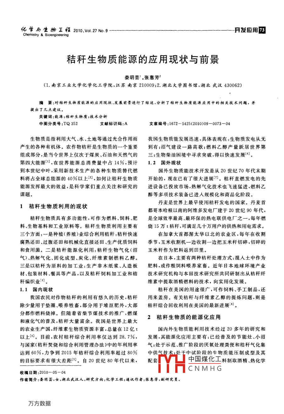 化學與生物工程2010,Vol.27N.9開發(fā)應用73Chemistry Bioengineering秸稈生物質能源的應用現狀與前景婁玥蕓,張惠芳(1,南京工業(yè)大學化學化工學院,江蘇南京210009;2.湖北大學圖書館,湖北武漢430062)摘要:對秸稈生物質能源的應用現狀、發(fā)展前景進行了綜逑,分析了秸稈生物質能源應用中的相關技術問題,并提出了幾點建議。關鍵詞:能源;秸稈生物質;技術分析中圖分類號:TQ352文獻標識碼:A文章編號:1672-5425(2010)09-0073-04生物質是指利用大氣、水、土地等通過光合作用而我國生物質能發(fā)展迅速,具體表現在:生物質發(fā)電從無產生的各種有機體。農作物秸稈是生物質的一個重要到有;沼氣建設一路高歌;燃料乙醇產量躍居世界第組成部分,是當今世界上僅次于煤炭、石油和天然氣的三;生物柴油困境中尋求突破,得以快速發(fā)展6。第四大能源,在世界能源總消費量中占14%預計1.2國外現狀到本世紀中葉,采用新技術生產的各種生物質替代燃國外生物質能技術開發(fā)是從20世紀70年代末期料將占全球總能源的40%以上2,如何讓秸稈生物質開始的,現在已有了很大進展。秸稈直燃發(fā)電的先能源發(fā)揮最大的效益,是科學家們重點關注和研究的進設備已投放市場,熱解氣化技術也飛速猛進,燃料乙課題。醇等多項技術裝備已進入規(guī)?;蜕唐坊A段。1秸稈生物質利用的現狀丹麥是世界上最早使用秸稈發(fā)電的國家。丹麥首都哥本哈根以南的阿維多發(fā)電廠建于20世紀90年代,秸稈生物質具有多功能性,可作為燃料、飼料、肥是全球效率最高、最環(huán)保的熱電聯供電廠之一,每年燃料、生物基料和工業(yè)原料等。秸稈生物質利用主要有燒15萬t秸稈,可滿足幾十萬用戶的供熱和用電需求。三個方面:一是種植(養(yǎng)殖)業(yè)綜合利用秸稈:秸稈快速在加拿大首都渥太華以北的農業(yè)區(qū),每年在收割腐熟還田、過腹還田和機械化直接還田、生產優(yōu)質飼料季節(jié),玉米收割機一邊收割一邊把玉米稈切碎,切碎的和食用菌。二是秸稈能源化利用:秸稈生物氣化(沼玉米稈作為肥料返到田里氣)、熱解氣化、固化成型、炭化、纖維素制燃料乙醇在日本,主要有兩種秸稈處理方式:混入土中作為三是以秸稈為原料的加工業(yè):生產非木紙漿、人造板肥料,或作粗飼料喂養(yǎng)家畜。近年日本地球環(huán)境產業(yè)材、包裝材料、餐具等產品,以及秸稈飼料加工業(yè)和秸技術研究機構與本田技術研究所共同研制出從秸稈纖稈編織業(yè)3維素中提取酒精燃料的技術,向實用化發(fā)展1.1國內現狀秸稈在美國的用途很廣,可作飼料、手工制品,還我國農民對作物秸稈的利用有悠久的歷史,秸稈用來蓋房。有關秸稈與纖維素乙醇的提煉問題,則是除少量用于墊圈、喂養(yǎng)牲畜,部分用于堆漚肥外,大部秸稈綜合回收利用在美國的最新進展分都作燃料燒掉。但隨著省柴節(jié)煤技術的推廣,燃煤秸稈生物質的能源化應用和液化氣的普及,秸稈大量富余。我國是世界上最大的農業(yè)生產國,纖維素生物質資源豐富,總量在12億t國內外生物質能利用技術經過20多年的研究和以上(。目前,農村秸稈綜合利用率僅達到287%,發(fā)展,其能源化應用主要有:已經普及的節(jié)能灶、小沼與國家《秸稈焚燒和綜合利用管理辦法》中的年利用率氣;處于示范、推廣階段的厭氧處理糞便和秸稈氣化集達到60%,力爭到2015年秸稈綜合利用率超過80%中供氣技術處舌中試階段的牛物質能壓制成型及其的目標要求有很大差距。自20世紀80年代以來,配套中國煤化工料制取酒精、熱化學CNMHG收稿日期:2010-05-04作者簡介:婁玥薈’女,湖北武漢人,研究方向:化學工程;通訊作者:張惠芳,副研究員婁玥蕓等:秸秤生物質能源的應用現狀與前景/2010正9睏液化技術、供熱發(fā)電和燃氣催化制取氫氣等??商峁┑哪芰恐饕须娔堋崮芎徒煌茉?。3秸稈生物質能源化應用技術2.1電能秸稈生物質能源化應用技術主要包括秸稈沼氣生物質能發(fā)電主要有兩條工藝技術路線,即氣化(生物氣化)、秸稈固化成型燃料、秸稈熱解氣化、直燃發(fā)電和直接燃燒發(fā)電。發(fā)電和秸稈干餾等方式。世界各國高度重視秸稈發(fā)電項目的開發(fā),將其作3.1沼氣發(fā)酵生物法(生物氣化)為21世紀發(fā)展可再生能源的戰(zhàn)略重點和具備發(fā)展?jié)摻斩捝餁饣墙斩捲趨捬鯒l件下經微生物發(fā)酵力的產業(yè)。丹麥已建有130多座秸稈發(fā)電站秸稈發(fā)而產生沼氣和有機肥料的技術工程,可利用稻草、麥電等可再生能源已占該國能源消耗總量的24%,丹麥秸、玉米秸等多種秸稈,并可與農村生活垃圾、果蔬廢BWE發(fā)電技術也在西班牙、英國、瑞典、芬蘭、法國等物、糞便等混合發(fā)酵,原料組合非常靈活,來源充足,有國投產運行多年,其中英國坎貝斯的生物質能發(fā)電廠著廣闊的發(fā)展空間和發(fā)展?jié)摿Α=斩捳託饧夹g分為戶是目前世界上最大的秸稈發(fā)電廠,裝機容量3.8萬用秸稈沼氣和秸稈沼氣集中供氣兩種形式。秸稈入池kW;其它如日本的“陽光計劃”美國的“能源農場”,美產氣后產生的沼渣作肥料還田提高了秸稈資源的利國有350座生物質發(fā)電站,總裝機容量達7000MW,用效率,氣化效率通??蛇_70%~80%12提供了大約6.6萬個工作崗位,2010年美國生物質能秸稈沼氣技術的工藝流程為:秸稈預處理一堆發(fā)電達到13000MW裝機