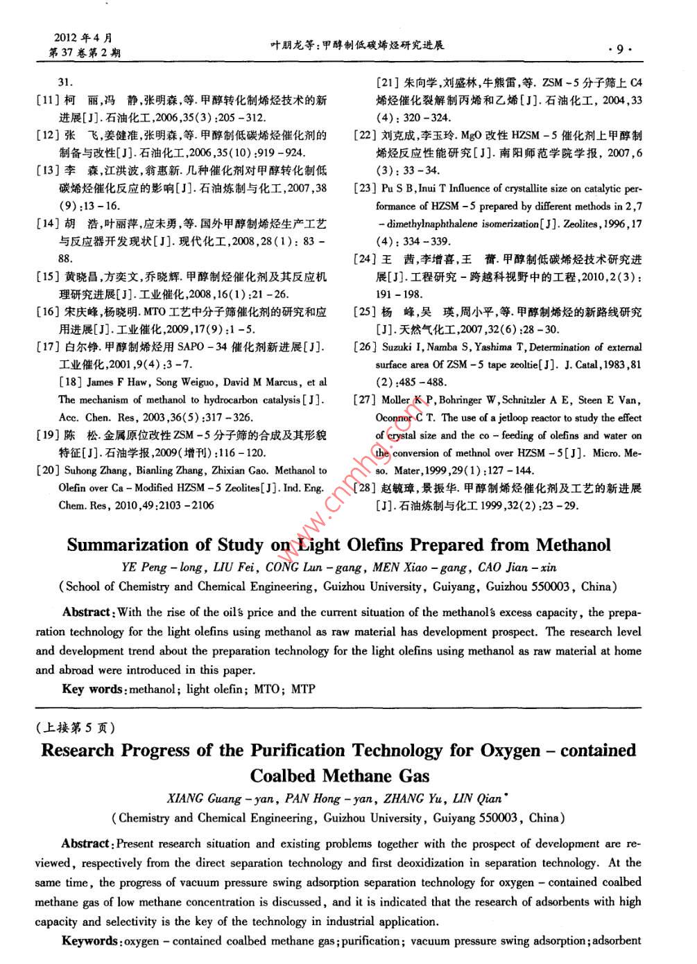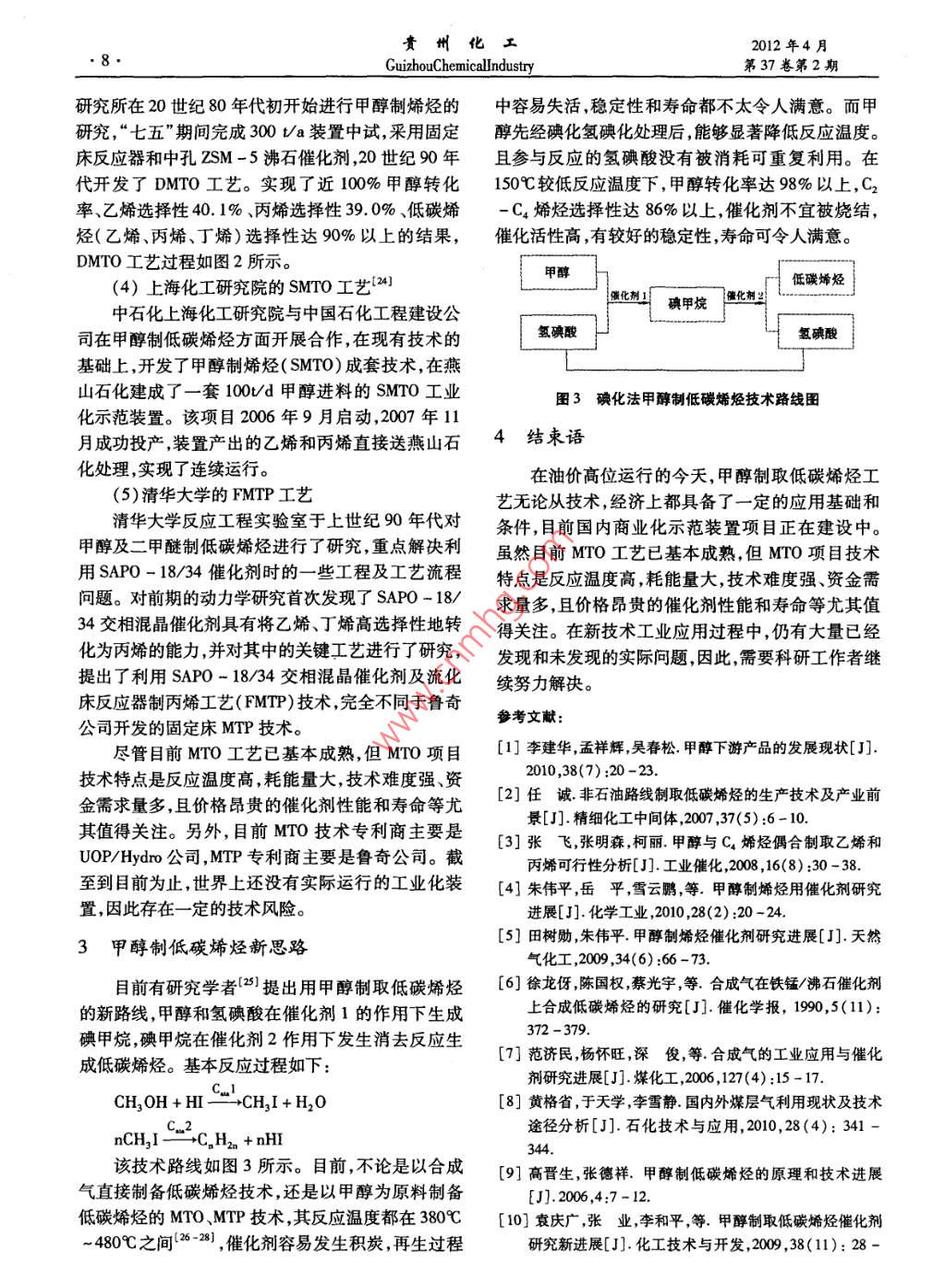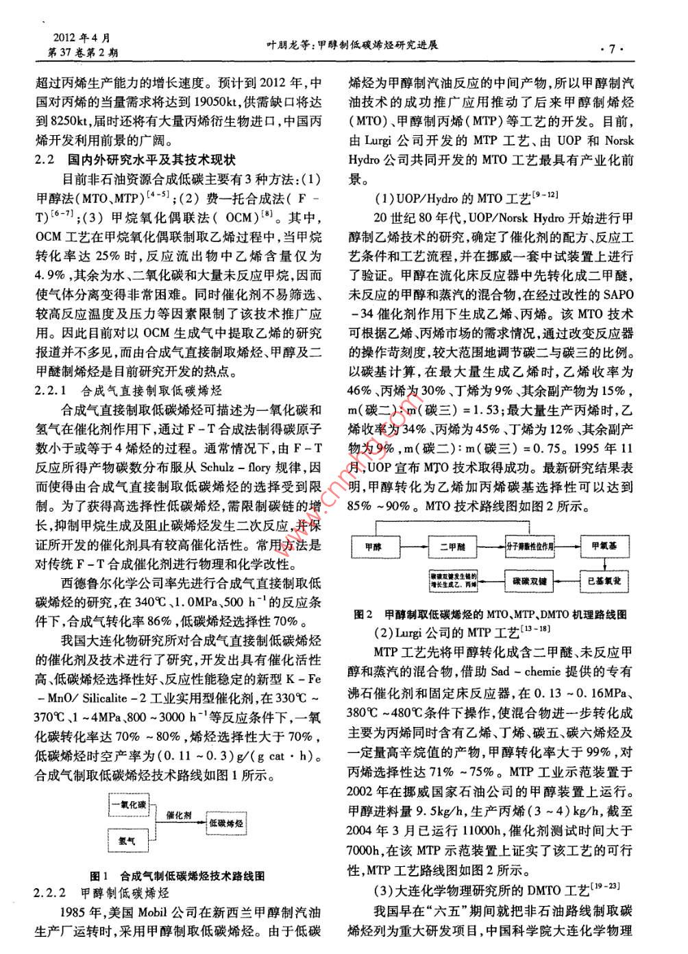 貴州化工2012年4月, 6.GuizhouChermicalIndustry第37卷第2期甲醇制低碳烯烴研究進(jìn)展葉朋龍,劉飛, 叢輪剛,門(mén)曉剛,曹建新”(貴州大學(xué)化學(xué)與化工學(xué)院,貴州貴陽(yáng)50003)摘要:隨著石油價(jià)格的 上漲,及甲醇產(chǎn)能過(guò)剩的現(xiàn)狀,以甲醇為原料合成低碳烯烴技術(shù)顯示了良好的發(fā)展前景。文章介紹了甲醇制烯烴技術(shù)的國(guó)內(nèi)外研究水平和發(fā)展趨勢(shì)。關(guān)鍵詞:甲醇;低碳烯烴; MTO; MTP中圖分類(lèi)號(hào):TQ223.121文獻(xiàn)標(biāo)識(shí)碼:A文章編號(hào):1008 -9411(2012)02 -0006 -04甲醇是重要的有機(jī)原料,是C1化學(xué)工業(yè)的基礎(chǔ)維、合成橡膠、合成塑料(聚乙烯及聚氯乙烯)、合成產(chǎn)品,然而其自身價(jià)位較低,附加值不高。甲醇的深乙醇(酒精)的基本化工原料,也用于制造氯乙烯、加工與工業(yè)應(yīng)用是許多國(guó)家競(jìng)相開(kāi)發(fā)的-一個(gè)重要領(lǐng)苯乙烯、環(huán)氧乙烷、醋酸、乙醛、乙醇和炸藥等,尚可域,且甲醇工業(yè)的發(fā)展在很大程度上取決于甲醇工用作水果和蔬菜的催熟劑,是一種已證實(shí)的植物激業(yè)應(yīng)用領(lǐng)域的開(kāi)拓與深加工產(chǎn)品的開(kāi)發(fā)。目前,我素。乙烯用量最大的是生產(chǎn)聚乙烯,約占乙烯耗量國(guó)甲醇供大于求的矛盾十分突出,如何提高甲醇的的45% ;其次是由乙烯生產(chǎn)的二氯乙烷和氯乙烯;附加值,成為亟待解決的問(wèn)題。乙烯氧化制環(huán)氧乙烷和乙二醇。另外乙烯烴化可制苯乙烯,乙烯氧化制乙醛、乙烯合成酒精、乙烯制取1甲醇生產(chǎn)及利用現(xiàn)狀高級(jí)醇等。近幾年,我國(guó)掀起了甲醇項(xiàng)目投資熱,從2000中國(guó)乙烯存在巨大的市場(chǎng)缺口和消費(fèi)增長(zhǎng)空年到2008年,全國(guó)甲醇產(chǎn)能年均增長(zhǎng)率達(dá)24.8%,間,國(guó)產(chǎn)乙烯的市場(chǎng)占有率一直較低。為緩解國(guó)內(nèi)而同期表觀消費(fèi)量年均增長(zhǎng)率為18. 9%。據(jù)最新乙烯供應(yīng)緊張,滿足國(guó)內(nèi)經(jīng)濟(jì)發(fā)展需求,雖然中國(guó)石統(tǒng)計(jì),目前我國(guó)新建、擬建甲醇項(xiàng)目共34個(gè)(不包括油、中國(guó)石化和中海油加快實(shí)施乙烯擴(kuò)能計(jì)劃,但截二甲醚、甲醇制烯烴企業(yè)自身配套的甲醇生產(chǎn)裝至目前中國(guó)乙烯當(dāng)量消費(fèi)供需缺口多達(dá)11190kt。置) ,預(yù)計(jì)到“十一五”末期,我國(guó)甲醇產(chǎn)能將達(dá)到26從整體情況看,中國(guó)乙烯工業(yè)還有較大的發(fā)展空間。~30.6Mt/a,而同期國(guó)內(nèi)需求量的增長(zhǎng)則存在不確丙烯用量最大的是生產(chǎn)聚丙烯,另外丙烯可制定性。丙烯腈、異丙醇、苯酚和丙酮、丁醇和辛醇、丙烯酸及甲醇的主要下游需求領(lǐng)域是甲醛、羰基法醋酸、其脂類(lèi)以及制環(huán)氧丙烷和丙二醇、環(huán)氧氯丙烷和合甲醇燃料、二甲醚等,其中甲醛、羰基法醋酸產(chǎn)業(yè)呈成甘油等。現(xiàn)穩(wěn)定增長(zhǎng)態(tài)勢(shì)”,但這并不足以消化增長(zhǎng)過(guò)快的近年來(lái),由于丙烯下游產(chǎn)品快速發(fā)展,極大促進(jìn)甲醇產(chǎn)能;甲醇燃料、二甲醚則受政策影響較大,而了中國(guó)丙烯需求量快速增長(zhǎng)(2-3]。2010 年,中國(guó)新且目前我國(guó)的甲醇燃料標(biāo)準(zhǔn)還不完善。增大型乙烯生產(chǎn)裝置,同時(shí)煉廠生產(chǎn)能力還將繼續(xù)隨著甲醇應(yīng)用領(lǐng)域的開(kāi)發(fā),特別是甲醇制烯烴擴(kuò)大,這將增加丙烯的產(chǎn)出。乙烯聯(lián)產(chǎn)丙烯的生產(chǎn)技術(shù)的開(kāi)發(fā)及應(yīng)用,將為甲醇工業(yè)提供巨大潛力,也能力已達(dá)到7220kt/a,丙烯總生產(chǎn)能力達(dá)到將為我國(guó)中小合成氨企業(yè)走出困境,為甲醇下游產(chǎn)10800kt/a。乙烯裝置聯(lián)產(chǎn)丙烯占丙烯總供給比例品多樣化帶來(lái)光明前景。將進(jìn)-步提高。但同期下游裝置對(duì)丙烯需求量年均增長(zhǎng)速度達(dá)5. 8% ,丙烯資源供應(yīng)略微緊張。2低碳烯烴 研究現(xiàn)狀截至目前,我國(guó)丙烯的表觀消費(fèi)量達(dá)到.2.1低碳烯烴 市場(chǎng)需求分析10490kt。從當(dāng)量需求來(lái)看,丙烯供需矛盾十分突低碳烯烴主要包括乙烯和丙烯。乙烯是合成纖出。2010年,丙烯當(dāng)量需求的年均增長(zhǎng)率達(dá)7.6% ,金項(xiàng)目:貴州省科學(xué)技術(shù)基金項(xiàng)目(編號(hào):黔科合J字[2011]2017) ;貴州大學(xué)博士啟動(dòng)基金項(xiàng)目(編號(hào):2010 -014) ;貴州省綠色化工創(chuàng)新人才團(tuán)隊(duì)項(xiàng)目;貴州赤天化集團(tuán)有限責(zé)任公司產(chǎn)學(xué)研合作項(xiàng)目資助.收稿日期:2011 -12 -24;修返日期:2012-02-17作者簡(jiǎn)介:葉朋龍(1986 -) ,男,在讀碩士研究生,主要從事工業(yè)催化研究。通訊作者:曹建新,E - mail: jxcao@ gzu. edu. en.2012年4月第37卷第2期葉朋龍等:甲醇制低碳烯烴研究進(jìn)展.7.超過(guò)丙烯生產(chǎn)能力的增長(zhǎng)速度。預(yù)計(jì)到2012年,中烯烴為甲醇制汽油反應(yīng)的中間產(chǎn)物,所以甲醇制汽國(guó)對(duì)丙烯的當(dāng)量需求將達(dá)到19050kt,供需缺口將達(dá)油技術(shù)的成功推廣應(yīng)用推動(dòng)了后來(lái)甲醇制烯烴到8250kt,屆時(shí)還將有大量丙烯衍生物