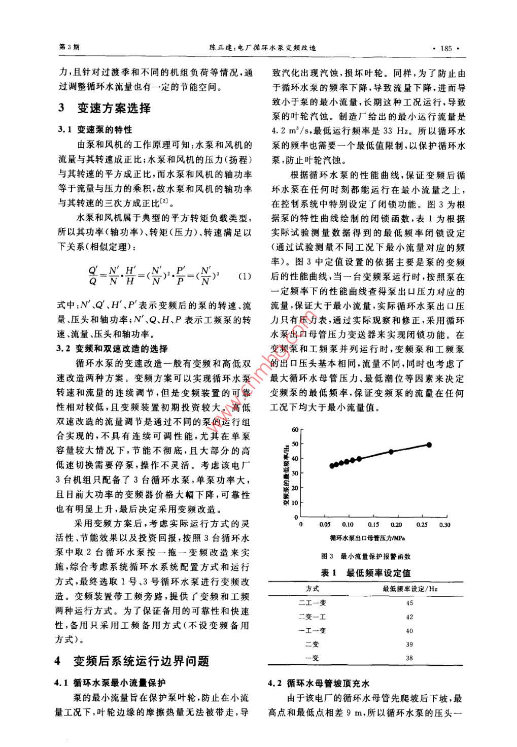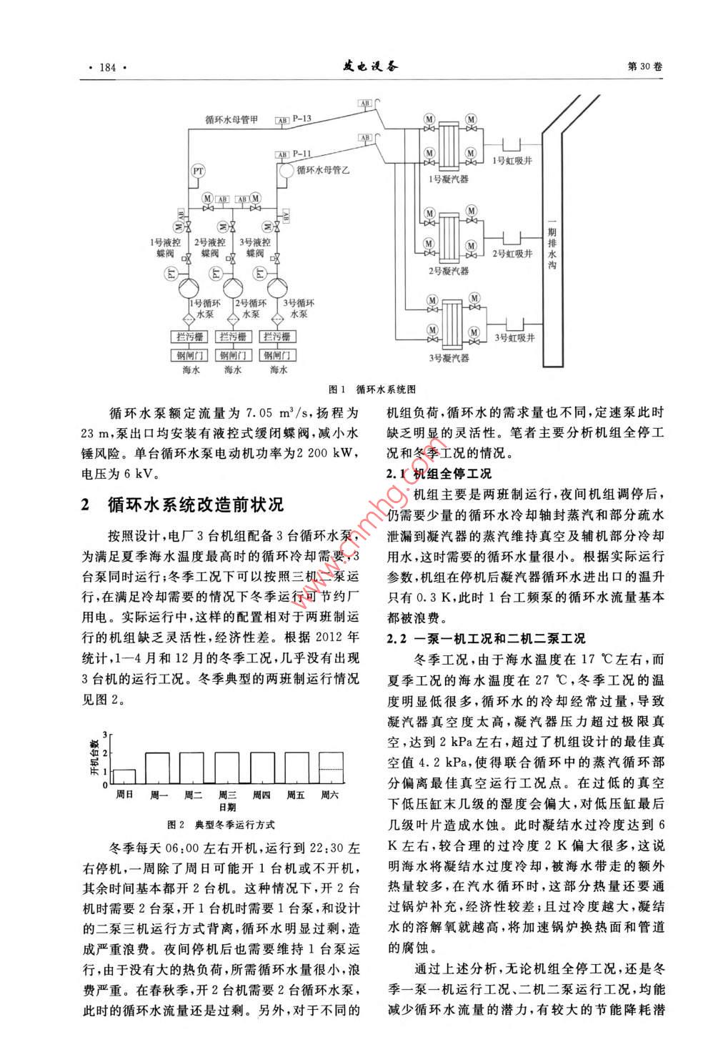 第30卷第3期發(fā)電謾備Vol 30, No. 32016年5月POWER EQUIPMENTMay.2016電廠循環(huán)水泵變頻改造陳正建(深圳能源集團(tuán)殿份有限公司東部電廠,廣東深圳518120)摘要:針對(duì)變頻改造后出現(xiàn)的泵的最小流量限制和循環(huán)水母管充水要求,通過理論分析和試驗(yàn),確定了運(yùn)行的邊界保證設(shè)備和系統(tǒng)的安全。為了使得機(jī)組在最佳真空下運(yùn)行,通過試驗(yàn)和估算找出變頻泵的最佳運(yùn)行工況提高了循環(huán)水泵運(yùn)行的靈活性,降低了廠用電率。關(guān)鍵詞:循環(huán)水;變頻;最佳真空;廠用電率中圖分類號(hào):TK477文獻(xiàn)標(biāo)志碼:A文章編號(hào):1671-086X(2016)03-0183-05Frequency Conversion Retrofit of a Circulating WaterPump for Power PlantsChen Zhengjian( Dongbu Power Plant, Shenzhen Energy Corporation, Shenzhen 518120, China)Abstract: To guarantee that the flow rate of relevant circulating water pumps is higher than theinimum requirement and the top of the main pipeline can be filled with seawater after frequencyconversion retrofit, operation limits are set through analysis and commissioning tests to secure the safety ofrelated equipment and systems. Meanwhile, optimal operation conditions are found by tests and calculationsafter frequency conversion retrofit, so that the circulating water system can be operated under the bestvacuum condition and become more flexible to the DSS operation mode, thus bringing remarkable economicbenefit to the power plantKeywords: circulating water; frequency conversion; optimal vacuum; auxiliary power ratio循環(huán)水泵是燃?xì)庹羝?lián)合循環(huán)電廠最大的耗能設(shè)備,某電廠3臺(tái)聯(lián)合循環(huán)機(jī)組配置了31循環(huán)水系統(tǒng)概況臺(tái)循環(huán)水泵,設(shè)計(jì)的循環(huán)水泵系統(tǒng)在運(yùn)行方式某電廠安裝3臺(tái)350MW聯(lián)合循環(huán)機(jī)組,電上缺乏靈活性,不能在電廠兩班制運(yùn)行方式下廠的循環(huán)冷卻水系統(tǒng)采用海水直流供水,取排水經(jīng)濟(jì)運(yùn)行,浪費(fèi)大量廠用電。筆者重點(diǎn)分析了日均設(shè)在海邊。變頻改造后,為了保證滿足循環(huán)水泵最小流量冷卻水工藝流程為:海水→前池→凈水間要求和循環(huán)水爬坡母管充水等邊界條件,對(duì)循→循環(huán)水泵房→壓力管→凝汽器及輔機(jī)冷卻器環(huán)水泵變頻后的運(yùn)行頻率進(jìn)行了限制,保證設(shè)→排水孔→虹吸井→排水溝→排水口→海水。備和系統(tǒng)安全。在安全邊界范圍內(nèi),通過凝汽循環(huán)水系統(tǒng)采用雙母管制供水,3套聯(lián)合循環(huán)機(jī)器真空變化對(duì)汽輪機(jī)功率微增影響的試驗(yàn)方組配套3臺(tái)循環(huán)水泵,2條循環(huán)水母管,3套虹法,得出了最佳真空對(duì)應(yīng)的循環(huán)水泵運(yùn)行方式吸井,以及1條鋼筋混凝土自流排水溝。循環(huán)和頻率定值,保證機(jī)組運(yùn)行在最經(jīng)濟(jì)工況點(diǎn)。水母管間設(shè)有聯(lián)絡(luò)管,排水溝間也設(shè)有聯(lián)循環(huán)水泵變頻改造后的經(jīng)濟(jì)效益顯著,靈活性絡(luò)溝明顯增強(qiáng),達(dá)到了預(yù)期的改造效果圖1為該電廠循環(huán)水系統(tǒng)圖。收稿日期:2015-1020作者簡介:陳正建(1981一),男,工程師,主要從事燃?xì)廨啓C(jī)運(yùn)行管理工作E-mail:chenzhengjian@sec.com.cn184發(fā)也汊備第30卷循環(huán)水母管甲AP-131號(hào)虹吸井循環(huán)水母管乙MIAB [AB( M1號(hào)液控2號(hào)液控3號(hào)液控蝶閥測2號(hào)虹吸井水1號(hào)循環(huán)下2號(hào)循環(huán)T3號(hào)循環(huán)攔污柵]『攔污柵】攔污3號(hào)虹吸井鋼閘門【鋼閘門】【鍋閘門3號(hào)凝汽器海水海水海水圖1循環(huán)水系統(tǒng)圖循環(huán)水泵額定流量為7.05m3/s,揚(yáng)程為機(jī)組負(fù)荷,循環(huán)水的需求量也不同,定速泵此時(shí)m,泵出口均安裝有液控式緩閉蝶閥,減小水缺乏明顯的靈活性。筆者主要分析機(jī)組全停工錘風(fēng)險(xiǎn)。單臺(tái)循環(huán)水泵電動(dòng)機(jī)功率為2200kW,況和冬季工況的情況。電壓為6kV2.1機(jī)組全停工況2循環(huán)水系統(tǒng)改造前狀況機(jī)組主要是兩班制運(yùn)行,夜間機(jī)組調(diào)停后,仍需要少量的循環(huán)水冷卻軸封蒸汽和部分疏水按照設(shè)計(jì),電廠3臺(tái)機(jī)組配備3臺(tái)循環(huán)水泵,泄漏到凝汽器的蒸汽維持真空及輔機(jī)部分冷卻為滿足夏季海水溫度最高時(shí)的循環(huán)冷卻需要,3用水,這時(shí)需要的循環(huán)水量很小。根據(jù)實(shí)際運(yùn)行臺(tái)泵同時(shí)運(yùn)行;冬季工況下可以按照三機(jī)二泵運(yùn)參數(shù),機(jī)組在停機(jī)后凝汽器循環(huán)水進(jìn)出口的溫升行,在滿足冷卻需要的情況下冬季運(yùn)行可節(jié)約廠只有0.3K,此時(shí)1臺(tái)工頻泵的循環(huán)水流量基本用電。實(shí)際運(yùn)行中,這樣的配置相對(duì)于兩班制運(yùn)都被浪費(fèi)。行的機(jī)組缺乏靈活性,經(jīng)濟(jì)性差。根據(jù)2012年2.2-泵一機(jī)工況和二機(jī)二泵工況統(tǒng)計(jì),1-4月和12月的冬季工況,幾乎沒有出現(xiàn)冬季工況,由于海水溫度在17℃左右,而3臺(tái)機(jī)的運(yùn)行工況。冬季典型的兩班制運(yùn)行情況夏季工況的海水溫度在27℃,冬季工況的溫見圖2。度明顯低很多,循環(huán)水的冷卻經(jīng)常過量,導(dǎo)致凝汽器真空度太高,凝汽器壓力超過極限