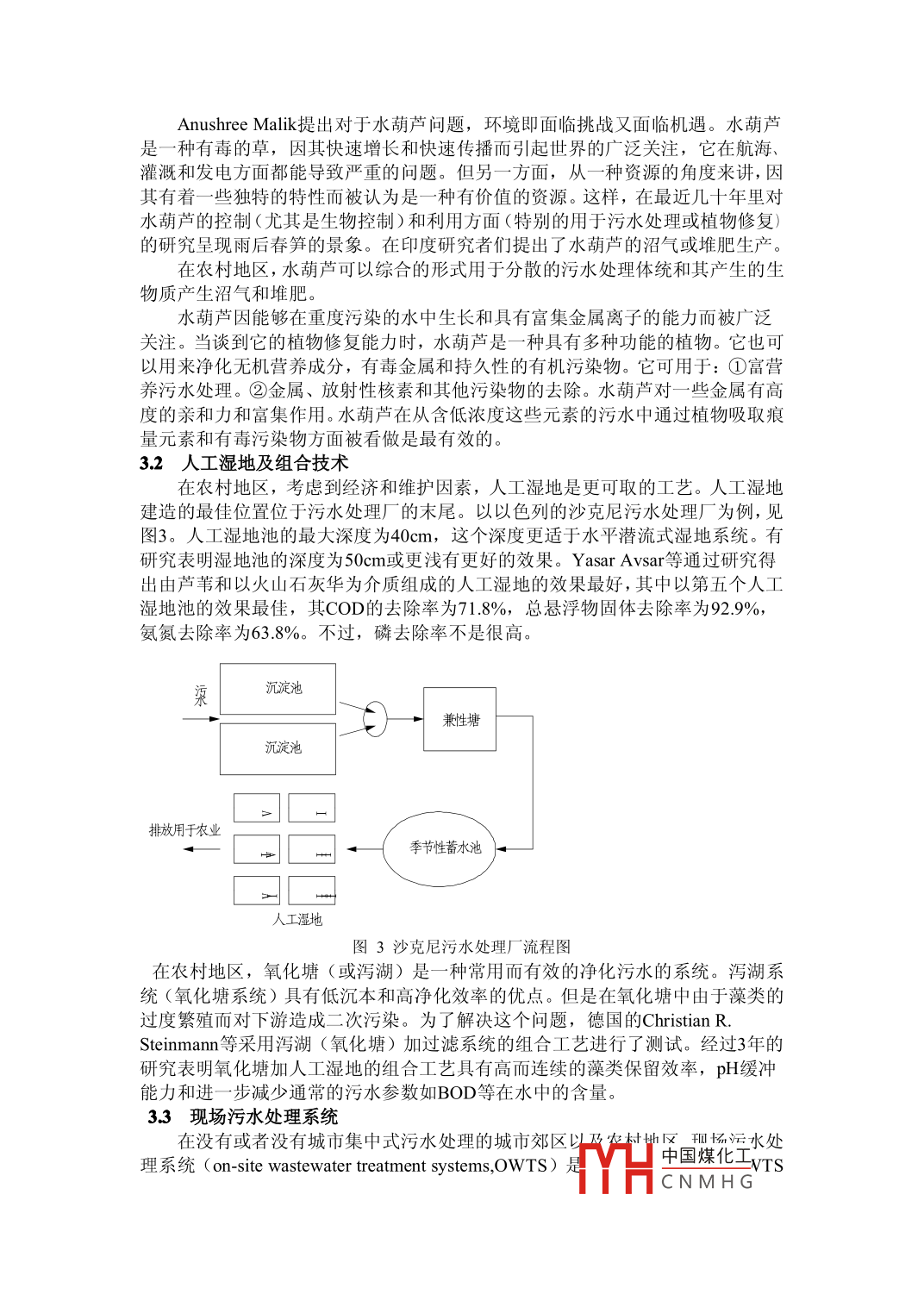 國外村鎮(zhèn)污水處理動向呂浩廣西建筑科學研究設(shè)計院廣 西530011摘要:概述了國外村鎮(zhèn)污水處理總體動向,從國外村鎮(zhèn)水處理新理念、相關(guān)大型水處理工程和村鎮(zhèn)污水處理技術(shù)等三個方面對其進行了介紹,以便為國內(nèi)進行村鎮(zhèn)污水處理提供一定的參考。關(guān)鍵詞:村鎮(zhèn)污水處理;新理念;水處理工程;處理技術(shù)-中圖分類號: U664.9+2 文獻標識碼: A文章編號:隨著時代的發(fā)展,處于城市邊緣地帶的郊區(qū)或遠離城市的農(nóng)村或鄉(xiāng)村排放的污水因其對人類賴以生存的環(huán)境的危害程度越來越大而受到相關(guān)政府及環(huán)保部門的高度重視,有些國內(nèi)城市已開始對城市及相關(guān)農(nóng)村排放的污水進行統(tǒng)籌規(guī)劃,以便更好的走一條城鄉(xiāng)發(fā)展良好、生態(tài)文明的環(huán)境治理道路。本文主要從國外村鎮(zhèn)污水處理的新理念、相關(guān)大型水處理工程和污水處理技術(shù)進行了闡述,以便為國內(nèi)制定相應(yīng)的村鎮(zhèn)污水處理對策和措施提供一定的參考。一、國外水處理新理念.1.1歐 盟Zero~M理念Zer0-M是實現(xiàn)零排放自治區(qū)(市政當局)的可持續(xù)觀念的簡寫。此項工程的目的在于借助這種理念和運用相關(guān)技術(shù)在小的自治區(qū)或住宅區(qū)實現(xiàn)各種水的最優(yōu)循環(huán)使用。Zer0-M融合了給水,污水處理和再利用。實際上它已經(jīng)拋棄了“污水"的概念,因為一方面沒有水作為廢水排放,另-方面處理這個概念是比較模糊的,并且迄今為止處理已被證明是非常不安全的。因而把處理轉(zhuǎn)化為一種資產(chǎn)。為了在實際系統(tǒng)中鼓勵Zer0-M觀念的實施,當前已經(jīng)建立了所謂的訓練和演示示范中心,在那里面展示和測試了大量的不同技術(shù),并且在真實條件下對演示的技術(shù)進行了中試。1.2奧地利生態(tài) 衛(wèi)生理念奧地利生態(tài)衛(wèi)生理念:指出其作為一個解決全球衛(wèi)生問題的途徑。表1為污水和廢棄物的處理方法和相關(guān)利用。表1污水和廢棄物處理和利用選擇方案物質(zhì)尿液糞便洗滌水雨水有機廢物人工濕地處理、儲存或干化等衛(wèi)|厭氧消化、 干化、造園、污水塘處處理措施過濾、生物處理|堆肥化、 厭氧消化生處理堆肥化理、生化處理、膜技術(shù)處理利用作液態(tài)或干化肥作沼氣、土壤改灌溉、回灌地下 作供水或回灌地作土壤改良、沼氣料水或直接再利用下水常規(guī)生活污水中氮總量的70%80%都是由尿液帶來的,而氮、磷嚴重超標是水體富營養(yǎng)化的主要原因之一。而從源頭上實現(xiàn)糞尿分離,不但可以從源頭減少向水體排放氮、磷,還能將氮、磷變成有機肥料,實現(xiàn)生態(tài)的良性循環(huán)。“糞尿分離”正體現(xiàn)了“源分離”為基本理念。中國煤化工1.3丹麥應(yīng)用于中等規(guī)模鎮(zhèn)的技術(shù)框架理念MHCNMH G丹麥應(yīng)用于中等規(guī)模鎮(zhèn)的技術(shù)框架理念:它是針對從城市到農(nóng)村營養(yǎng)物質(zhì)和有機物質(zhì)再循環(huán)的可能行和存在障礙而提出的。圖1為它的技術(shù)框架。堆肥倉作植被肥料、澆灌植被尿液_→收集箱柳樹根帶或滲透系統(tǒng)化糞池托運,污水處理廠山托運」 農(nóng)業(yè)利用圖1技術(shù)框架流程圖從圖1可以看出此技術(shù)框架也體現(xiàn)著“源分離"的理念,即實現(xiàn)糞便、尿液等從源頭上分離而分而治之。二、國外與村鎮(zhèn)相關(guān)大型水處理工程2.1梅達水工程在地中海國家實施了污水再利用的梅達水工程(MEDAWARE project) :在塞浦路斯地區(qū)為例通過技術(shù)革新緊湊了生物污水處理系統(tǒng)以提高污水的再利用:梅達水工程的目的是通過改進有效的技術(shù)和安全做法來解決城市污水處理的可持續(xù)問題和在農(nóng)業(yè)生產(chǎn)中的污水再利用問題。這個工程的總體目標是針對當前地中海國家污水處理和污水在農(nóng)業(yè)生產(chǎn)中的再利用的形勢的改變提供便利,同時也為了提高建設(shè)污水處理和再利用行業(yè)的專業(yè)能力。2.2歐盟. 地中海水工程考慮到水短缺的事實,地中海國家實施了(Euro-Mediterranean)歐盟地中海水工程:以提高污水管理、處理和再利用的效率,其目的在于在污水處理和再利方面通過轉(zhuǎn)變革新公眾意識、應(yīng)用新技術(shù)和采取合理的措施來增加供水的安全性。為期4年的這個工程的幾個主要國家為約旦、黎巴嫩、巴勒斯坦和土耳其。這個工程通過一-些訓練項目對當局的技工、工程師和雇員及非政府組織人員進行訓練,公眾意識運動、應(yīng)用低成本的技術(shù)來設(shè)計和建造中試點和政策導向來達到這些目標。圖2為巴勒斯坦- 一個地方的中試流程圖。。進水流量a廢污泥流量c回流流量進入三級處理第第ooxorn復簣|泥與旋轉(zhuǎn)生物接觸器池廢污泥流量圖2中試流程圖三、國外村鎮(zhèn)污水處理技術(shù)中國煤化工3.1印度水葫蘆 處理技術(shù)MHCNMH GAnushree Malik提出對于水葫蘆問題,環(huán)境即面臨挑戰(zhàn)又面臨機遇。水葫蘆是一種有毒的草,因其快速增長和快速傳播而引起世界的廣泛關(guān)注,它在航海、灌溉和發(fā)電方面都能導致嚴重的問題。但另一方面,從一-種資源的角度來講,因其有著一-些獨特的特性而被