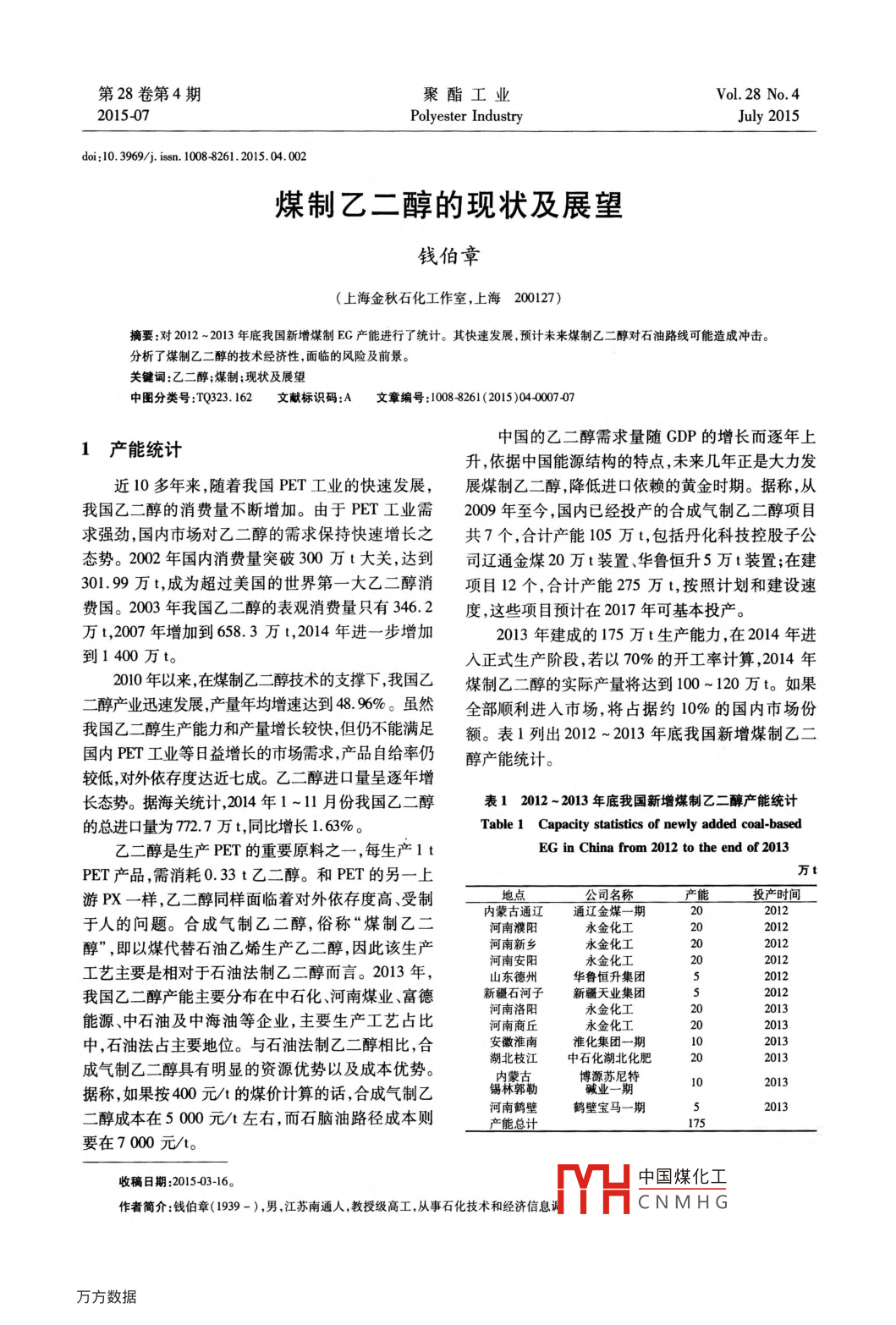 第28卷第4期聚酯工業(yè)Vol 28 No 4201507Polyester IndustryJuly 2015doi:10.3969/j.isn.10088261.2015.04.002煤制乙二醇的現(xiàn)狀及展望錢伯章(上海金秋石化工作室,上海200127)摘要:對2012~2013年底我國新增煤制EG產(chǎn)能進(jìn)行了統(tǒng)計。其快速發(fā)展,預(yù)計未來煤制乙二醇對石油路線可能造成沖擊。分析了煤制乙二醇的技術(shù)經(jīng)濟(jì)性,面臨的風(fēng)險及前景。關(guān)鍵詞:乙二醇;煤制;現(xiàn)狀及展望中圖分類號:TQ323.162文獻(xiàn)標(biāo)識碼:A文章編號:10088261(2015)040007071產(chǎn)能統(tǒng)計中國的乙二醇需求量隨GDP的增長而逐年上升,依據(jù)中國能源結(jié)構(gòu)的特點,未來幾年正是大力發(fā)近10多年來,隨著我國PET工業(yè)的快速發(fā)展,展煤制乙二醇,降低進(jìn)口依賴的黃金時期。據(jù)稱,從我國乙二醇的消費量不斷增加。由于PET工業(yè)需2009年至今,國內(nèi)已經(jīng)投產(chǎn)的合成氣制乙二醇項目求強勁,國內(nèi)市場對乙二醇的需求保持快速增長之共7個,合計產(chǎn)能105萬t,包括丹化科技控股子公態(tài)勢。2002年國內(nèi)消費量突破300萬t大關(guān),達(dá)到司遼通金煤20萬t裝置、華魯恒升5萬t裝置;在建301.99萬t,成為超過美國的世界第一大乙二醇消項目12個,合計產(chǎn)能275萬t,按照計劃和建設(shè)速費國。2003年我國乙二醇的表觀消費量只有346.2度,這些項目預(yù)計在2017年可基本投產(chǎn)。萬t,2007年增加到658.3萬t,2014年進(jìn)一步增加2013年建成的175萬t生產(chǎn)能力,在2014年進(jìn)到1400萬t。入正式生產(chǎn)階段,若以70%的開工率計算,2014年2010年以來,在煤制乙二醇技術(shù)的支撐下,我國乙煤制乙二醇的實際產(chǎn)量將達(dá)到100~120萬t。如果二醇產(chǎn)業(yè)迅速發(fā)展產(chǎn)量年均增速達(dá)到48%%。雖然全部順利進(jìn)入市場,將占據(jù)約10%的國內(nèi)市場份我國乙二醇生產(chǎn)能力和產(chǎn)量增長較快但仍不能滿足額。表1列出2012-2013年底我國新增煤制乙二國內(nèi)PET工業(yè)等日益增長的市場需求產(chǎn)品自給率仍醇產(chǎn)能統(tǒng)計。較低,對外依存度達(dá)近七成。乙二醇進(jìn)口量呈逐年增長態(tài)勢。據(jù)海關(guān)統(tǒng)計,2014年1~11月份我國乙二醇表12012~2013年底我國新增煤制乙二醇產(chǎn)能統(tǒng)計的總進(jìn)口量為72.7萬t,同比增長1.63%。Table 1 Capacity statistics of newly added coal-based乙二醇是生產(chǎn)PET的重要原料之一,每生產(chǎn)1tEG in China from 2012 to the end of 2013PET產(chǎn)品,需消耗0.33t乙二醇。和PET的另一上萬t游PX一樣,乙二醇同樣面臨著對外依存度高、受制地點公司名稱「能投產(chǎn)時間內(nèi)蒙古通遼通遼金煤一期于人的問題。合成氣制乙二醇,俗稱“煤制乙二河南濮陽永金化工2012醇”,即以煤代替石油乙烯生產(chǎn)乙二醇,因此該生產(chǎn)河南新鄉(xiāng)永金化工2012河南安陽永金化工工藝主要是相對于石油法制乙二醇而言。2013年,山東德州華魯恒升集團(tuán)我國乙二醇產(chǎn)能主要分布在中石化、河南煤業(yè)、富德新疆石河子新疆天業(yè)集團(tuán)2012河南洛陽永金化工2013能源、中石油及中海油等企業(yè),主要生產(chǎn)工藝占比河南商丘永金化工2013中,石油法占主要地位。與石油法制乙二醇相比,合安徽淮南淮化集團(tuán)成氣制乙二醇具有明顯的資源優(yōu)勢以及成本優(yōu)勢。湖北枝江中石化湖北化肥內(nèi)蒙古博源蘇尼特?fù)?jù)稱,如果按400元/t的煤價計算的話,合成氣制乙錫林郭勒堿業(yè)一期二醇成本在5000元/t左右,而石腦油路徑成本則河南鶴壁鶴壁寶馬一期52013產(chǎn)能總計175要在7000元/t。收稿日期:201503-16。中國煤化工作者簡介:錢伯章(1939-),男,江蘇南通人,教授級高工,從事石化技術(shù)和經(jīng)濟(jì)信息CNMHG聚酯工業(yè)第28卷2014年以來,大部分煤制乙二醇生產(chǎn)裝置負(fù)荷2015年計劃投產(chǎn)項目就有7個,產(chǎn)能合計122萬to已經(jīng)可以達(dá)到80%。且經(jīng)過幾年的不斷改進(jìn),煤制按此數(shù)據(jù)推算,截止到2015年底,我國煤制乙二醇乙二醇產(chǎn)品已逐漸被下游PET化纖企業(yè)接受。新產(chǎn)能將達(dá)到302萬t,占到國內(nèi)總產(chǎn)能的40%,將撐疆天業(yè)5萬Ua乙二醇裝置運行穩(wěn)定,其產(chǎn)品在起國內(nèi)供應(yīng)的半邊天。PET工廠使用情況良好,已實現(xiàn)長絲直紡100%應(yīng)中科院福建物構(gòu)所經(jīng)30年的不懈努力,開發(fā)了用,瓶片50%勾兌應(yīng)用等。草酸酯氧化偶聯(lián)法制取乙二醇流程。丹化集團(tuán)在通截至2014年9月底,中國乙二醇總產(chǎn)能達(dá)遼采用該技術(shù)建設(shè)了20萬t/a裝置,于2009年底5985萬t,其中煤制乙二醇產(chǎn)能占比達(dá)292%。建成投產(chǎn),但裝置至今沒有達(dá)標(biāo)。雖然示范裝置運據(jù)統(tǒng)計,2014年底我國確定開車的煤制乙二醇行遇到了一系列問題,但是國內(nèi)煤制乙二醇領(lǐng)域的裝置共有3套,包括河南永金洛陽煤化有限公司20科研仍比較活躍,有多套實驗裝置正在建設(shè)和運行萬t/a乙二醇裝置和鄂爾多斯新航能源有限公司30(見表2)。其中,2014年新疆天業(yè)5萬t/a項目的萬t/a乙二醇裝置及新疆天辰有限公司20萬ta乙開工率達(dá)到88%,并正在建設(shè)一套20萬t/a裝置。二醇裝置,總計年產(chǎn)能達(dá)70萬t。而據(jù)統(tǒng)計,僅在表2國內(nèi)煤制乙二醇實驗