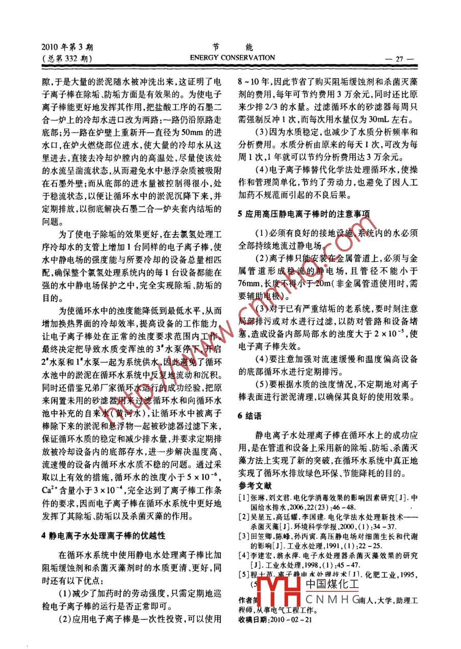 2010年第3期節(jié)能(總第332期)ENERGY CONSERVATION-25-高壓靜電離子棒在冶金工業(yè)循環(huán)水系統(tǒng)中的應(yīng)用劉康珍(山東省冶金建設(shè)開發(fā)公司,山東濟(jì)南250101)摘要:為解決冶金工業(yè)循環(huán)水系統(tǒng)管道和設(shè)備壁面結(jié)垢問題,曾采用添加阻垢劑,殺菌劑等方法,但效果并不理想。安裝使用高壓靜電離子棒,1周后水質(zhì)硬度迅速上升,沒有明顯結(jié)垢現(xiàn)象;后因引入水質(zhì)濁度太高,導(dǎo)致離子棒失效;經(jīng)清淤處理,使循環(huán)水濁度低于5x10-°,離子棒正常工作,并達(dá)到了除垢、防垢、殺菌的效果。關(guān)鍵詞:高壓靜電;離子棒;循環(huán)水;水硬度;水濁度中圖分類號(hào):TQ085*.4文獻(xiàn)標(biāo)識(shí)碼:B 文章編號(hào):1004 -7948(2010)03 -0025 -03高壓靜電離子棒是當(dāng)今世界上水處理領(lǐng)域中引言一種新的高科技產(chǎn)品,可廣泛應(yīng)用在以下領(lǐng)域的循循環(huán)水早已被廣泛地應(yīng)用在國(guó)民經(jīng)濟(jì)生產(chǎn)中環(huán)水中1-4):(1)熱電行業(yè)上的冷卻凝汽器冷油的各個(gè)領(lǐng)域,其分布之廣,應(yīng)用之多,僅次于電力資器、冷風(fēng)器;(2)鋼鐵冶金行業(yè)上各種加熱爐的爐源。當(dāng)今世界上水資源非常緊缺,如何有效地應(yīng)用體系統(tǒng);(3)煉油化工行業(yè)上各種反應(yīng)器和冷卻工業(yè)循環(huán)水,已引起各個(gè)行業(yè)的重視。影響工業(yè)循器;(4)空調(diào)制冷行業(yè);(5)游泳池里用來殺菌滅環(huán)水有效地實(shí)現(xiàn)冷熱載體效果的原因是隨著循環(huán)藻,進(jìn)行水質(zhì)更新等。.水循環(huán)次數(shù)的增加,會(huì)在其流過的管道和設(shè)備壁上循環(huán)水在流經(jīng)電子離子棒產(chǎn)生的高壓靜電場(chǎng)結(jié)成--層污垢,造成管道的內(nèi)徑變細(xì)、設(shè)備壁面的時(shí),會(huì)受到離子棒周圍產(chǎn)生的靜電場(chǎng)的影響,使具傳熱系數(shù)大幅度降低,這樣會(huì)使整個(gè)裝置能力下有極性的H20的偶極距增大,而溶解在水中的降。在夏季里,由于氣溫升高,在循環(huán)水中會(huì)生長(zhǎng)Ca2+、Mg?*和CO;一等離子被這些水分子所包圍,一些菌藻類微生物,它們?cè)谘h(huán)水的流動(dòng)過程中,從而減少了彼此間的有效碰撞,降低了正負(fù)離子間同樣會(huì)造成管道和設(shè)備的堵塞,降低設(shè)備冷熱交換的運(yùn)行速度,阻止了污垢的形成;同時(shí)在靜電場(chǎng)的能力。為解決這-問題, 山東省冶金建設(shè)開發(fā)公司作用下,水分子增加了與碳酸鹽、硫酸鹽等正負(fù)離于2009年3月在循環(huán)水系統(tǒng)中使用了高壓靜電離子的水和能力,因而加快了對(duì)已在管壁和設(shè)備壁面子棒,進(jìn)行除垢、防垢和殺菌滅藻,從而停止了向循上形成水垢的溶解速度,使已形成的水垢逐漸松環(huán)水中加藥。在使用過程中,不斷地總結(jié)經(jīng)驗(yàn),吸散、龜裂,直至脫落,達(dá)到除垢的目的。同時(shí)高壓靜取教訓(xùn),改進(jìn)應(yīng)用方法,現(xiàn)已完全實(shí)現(xiàn)了在循環(huán)水中除垢、防垢和殺菌滅藻的目的,使用至今,效果十電場(chǎng)還會(huì)使水體中產(chǎn)生- -定的電子密度,將溶解在分明顯。水中的空氣與水體- -起產(chǎn)生如02- H2O2羥基自1高壓靜電離子棒的工作原理(見圖1)由基等活性氧,這些活性氧可有效地把系統(tǒng)中的管山道和設(shè)備表面進(jìn)行氧化,使其表面形成--層微薄的氧化膜,隔絕水中的氧與金屬壁面直接接觸,達(dá)到EI曰水偶板子S防腐蝕的目的;這些活性氧還能破壞生物細(xì)胞的離子通道,改變細(xì)菌和藻類的生物場(chǎng),起到殺菌滅藻( ) Ca",Mg*的作用,其效果比氯氣好得多。日so*.co;2原中國(guó)煤化工YHC N M H G解決循環(huán)水在系圖1離子棒水處理器的工作原理統(tǒng)管道和設(shè)備壁面上結(jié)垢的問題,曾根據(jù)循環(huán)水的節(jié)能2010年第3期- 26ENERGY CONSERVATION(總第332期)分析結(jié)果每周向水中添加阻垢緩蝕劑,并根據(jù)其濃況,并利用停爐的機(jī)會(huì),排凈夾套內(nèi)存水,打開安裝縮倍數(shù)的高低,不定期換水,以求達(dá)到防垢緩蝕的在二合一爐下部金屬外殼上的玻璃視鏡法蘭,檢查目的。在炎熱的夏季里,還要向循環(huán)水中加人適量其石墨外壁的結(jié)垢情況,發(fā)現(xiàn)石墨外觀基本呈原的JS-36型殺菌剝離劑進(jìn)行殺菌滅藻,有時(shí)為減色,沒有明顯結(jié)垢的現(xiàn)象發(fā)生。于是用自來水把夾少費(fèi)用,還向循環(huán)水中加人少量的氣水代替殺菌套底部沉積的淤泥沖洗干凈,再開車運(yùn)行。直到劑。盡管采取了防垢除藻的措施,但仍不能根除管2009年6月中旬,由于氣溫驟然升高,1臺(tái)循環(huán)水道和設(shè)備壁面上結(jié)垢、生藻的現(xiàn)象,特別是在一些泵的流量明顯不足,工序上各物料的冷卻效果不理溫度偏高、流速過緩的設(shè)備傳熱壁面上還會(huì)出現(xiàn)較想,便開啟了循環(huán)水工序的3*備用泵。但因?yàn)?"為嚴(yán)重的結(jié)垢現(xiàn)象,比如在一-級(jí)氯氣冷卻器的列管泵人口的管口距池底部距離短,所以把沉積在池底外壁上就因結(jié)垢嚴(yán)重,使流經(jīng)--級(jí)冷卻器出來的氯部的淤泥和水一起抽上來,導(dǎo)致整個(gè)循環(huán)水的水質(zhì)氣溫度高達(dá)60C,給二級(jí)冷卻器增加了更大的負
