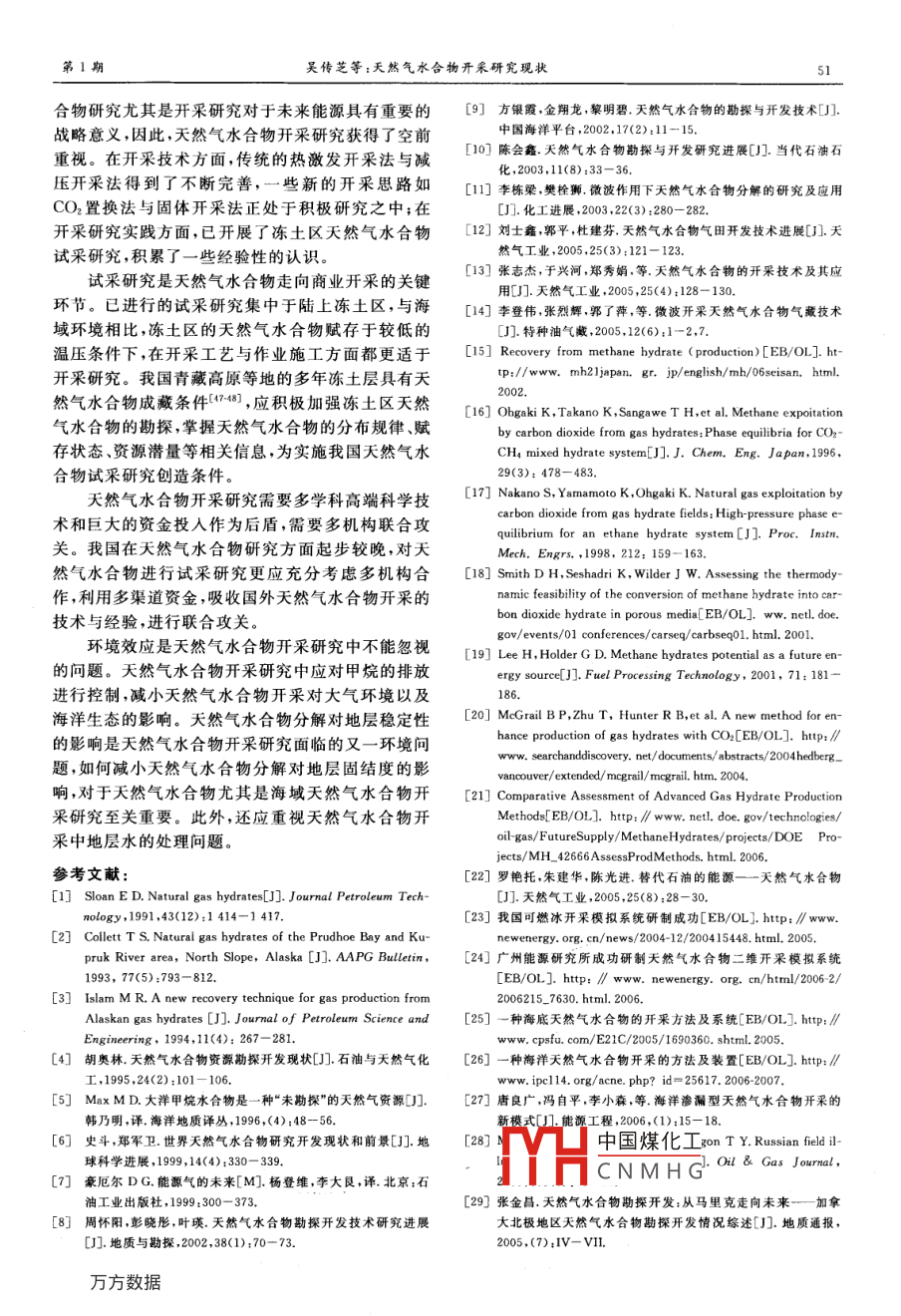 第27卷第1期地質(zhì)科枝情報Vol 27 No. 12008年1月Geological Science and Technology Information天然氣水合物開采研究現(xiàn)狀吳傳芝3,趙克斌,孫長青',孫冬勝2,徐旭輝2,陳昕華3,宣玲1(1.中國石油化工股份有限公司石油勘探開發(fā)研究院無錫石油地質(zhì)研究所,江蘇無錫214151;中國石油化工股份有限公司石油勘探開發(fā)研究院,北京1000833.中國石油化工股份有限公司石油勘探開發(fā)研究院西部分院,烏魯木齊830011)摘要:隨著天然氣水合物基礎(chǔ)研究約不斷深入,天然氣水合物開采研究空前活躍。在技術(shù)方法方面,傳統(tǒng)的熱激發(fā)開采法、減壓開采法與化學(xué)抑制劑注入開采法獲得了不斷的發(fā)晨與改進;新型開采技術(shù)如CO2置換法與固體開采法引起了學(xué)者們的極大關(guān)注;最近我國還研制出適合于海泮天然氣水合物開采的水力提升法。在開采研究實踐方面,全世界已在3處凍土區(qū)進行了天然氣水合物試采研究。介紹了天然氣水合物開采技術(shù)的研究進展與凍土區(qū)天然氣水合物試采研究結(jié)果,分析了天然氣水合物開采研」究中可能涉及的環(huán)境問題,展現(xiàn)了現(xiàn)階段天然氣水合物開釆研究領(lǐng)域的最新成果,總結(jié)了這一領(lǐng)域取得的經(jīng)驗與認識,強調(diào)了國際天然氣水合物開采研究對我國天然氣水合物研究的啟示關(guān)鍵詞:天然氣水合物;開采技術(shù);開采試驗;麥索亞哈氣田;Mlik地區(qū)中圖分類號:TE31文獻標(biāo)識碼:A文章編號:10007849(2008)01004706天然氣水合物具有巨大的資源潛能,但只有解開采法1。隨著天然氣水合物基礎(chǔ)研究的不斷決了其開采問題,天然氣水合物才能成為一種真正深入,近些年又涌現(xiàn)出一些新的開采技術(shù),如CO2置的能源。近10年來,對天然氣水合物研究起步較早換法與固體開采法等121621的一些國家,明顯加速了天然氣水合物開采研究的1.1傳統(tǒng)開采方法的改進與技術(shù)缺陷步伐,在開采技術(shù)、開采工藝、開采面臨的環(huán)境問題(1)熱激發(fā)開采法熱激發(fā)開采法是直接對天等方面做了大量工作,并在凍土區(qū)進行了天然氣水然氣水合物層進行加熱,使天然氣水合物層的溫度合物開采試驗超過其平衡溫度,從而促使天然氣水合物分解為水我國近年來也已介入天然氣水合物開采研究領(lǐng)與天然氣的開采方法。這種方法經(jīng)歷了直接向天然域但總體上,國內(nèi)天然氣水合物開采研究才剛剛開氣水合物層中注入熱流體加熱、火驅(qū)法加熱、井下電始,尚沒有進行試采研究。筆者擬介紹天然氣水合物開采技術(shù)的發(fā)展、試磁加熱以及微波加熱等發(fā)展歷程681。熱激發(fā)開采研究結(jié)果與開采涉及的環(huán)境問題等內(nèi)容,展現(xiàn)現(xiàn)采法可實現(xiàn)循環(huán)注熱,且作用方式較快。加熱方式的階段世界天然氣水合物開采研究領(lǐng)域的最新成果不斷改進促進了熱激發(fā)開采法的發(fā)展。但這種方法總結(jié)這一研究領(lǐng)城已取得的經(jīng)驗與認識,強調(diào)國際至今尚未很好地解決熱利用效率較低的間題,而且只天然氣水合物開采研究對我國天然氣水合物開采研能進行局部加熱因此該方法尚有待進一步完善。究的啟示。(2)減壓開采法減壓開采法是一種通過降低壓力促使天然氣水合物分解的開采方法。減壓途徑1開采方法的改進與發(fā)展主要有兩種:①采用低密度泥漿鉆井達到減壓目的;②當(dāng)天然氣水合物層下方存在游離氣或其他流體天然氣水合物是一種由天然氣和水組成的亞穩(wěn)時,通過泵出天然氣水合物層下方的游離氣或其他定態(tài)礦物存在于特定的溫壓條件下。一旦賦存條流體來降低天然氣水合物層的壓力1:121:1件發(fā)生變化,天然氣水合物藏的相平衡就會被破壞,減壓開采法不需要連續(xù)激發(fā),成本較低,適合大面積引起天然氣水合物分解。傳統(tǒng)的天然氣水合物開采開采,尤其適用于存在下伏游離氣層的天然氣水合技術(shù)就是根據(jù)天然氣水合物的這種性質(zhì)而設(shè)計的,物藏中國煤化工統(tǒng)開采方法中最有主要包括熱激發(fā)開采法、減壓開采法與化學(xué)試劑注前劌CNMH水合物藏的性質(zhì)有收稿日期:2007-0428編輯:禹華珍基金項目:中國石油化工股份有限公司項目“天然氣水合物勘探與開發(fā)現(xiàn)狀調(diào)研”(P05072)作者簡介:吳傳芝(1966—),女,工程師,主要從事油氣地球化學(xué)勘探領(lǐng)域的科技情報工作。地質(zhì)科技情報2008年特殊的要求,只有當(dāng)天然氣水合物藏位于溫壓平衡了海洋天然氣水合物開采的水力提升法2。水力邊界附近時,減壓開采法才具有經(jīng)濟可行性。提升法是利用海底集礦系統(tǒng)對天然氣水合物進行原(3)化學(xué)試劑注入開采法化學(xué)試劑注入開采地粉碎,采集含有固、液、氣三相的混合物質(zhì),由水力法通過向天然氣水合物層中注入某些化學(xué)試劑,如提升系統(tǒng)上傳到海面作業(yè)船上的天然氣水合物分解系鹽水、甲醇、乙醇、乙二醇、丙三醇等,破壞天然氣水統(tǒng),再導(dǎo)入海面高溫海水對天然氣水合物進行分解。合物藏的相平衡條件,促使天然氣水合物分在上述天然氣水合物開采方法中,熱激發(fā)開采解6…1,1211。這種方法雖然可降低初期能量輸法與減壓開采法投入的研究較多,也較為成熟