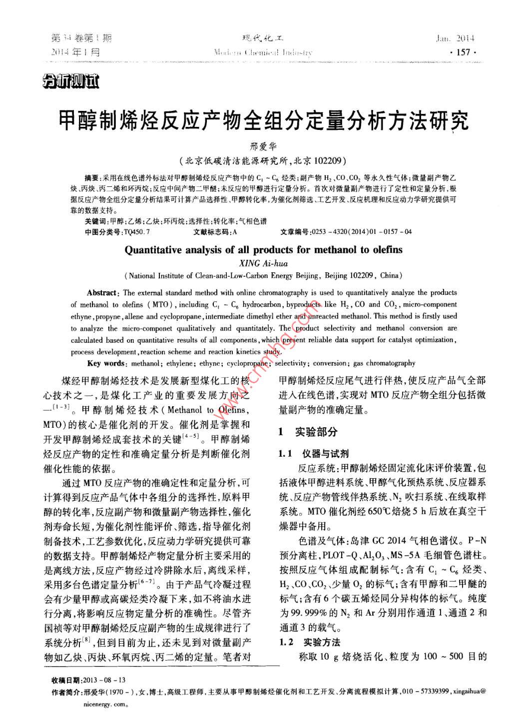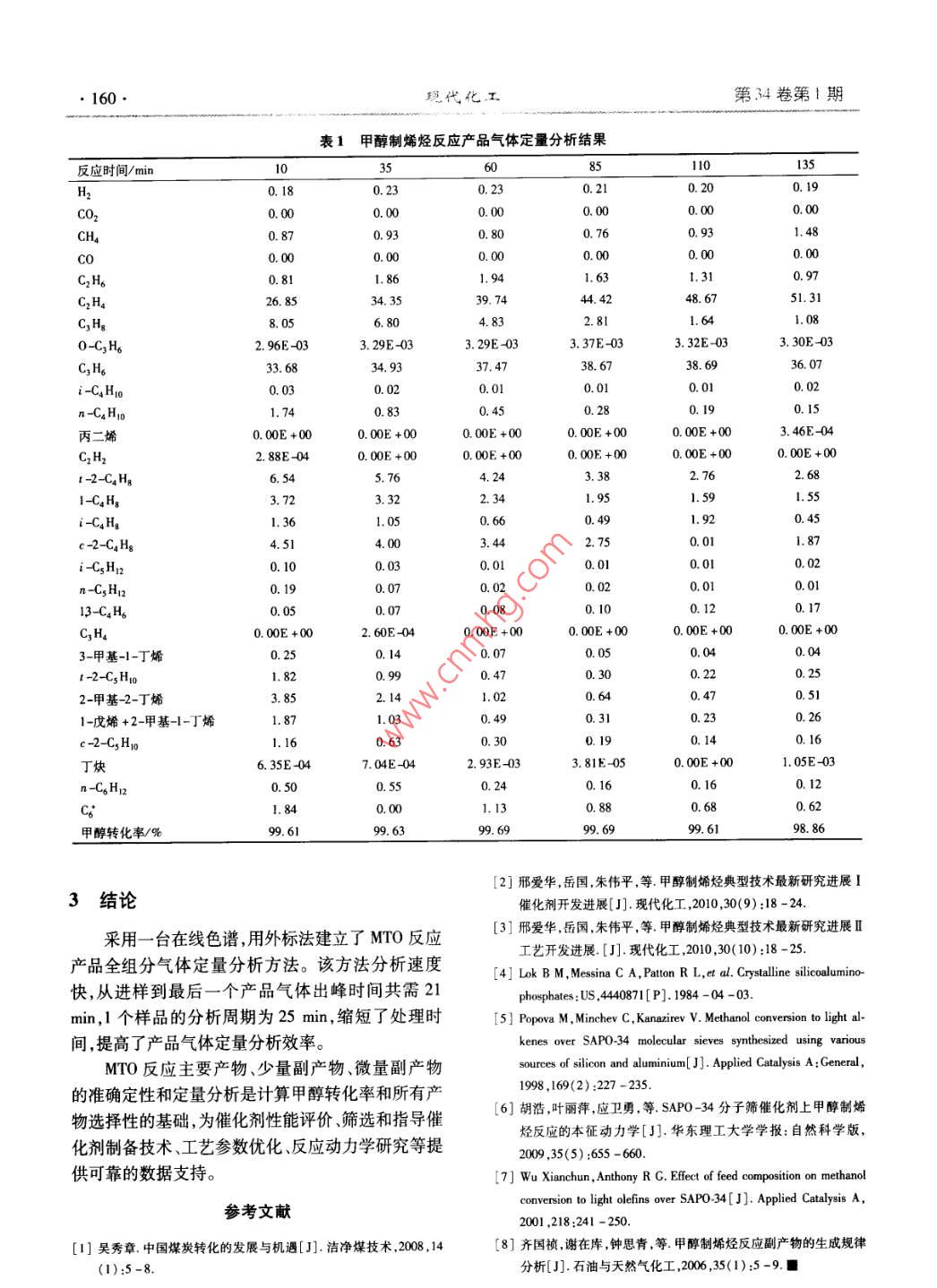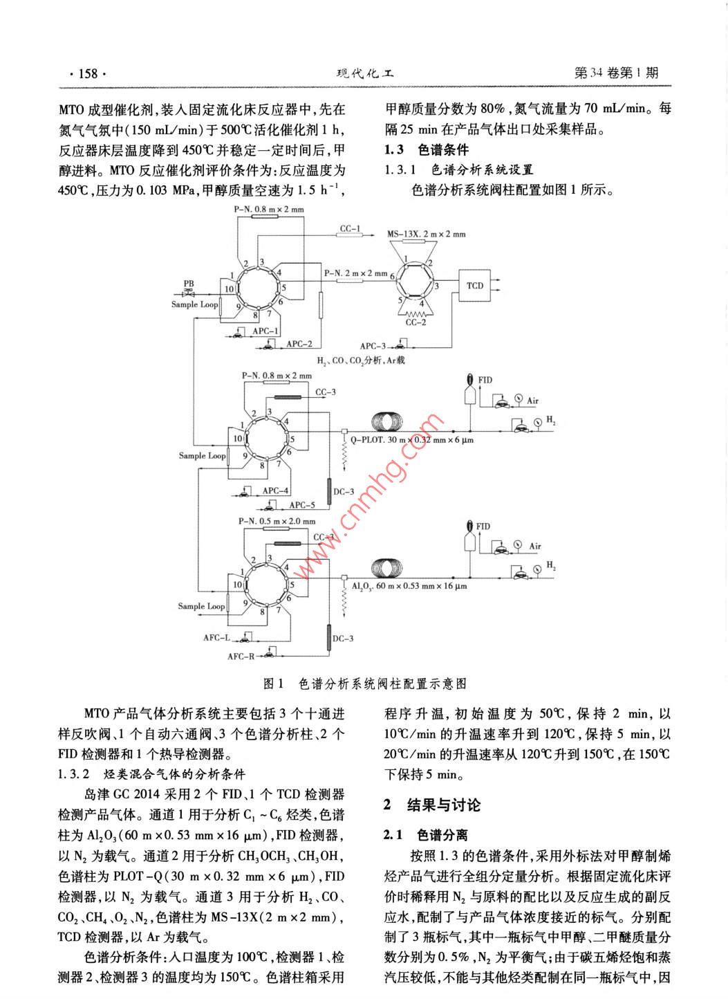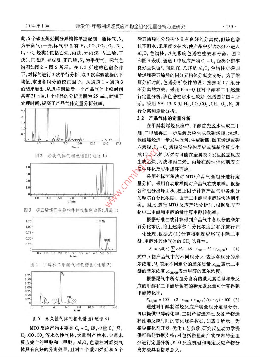 第34卷第{期現(xiàn)代化工Jan.20142014年!月Mentene Chenia! Heln-Irv.157.分誠(chéng)測(cè)試甲醇制烯烴反應(yīng)產(chǎn)物全組分定量分析方法研究邢愛華(北京低碳清潔能源研究所,北京102209)摘要:采用在線色譜外標(biāo)法對(duì)甲醇制烯烴反應(yīng)產(chǎn)物中的C ~C。烴類;副產(chǎn)物H2、CO.CO2等永久性氣體;微量副產(chǎn)物乙炔丙炔、丙二烯和環(huán)丙烷;反應(yīng)中間產(chǎn)物二甲醚;未反應(yīng)的甲醇進(jìn)行定量分析。首次對(duì)微量副產(chǎn)物進(jìn)行了定性和定量分析,根據(jù)反應(yīng)產(chǎn)物全組分定量分析結(jié)果可計(jì)算產(chǎn)品選擇性甲醇轉(zhuǎn)化率,為催化劑篩選、工藝開發(fā)、反應(yīng)機(jī)理和反應(yīng)動(dòng)力學(xué)研究提供可靠的數(shù)據(jù)支持。關(guān)鍵詞:甲醇;乙烯;乙炔;環(huán)丙烷;選擇性;轉(zhuǎn)化率;氣相色譜中圖分類號(hào):TQ450.7文獻(xiàn)標(biāo)志碼:A文章編號(hào):0253 -4320(2014)01 -0157 -04Quantitative analysis of all products for methanol to olefinsXING Ai-hua( National Institute of Clean-and-Low-Carbon Energy Beijing, Beiing 102209 , China)Abstract: The extemal standard method with online chromatography is used to quantitatively analyze the productsof methanol to olefins ( MTO) , including C - C。hydrocarbon, byproducts like H2 , CO and CO2 , micro- componentethyne ,propyne , llene and cyloropane , intermediate dimethyl ether and unreacted methanol. This method is frsly usedto analyze the micro -componet qualitatively and quantitately. The product seletity and methanol conversion arecalculated based on quantitative results of all components , which present reliable data support for catalyst optimization,process development ,reaction scheme and reaction kinetics study.Key words: methanol; ethylene ; ethyne; cyclopropane ; selectivity ; conversion; gas chromatography煤經(jīng)甲醇制烯烴技術(shù)是發(fā)展新型煤化工的核甲醇制烯烴反應(yīng)尾氣進(jìn)行伴熱,使反應(yīng)產(chǎn)品氣全部心技術(shù)之一,是煤化工產(chǎn)業(yè)的重要發(fā)展方向之進(jìn)入在線色譜,實(shí)現(xiàn)對(duì)MTO反應(yīng)產(chǎn)物全組分包括微-_[1-3。甲醇制烯烴技術(shù)(MethanoltoOlefns,量副產(chǎn)物的準(zhǔn)確定量。MTO)的核心是催化劑的開發(fā)。催化劑是掌握和1實(shí)驗(yàn)部分開發(fā)甲醇制烯烴成套技術(shù)的關(guān)鍵(“-5]。甲醇制烯烴反應(yīng)產(chǎn)物的定性和準(zhǔn)確定量分析是判斷催化劑1.1 儀器與試劑催化性能的依據(jù)。反應(yīng)系統(tǒng):甲醇制烯烴固定流化床評(píng)價(jià)裝置,包通過MTO反應(yīng)產(chǎn)物的準(zhǔn)確定性和定量分析,可括液體甲醇進(jìn)料系統(tǒng)、甲醇?xì)饣A(yù)熱系統(tǒng)、反應(yīng)器系計(jì)算得到反應(yīng)產(chǎn)品氣體中各組分的選擇性,原料甲統(tǒng)、反應(yīng)產(chǎn)物管線伴熱系統(tǒng).N2吹掃系統(tǒng)、在線取樣醇的轉(zhuǎn)化率,反應(yīng)副產(chǎn)物和微量副產(chǎn)物選擇性,催化系統(tǒng)。MTO催化劑經(jīng)650C焙燒5 h后放在真空干劑壽命長(zhǎng)短,為催化劑性能評(píng)價(jià)篩選,指導(dǎo)催化劑燥器中備用。制備技術(shù),工藝參數(shù)優(yōu)化,反應(yīng)動(dòng)力學(xué)研究提供可靠色譜及氣體:島津GC 2014氣相色譜儀。P-N的數(shù)據(jù)支持。甲醇制烯烴產(chǎn)物定量分析主要采用的預(yù)分離柱,PLOT -Q、AL203、MS -5A毛細(xì)管色譜柱。是離線方法,反應(yīng)產(chǎn)物經(jīng)過冷阱除水后,離線采樣,按照反應(yīng)氣體組成配制標(biāo)氣:含有C, ~C6烴類、采用多臺(tái)色譜定量分析(6-7)。由于產(chǎn)品氣冷凝過程H2、CO、CO2、少量02的標(biāo)氣;含有甲醇和二甲醚的會(huì)有少量甲醇或高碳烴類冷凝下來,如不將油水進(jìn)標(biāo)氣;含有6個(gè)碳五烯烴同分異構(gòu)體的標(biāo)氣。純度行分離,將影響反應(yīng)物定量分析的準(zhǔn)確性。盡管齊為99.99%的N2和Ar分別用作通道1、通道2和國(guó)禎等對(duì)甲醇制烯烴反應(yīng)副產(chǎn)物的生成規(guī)律進(jìn)行了通道3的載氣。系統(tǒng)分析[8],但到目前為止,還未見到對(duì)微量副產(chǎn)1.2實(shí)驗(yàn)方法物如乙炔、丙炔、環(huán)氧丙烷、丙二烯的定量。筆者對(duì)稱取10 g焙燒活化、粒度為100~500 目的收稿日期:2013 -08 -13作者簡(jiǎn)介:邢愛華(1970-),女,博士,高級(jí)工程師,主要從事甲醇制烯烴催化劑和工藝開發(fā)、分離流程模擬計(jì)算,010 - 57339399,xingaihua@nicenergy. com。158 .現(xiàn)代化工第34卷第1期MTO成型催化劑,裝人固定流化床反應(yīng)器中,先在甲醇質(zhì)量分?jǐn)?shù)為80% ,氮?dú)饬髁繛?0 mL/min。每氮?dú)鈿夥罩? 150 mL/min)于500C活化催化劑1 h,隔25min在產(chǎn)品氣體出口處采集樣品。反應(yīng)器床層溫度降到450C并穩(wěn)定-定時(shí)間后,甲1.3色譜 條件醇進(jìn)料。MTO反應(yīng)催化劑評(píng)價(jià)條件為:反應(yīng)溫度為1.3.1色譜分析系統(tǒng)設(shè)置450C ,壓力為0. 103 MPa,甲醇質(zhì)量空速為1.5 h-',色譜分析系統(tǒng)閥柱配置如圖1所示。P-N, 0.8 mx2 mm,CC=1。MS-13X.2mx2 mmP-N.2mx2 mm 6.盟10"CD[Sample Loop-2. 且APC-1APC-2APC-3_⊥H CO、C0,分析,Ar載P-N. 0.8mx2 mm0 FIDCC-3QL及PAirB0H10_5Q-PLOT.30mx0.32mmx6μm.Sample Lop火85. APC-4DC-3APC-5P-N. 0.5 mx 2.0 mm?FID_cc-及Q AirAL20, 60 mx 0.53 mmx 16 μmAPC-L_ A1AFC-R-aL圖1色譜分析系統(tǒng)閥柱配置示意 圖MTO產(chǎn)品氣體分析系統(tǒng)主要包括3個(gè)十通進(j