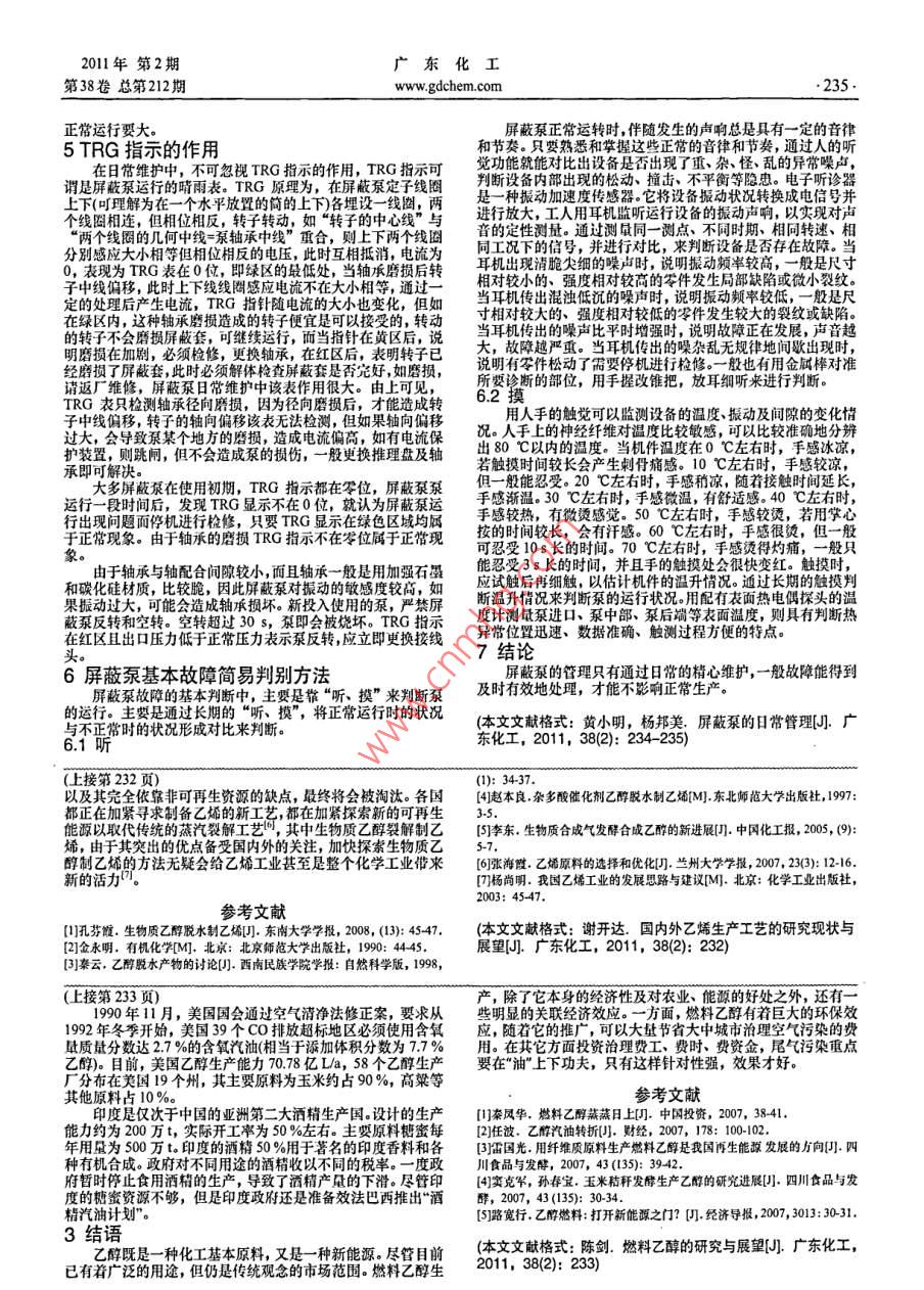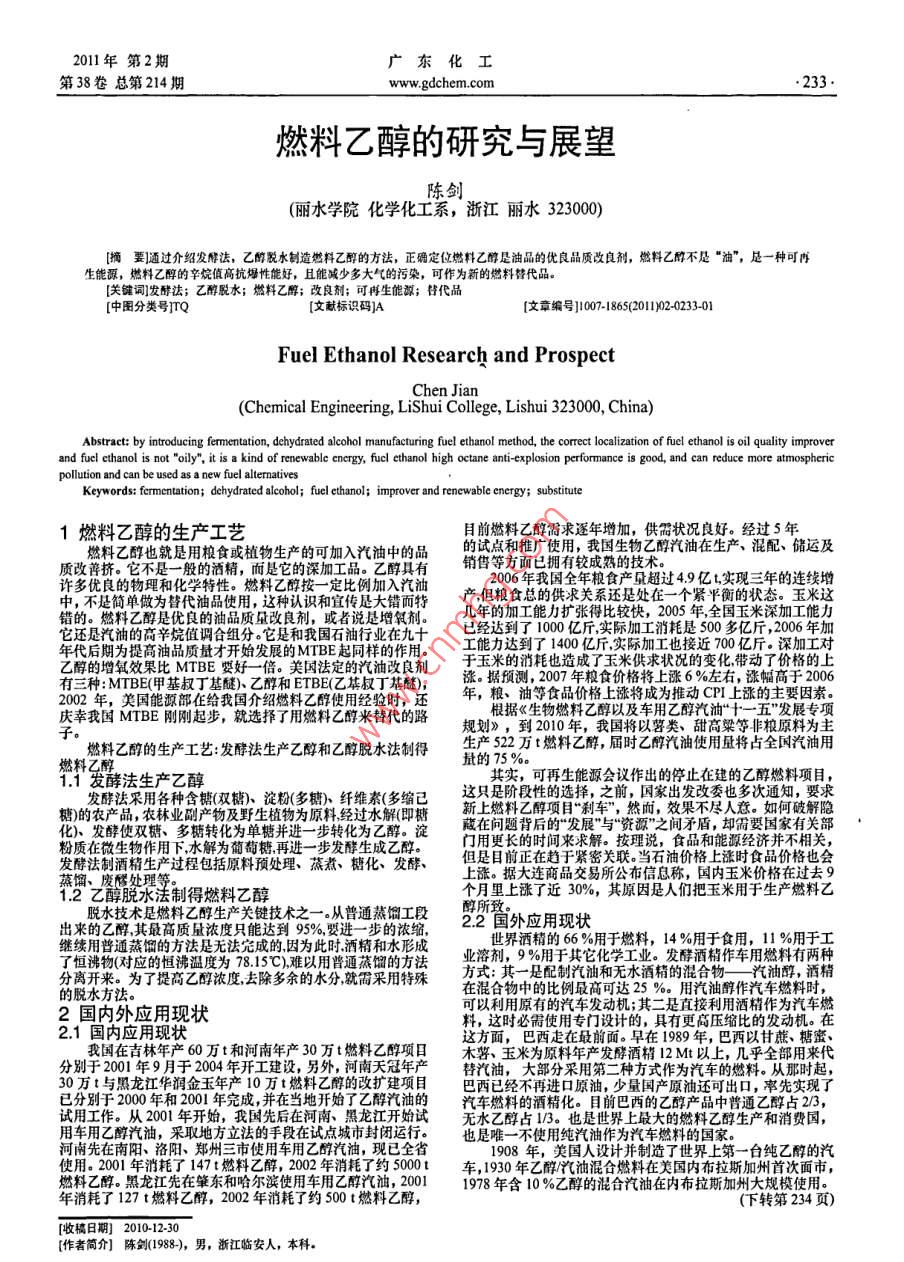 2011年第2期廣東化工第38卷總第214期 www.gdchem.com233燃料乙醇的研究與展望陳劍(麗水學院化學化工系,浙江麗水323000)[摘要通過介紹發(fā)酵法,乙醇脫水制造燃料乙醇的方法,確定位燃料乙醇是油品的優(yōu)良品質改良劑,燃料乙醇不是“油”,是一種可生能源,燃料乙醇的辛烷值高抗爆性能好,且能減少多大氣的污染,可作為新的燃料替代品【關鍵詞]發(fā)酵法;乙醇脫水;燃料乙醇;改良劑;可再生能源;替代品中圖分類號TQ文獻標識碼]A文章編號07-86520100330 Fuel Ethanol Research and Prospect (Chemical Engineering, LiShui College, Lishui 323000, China) and fucl ethanol is not "oily", it is a kind of renewable encrgy, fucl ethanol high octane anti-explosion performance is good, and can reduce more atmospheric pollution and can be used as a new fuel alternatives Keywords: fermentation; dehydrated alcohol; fuel ethanol; improver and renewable energy; substitute1燃料乙醇的生產工藝目前燃料乙醇需求逐年增加,供需狀況良好。經過5年燃料乙醇也就是用糧食或植物生產的可加入汽油中的品的試點和推廣使用,我國生物乙醇汽油在生產、混配、儲運及質改善擠。它不是一般的酒精,而是它的深加乙醇具有銷售等方面已擁有較成熟的技術許多優(yōu)良的物理和化學特性燃料乙醇按一定比例加入汽油產但糧食總的供求關系還是處在一個緊平衡的狀態(tài)。玉米這中,不是簡單做為替代油品使用,這種認識和宣傳是大錯而特錯的。燃料乙醇是優(yōu)良的油品質量改良劑,或者說是增氧劑。幾年的加工能力擴張得比較快,2005年,全國玉米深加工能力它還是汽油的高辛烷值調合組分。它是和我國石油行業(yè)在九十已經達到了1000億斤,實際加工消耗是500多億斤,2006年加工能力達到了1400億斤,實際加工也接近700億斤。深加工對年代后期為提高油品質量才開始發(fā)展的MTBE起同樣的作用。于玉米的消耗也造成了玉米供求狀況的變化帶動了價格的上有三種:MTBE(甲基叔丁基醚)、乙醇和ETBE(乙基叔丁基醚),漲。據(jù)預測,2007年糧食價格將上漲6%左右,漲幅高于2006慶幸我國MTBE剛剛起步,就選擇了用燃料乙醇來替代的路使用經驗時,還年,糧、油等食品價格上漲將成為推動CP上漲的主要因素。根據(jù)《生物燃料乙醇以及車用乙醇汽油“十一五”發(fā)展專項子。規(guī)劃》,到2010年,我國將以薯類、甜高粱等非糧原料為主燃料乙醇的生產工藝:發(fā)酵法生產乙醇和乙醇脫水法制得生產522萬t燃料乙醇,屆時乙醇汽油使用量將占全國汽油用燃料乙醇量的75%1.1發(fā)酵法生產乙醇其實,可再生能源會議作出的停止在建的乙醇燃料項目,發(fā)酵法采用各種含糖(雙糖)、淀粉(多糖)、纖維素(多縮已這只是階段性的選擇,之前,國家出發(fā)改委也多次通知,要求糖)的農產品,農林業(yè)副產物及野生植物為原料經過水解(糖新上燃料乙醇項目“剎車”,然而,效果不盡人意。如何破解隱化)、發(fā)酵使雙糖、多糖轉化為單糖并進一步轉化為乙醇。淀藏在問題背后的“發(fā)展”與“源”之間矛盾,卻需要國家有關部粉質在微生物作用下,水解為葡萄糖再進一步發(fā)酵生成乙醇。門用更長的時間來求解按理說,食品和能源經濟并不相關,發(fā)酵法制酒精生產過程包括原料預處理、蒸煮糖化、發(fā)酵、但是目前正在趨于緊密關聯(lián)當石油價格上漲時食品價格也會蒸餾、廢處理等。上漲。據(jù)大連商品交易所公布信息稱,國內玉米價格在過去91.2乙醇脫水法制得燃料乙醇個月里上漲了近30%,其原因是人們把玉米用于生產燃料乙脫水技術是燃料乙醇生產關鍵技術之一。從普通蒸餾工段醇所致出來的乙醇,其最高質量濃度只能達到95%,要進一步的濃縮,2.2國外應用現(xiàn)狀繼續(xù)用普通蒸餾的方法是無法完成的因為此時酒精和水形成世界酒精的66%用于燃料,14%用于食用,11%用于工業(yè)溶劑,9%用于其它化學工業(yè)。發(fā)酵酒精作車用燃料有兩種分離開來。為了提高乙醇濃度,去除多余的水分,就需采用特殊方式:其一是配制汽油和無水酒精的混合物油醇,酒精的脫水方法在混合物中的比例最高可達25%。用汽油醇作汽車燃料時,2國內外應用現(xiàn)狀可以利用原有的汽車發(fā)動機;其二是直接利用酒精作為汽車燃料,這時必需使用專門設計的,具有更高壓縮比的發(fā)動機。在2.1國內應用現(xiàn)狀這方面,巴西走在最前面。早在1989年,巴西以甘蔗、糖蜜、我國在吉林年產60萬t和河南年產30萬t燃料乙醇項目木薯、玉米為原料年產發(fā)酵酒精12Mt以上,幾乎全部用來分別于2001年9月于2004年開工建設另外河南天冠年產替汽油,大部分采用第二種方式作為汽車的燃料。從那時起30萬t與黑龍江華潤金玉年產10萬t燃料乙醇的改擴建項目巴西已經不再進口原油,少量國產原油還可出口,率先實現(xiàn)了已分別于2000年和2001年完成,并在當?shù)亻_始了乙醇汽油的汽車燃料的酒精化。目前巴西的乙醇產品中普通乙醇占23,試用工作。從2001年開始,我國先后在河南、黑龍江開始試無水乙醇占1/3。也是世界上最大的燃料乙醇生產和消費國,用車用乙醇汽油,采取地方立法的手段在試點城市封閉運行也是唯一不使用純汽油作為汽車燃料的國家河南先在南陽、洛陽、鄭州三市使用車用乙醇汽油,現(xiàn)已全省1908年,美國人設計并制造了世界上第一臺純乙醇的汽使用。2001年消耗了147燃料乙醇,2002年消耗約50001車1930年乙醇油混