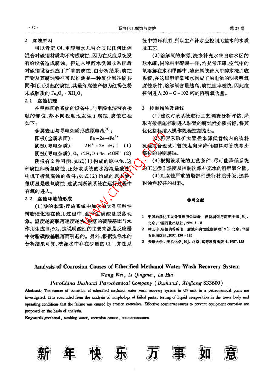 石油化專論Corrosion& Protection in Petrochemical Industry27(1)醚化甲醇水洗回收系統(tǒng)腐蝕原因分析王偉李慶梅呂慧(中國石油新疆獨山子石化公司新疆獨山子833600)摘要:對某石油化工廠碳四裝置醚化甲醇水洗回收系統(tǒng)的腐蝕原因進(jìn)行了調(diào)查,通過分析腐蝕失效件的腐蝕形貌特點,檢測塔體內(nèi)液體的組成,結(jié)合生產(chǎn)工藝條件初步認(rèn)為失效的原因是沖刷腐蝕。根據(jù)分析結(jié)果提出了相應(yīng)的設(shè)備防護(hù)對策關(guān)鍵詞:甲醇洗滌水腐蝕原因?qū)Σ咧袌D分類號:TQ00.9獻(xiàn)標(biāo)識碼A文章編號:005000某石化公司乙烯廠碳四裝置設(shè)計生產(chǎn)能力為圖2~6。30-C-103塔內(nèi)壁有明顯減薄,擋流板25Mta,1995年8月投人運行至今,由于甲醇水洗腐蝕穿孔;30-C-102塔內(nèi)壁附著大量紅褐色浮回收系統(tǒng)的管線和設(shè)備的腐蝕原因,造成裝置每年銹塔盤支撐件腐蝕脫落,液位計防護(hù)層腐蝕斷裂脫停工檢修,嚴(yán)重影響了裝置的穩(wěn)定生產(chǎn)。落;30-C-201進(jìn)料線在物料的長周期沖刷過程中腐蝕失效穿孔(,發(fā)生物料泄露;30-E-109再1裝置簡介及腐蝕現(xiàn)狀沸器殼層焊縫處有明顯的腐蝕坑和裂紋,其管束有1.1加工工藝位置大量腐蝕坑和穿孔現(xiàn)象,平均每兩年更換一次管碳四醚化裝置包括脫硫加氫、一段醚化反應(yīng)精芯。由于該系統(tǒng)嚴(yán)重腐蝕,造成該裝置多次非計劃餾、二段醚化反應(yīng)精餾、甲醇水洗回收系統(tǒng)和丁烯性停工檢修甚至影響到該裝置的安全生產(chǎn)。-1超級精餾部分。通過脫硫、加氫反應(yīng)和醚化反應(yīng),采用普通精餾及超級精餾的方法從煉油廠碳四及抽余碳四原料中獲得MTBE產(chǎn)品和高純度丁烯-1產(chǎn)品。副產(chǎn)品是含正丁烷、異丁烷的剩余碳四。裝置的腐蝕主要集中在甲醇水洗精餾塔回收系統(tǒng),介質(zhì)為水、甲醇;壓力為1.18MPa;溫度為40130℃;系統(tǒng)材質(zhì)為20號碳鋼。碳四醚化甲醇回收系統(tǒng)工藝流程見圖1。圖2大修時碳四30-C-103塔腐蝕情況甲醇去E102冷凝鈉料去Y0AE110P102A/B化學(xué)污水圖1碳四醚化甲醇回收系統(tǒng)工藝流程圖3大修時碳四30-C-102塔腐蝕情況1.2現(xiàn)場調(diào)查收稿日期:200-06-24;修稿日期:2009-11-16。大檢修過程中發(fā)現(xiàn)該系統(tǒng)中的塔體內(nèi)壁、再沸作者簡介:王偉(1982-),男畢業(yè)于重慶理工大學(xué)材料與工程學(xué)院,現(xiàn)今在中國石油新疆獨山子石化公司研究院防器管束塔部件及部分管線均存在嚴(yán)重的腐蝕見腐蝕研究中心主要從事防腐研究工作第1期王偉等.醚化甲醇水洗回收系統(tǒng)腐蝕原因分析51成腐蝕環(huán)境,由此可知管線外壁的腐蝕是由管線泄漏處滲出的含水物料引起的,即物料中存在腐蝕性介質(zhì)。0.605圖430-C-201進(jìn)料管線泄漏點外觀時間(年-月一日)圖7物料進(jìn)口腐蝕速率變化情況圖5E-109再沸器焊縫處腐蝕形貌時間(年-月一日圖8冷凝水pH值和Fe2·(Fe3·)變化情況表1保溫棉中含有的化學(xué)物質(zhì)分析Na NH. K Mg Ca CI- SO2- NO, F-aa812~0358L35680a531545-a0llE-109再沸器管束腐蝕形貌L.4.2洗滌水分析1.3腐蝕監(jiān)測界區(qū)的軟化水作為30-C-102塔的洗滌補(bǔ)在線腐蝕探針監(jiān)測發(fā)現(xiàn)碳四車間甲醇水洗回充水,在裝置內(nèi)循環(huán)使用,從30-C-102塔頂和收系統(tǒng)30-E-109腐蝕速率較高,月平均腐蝕速塔底分別取洗滌水樣做硫化物、pH值和氯離子分率高達(dá)0.421mm/a,嚴(yán)重超出該裝置的控制指標(biāo),析,結(jié)果見表2。表230-C-102塔洗滌水樣分析結(jié)果,%應(yīng)加強(qiáng)甲醇水洗-回收系統(tǒng)的運行監(jiān)控。醚化甲醇水洗回收系統(tǒng)的冷凝水中Fe2和Fe“隨pH值取樣部位硫化物PH值也存在大幅波動,應(yīng)注意pH值的平穩(wěn)操作,詳見8.68圖7,8。30-C-102塔頂1.4介質(zhì)分析30C-102塔底未檢出8.711.4.1保溫棉分析為了查找管線外部腐蝕原因,從裝置上取回保根據(jù)分析數(shù)據(jù),洗滌水中存在少量氯離子等腐溫棉,經(jīng)過處理后測定其含有的化學(xué)物質(zhì)如表1。蝕介質(zhì),同時30-C-201精餾塔的進(jìn)口物料中含根據(jù)以上分析結(jié)果判斷保溫棉中含有的腐蝕有15mg/kg左右的水(指標(biāo)為不大于20mg/kg的介質(zhì)不會直接對管線造成腐蝕,而且經(jīng)調(diào)查該管水)。物料里含有少量水和氯離子等腐蝕介質(zhì)會段保溫棉捆扎嚴(yán)實,不會有雨水等滲入保溫棉中形引起碳鋼設(shè)備及管線的腐蝕2。石油化工腐蝕與防護(hù)第27卷2腐蝕原因統(tǒng)中循環(huán)利用,所以生產(chǎn)補(bǔ)水應(yīng)控制無鹽水的水質(zhì)可以肯定C4、甲醇和水幾種介質(zhì)以任何比例及工藝?;旌蠈μ间摬馁|(zhì)均不構(gòu)成腐蝕,因為在反應(yīng)系統(tǒng)沒(2)溶解氧的來源:洗滌補(bǔ)充水來自軟水區(qū)的有給設(shè)備造成腐蝕。但進(jìn)人甲醇水洗回收系統(tǒng)后軟水罐,同原料甲醇罐一樣,均是常壓罐,空氣中的對碳鋼設(shè)備造成了嚴(yán)重的腐蝕,由分析結(jié)果、腐蝕氧溶解在水和甲醇中,隨進(jìn)料線進(jìn)入甲醇水洗回收產(chǎn)物及其腐蝕特征可以推測是一種氧化和沖刷共系統(tǒng),在這里溶解氧和水構(gòu)成了原電池的陰極吸氧同作用而引起的腐蝕,其最終腐蝕產(chǎn)物為紅褐色粉腐蝕條件溶解氧含量越高,腐蝕速率越快因此應(yīng)末或