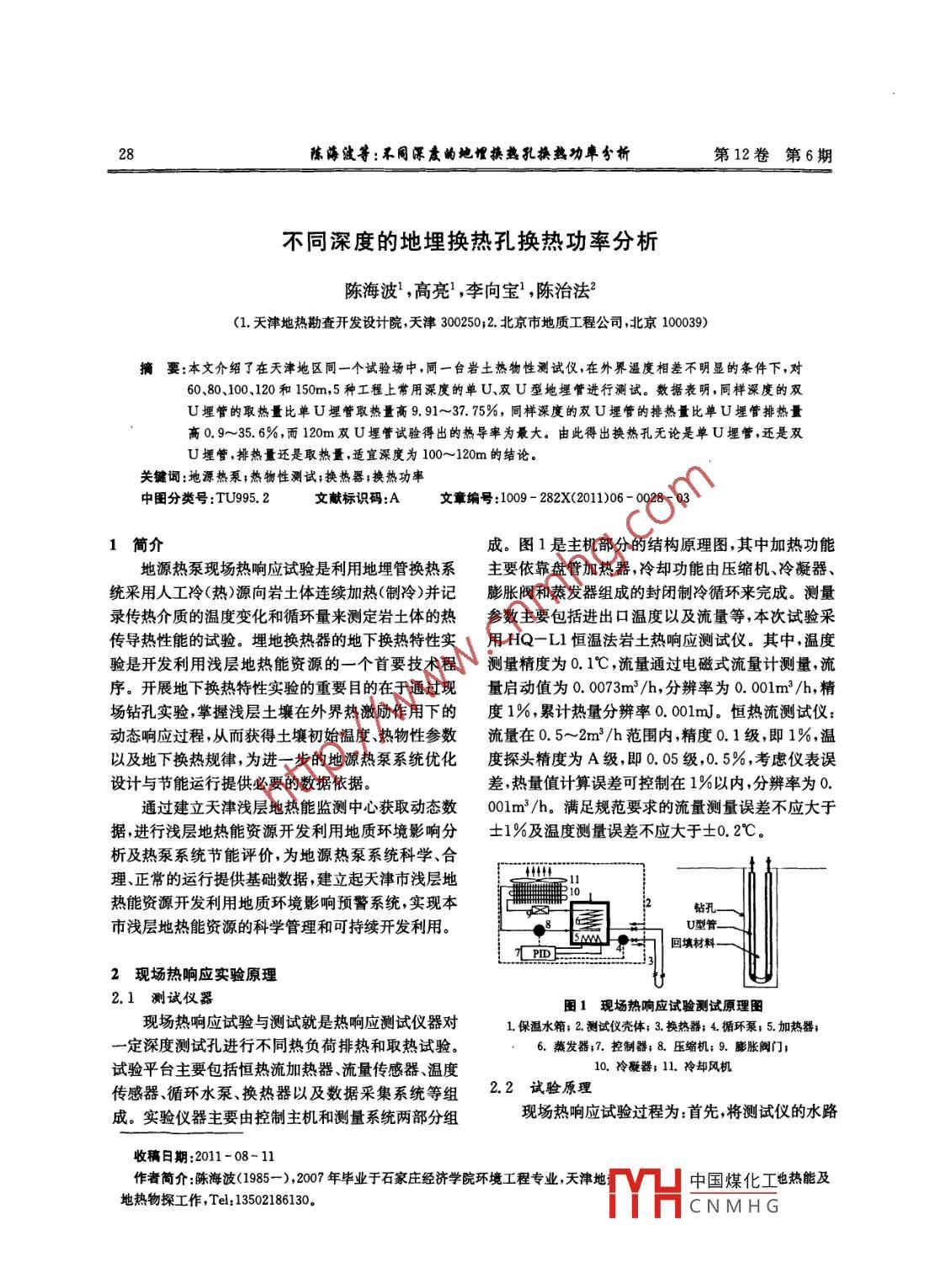 陳海波等:閹瀑威的她惟換熟孔換熟功卓勺析第12卷第6期不同深度的地埋換熱孔換熱功率分析陳海波,高亮,李向?qū)?,陳治法(1.天津地?zé)峥辈殚_發(fā)設(shè)計(jì)院,天津3002502.北京市地質(zhì)工程公司,北京100039)摘要:本文介紹了在天津地區(qū)同一個(gè)試驗(yàn)場(chǎng)中,同一臺(tái)巖土熱物性測(cè)試儀,在外界溫度相差不明顯的條件下,對(duì)60、80、100、120和150m,5種工程上常用深度的單U、雙U型地埋管進(jìn)行測(cè)試。數(shù)據(jù)表明,同樣深度的雙U埋管的取熱量比單U埋管取熱量高9.91~37.75%,同樣深度的雙U埋管的排熱量比單U埋管排熱量高0.9~35.6%而120m雙U埋管試驗(yàn)得出的熱導(dǎo)率為最大。由此得出換熱孔無論是單U埋管,還是雙U埋管,排熱量還是取熱量,適宜深度為100~120m的結(jié)論。關(guān)鍵詞:地源熱泵;熱物性測(cè)試;換熱器;換熱功率中圖分類號(hào):TU995.2文獻(xiàn)標(biāo)識(shí)碼:A文章編號(hào):1009-282X(2011)06-0028-031簡(jiǎn)介成。圖1是主機(jī)部分的結(jié)構(gòu)原理圖,其中加熱功能地源熱泵現(xiàn)場(chǎng)熱響應(yīng)試驗(yàn)是利用地埋管換熱系主要依靠盤管加熱器,冷卻功能由壓縮機(jī)、冷凝器統(tǒng)采用人工冷(熱)源向巖土體連續(xù)加熱(制冷)并記膨脹閥和蒸發(fā)器組成的封閉制冷循環(huán)來完成。測(cè)量錄傳熱介質(zhì)的溫度變化和循環(huán)量來測(cè)定巖土體的熱參數(shù)主要包括進(jìn)出口溫度以及流量等,本次試驗(yàn)采傳導(dǎo)熱性能的試驗(yàn)。埋地?fù)Q熱器的地下?lián)Q熱特性實(shí)用HQ一L1恒溫法巖土熱響應(yīng)測(cè)試儀。其中,溫度驗(yàn)是開發(fā)利用淺層地?zé)崮苜Y源的一個(gè)首要技術(shù)程測(cè)量精度為0.1℃,流量通過電磁式流量計(jì)測(cè)量,流序。開展地下?lián)Q熱特性實(shí)驗(yàn)的重要目的在于通過現(xiàn)量啟動(dòng)值為0.0073m3/h,分辨率為0.001m3/h,精場(chǎng)鉆孔實(shí)驗(yàn),掌握淺層土壤在外界熱激勵(lì)作用下的度1%累計(jì)熱量分辨率0.001mJ。恒熱流測(cè)試儀動(dòng)態(tài)響應(yīng)過程,從而獲得土壤初始溫度、熱物性參數(shù)流量在0.5~2m3/h范圍內(nèi),精度0.1級(jí),即1%,溫以及地下?lián)Q熱規(guī)律,為進(jìn)一步的地源熱泵系統(tǒng)優(yōu)化度探頭精度為A級(jí),即0.05級(jí),0.5%考慮儀表誤設(shè)計(jì)與節(jié)能運(yùn)行提供必要的數(shù)據(jù)依據(jù)。差熱量值計(jì)算誤差可控制在1%以內(nèi),分辨率為據(jù)進(jìn)行淺層地?zé)崮苜Y源開發(fā)利用地質(zhì)環(huán)境影響分±1%及溫度測(cè)量誤差不應(yīng)大于±2不應(yīng)大于通過建立天津淺層地?zé)崮鼙O(jiān)測(cè)中心獲取動(dòng)態(tài)數(shù)001m3/h。滿足規(guī)范要求的流量測(cè)量誤析及熱泵系統(tǒng)節(jié)能評(píng)價(jià),為地源熱泵系統(tǒng)科學(xué)、合理、正常的運(yùn)行提供基礎(chǔ)數(shù)據(jù),建立起天津市淺層地+熱能資源開發(fā)利用地質(zhì)環(huán)境影響預(yù)警系統(tǒng),實(shí)現(xiàn)本市淺層地?zé)崮苜Y源的科學(xué)管理和可持續(xù)開發(fā)利用。U型管[PID回填材料2現(xiàn)場(chǎng)熱響應(yīng)實(shí)驗(yàn)原理2.1測(cè)試儀器1現(xiàn)場(chǎng)熱響應(yīng)試驗(yàn)測(cè)試原理圖現(xiàn)場(chǎng)熱響應(yīng)試驗(yàn)與測(cè)試就是熱響應(yīng)測(cè)試儀器對(duì)1.保溫水箱;2測(cè)試儀殼體;3.換熱器;4.循環(huán)泵;5加熱器;定深度測(cè)試孔進(jìn)行不同熱負(fù)荷排熱和取熱試驗(yàn)6.蒸發(fā)器;7.控制器;8.壓縮機(jī);9.膨脹閥門試驗(yàn)平臺(tái)主要包括恒熱流加熱器、流量傳感器、溫度10.冷凝器;11.冷卻風(fēng)機(jī)傳感器、循環(huán)水泵換熱器以及數(shù)據(jù)采集系統(tǒng)等組22試驗(yàn)原理成。實(shí)驗(yàn)儀器主要由控制主機(jī)和測(cè)量系統(tǒng)兩部分組現(xiàn)場(chǎng)熱響應(yīng)試驗(yàn)過程為:首先,將測(cè)試儀的水路收稿日期:2011-08-11作者簡(jiǎn)介:陳海波(1985-),2007年畢業(yè)于石家莊經(jīng)濟(jì)學(xué)院環(huán)境工程專業(yè),天津地中國(guó)煤化工也熱能及地?zé)嵛锾焦ぷ?Tel:13502186130YHCNMH2011年12月地質(zhì)裴各循環(huán)部分與待測(cè)換熱器相連接,形成一個(gè)閉式環(huán)路;于24h然后,通過啟動(dòng)管道循環(huán)水泵,以驅(qū)動(dòng)環(huán)路流體開始(2)在獲取初始平均溫度后,開始對(duì)回路中的傳循環(huán)。待系統(tǒng)進(jìn)出口溫差為零時(shí),開始啟動(dòng)電加熱熱介質(zhì)加冷或熱負(fù)荷。測(cè)試過程中冷或熱負(fù)荷和流器來加熱環(huán)路中的流體。隨著換熱器進(jìn)口水溫的不量基本保持恒定(波動(dòng)范圍在士5%以內(nèi)),逐時(shí)記錄斷升高,其熱量通過管壁與土壤之間的傳熱過程逐回路中傳熱介質(zhì)的流量和進(jìn)出口溫度漸釋放到地下土壤中,同時(shí)使土壤溫度也逐漸升高(3)現(xiàn)場(chǎng)熱響應(yīng)試驗(yàn)時(shí),恒熱流排熱試驗(yàn):地埋最終管內(nèi)流體溫度和土壤溫度維持在一種動(dòng)態(tài)的熱管進(jìn)口溫度分別為20℃和35℃兩種工況的排熱試平衡狀態(tài)。然后,增大加熱功率,系統(tǒng)將重復(fù)上述傳驗(yàn),每個(gè)工況溫度恒定后,觀測(cè)時(shí)間不少于24h熱過程,直至達(dá)到新的平衡狀態(tài)。在整個(gè)流體加熱(4)每次加冷或熱負(fù)荷停止后,繼續(x