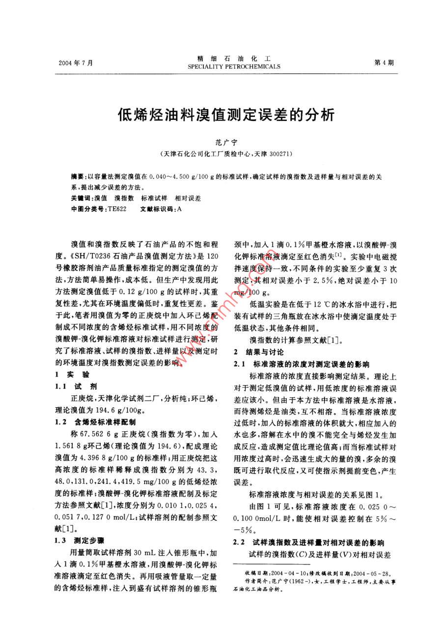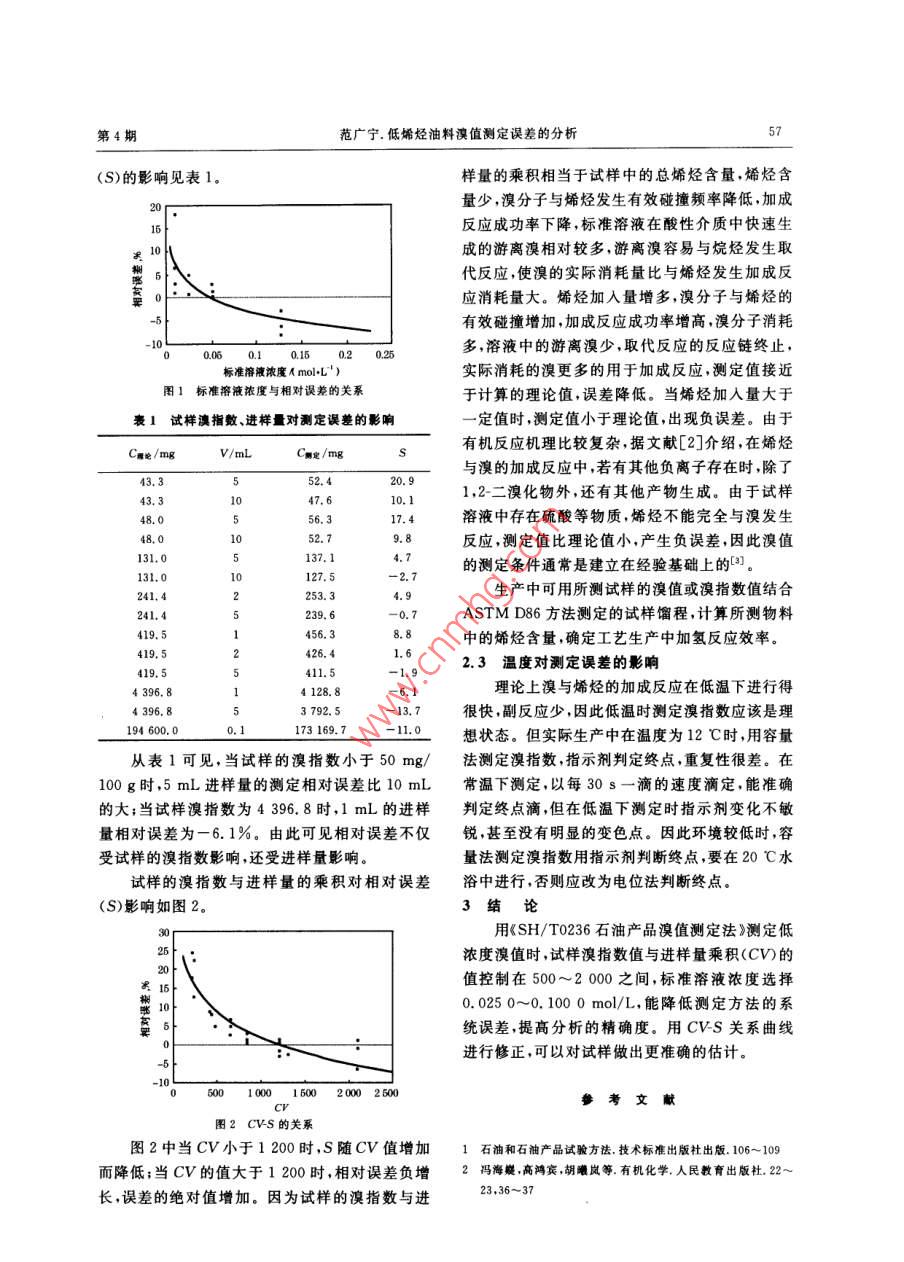 精細石油化工2004年7月第4期SPECIALITY PETROCHEMICALS低烯烴油料溴值測定誤差的分析范廣寧(天津石化公司化工廠質檢中心,天津300271)摘要:以容量法測定溴值在0. 040~4.500 g/100 g的標準試樣,確定試樣的溴指數(shù)及進樣量與相對誤差的關系,提出減少誤差的方法。關鍵詞:溴值溴指數(shù)標準試樣相對誤差中圈分類號:TE622文獻標識碼:A .溴值和溴指數(shù)反映了石油產(chǎn)品的不飽和程頸中,加入1滴0.1%甲基橙水溶液,以溴酸鉀-溴度?!禨H/T0236石油產(chǎn)品溴值測定方法》是120化鉀標準溶液滴定至紅色消失1。實驗中電磁攪號橡膠溶劑油產(chǎn)品質量標準指定的測定溴值的方拌速度保持一致,不同條件的實驗至少重復3次法,方法簡單易操作,成本低。但生產(chǎn)中發(fā)現(xiàn)用此測定,其相對誤差小于2. 5%,絕對誤差小于10 .方法測定溴值低于0.12 g/100 g的試樣時,其重mg/100 go .復性差,尤其在環(huán)境溫度偏低時,重復性更差。鑒低溫實驗是在低于12 C的冰水浴中進行,把于此,筆者用溴值為零的正庚烷中加入環(huán)己烯配裝有試樣的三角瓶放在冰水浴中使滴定溫度處于制成不同濃度的含烯烴標準試樣,用不同濃度的低溫狀態(tài),其他條件相同。溴酸鉀-溴化鉀標準溶液對標準試樣進行測定,研溴指數(shù)的計算參照文獻[1].究了標準溶液、試樣的溴指數(shù)、進樣量以及測定時2結果與討論的環(huán)境溫度對溴指數(shù)測定誤差的影響。2.1標準溶液的濃度對測定誤差的影響1實驗標準溶液的濃度直接影響測定結果。理論上.1.1試劑對于測定低溴值的試樣,用低濃度的標準溶液誤正庚烷,天津化學試劑二廠,分析純;環(huán)己烯,差應該小。但由于本方法中標準溶液是水溶液,理論溴值為194. 6 g/100g.而待測烯烴是油類,互不相溶。當標準溶液濃度1.2含烯烴標準樣配制過低時,加入的標準溶液的體積就大,相應加人的稱67.562 6 g正庚烷(溴指數(shù)為零),加入水也多,溶解在水中的溴不能完全與烯烴發(fā)生加1.561 8 g環(huán)己烯(理論溴值為194. 6),配成理論成反應,造成測定值比理論值高;而當標準試樣對溴值為4.3968g/100g的標準樣;用正庚烷把這用濃度過高時,會迅速生成大的量的溴,多余的溴高濃度的標準樣稀釋成溴指數(shù)分別為43. 3,既可進行取代反應,又可使指示劑提前變色,產(chǎn)生48. 0,131. 0,241.4,419. 5 mg/100 g的低烯烴濃誤差。度的標準樣;溴酸鉀溴化鉀標準溶液配制及標定標準溶液濃度與相對誤差的關系見圖1。方法參照文獻[1],濃度分別為0.0101,0. 0254,由圖1可見,標準溶液濃度在0. 025 0~ .0. 051 7,0. 127 0 mol/L;試樣溶劑的配制參照文0. 100 0mol/L時,能使相對誤差控制在5% ~獻[1]. .1.3 測定步驟2.2試樣澳指數(shù)及進樣對相對誤差的影響用量簡取試樣溶劑30mL注人錐形瓶中,加試樣的溴指數(shù)(C)及進樣量(V)對相對誤差人1滴0.1%甲基橙水溶液,用溴酸鉀-溴化鉀標準溶液滴定至紅色消失。再用吸液管量取一定量收稿日期:2004 -04- 10;修改稿收到日期:2004 -05 - 28.作者簡介:范廣寧(1962-),女,工程學士,工程師,主要從事的含烯烴標準樣,注人到盛有試樣溶劑的錐形瓶石油化工油品分析。第4期范廣寧.低烯烴油料溴值測定誤差的分析5(S)的影響見表1.樣量的乘積相當于試樣中的總烯烴含量,烯烴含量少,溴分子與烯烴發(fā)生有效碰撞頻率降低加成0.16反應成功率下降,標準溶液在酸性介質中快速生成的游離溴相對較多,游離溴容易與烷烴發(fā)生取代反應,使溴的實際消耗量比與烯烴發(fā)生加成反應消耗量大。烯烴加入量增多,溴分子與烯烴的有效碰撞增加,加成反應成功率增高,溴分子消耗-100.060.1 0. 150.2 0.25多,溶液中的游離溴少,取代反應的反應鏈終止,標準溶液濃魔A mol-L' )實際消耗的溴更多的用于加成反應,測定值接近圖1標準溶液濃度 與相對誤差的關系于計算的理論值,誤差降低。當烯烴加人量大于表1試樣澳指敷、進樣對測定誤差的影響-定值時,測定值小于理論值,出現(xiàn)負誤差。由于有機反應機理比較復雜,據(jù)文獻[2]介紹,在烯烴Cue/mgV/mLCm定/mg與溴的加成反應中,若有其他負離子存在時,除了43. 352. 420.91047.610.11,2-二溴化物外,還有其他產(chǎn)物生成。由于試樣48.056. 317.4溶液中存在硫酸等物質,烯烴不能完全與溴發(fā)生48. 0152. 79.8反應,測定值比理論值小,產(chǎn)生負誤差,因此溴值131.0的測定條件通常是建立在經(jīng)驗基礎上的[3]。127. 5-2.7241.42253. 34.9生產(chǎn)中可用所測試樣的溴值或溴指數(shù)值結合-0.7ASTMD86方法測定的試樣餾程,計算所測物料419.5456.38.8中的烯烴含量,確定工藝生產(chǎn)中加氫反應效率。419. 5426.41.62.3溫 度對測定誤差的影響411. 5-1.94 396.4 128.8-6.1理論上溴與烯烴的加成反應在低溫下進行得4 396. 83 792.5-13.7很快,副反應少,因此低溫時測定溴指數(shù)應該是理194 600. 0_0.173 169. 7- 11.0.想狀態(tài)。但實際生產(chǎn)中在溫度為12 C時,用容量從表1可見,當試樣的溴指數(shù)小于50 mg/法測定溴指 數(shù),指示劑判定終點,重復性很差。在100 g時,5 mL進樣量的測定相對誤差比10 mL常溫下測定,以每30s一滴的速度滴定,能準確.的大;當試樣溴指數(shù)為4396.8時,1 mL的進樣判定終點滴,但在低溫下測定時指示劑變化不敏量相對誤差為-6.1%。由此可見相對誤差不僅銳,甚至沒有明顯的變色點。因此環(huán)境較低時,容:受試樣的溴指數(shù)影響,還受進樣量影響。.量法測定溴指數(shù)用指示劑判
