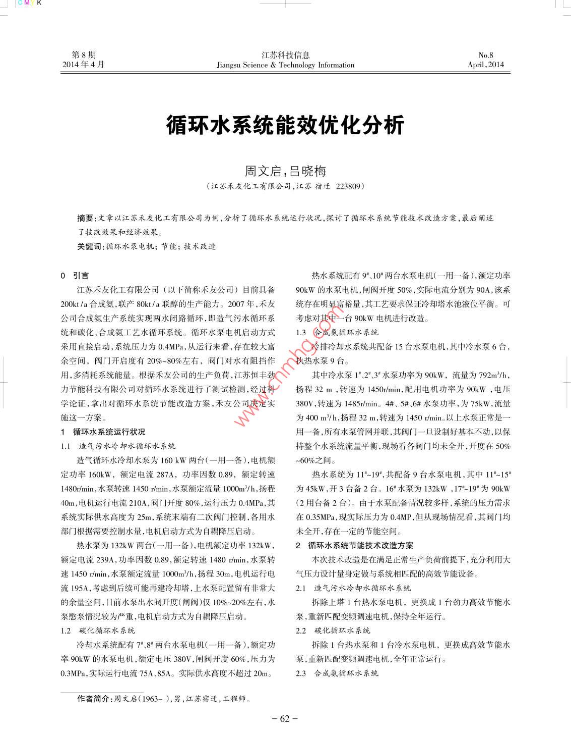第8期江蘇科技信息2014年4月Jiangsu Science & Technology InformationApril,2014循環(huán)水系統(tǒng)能效優(yōu)化分析周文啟,呂曉梅(江蘇禾友化工有限公司,江蘇宿遷223809)摘要:文章以江蘇禾友化工有限公司為例,分析了循環(huán)水系統(tǒng)運(yùn)行狀況,探討了循環(huán)水系統(tǒng)節(jié)能技術(shù)改造方案,最后闡述了技改效果和經(jīng)濟(jì)效果。關(guān)鍵詞:循環(huán)水泵電機(jī);節(jié)能;技術(shù)改造0引言熱水系統(tǒng)配有9*.10*兩臺(tái)水泵電機(jī)(一用一備),額定功率江蘇禾友化工有限公司(以下簡稱禾友公司)目前具備90kW的水泵電機(jī),閘閥開度50% ,實(shí)際電流分別為90A,該系200kt/a 合成氨,聯(lián)產(chǎn)80kt/a聯(lián)醇的生產(chǎn)能力。2007 年,禾友統(tǒng)存在明顯富裕量,其工藝要求保證冷卻塔水池液位平衡??晒竞铣砂鄙a(chǎn)系統(tǒng)實(shí)現(xiàn)兩水閉路循環(huán),即造氣污水循環(huán)系考慮對(duì)其中一臺(tái)90kW電機(jī)進(jìn)行改造。統(tǒng)和碳化、合成氨工藝水循環(huán)系統(tǒng)。循環(huán)水泵電機(jī)啟動(dòng)方式1.3合成氨循環(huán)水 系統(tǒng)采用直接啟動(dòng),系統(tǒng)壓力為0.4MPa,從運(yùn)行來看,存在較大富冷排冷卻水系統(tǒng)共配備15 臺(tái)水泵電機(jī),其中冷水泵6臺(tái), :余空間,閥門開啟度有20%-80%左右,閥門對(duì)水有阻擋作執(zhí)熱水泵9臺(tái)。用,多消耗系統(tǒng)能量。根據(jù)禾友公司的生產(chǎn)負(fù)荷,江蘇恒豐勁其中冷水泵1.2* .3*水泵功率為90kW,流量為792m2/h, .力節(jié)能科技有限公司對(duì)循環(huán)水系統(tǒng)進(jìn)行了測試檢測,經(jīng)過科揚(yáng)程32 m ,轉(zhuǎn)速為1450r/min,配用電機(jī)功率為90kW ,電壓學(xué)論證,拿出對(duì)循環(huán)水系統(tǒng)節(jié)能改造方案,禾友公司決定實(shí)380V ,轉(zhuǎn)速為1485r/min。 4#、 5# .6#水泵功率,為75kW ,流量施這一方案。為400 m/h,揚(yáng)程32 m,轉(zhuǎn)速為1450 r/mine以上水泵正常是一1 循環(huán)水系統(tǒng)運(yùn)行狀況用一備,所有水泵管網(wǎng)并聯(lián),其閥門- -旦設(shè)制好基本不動(dòng),以保1.1 造氣污水冷卻水循環(huán)水系統(tǒng)持整個(gè)水系統(tǒng)流量平衡,現(xiàn)場看各閥門均未全開,開度在50%造氣循環(huán)水冷卻水泵為160kW兩臺(tái)(-一用- - 備),電機(jī)額-60%之間。定功率160kW,額定電流287A,功率因數(shù)0.89,額定轉(zhuǎn)速熱水系統(tǒng)為11*~19*,共配備9臺(tái)水泵電機(jī),其中11*-15*1480r/min, 水泵轉(zhuǎn)速1450 r/min,水泵額定流量000m2/h,揚(yáng)程為45kW,開3臺(tái)備2臺(tái)。16* 水泵為132kW ,17*~19* 為90kW40m,電機(jī)運(yùn)行電流210A,閥門開度80%,運(yùn)行壓力0.4MPa,其(2用臺(tái)備2臺(tái))。由于水泵配備情況較多樣,系統(tǒng)的壓力需求系統(tǒng)實(shí)際供水高度為25m,系統(tǒng)末端有二次閥門控制,各用水在0.35MPa,現(xiàn)實(shí)際壓力為0.4MP,但從現(xiàn)場情況看,其閥門均部門根據(jù)需要控制水量,電機(jī)啟動(dòng)方式為自耦降壓啟動(dòng)。未全開,存在一一定的節(jié)能空間。熱水泵為132kW兩臺(tái)(一用- -備),電機(jī)額定功率132kW,2循環(huán)水 系統(tǒng)節(jié)能技術(shù)改造方案額定電流239A,功率因數(shù)0.89,額定轉(zhuǎn)速1480 r/min,水泵轉(zhuǎn)本次技術(shù)改造是在滿足正常生產(chǎn)負(fù)荷前提下,充分利用大速1450 r/min,水泵額定流量1000m?/h,揚(yáng)程30m,電機(jī)運(yùn)行電氣壓力設(shè)計(jì)量身定做與系統(tǒng)相匹配的高效節(jié)能設(shè)備。流195A,考慮到后續(xù)可能再建冷卻塔,上水泵配置留有非常大2.1造氣污水冷卻水循環(huán)水系統(tǒng)的余量空間,目前水泵出水閥開度(閘閥)僅10% -20%左右,水拆除上塔1臺(tái)熱水泵電機(jī),更換成1臺(tái)勁力高效節(jié)能水泵憋泵情況較為嚴(yán)重,電機(jī)啟動(dòng)方式為自耦降壓啟動(dòng)。泵,重新匹配變頻調(diào)速電機(jī),保持全年運(yùn)行。1.2碳化循環(huán)水 系統(tǒng)2.2碳化循環(huán)水系統(tǒng)冷卻水系統(tǒng)配有7° .8*兩臺(tái)水泵電機(jī)(一用一備 ),額定功拆除1臺(tái)熱水泵和1臺(tái)冷水泵電機(jī),更換成高效節(jié)能水率90kW的水泵電機(jī),額定電壓380V,閘閥開度60% ,壓力為泵,重新匹配變頻調(diào)速電機(jī),全年正常運(yùn)行。0.3MPa,實(shí)際運(yùn)行電流75A、85A。實(shí)際供水高度不超過20m。2.3合成氨循環(huán)水系統(tǒng)作者簡介:周文啟(1963- ),男,江蘇宿遷,工程師。-62-第8期2014年4月.江蘇科技信息.技術(shù)探討April,2014表1技改前、后各 臺(tái)循環(huán)水泵電耗名稱系統(tǒng)名稱能源單耗運(yùn)行時(shí)間.數(shù)值0*: 130.17冷排冷卻水系統(tǒng)1*:96.88 .3*:89.31改造前耗能16*:100.49改造前總量(kW.h)136474452冷排熱水水系統(tǒng)17*:85.3218*:126.71碳化冷卻水系統(tǒng)10*:64.46造氣熱水上塔系統(tǒng)老泵:1134*:55.982246.75*:24.03645.022*:36.82 .1865.3916*:42.602235.54本期耗能本期57571217*:41.422246.0618*:42.342244.09*:37.272211.95新泵:612拆除2*.4*.5*水泵換成高效節(jié)能水泵,重新匹配變頻調(diào)速4經(jīng)濟(jì)效果電機(jī),保持全年運(yùn)行。表1中所測數(shù)據(jù)本期為2013年5月7日至2013年8月拆除16*.17*.18* 水泵,更換成高效節(jié)能水泵,重新匹配變13日,總計(jì)天數(shù)99天,于改造前同期相比,節(jié)能量為頻調(diào)速電機(jī),保證全年運(yùn)行。789032
