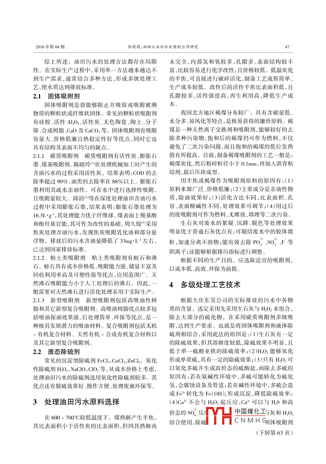 化學(xué)工程師Sum 247 No. 04Chemical Engineer2016年第04期D0I: 10.16247/j.cnki.23-1171/q.20160446宗油田工業(yè)污水處理的應(yīng)用研究述孫莉莉(大慶油田化工有限公司東昊公司表活劑廠,黑龍江大慶163000)摘要:石油行業(yè)產(chǎn)生的油田污水具有量大污染嚴(yán)重難處理等特點(diǎn),而傳統(tǒng)的油田污水處理劑效果不是特別理想。根據(jù)大慶油田實(shí)際排放的污水中各物質(zhì)的含量,選定采用先采用生石灰與HO2組合,除去大部分的硫化物,再采用碳質(zhì)吸附劑多級(jí)吸附,達(dá)到生產(chǎn)要求。關(guān)鍵詞:油田污水;吸附劑;多級(jí)工藝中圖分類號(hào):TE992.2;TE132.1文獻(xiàn)標(biāo)識(shí)碼:AResearch progress of oilfield wastewater treatmentSUN Li-li(Donghao Co. , Ld, Daqing Oilfield, Daqing 163000,China)Abstract :The olfeldl sewage is large amount, heavy polluted and unworkable. The traditional treatment is notefficient. According to the content of each substance in the sewage, calcium oxide and H2O2 combination wasadopted to renove sulfur and multi-stage adsorption by carbon absorbent. The results meet the requirements.Key words:oilfield sewage ; adsorbent;multi-stage absorption目前,中國(guó)絕大多數(shù)油田開采已進(jìn)人中后期,而采出油的含水量--般在70%左右,甚至部分油田的2油田污水的處理技術(shù)含水量達(dá)到90%以上。國(guó)內(nèi)全部油田的污水日處理量非常巨大,若將不經(jīng)處理的含油污水直接排放,油田污水的處理技術(shù)包括物理法、化學(xué)法、物會(huì)造成水源及土壤等的污染,且會(huì)增加火災(zāi)隱患,理化學(xué)法和生物法。物理法利用重力分離、粗?;?、給居民造成生命威脅和國(guó)家的經(jīng)濟(jì)損失。所以對(duì)采離心分離、過濾分離、膜分離等方法.21,主要除去油油廢水進(jìn)行有效處理(或用于回注),在滿足油田開田污水中的油類和固體懸浮物等?;瘜W(xué)法利用絮凝采過程中注水量要求的同時(shí),也可減輕對(duì)環(huán)境的污法和化學(xué)轉(zhuǎn)化法除去油田污水中的部分膠體和溶染,即為油田帶來(lái)經(jīng)濟(jì)效益,又有利于油田的發(fā)展,解性物質(zhì)(其他幾種方法不能處理的),特別是乳化油處理效果顯著。油田污水的物理化學(xué)法包括吸附達(dá)到一-舉兩得、事半功倍的作用。法和氣浮法。1處理油田污水的意義.吸附法利用油田污水中的溶解性物質(zhì)在多孔固體吸附劑表面上進(jìn)行吸附。因此,吸附劑即吸附大慶油田化工有限公司東昊公司表活劑廠的過程的基礎(chǔ),可決定吸附效果的好壞。且吸附法可采油污水中主要包括鹽類、硫化物、懸浮物、原油、作為離子交換、膜分離等的預(yù)處理,也可以作為深有害氣體、有機(jī)物、微生物及泥沙等成分,其中硫化度的處理手段。吸附法進(jìn)行水處理的優(yōu)點(diǎn)有很多,物不僅會(huì)腐蝕設(shè)備和管道,造成設(shè)備的損耗和維即適用范圍廣、回收利用率高、處理效果好等優(yōu)點(diǎn)。修,且惡化水質(zhì)。因此,處理不達(dá)標(biāo)的含油污水己阻因各地油田含油污水處理工藝和經(jīng)濟(jì)性要求存在礙油田可持續(xù)發(fā)展的因素,所以,如何根據(jù)具體情差異,可以針對(duì)實(shí)際情況選用相應(yīng)的吸附劑?;钚詻r采用最佳工藝處理含油污水,已成為石油領(lǐng)域需炭為常用吸附劑,它不僅對(duì)溶解油的吸附效果好,要攻克的課題之- -。且能有效地吸附污水中的其它有機(jī)物,但吸附容量局限在30~80mg"g'、成本價(jià)格高、回收率利用率低,這些均限制了活性炭的應(yīng)用。收稿日期:2016-01-05生物法即中國(guó)煤化工?;z體狀作者簡(jiǎn)介:孫莉莉( 1982-),女,黑龍江省大慶市人,技術(shù)員, 2006年的有機(jī)污染物CNMH質(zhì),凈化污畢業(yè)于沈陽(yáng)工業(yè)大學(xué),過程裝備與控制工程專業(yè),本科,主要從事化工設(shè)備管理工作。K。2016年第04期孫莉莉:油田工業(yè)污水處理的應(yīng)用研究47綜上所述,油田污水的處理方法都存在局限未完全,內(nèi)部氫和氧較多,孔隙多、表面結(jié)構(gòu)較豐性。在實(shí)際生產(chǎn)過程中,采用單一方法越來(lái)越達(dá)不富,比較容易進(jìn)行化學(xué)改性,且價(jià)格較低。低溫炭化到生產(chǎn)需求,通常結(jié)合多種方法,形成多級(jí)處理工的半焦,可直接進(jìn)行破碎活化,制備工藝流程簡(jiǎn)單,藝,使水質(zhì)達(dá)到排放標(biāo)準(zhǔn)。生產(chǎn)成本較低。改性后的活性半焦比表面積低,且2.1 固體吸附劑孔隙較多,活性強(qiáng)度高,再生利用高,降低生產(chǎn)成固體吸附劑是指能夠阻止并吸留或吸附被測(cè)本。物質(zhì)的顆粒狀或纖維狀固體。常見的顆粒狀吸附劑我國(guó)北方地區(qū)褐煤分布較廣,具有含碳量低、有硅膠活性AL203、 活性炭、無(wú)色陶瓷陶土、分子水分多、易風(fēng)化等特點(diǎn),是極易獲得的廉價(jià)原料。褐篩合成樹脂、CaO及CaCO3等。固體吸附劑有吸附煤是一-種天然離子交換劑和吸附劑,能夠較好的去容量大、價(jià)格低廉且熱穩(wěn)定性好等優(yōu)點(diǎn),同時(shí)它也除多種污染物,飽和后的褐煤仍可作為燃料,不僅具有結(jié)構(gòu)及表面不均勻的缺點(diǎn)。避免了二次污染問題,而且飽和的褐煤的低位發(fā)熱2.1.1碳質(zhì)吸附劑碳質(zhì)吸附劑有活性炭、膨脹石值有所提高。目前,制備褐煤吸附劑的工藝