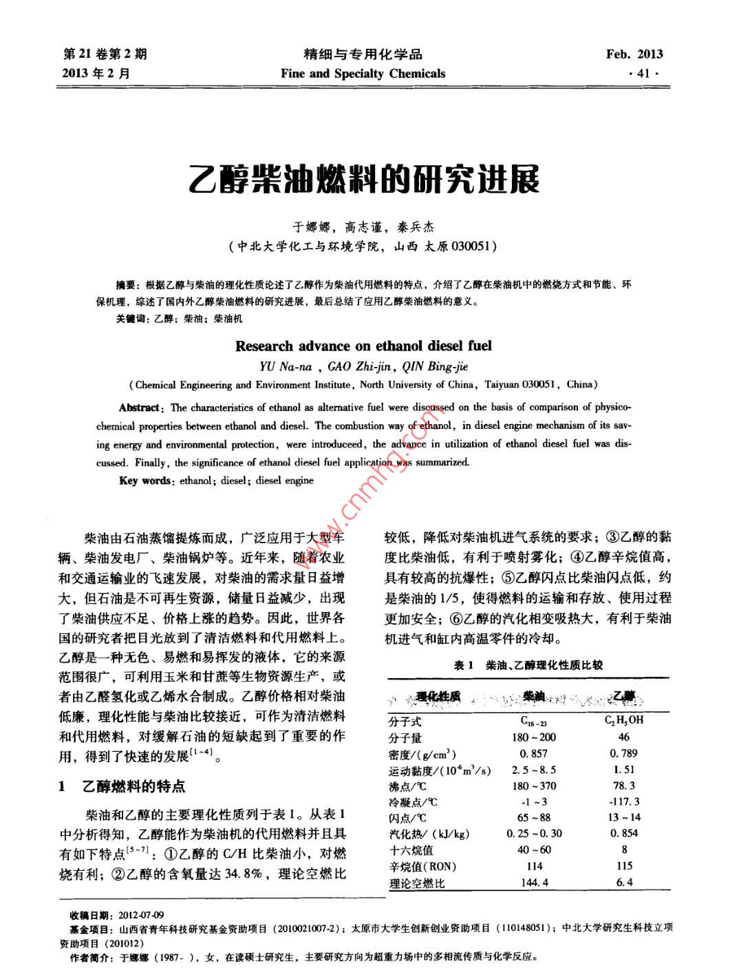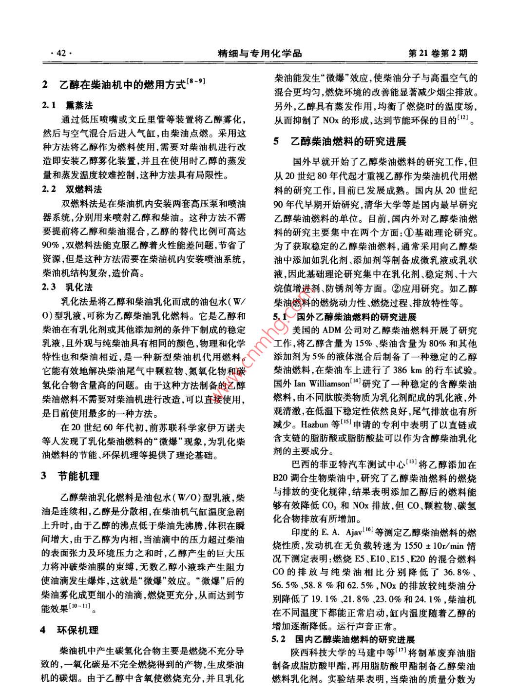 第21卷第2期精細與專用化學品Feb.20132013年2月 Fine and Specialty Chemicals41乙醇柴油燃料的研究進展于娜娜,高志謹,秦兵杰(中北大學化工與環(huán)境學院,山西太原030051)摘要:根據(jù)乙醇與柴油的理化性質(zhì)論述了乙醇作為柴油代用燃料的特點,介紹了乙醇在柴油機中的燃燒方式和節(jié)能、環(huán)保機理,綜述了國內(nèi)外乙醇柴油燃料的研究進展,最后總結(jié)了應用乙醇柴油燃料的意義。關(guān)鍵詞:乙醇;柴油;柴油機 Research advance on ethanol diesel fuel YU Na-na GAO Zhi-jin, QIN Bing-jie (Chemical Engineering and Environment Institute, North University of China, Taiyuan 030051, China) Abstract: The characteristics of ethanol as alternative fuel were discussed on the basis of comparison of physico- chemical properties between ethanol and diesel. The combustion way of ethanol, in diesel engine mechanism of its sav ing energy and environmental protection, were introduceed, the advance in utilization of ethanol diesel fuel was dis cussed. Finally, the significance of ethanol diesel fuel application was Key words: ethanol; diesel; diesel engine柴油由石油蒸餾提煉而成,廣泛應用于大型車較低,降低對柴油機進氣系統(tǒng)的要求;③乙醇的黏輛、柴油發(fā)電廠、柴油鍋爐等。近年來,隨著農(nóng)業(yè)度比柴油低,有利于噴射霧化;④乙醇辛烷值高,和交通運輸業(yè)的飛速發(fā)展,對柴油的需求量日益增具有較高的抗爆性;⑤乙醇閃點比柴油閃點低,約大,但石油是不可再生資源,儲量日益減少,出現(xiàn)是柴油的1/5,使得燃料的運輸和存放、使用過程了柴油供應不足、價格上漲的趨勢。因此,世界各更加安全;⑥乙醇的汽化相變吸熱大,有利于柴油國的研究者把目光放到了清潔燃料和代用燃料上。機進氣和缸內(nèi)高溫零件的冷卻。乙醇是一種無色、易燃和易揮發(fā)的液體,它的來源表1柴油、乙醇理化性質(zhì)比較范圍很廣,可利用玉米和甘蔗等生物資源生產(chǎn),或者由乙醛氫化或乙烯水合制成。乙醇價格相對柴油理化性質(zhì)柴油舒費低廉,理化性能與柴油比較接近,可作為清潔燃料分子式 C2H,OH和代用燃料,對緩解石油的短缺起到了重要的作分子量 C1s-23180~20046用,得到了快速的發(fā)展41。密度/(g/cm3)0.8570.789運動黏度/(10m3/s)2.5~8.51.511乙醇燃料的特點沸點/℃180~37078.3冷凝點/℃-1~3-117.3柴油和乙醇的主要理化性質(zhì)列于表1。從表1閃點/℃65~8813~14中分析得知,乙醇能作為柴油機的代用燃料并且具汽化熱/(kJ/kg)0.25~0.300.854有如下特點5-7:①乙醇的C/H比柴油小,對燃十六烷值40~608燒有利;②乙醇的含氧量達34.8%,理論空燃比辛烷值(RON)114115理論空燃比144.46.4收稿日期:2012-07-09基金項目:山西省青年科技研究基金資助項目(201001007-2);太原市大學生創(chuàng)新創(chuàng)業(yè)資助項目(1101480);中北大學研究生科技立項資助項目(201012)作者簡介:于娜娜(1987-),女,在讀碩士研究生,主要研究方向為超重力場中的多相流傳質(zhì)與化學反應。42精細與專用化學品第21卷第2期2乙醇在柴油機中的燃用方式8-9柴油能發(fā)生“微爆”效應,使柴油分子與高溫空氣的混合更均勻,燃燒環(huán)境的改善能顯著減少煙塵排放。2.1熏蒸法另外,乙醇具有蒸發(fā)作用,均衡了燃燒時的溫度場,通過低壓噴嘴或文丘里管等裝置將乙醇霧化,從而抑制了NOx的形成,達到節(jié)能環(huán)保的目的12然后與空氣混合后進入氣缸,由柴油點燃。采用這種方法將乙醇作為燃料使用,需要對柴油機進行改5乙醇柴油燃料的研究進展造即安裝乙醇霧化裝置,并且在使用時乙醇的蒸發(fā)國外早就開始了乙醇柴油燃料的研究工作,但量和蒸發(fā)溫度較難控制,這種方法具有局限性。從20世紀80年代起才重視乙醇作為柴油機代用燃2.2雙燃料法料的研究工作,目前已發(fā)展成熟。國內(nèi)從20世紀雙燃料法是在柴油機內(nèi)安裝兩套高壓泵和噴油90年代早期開始研究,清華大學等是國內(nèi)最早研究器系統(tǒng),分別用來噴射乙醇和柴油。這種方法不需乙醇柴油燃料的單位。目前國內(nèi)外對乙醇柴油燃要提前將乙醇和柴油混合,乙醇的替代比例可高達料的研究主要集中在兩個方面:①基礎理論研究。90%,雙燃料法能克服乙醇著火性能差問題節(jié)省了為了獲取穩(wěn)定的乙醇柴油燃料,通常采用向乙醇柴資源但是這種方法需要在柴油機內(nèi)安裝噴油系統(tǒng),油中添加如乳化劑、添加劑等制備成微乳液或乳狀柴油機結(jié)構(gòu)復雜,造價高。液,因此基礎理論研究集中在乳化劑、穩(wěn)定劑、十六2.3乳化法烷值增進劑、防銹劑等方面。②應用研究。如乙醇乳化法是將乙醇和柴油乳化而成的油包水(W/柴油燃料的燃燒動力性、燃燒過程、排放特性等。0)型乳液可稱為乙醇柴油乳化燃料。它是乙醇和5.1國外乙醇柴油燃料的研究進展柴油在有乳化劑或其他添加劑的條件下制成的穩(wěn)定美國的ADM公司對乙醇柴油燃料開展了研究乳液,且外觀與純柴油具有相同的顏色,物理和化學工作,將乙醇含量為15%、柴油含量為80%和其他特性也和柴油相近,是一種新型柴油機代用燃料。添加劑為5%的液體混合后制備了一種穩(wěn)定的乙醇它能有效地解決柴油尾氣中顆粒物氮氧化物和碳柴油燃料,在柴油車上進行了386km的行車試驗。氫化合物含量高的問題。由于這種方法制備的乙醇國外 Ian Williamson研究了一種穩(wěn)定的含醇柴油柴油燃料不需要對柴油機進行改造,可以直