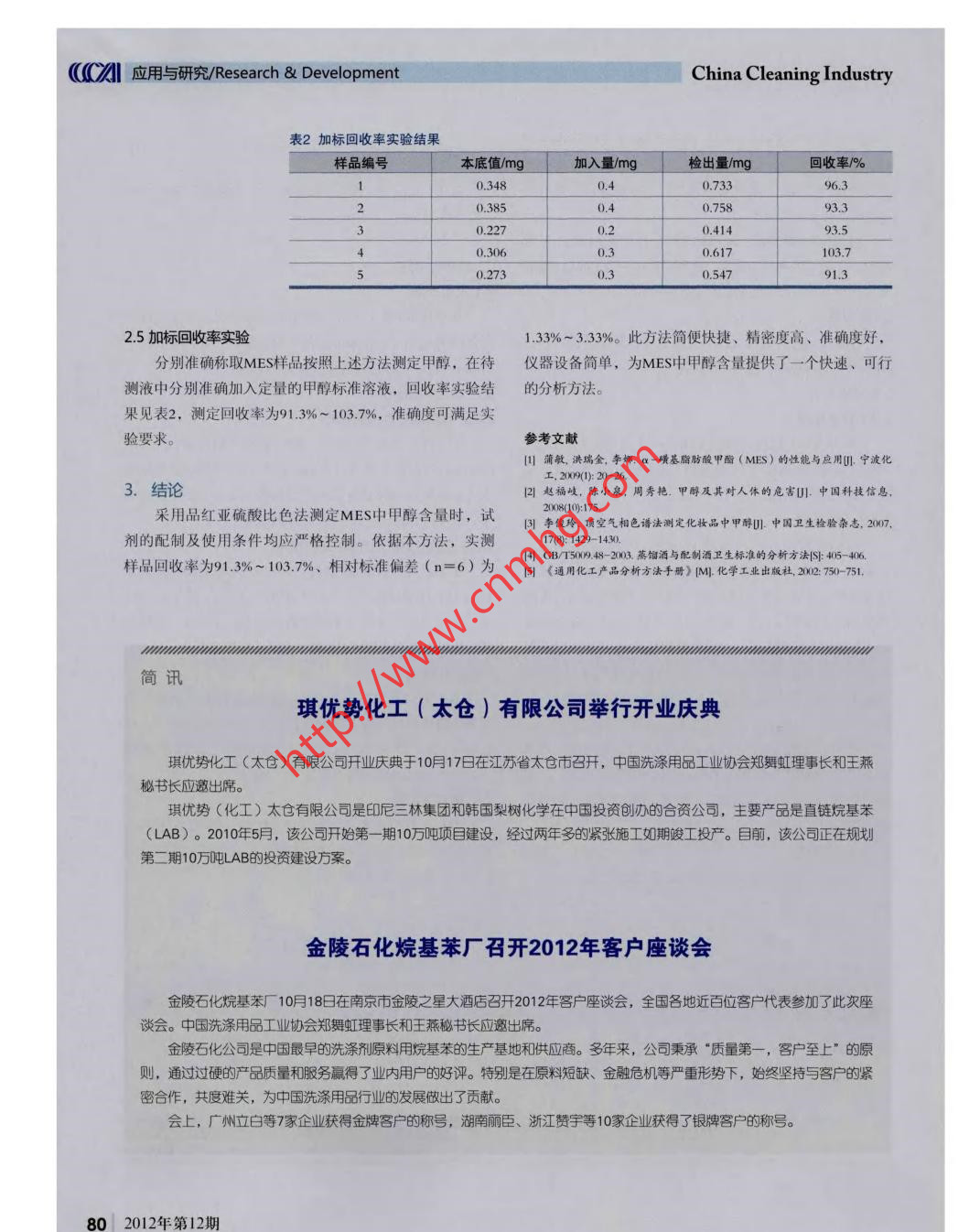((CA應(yīng)用與研究/Research & DevelopmentChina Cleaning IndustryMES中甲醇含量的測(cè)定方法閆希變(南風(fēng)化工集團(tuán)技術(shù)中心,山西運(yùn)城044000 )[摘要]建立了一種品紅亞硫酸比色法測(cè)定MES中甲醇含量的方法。甲醇在酸性條件下被高錳酸鉀氧化成甲醛,甲醛與品紅亞硫酸作用生成藍(lán)紫色化合物,根據(jù)顏色深淺與標(biāo)準(zhǔn)系列比較達(dá)到測(cè)定MES中甲醇含量的目的。經(jīng)多次實(shí)驗(yàn)證明甲醇含量在0~ 1.0mg/ 15mL范圍內(nèi)吸光度呈現(xiàn)良好的線性關(guān)系。線性回歸方程y=0.2037x- -0.02833,相關(guān)系數(shù)γ=0.9986此法快速、準(zhǔn)確、靈敏度高。實(shí)測(cè)樣品中甲醇的回收率為91.3%~ 103.7%、相對(duì)標(biāo)準(zhǔn)偏差(n=6)為1.33%~ 3.33%。[關(guān)鍵詞] MES;甲醇;品紅業(yè)硫酸比色法脂肪酸甲脂磺酸鹽( MES )是采用天然可再生資源原高, 為測(cè)定MES中甲醇含量提供了一一種科學(xué)的手段。料椰子油、棕櫚油等油脂,經(jīng)酯交換、磺化及中和等工序后得到的一種性能優(yōu)異的表面活性劑。因其具有優(yōu)良的鈣1. 實(shí)驗(yàn)部分皂分散能力、低刺激性和良好的生物降解性等優(yōu)異性能,1.1實(shí)驗(yàn)原理因而受到廣泛關(guān)注。甲醇在磷酸溶液中被高錳酸鉀氧化成甲醛,其過量的在MES的生產(chǎn)工藝中,酯化反應(yīng)階段及降低副產(chǎn)物二高錳酸鉀用草酸還原。然后加入品紅亞硫酸,使之與甲醛鈉鹽"含量都要加入甲醇。甲醇是一種 易燃易爆的化學(xué)品,起顯色反應(yīng)。從其呈現(xiàn)顏色的深淺與標(biāo)準(zhǔn)比較,比色測(cè)定對(duì)人體有很大的危害,可使視神經(jīng)系統(tǒng)視網(wǎng)膜發(fā)生病變,試樣中甲醇的含量。過量吸入會(huì)使人失明,甲醇還能使人體造成嚴(yán)重性中毒四。1.2試劑與儀器因此,MES中甲醇的檢測(cè)顯得尤為重要。1.2.1 試劑目前,對(duì)于MES中甲醇含量的測(cè)定沒有國(guó)家標(biāo)準(zhǔn)。經(jīng)(1)高錳酸鉀一磷酸溶液:稱取高錳酸鉀3.0g、85%磷查詢相關(guān)資料,測(cè)定甲醇的主要檢測(cè)方法有分光光度法和酸15mL, 于70mL蒸餾水中充分溶解后,加蒸餾水定容至氣相色譜法"。其中,氣相色譜法需要配置頂空進(jìn)樣器,儀100mL,貯于棕色瓶?jī)?nèi)保存待用。器昂貴,不適合于實(shí)驗(yàn)室的普遍使用。甲醇的分光光度法(2) 草酸-硫酸溶液:稱取無水草酸5g,溶于冷的硫酸測(cè)定有品紅亞硫酸比色法"和變色酸比色法可供選擇,但(1+1)中,倒入100mL容量瓶中,用硫酸(1+1)稀釋由于體系影響變色酸比色法顯色隨濃度變化不明顯,所以至刻度,搖勻。選用品紅亞硫酸比色法測(cè)定取得了滿意的效果。該方法采用(3)品紅業(yè)硫酸溶液:稱取堿性品紅0.1g研細(xì)后,加常用儀器設(shè)備,操作簡(jiǎn)便、重現(xiàn)性好、線性范圍寬及靈敏度80C熱蒸 餾水60mL,迅速攪拌,溶解后放冷,逐漸加入78 | 2012年 第12期December, 2012Research & Development/應(yīng)用與研究(CA100g/L亞硫酸鈉水溶液10mL,濃鹽酸1mL,加蒸餾水配成m,X(%) = mx 100 5/100x 1001)100mL,充分混勻,放置過夜。如溶液有顏色,可加少量活性炭攪拌后過濾,貯于棕色瓶中,置暗處保存。溶液呈式中: m,一從工作曲線上查得甲醇的質(zhì)量,mg; m-紅色時(shí)應(yīng)棄去重新配制。試樣稱取量,go(4)標(biāo)準(zhǔn)甲醇溶液:準(zhǔn)確稱取甲醇.000g于100mnL容量瓶中,加蒸餾水稀釋至刻度,臨用時(shí)精確吸取10mL,用蒸2. 結(jié)果與討論餾水稀釋至100mL,此溶液濃度為1mg/mLo2.1吸收光譜1.2.2儀器按分析步驟1.3.2配制溶液繪制其吸收光譜,在吸收波25mL具塞比色管; 721分光光度計(jì);蒸餾裝置一-套;長(zhǎng)范圍為500nm ~ 650nm掃描。結(jié)果表明,最大吸收位于ml、10mL移液管; 100mL容量瓶。590nm所以選擇最佳測(cè)試波長(zhǎng)為590nm。1.3實(shí)驗(yàn)方法2.2顯色劑的配制1.3.1 樣品處理2.2.1酸度對(duì)顯色劑的影響準(zhǔn)確稱取0.5g試樣(稱準(zhǔn)至0002)于蒸餾瓶中,加蒸餾配制品紅業(yè)硫酸試劑時(shí),酸度必須嚴(yán)格控制,加入的水40mL溶解后加熱蒸餾,收集鎦液于100mL容量瓶中并用水定酸是ImL濃鹽酸。酸度過高或過低對(duì)品紅亞硫酸試劑影響容至刻度,搖勻備用。很大,酸度過高時(shí)顯色劑本身顏色不易褪去,干擾測(cè)定結(jié)1.3.2分析方法果;酸度過低時(shí)顯色淺、靈敏度降低。精確吸取甲醇標(biāo)準(zhǔn)溶液0、0.2、0.4、0.6、0.8、2.2.2亞硫酸鈉試劑對(duì)顯色劑的影響1.0mL,分別置于25mL比色管中,加蒸餾水至5mL,將上配制品紅亞硫酸試劑時(shí),加入100g/L亞硫酸鈉水溶液述各試管加高錳酸鉀-磷酸2mL,混勻,放置10min,再加10mL和1mL濃鹽酸后,可加適量活性炭過濾至無色。如果草酸-硫酸溶液2mL,待褪色并冷卻后加品紅業(yè)硫酸溶液顏色無法褪去,可能是亞硫酸鈉濃度不足或失效;如果顏5mL,加塞、搖勻,于20~ 25%C靜置30min,用2cm比色皿色很快退去說明亞硫酸鈉過量,顯色會(huì)受影響。于590nm處以空白調(diào)節(jié)零點(diǎn),比色測(cè)定其吸光值。以標(biāo)準(zhǔn)2.3工作曲線溶液中甲醇含量為橫坐標(biāo),相應(yīng)的吸光度值為縱坐標(biāo),繪取不同濃度的甲醇標(biāo)準(zhǔn)溶液于比色管中,依據(jù)實(shí)驗(yàn)制工作曲線。選擇的最佳條件繪制工作曲線,從多組實(shí)驗(yàn)數(shù)據(jù)得知,甲準(zhǔn)確移取樣品( 1.3.1 ) 5mL置于25mL比色管中,然