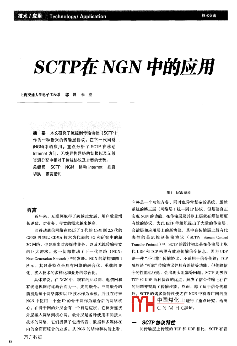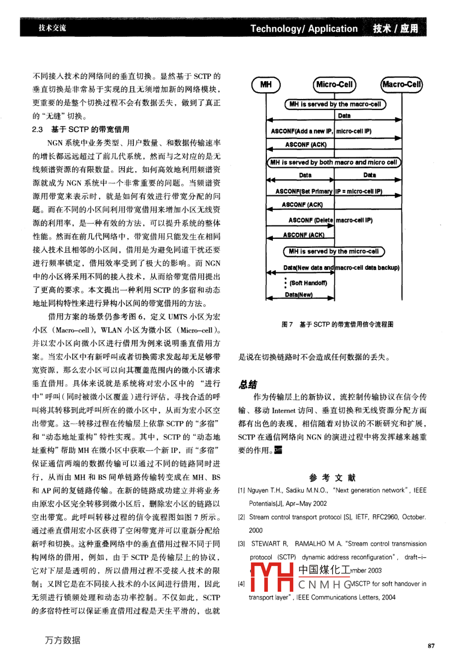 技術/應用 Technology/ Application技術交流SCTP在NGN中的應用上海交通大學電子工程系郭強朱杰摘要本文研究了流控制傳輸協(xié)議(SCTP)作為一種新興的傳輸層協(xié)議,在下一代網絡(NGN)中的應用。重點分析了SCTP在移動nternet訪問、無線異構網絡的切換以及無線資源分配中相對于傳統(tǒng)協(xié)議及方案的優(yōu)勢。關鍵詞 SCTP NGN移動 Internet垂直切換帶寬借用圖1NGN結構它將是一個功能齊備、同時也異常復雜的系統(tǒng)。雖然引言系統(tǒng)的第三層(網絡層)統(tǒng)一到IP協(xié)議,但是要真正近年來,互聯(lián)網取得了跨越式發(fā)展、用戶數(shù)量增實現(xiàn)NGN的功能,在傳輸層及其以上層就必須使用更長迅猛,對業(yè)務、帶寬的需求越來越高。有效的協(xié)議。為此IETF等組織提出了大量的傳輸層而移動通信網絡在經歷了2代的GSM到25代的會話層和應用層上的新協(xié)議,其中在傳輸層上最有代GPRS再到以CDMA技術為代表的3G和研究中的超表性的是流控制傳輸協(xié)議(SCTP: Stream Control3G網絡,也顯現(xiàn)出對多媒體業(yè)務、以及無線傳輸帶寬 Transfer protocol)a。SCTP的設計初衷是在傳輸層上取的巨大需求。這一切都推動了下一代網絡(NGN:代UDP和TCP來更有效地傳輸信令信息。因為UDPNext Generation Network)發(fā)展。NGN的結構如圖1是一種“不可靠”傳輸協(xié)議,不適用于信令傳輸;TCP所示,其顯著特點是具有網絡的融合化、承載的IP雖然是“可靠”傳輸協(xié)議并具有差錯等功能,但傳輸信化、接人技術的多樣化和業(yè)務的綜合化。令的性能也很低,會出現(xiàn)頭阻塞等問題。SCTP則吸收具體來說,在NCN中,現(xiàn)有的互聯(lián)網、電信網和TCP和UDP兩種協(xié)議的優(yōu)點,解決了信令傳輸上存在有線電視網將逐漸合而為一、走向融合。三網融合的的問題并提高了傳輸性能。然而,除了適于信令傳輸前提是每個網絡都要以P技術作為承載,并且在將來外,SCTP的諸多新特性使之在NGN中有著廣闊的應NGN中使用一個全P的骨干網作為融合后的網絡核中國煤化工進行了重點研究,給出心。在骨干網的外層會有一個自適應層,它負責連接CNMHG驗證。外層接入網絡到核心網。最外層是各種使用不同接人技術的網絡,它們提供了包括話音、數(shù)據(jù)和多媒體在SCTP協(xié)議特性內的全面而綜合的業(yè)務。從NGN的結構和功能上看同傳輸層上傳統(tǒng)的TCP和UDP相比,SCTP有著技術交流Technology/ Application技術/應用以下顯著特性(1)面向消息的傳輸:SCTP中,兩個節(jié)點間建立的連移動客戶端服務器端接被稱為“關聯(lián)( Association)”。傳統(tǒng)的TCP是流導向的協(xié)應用層應用層議,即被傳輸?shù)臄?shù)據(jù)都被看作是連續(xù)的字節(jié)流而不是按消(HTTP、FTP①④①息來劃分。但SCTP卻是完全以消息導向的,數(shù)據(jù)會按不同的消息分別遞交給上層。(2)多宿( Multi- homing)特性:如圖2所示,SCTP支SCTP持一個主機擁有兩個或兩個以上的P地址。主機利用SCTP協(xié)議傳送數(shù)據(jù)包給目的地址時,若此IP地址不可剛絡層網絡層達,SCTP可將包重新路由給另一個可達的IP地址。并且鏈路層路層物理層物理層傳輸過程中當一個地址所在的連接出現(xiàn)錯誤時,可以將數(shù)據(jù)傳輸轉移到另一PP地址所在的鏈路上,提供了非常有效的鏈路失敗保護措施,可容忍網絡級差錯。圖3SCTP的多流特性因此會導致頭阻塞現(xiàn)象;而SCTP則可分別獨立地遞交給鏈路1:衛(wèi)星鏈路應用層屬于不同流的片斷并保留流內序列號接收器(6) Heartbeat機制:SCTP采用專門的 Heartbeat消息來監(jiān)控鏈路或關聯(lián)的有效性,極大地提高了網絡差錯探測SCTP關聯(lián)性能多宿主機(7)動態(tài)地址重構叫:動態(tài)地址重構功能是賦予已存在的SCTP關聯(lián)可以動態(tài)地增加、減少和更改通信節(jié)點所交黃抓2,以太網鏈路具有的IP地址并且不會干擾正在進行的數(shù)據(jù)傳輸。這特性對于主機移動的情況具有重要意義。圖2ScTP的多宿特性二SCTP在NGN中的擴展應用(3)多流( Multi- streaming)特性:流的概念在TCP中sCTP的上述新特性使之在有效傳輸信令之外還可以指一連串字節(jié),在SCTP中則是指發(fā)送到上層的一系列用戶在“移動 Internet”、“異構網垂直切換”和“異構小區(qū)信道消息。用戶在建立SCTP關聯(lián)時,可以指定此關聯(lián)使用的流借用”等NGN的關鍵領域發(fā)揮重要作用的數(shù)目。如圖3,SCTP關聯(lián)中發(fā)送的每個消息都會被分配21基于SCTP的移動 Internet訪問·個流序號。在接收端,SCTP可以保證某特定流中和消息移動 Internet的業(yè)務主要有網頁瀏覽、收發(fā)電子郵件按順序向上層遞交。多流最大的特點是,當一個流在傳輸過和傳輸文件。常用的是HTTP和FTP等應用層協(xié)議,目前程中被阻塞時,其他流則不受影響地繼續(xù)發(fā)送。在傳輸層主要采用TCP協(xié)議來保證可靠傳輸。SCTP也是(4)強制SACK:sCTP繼承使用了TCP中的那些得到面向連接的,同樣可以保證傳輸?shù)目煽啃?。不僅如此充分驗證的擁塞控制技術,如慢啟動和擁塞避免。同時也SCTP的多流、多宿和面向消息的特性使其應用于移動In提出了新的特性,特別是強制SACK快速重傳。SACK可 ternet傳輸層時,可以提供更小的時延、更快的重傳和更以加速錯誤檢測并提高帶寬的使用。在TCP中,SACK是好的鏈路保障??蛇x項,而在SCTP中是強制的,這樣當