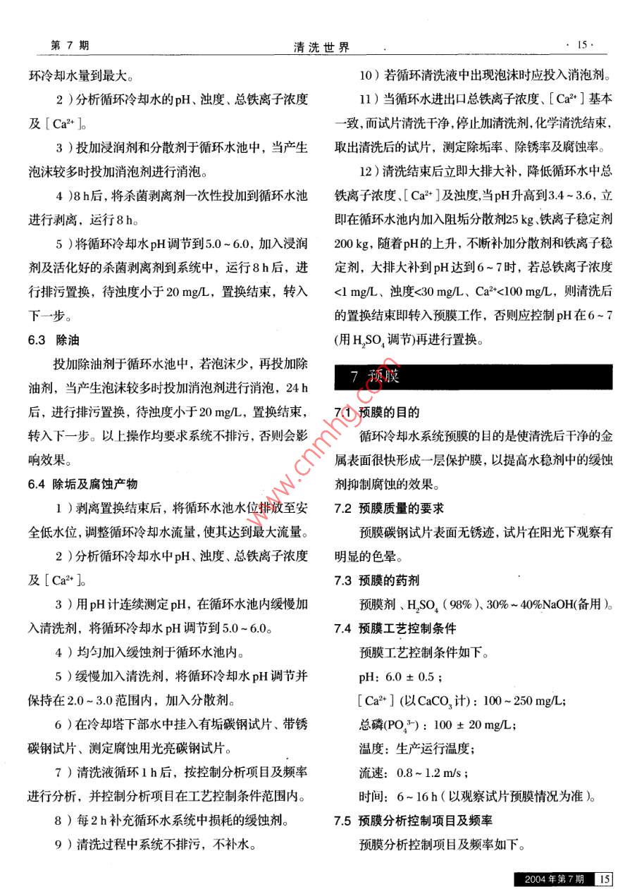 第20卷第7期1、2004年7月實(shí)思鼓術(shù)循環(huán)水系統(tǒng)不停車化清洗官偉(江津市禾豐化工有限責(zé)任公司,重慶026摘要以江津禾豐化工公司合成氨裝置循環(huán)水系統(tǒng)的清洗為例,按照原化工部標(biāo)準(zhǔn)HGT2387—92《工業(yè)設(shè)備化學(xué)清洗質(zhì)量標(biāo)準(zhǔn)》,敘述了循環(huán)水系統(tǒng)不停車清洗的操作方法和步驟關(guān)鍵詞循環(huán)水系統(tǒng)清洗不停車?yán)鋮s水中圖分類號(hào)TQ058·4文獻(xiàn)標(biāo)識(shí)碼BChemical cleaning for circulating water system on operationGUAN Wei(Jiangjin Hefeng Chemical Co, Ltd, Jiangjin, Chongqing 402260)Abstract The cleaning for circulating water system of a synthetic amomium plant in Jiangjin HefengChemical Co., as an example, a method and steps of chemical cleaning for circulating water systemwithout stopping operation were described. This method meets the standard HG/T 2387--92, TheStandard for Chemical Cleaning Requirements, issued by Ministry of Chemical IndustKey words circulating water system; cleaning; on operation; cooling water隨著科學(xué)技術(shù)的進(jìn)步,化學(xué)清洗技術(shù)得到了迅速環(huán)水系統(tǒng)嚴(yán)重受污染。大部分換熱器、管線都存在著發(fā)展,特別是近年來大型化工裝置的化學(xué)清洗技術(shù)也浮銹和銹瘤,嚴(yán)重制約了公司生產(chǎn)。為了保證工藝高趨于成熟。但是,不同的系統(tǒng)有其不同的特點(diǎn),循環(huán)負(fù)荷長(zhǎng)周期的安全運(yùn)行,對(duì)該系統(tǒng)進(jìn)行一次不停車化水系統(tǒng)的化學(xué)清洗通??煞譃橄到y(tǒng)開車前的化學(xué)清洗學(xué)清洗。清洗時(shí)執(zhí)行化工部標(biāo)準(zhǔn)HG/2387-92《工和運(yùn)行過程的化學(xué)清洗,其目的都是為了清除系統(tǒng)中業(yè)設(shè)備化學(xué)清洗質(zhì)量標(biāo)準(zhǔn)》的結(jié)垢物、腐蝕產(chǎn)物、生物黏泥,提高換熱器的換熱效率,保證循環(huán)水系統(tǒng)的安全、穩(wěn)定運(yùn)行「清洗的目的江津禾豐化工公司合成氨循環(huán)水系統(tǒng)自1998年該系統(tǒng)保有水量500m3,循環(huán)水量2000m}h,設(shè)開車以來,從未經(jīng)過化學(xué)清洗,長(zhǎng)時(shí)間運(yùn)行后,系統(tǒng)備材質(zhì)為碳鋼。對(duì)循環(huán)冷卻水系統(tǒng)進(jìn)行化學(xué)清洗,以出現(xiàn)了比較嚴(yán)重的污垢沉積現(xiàn)象;加之,有三臺(tái)油冷除去設(shè)備及管網(wǎng)在運(yùn)行中產(chǎn)生的水垢、鐵銹及生物黏卻器泄漏,向循環(huán)水系統(tǒng)漏入了1.5t68“機(jī)械油,循泥,為預(yù)膜處理提供清潔的表面。收稿日期:2004-05-14作者簡(jiǎn)介:官偉(1974-),男,重慶江津人,學(xué)士,工程師,從事尿素、合成氨生產(chǎn)、技術(shù)改造和管理工作。204年第7期「13清洗世界第20卷清洗的步驟5清洗分析項(xiàng)目及頻率殺菌剝離、除油→置換→除垢及腐蝕產(chǎn)物→5,1殺菌剝離置換。殺菌剝離工藝項(xiàng)目分析頻率如下化學(xué)清洗質(zhì)量的要求pH:每4h分析一次;總鐵離子濃度:每4h分析一次化學(xué)清洗除銹效率應(yīng)達(dá)到90%以上(以監(jiān)測(cè)管或濁度:每4h分析一次;掛片測(cè)定);清洗除垢效率應(yīng)達(dá)到95%以上(以監(jiān)測(cè)管[Ca2](以CaCO3計(jì):首、末各分析一次?;驋炱瑴y(cè)定)。試片的平均腐蝕率按《工業(yè)設(shè)備化學(xué)52除油清洗質(zhì)量標(biāo)準(zhǔn)》(HG/T2387-92)要求,碳鋼應(yīng)小于除油工藝項(xiàng)目分析頻率如下6g/(m2h)pH:每4h分析一次;化學(xué)清洗工藝控制的條件總鐵離子濃度:每4h分析一次;濁度:每4h分析一次。4.1殺菌剝離53除垢及腐蝕產(chǎn)物殺菌剝離控制的工藝條件如下除垢及腐蝕產(chǎn)物工藝項(xiàng)目分析頻率如下:浸潤(rùn)劑濃度:50~100mg/L;pH:連續(xù)測(cè)定;分散劑濃度:50~100mg/L;總鐵離子濃度:每2h分析一次殺菌剝離劑濃度:200mg/;濁度:每4h分析一次時(shí)間:8~16h;[Ca2](以caCO2計(jì)):每4h分析一次。殺菌滅藻劑濃度:100~200mg/L;溫度:運(yùn)行溫度清洗操作流速:0.8~1.2m/61準(zhǔn)備工作4.2除油1)對(duì)循環(huán)水系統(tǒng)加藥裝置、排污閥門、補(bǔ)充水閥除油的工藝條件如下門、在線pH儀表、流量計(jì)等逐一確認(rèn),使其能滿足清除油劑濃度:50mg/L;洗時(shí)加藥、排污和補(bǔ)水需要,若不能滿足,應(yīng)采取臨溫度:運(yùn)行溫度時(shí)措施。流速:08~12m/s;2)成立在線清洗小組協(xié)調(diào)解決清洗過程出現(xiàn)的時(shí)間:8~16h各種問題,對(duì)清洗中須特別關(guān)注的部位,要定時(shí)、定4.3除垢及腐蝕產(chǎn)物員觀察,發(fā)生意外情況應(yīng)有解決措施和材料準(zhǔn)備。除垢及腐蝕產(chǎn)物的工藝條件如下:3)將化學(xué)清洗及預(yù)膜所需藥品運(yùn)到現(xiàn)場(chǎng),調(diào)試好pH:2.0~3.0;加藥裝置,按要求作好監(jiān)測(cè)試片和分析準(zhǔn)備,在清洗溫度:運(yùn)行溫度;前一天呈待命工作狀態(tài)流速:0.8~1.2m/s;62殺菌剝離時(shí)間:10-24h1)將循環(huán)水池水位排放到安全低水位,調(diào)節(jié)循第7期清洗世界環(huán)冷卻水量到最大。10)若循環(huán)清洗液中出現(xiàn)泡沫時(shí)應(yīng)投入消泡劑。2)分析循環(huán)冷卻水的pH、濁度、總鐵離子濃度1)當(dāng)循環(huán)水進(jìn)出口總鐵離子濃度、[Ca2]基本及[Ca2+l致,而試片清洗干凈,停止加清洗劑,化學(xué)清洗結(jié)束,3)投加浸潤(rùn)劑和分散劑于循環(huá