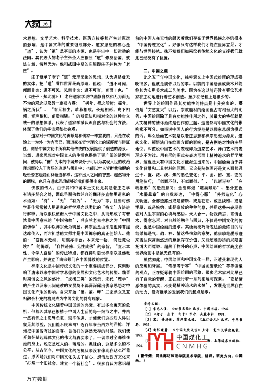 MiSIER 75指服裝色彩的明度、純度變化、在流行色明度、純度高低之科學(xué)技術(shù)的進(jìn)步對(duì)服裝色彩的流行有很大的影響,二十間轉(zhuǎn)化的過程中,必然會(huì)出現(xiàn)服裝色彩向中明度、中純度的世紀(jì)以來,人類社會(huì)每一重大科技進(jìn)步都為服裝流行色的變過渡,以此來作為服裝色彩的動(dòng)平衡?;厔?shì)帶來重要的促進(jìn)作用。上世紀(jì)60年代,航天科學(xué)高速發(fā)展,美國(guó)阿波羅號(hào)衛(wèi)星發(fā)射成功,太空色服裝、太空服三、影響服裝流行色變化的因素飾、太空?qǐng)D案成為當(dāng)時(shí)服裝流行色主導(dǎo)趨勢(shì)。70年代由于工服裝流行色的出現(xiàn)是社會(huì)物質(zhì)文明和精神文明高度發(fā)展業(yè)污染和自然生態(tài)的破壞,受到回歸自然和生態(tài)學(xué)理念的思的標(biāo)志和客觀反映。從長(zhǎng)期服裝流行色的變化來研究,服裝潮影響,為了表達(dá)人類回歸自然地統(tǒng)一和和諧意愿,追求大色彩反映了這個(gè)時(shí)期和區(qū)域的社會(huì)文化屬性。服裝色彩設(shè)計(jì)自然恬靜之美,服裝色彩的流行趨勢(shì)是湖藍(lán)色、海洋色和森作為一種社會(huì)文化現(xiàn)象,不斷會(huì)受到新思潮、新觀念、新流林色。上世紀(jì)80年代,受到全球金融風(fēng)暴的影響,全國(guó)均不派、新文化運(yùn)動(dòng)的不斷沖擊,使服裝色彩的流行趨勢(shì)也應(yīng)順同程度地受到經(jīng)濟(jì)下滑的沖擊,當(dāng)時(shí)服裝色彩的流行色為黑時(shí)代的潮流在不斷發(fā)生變化,正如法國(guó)經(jīng)濟(jì)學(xué)家杰·波德里色。新千禧年是科學(xué)經(jīng)濟(jì)高速發(fā)展的年代,服裝色彩的流行亞所說的那樣:“在現(xiàn)代社會(huì)中,消費(fèi)已不僅僅停留在單純色是科幻和太空時(shí)代色彩。的購(gòu)買意義上,它已經(jīng)逐漸成為一種社會(huì)文化象征?!狈b對(duì)服裝色彩短期的流行變化趨勢(shì)的分析、必須深入研究流行色的社會(huì)價(jià)值也只能在社會(huì)的經(jīng)濟(jì)基礎(chǔ)、物質(zhì)文化需求當(dāng)前的事物和各種流行文化對(duì)服裝色彩流行的影響,通過當(dāng)與生產(chǎn)力發(fā)展相對(duì)的基礎(chǔ)上才能充分體現(xiàn)出來,所以,在經(jīng)季的服裝色彩、面料、款式等素材與消費(fèi)者進(jìn)行交流以便確濟(jì)發(fā)達(dá)國(guó)家比發(fā)展中國(guó)家和經(jīng)濟(jì)滯后地區(qū)更能體現(xiàn)服裝流行定下一季的服裝色彩,為時(shí)尚提供新的流行色色的流行和變化。以人為本的服裝色彩,體現(xiàn)了現(xiàn)代人的覺醒,隨著時(shí)代參考文獻(xiàn)的發(fā)展,現(xiàn)代生活方式的多樣化,服裝審美的內(nèi)涵也在不斷[1][美]凱晏[美]加蚋著,白敬艷等譯,《美國(guó)成衣設(shè)計(jì)與市場(chǎng)營(yíng)銷完全教程》,上海人民美術(shù)出版社.2009變化為服裝色彩的個(gè)性化和多元化創(chuàng)造了前提條件。服裝色[2]黃元慶等編著,《服裝色彩學(xué)》,中國(guó)紡織出版社彩的流行周期在不斷縮短,服裝色彩三五年的流行周期已不2010多見,以一個(gè)銷售季為主的服裝流行色流行趨勢(shì)預(yù)測(cè)成為國(guó)[3][蕘]黛安[英]卡斯迪編著,李莉婷等譯,《色彩預(yù)服裝業(yè)服裝色彩設(shè)計(jì)的主流,使其許多流行款式通過變換測(cè)與凰菜流行》,中國(guó)織出社20色彩、面料和其他細(xì)節(jié)等增加一些新的創(chuàng)意而重獲市場(chǎng),從(潘曙:西安美術(shù)學(xué)院,講師。研究方向:服飾而延長(zhǎng)了流行周期。中國(guó)“文”“畫”隨想曹傳熠摘要:本文主要論述了中國(guó)文化中儒、釋、道以及中《易經(jīng)》從卜筮之書,進(jìn)入到人文文化的范圍,并散為諸子國(guó)繪畫的梗概和他們之間的聯(lián)系。認(rèn)為中國(guó)傳統(tǒng)文化(包括百家學(xué)術(shù)思想的源泉。(這里的《易經(jīng)》專指《周易》繪畫)在世界文化中是高級(jí)的,不應(yīng)放棄,而應(yīng)繼承發(fā)揚(yáng)。上古伏羲以來至周朝的易學(xué)思想分為三個(gè)系統(tǒng)《連山易》關(guān)鍵詞:中國(guó)人易經(jīng)儒家道家道中國(guó)的佛學(xué)六組《歸藏易》,《周易》)。儒家思想的主體便是由孔子刪中國(guó)繪畫中得心源外師造化《詩》《書》,訂《禮》《樂》,編注六經(jīng)贅述《周易》,直追周代的人文精神,其后通過曾子、子思、孟子、荀子的中國(guó)之文補(bǔ)充而趨于完整的。自漢武伊始,儒家思想獨(dú)尊天下,至今中國(guó)文化源遠(yuǎn)流長(zhǎng),祖先給我們后人留下的五千年來已有兩于年之久。其所倡導(dǎo)的“仁、義、禮、智、信、恕、所積累的龐大珍貴的文化遺產(chǎn),不僅是中國(guó)人引以立世的瑰忠、孝、悌”的觀念,不僅是中華民族的傳統(tǒng)美德,而且對(duì)寶,也是東亞文化的主流和源泉。依賴這些深厚博大的文化全人類來講,都將具有永恒的價(jià)值為后盾,中華民族雖歷經(jīng)數(shù)次滄桑巨變,但“中國(guó)人”的內(nèi)儒家“游文于六經(jīng)之中,留意于仁義之際”,以“正名涵較之其他如“埃及人”與“巴比倫人”來說就更具有原始的方式去建立一個(gè)秩序良好的理想社會(huì)的理念,由此而揭發(fā)出的意義。也就是說“中國(guó)人”在基因上雖絕非完全是“炎黃的誠(chéng)意中