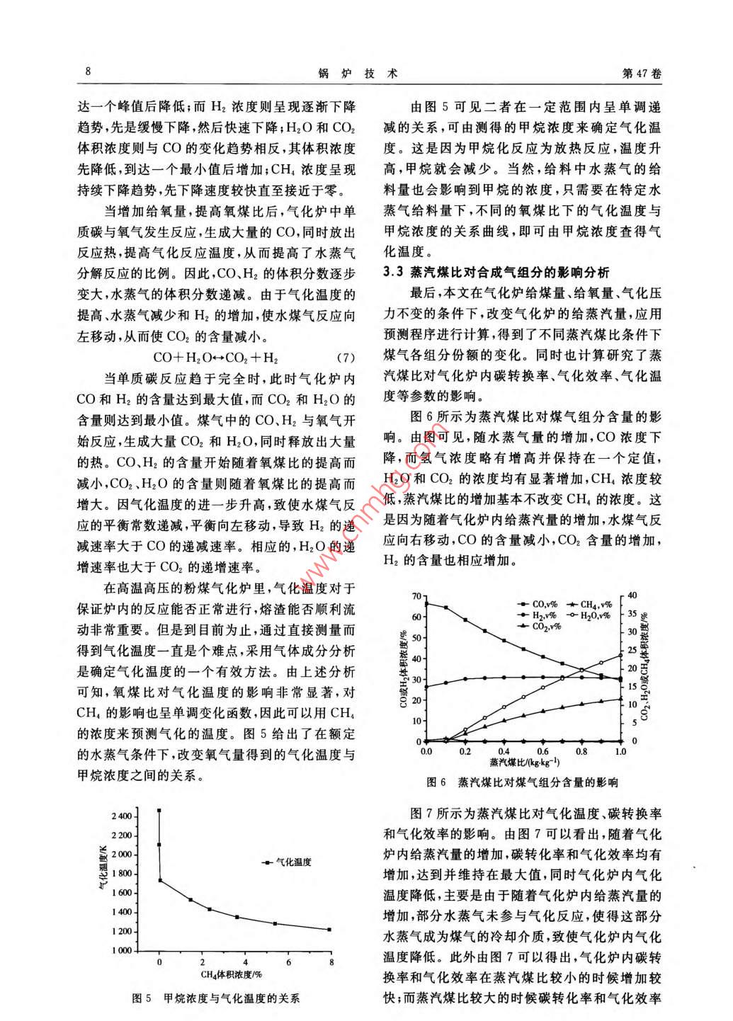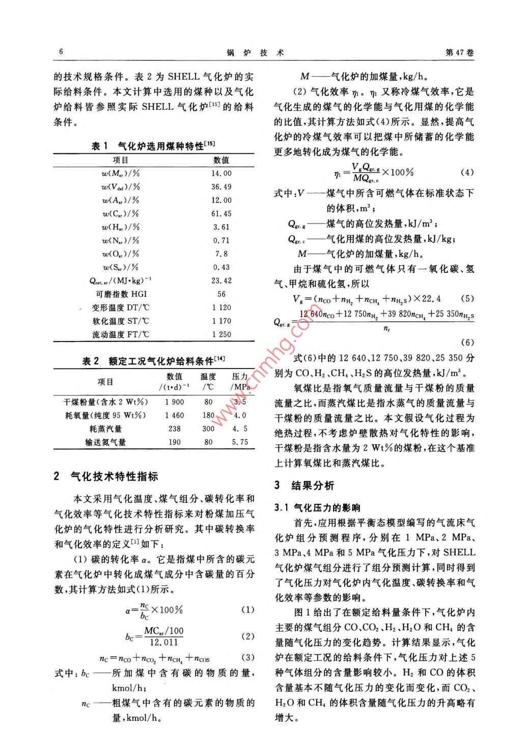 第47卷第2期鍋爐技術(shù)Vol. 47, No. 22016年3月BOILER TECHNOLOGYMar. ,2016煤粉加壓氣化爐操作參數(shù)對氣化特性的影響楊震',郭琴琴,劉銀河2(1.上海鍋爐廠有限公司,上海200245; 2.西安交通大學(xué)能源與動力工程學(xué)院,陜西西安710049)摘要:采用基于平衡態(tài)模型的氣流床氣化爐煤氣組分預(yù)測程序,分析研究了氣化壓力、氧煤比以及蒸汽煤比等操作參數(shù)對氣化溫度、煤氣組分碳轉(zhuǎn)化率和氣化效率的影響規(guī)律。研究結(jié)果表明:氣化壓力對氣化特性指標(biāo)影響甚微,而氧煤比和蒸汽煤比的影響較為顯著。隨氧煤比的增加,氣化溫度升高,碳轉(zhuǎn)化率升高,氣化效率先升高再降低,CO濃度先增加后降低。CH,的體積濃度可用于預(yù)測氣化溫度。在蒸汽煤比較低時(shí),提高蒸汽煤比可增加H2的濃度,提高碳轉(zhuǎn)換率和氣化效率,但進(jìn)- -步提高蒸汽煤比僅會降低氣化爐內(nèi)的氣化溫度,提高H2O和CO2濃度。對于所研究的煤種,合理的氧煤比應(yīng)在0.7左右,合理的蒸汽煤比在0.1左右。關(guān)鍵詞:煤氣化;操作參數(shù);氣化特性中圖分類號:TQ546文獻(xiàn)標(biāo)識碼:A文章編號:1672 -4763(2016)02-0005-06熵達(dá)到最大值,自由焓達(dá)到最小值,各個(gè)反應(yīng)的0前言正反應(yīng)速度等于逆反應(yīng)速度。由于氣流床氣化煤粉氣化田是指煤粉在氣化爐中高溫高壓爐的操作溫度和操作壓力均較高,氣化反應(yīng)速條件下與氣化劑發(fā)生化學(xué)反應(yīng),將固體可燃物轉(zhuǎn)率較快,在氣化爐爐膛內(nèi)氣化過程進(jìn)行的較為;化成可燃?xì)怏w的過程,它涉及到流動、傳熱、傳質(zhì)徹底,接近平衡狀態(tài)。因此,平衡態(tài)模型可以很和化學(xué)反應(yīng)等復(fù)雜過程。通常可以選用的氣化好的應(yīng)用于對氣化爐煤氣的組分進(jìn)行預(yù)測分析劑有水蒸氣、氧氣和二氧化碳??扇?xì)怏w成分主研究。徐越等[1]以SHELL煤氣化工藝為基要為CO、H2和CH,伴生的不可燃?xì)怏w有CO2礎(chǔ),采用ASPEN軟件建立了干煤粉加壓氣流床和H2O,此外還有少量硫化物、烴類產(chǎn)物和其他氣化過程模擬模型,對干煤粉加壓氣流床氣化微量成分。工藝的性能進(jìn)行了數(shù)學(xué)模擬和性能研究。周志學(xué)者們8]對氣流床氣化爐粗煤氣組分份杰[2等建立了基于化學(xué)平衡的數(shù)學(xué)平衡模型,額煤氣產(chǎn)率隨煤種、給煤量、給氧量、給蒸汽量并研究證實(shí)了對于氣化溫度高達(dá)1 400 C~以及氣化爐的氣化壓力、氣化溫度等操作參數(shù)1 600 C的干煤粉氣化可以應(yīng)用化學(xué)平衡的方之間的關(guān)系開展了大量研究,以得出有效的數(shù)法來簡化氣化爐的數(shù)學(xué)模型。學(xué)建模方法來進(jìn)行煤氣組分的預(yù)測,進(jìn)而獲得本文采用根據(jù)平衡態(tài)模型編寫的氣流床氣氣化爐的相關(guān)技術(shù)特性指標(biāo),并指導(dǎo)氣化爐的化爐的煤氣組分預(yù)測程字序[18141,以SHELL氣化設(shè)計(jì)與運(yùn)行。氣流床氣化爐的數(shù)學(xué)模型可分為爐[15]實(shí)際的給料條件為計(jì)算邊界,分析了氣化平衡態(tài)模型和考慮氣化反應(yīng)過程的動力學(xué)模壓力、氧煤比及蒸汽煤比對氣化溫度、煤氣組型[°]。平衡態(tài)模型[10]是-種基于化學(xué)反應(yīng)平衡成、碳轉(zhuǎn)化率、氣化效率等技術(shù)特性指標(biāo)的原理對化學(xué)反應(yīng)始末狀態(tài)進(jìn)行宏觀描述的計(jì)算影響。方法。它忽略了化學(xué)反應(yīng)的具體微觀過程所帶1煤粉加壓氣化爐 的給料條件來的影響,只對反應(yīng)最終達(dá)到的穩(wěn)定狀態(tài)即平衡態(tài)進(jìn)行綜合分析?;瘜W(xué)反應(yīng)達(dá)到平衡態(tài)后,本文對SHELL氣化爐的煤氣組分份額進(jìn)其反應(yīng)產(chǎn)物的組分份額維持恒定,此時(shí)系統(tǒng)的行了預(yù)測計(jì)算。如表1所示為氣化爐選用煤種收稿日期:2015-09-10基金項(xiàng)目:上海市科學(xué)技術(shù)委員會科委資助(14dz1200100)作者簡介:楊震(1968一,男,博上,教授級高級工程師,主要從事煤的高效清潔燃燒和氣化研究。6鍋爐技術(shù)第47卷的技術(shù)規(guī)格條件。表2為SHELL氣化爐的實(shí)M-氣化爐的加煤量,kg/h。.際給料條件。本文計(jì)算中選用的煤種以及氣化(2)氣化效率η。η又稱冷煤氣效率,它是爐給料皆參照實(shí)際SHELL氣化爐[15]的給料氣化生成的煤氣的化學(xué)能與氣化用煤的化學(xué)能條件。的比值,其計(jì)算方法如式(4)所示。顯然,提高氣化爐的冷煤氣效率可以把煤中所儲蓄的化學(xué)能表1氣化爐選用煤種特性[15]更多地轉(zhuǎn)化成為煤氣的化學(xué)能。項(xiàng)目數(shù)值: V。QX1w(M,)/%14. 00.η= MOREX 10%(4)w(Vau)/%36. 49式中:V一煤氣中所含可燃?xì)怏w在標(biāo)準(zhǔn)狀態(tài)下w(Am)/%12. 00w(..)/%61.45的體積,m3 ; .w(H.)/%3.61Qgg煤氣的高位發(fā)熱量,kJ/m';w(N.,)/%0.71Qg.c一氣化 用煤的高位發(fā)熱量,kJ/kg;w(O,)/%7.8M-氣化爐 的加煤量,kg/h。w(S,)/%0.43由于煤氣中的可燃?xì)怏w只有一氧化碳、氫Qnmn/(MJ.kg) - '23. 42氣、甲烷和硫化氫,所以可磨指數(shù)HGI56Vg=(nco+nH,十ncH, +nH,s)X22. 4(5)變形溫度DT/C1 12012 640nco+ 12 750mn, +39 820ncH, +25 350nH,s軟化溫度ST/C1 170流動溫度FT/C1 250(6)表2額定工況氣化爐給料條件[14]式(6)中的12 640、12 750、39 820、25 350分溫度壓力別為CO、H2、CH,、H2S的高位發(fā)熱量,kJ/m3。/(t