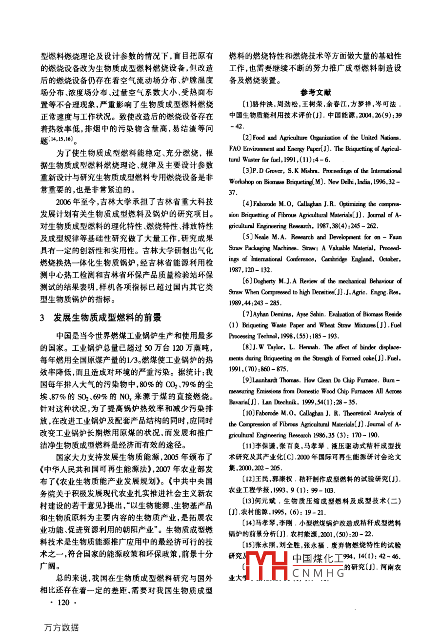 第27卷,總第154期〈節(jié)能技術》Vol 272009年3月,第2期ENERGY CONSERVATION TECHNOLOGYMar.2009,No.2生物質成型燃料研究現(xiàn)狀及進展蘇俊林,趙曉文,王巍(1.吉林大學熱能工程系,吉林長春130025;2.吉林大學汽運系,吉林長春130025)摘要:本文討論了發(fā)展生物質成型燃料的意義,詳細介紹了國內外生物質成型燃料的發(fā)展歷程及現(xiàn)狀,介紹了一些目前采用的新技術和存在的問題。最后對生物質成型燃料的未來進行了展望,指出生物質成型燃料在節(jié)能及環(huán)保方面將大有作為。關鍵詞:生物質成型燃料;研究現(xiàn)狀;發(fā)展應用中圖分類號:TK16文獻標識碼:A文章編號:1002-6339(2009)02-0117-04Research Status and Development of the Biomass Briquette FuelSU Jun-lin', ZHAO Xiao-wen, WANG Wei?(1. Department of Thermal Energy Engineering, Jilin University, Changchun 130025, China;2 Department of Automobile Transportation Engineering, Jilin University, Changchun 130025, China)Abstract: This paper discussed the significance of developing biomass briquette fuel. The development andreasearch status of biomass briquette fuel technology both home and abroad were reviewed intechnologies and related existing problems were depicted. Finally, the future development of the biomass bri-quette fuel was forecasted and authors concluded that the biomass briquette fuel would play a positive role inpromoting energy- savings and environment protectionKey words: biomass briquette fuel; research status; application development1發(fā)展生物質成型燃料的意義加工和使用有關,這些礦物燃料燃燒后放出大量的CO2、SO2、NO,被認為是形成大氣環(huán)境污染、產生酸長期以來,石油、天然氣、煤炭等化石燃料一直雨以及溫室氣體等地區(qū)性環(huán)境問題的根源是人類消耗的主要能源,并為人類經(jīng)濟的繁榮、社會我國是一個農業(yè)大國生物質能資源十分豐富的進步和生活水平的提高做出了很大的貢獻。但僅農作物秸稈折合7億t左右,而目前年實際使用是由于煤、石油和天然氣等礦物資源是不可再生量僅為22億t左右。因此我國的生物質資源的的,資源是有限的正面臨著逐漸枯竭的危險因此利用還有很大的開發(fā)潛力①)。生物質能在我國商業(yè)它們不是人類所能長久依賴的理想資源。再者目前用能結構所占的比例極小。植物約有一半棄于荒野地球所面臨的環(huán)境危機直接或間接的與礦物燃料的未能利用甚至焚燒不但利用水平低造成資源的嚴重浪費,且污染環(huán)境。所以充分合理開發(fā)使用生物質能國的能源利用環(huán)培和人類的生態(tài)環(huán)境,收稿日期2009-01修訂稿日期20003-16中國煤基金項目:吉林省重大科技發(fā)展計劃資助項目(20003加某化二重要的意義作者簡介:蘇俊林(1953-),男,博士,教授。研究方向:潔凈燃CNMHG、液化燃料及固化燒技術鍋爐及換熱器強化傳熱,節(jié)能技術燃料。目前,在技術經(jīng)濟上最為可行的生物質能利用技術就是固化——即生物質能致密成型燃料技2生物質成型燃料的發(fā)展概況術生物質成型燃料的優(yōu)點:21國外生物質成型燃料及燃燒設備發(fā)展現(xiàn)狀1.1清潔燃燒隨著社會經(jīng)濟的發(fā)展與人們生活水平的提高,(1)飛灰極少。生物質灰分一般少于3%(稻殼木材下腳料、植物秸稈的剩余量越來越大由于這些等除外),從而簡化了燃燒裝置的除灰設備。廢棄物都是密度小、體積膨松,大量堆積,銷毀處理(2)生物質成型燃料最主要燃燒成分是揮發(fā)分,不但需要一定的人力物力且污染環(huán)境因此世界一般含量在70%~80%以上,煙塵產生很少,不冒各國都在探索解決這一問題的有效途徑2)。黑煙。美國在20世紀30年代就開始研究壓縮成型燃(3)生物質的燃燒通常不會影響自然界碳的自料技術及燃燒技術,并研制了螺旋壓縮機及相應的然循環(huán)即使不燃燒利用、不燒荒生物質也會在自燃燒設備,現(xiàn)有9個生產能力250vd的生產廠,另有然消化過程中放出CO。因此生物質能的排碳量6個州興建了日產量為300的樹皮成型燃料加工廠不會超出其生長期間所吸收的碳量從而實現(xiàn)CO及較多的專業(yè)燃燒設備廠(3)。日本在20世紀30年的零排放。代開始研究機械活塞式成型技術處理木材廢棄物,(4)生物質本身N含量比煤少得多,這對于減1954年研制成棒狀燃料成型機及相關的燃燒設備,少NO的生成非常有利1983年前后從美國引進顆粒成型燃料成型技術及(5)燃燒中SO,排放量較少。生物質含硫量相應燃燒設備,并發(fā)展成了日本壓縮成型及燃燒的般少于01%,不需要煙氣脫硫裝置從而降低了成工業(yè)體系。到1987年有十幾個顆粒成型工廠投人本,又有利環(huán)境保護。運行,年產生物顆粒燃料十幾萬噸,并相繼建立了(6)降低重金屬污染物的排放。研究表明煤中批專業(yè)燃燒設備廠(4,70年代后期,由于出現(xiàn)世界能源危機,石油價格上漲,西歐許多國家如芬蘭、比含有多種微量元素如:As、Hg、V、Pb、zn、Se、Co、Ni利時、法國、德國、意大利等國家也開始重視壓縮成C等,其中許多是有毒有老的重金屬元素。而生型技術及燃燒技術的研究各國先后有了各類成型物質中基本不含重金屬。機及配套的燃燒設備。法國近年來也開始研究壓縮1.2優(yōu)良的經(jīng)濟性(1)我國生物質資源豐富,價格低廉,用生物質塊燃料及燃燒設備,并達到了應用階段。比利時研制成功的“T7”螺旋壓塊機。聯(lián)邦德國KAHL系列作燃料降低了原材料的成本壓粒機及