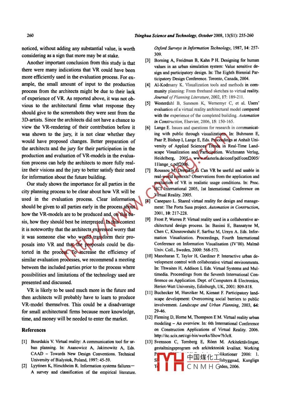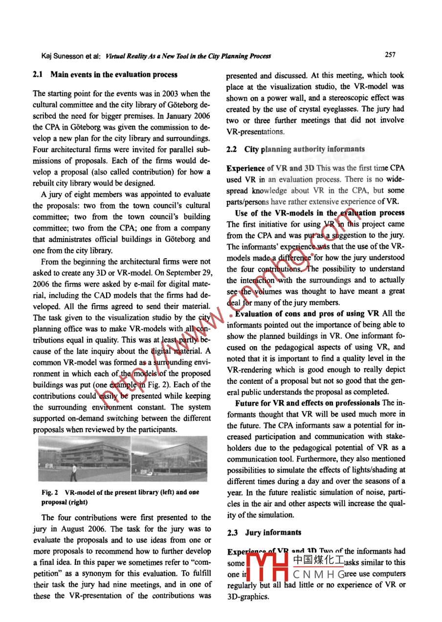 TSINGHUA SCIENCE AND TECHNOLOGYISSN 1007-0214 41/67 pp255-260Volume 13, Number S1, October 2008Virtual Reality As a New Tool in the City Planning ProcessKaj Sunesson", Carl Martin Alwood, Dan Paulin, lona Heldal,Mattias Roupe, Mikael Johansson, Borje WesterdahlChalmers University of Technology, SE 412 96 Goteborg, SwedenAbstract: The introduction of vitual reality (VR)-models in the city planning process will cause changes inthe traditional roles of the involved parties. In order to better understand some of these changes, the eventsinvolving the use of VR-models in an architectural competition conceming rebuilding-proposals for the citylibrary in a Swedish city were analyzed. The study shows that VR was introduced into the competition as anextra add-on and that the VR-presentation was experienced as useful by the jury. The transformation of thearchitects' contributions into VR was experienced as problematic by the architects, partly because they lostfull control over the presentation. In the future architects are likely to have to produce the VR-models fortheir proposals themselves. This may make it more difcult for smaller architectural firmns to enter the marketbut their proposals will be more accessible to a wider group of stakeholders.Key words: architecture; architectural competition; city planning; construction planning; VR-models(reviewed in Ref. [1]) listed four relevant interest cate-Introductiongories in the urban planning process: (1) city planners,(2) architects working for clients, (3) the clients them-New technology often causes disruption and change inselves and (4) the general public (see Ref. [2]). Suchestablished practices. In the future the use of virtual re-broader participation may lead to better sustainabilityality (VR) models is likely to increase in the city plan-of the projected constructions since they might betterning process. This is likely to lead to cbanges in howmeet the needs of the future users.the activities and roles in the early parts of city plan-The goal of a broader participation in the buildingning processes are carried out. This paper describes theprocess is not easy to accomplish (see Ref. [3]). Foreffects of the use of VR-models in an architecturalexample, within the traditional and conventional wayscompetition evaluation process from the standpoint ofof working with the urban development process, manydifferent professions, and it discusses how VR can in-different types of communication- and decision mate-fluence the roles of concerned professions, e.g.,rial (e.g.. 2D drawings, sketches and perspective draw-architects.ings) are used by professional groups中and it is some-(1) Current developmentstimes dificult for the public and non-technical special-In modem, high-quality, professional city planning itists to understand from this material what the projectsis not only the visions of politicians that govern the de-entail.sign of urban development. A broader circle of relevant(2) Previous studies on VR in the constructionparties should be able to exert an influence. Hall 1996pro |中國煤化工Received: 2008-05-30In this iCNMH G's provide many.Y..benefits m uc Cly lulnww pIuccss by offering a rep-$$ To whom correspondence should be addressed.E-mail: suneson@chalmers.seresentation that is closer to common experience than256Tsinghua Science and Technology, October 2008, 13(S1): 255-260other methods of presenting a concept5l. VR-modelsremaking of the library is an issue of great importancean make it possible for all interested parties to haveto the city. This is also evidenced by the lively debateaccess to a common representational medium, whichin the local newspaper that followed the outcome ofmakes it easier for them to achieve an understanding ofthe architectural competition described below.the planned building object on the basis of their ownVR-models have been used in urban planning andcommon sense. The issue of how VR functions as abuilding design projects in Goteborg for a number ofmeans of communication in the urban developmentyears.At present, the visualization studio at Chalmersprocess is insufficiently researched (also see Ref. [6]).University of Technology in Goteborg, works in closeAlthough exploratory usability-oriented studies involv-collaboration with the City Planning Authority (CPA)ing VR have been carried out (e.g, Ref. [7]), very fewin Goteborg to generate a large VR-model covering thestudies have been reported on the role that VR plays inmajor parts of the city. So far two specific projectsongoing city planning context (e.g., Refs. [8-12]). Thishave resulted. The first is associated with the redevel-research points to the need for “a more functional andopment of the city library, further described in thisflexible city model where various stakeholders can ac-study. To our knowledge, this is the first time that VR-cess and utilize the model according to their needs"2. technology has been used in this way for a publicTraditionally architects belong to a specialized pro-building in Sweden.fession and, sometimes, work in some isolation fromother parties in the building process. The production of1 Methodsketches and plans for new buildings in specific envi-1.1 Participantsronments is usually done according to profession-specifc criteria, like how best to combine aesthetics,In total, ten interviews with twelve informants from thefunction and form, how the features of the building in-different professions and groups involved in the com-teract with the properties of the environment, etc."3] Inpetition were conducted (CPA, 3; the Jury 3; archiects,a more pessimistic approach, Ref. [1] suggested tha4; the 3D-artists who made the VR. model, 2).architects bave a reputation for submiting non-realisticperspectives, omitting parts of schemes that are not1.2 Study design and interviewsfully designed and even hiding areas of schemes be-Semi-structured interviews were made at the infor-hind carefully placed trees and other features.mants' workp