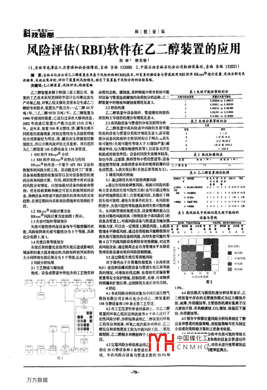 利授愿科|技|論|壇風(fēng)險(xiǎn)評(píng)估(RBI軟件在乙二醇裝置的應(yīng)用劉字1何玉華(1、古林市龍?zhí)秴^(qū)人力資源和社會(huì)保障局,吉林吉林132002、中國石油吉林石化分公司機(jī)動(dòng)設(shè)備處吉林言林132021)摘要:古林石化分公司乙二醇裝置采用基于風(fēng)險(xiǎn)的檢測(RB技術(shù),對(duì)裝重的靜設(shè)備與管逮使用RBI軟件RB進(jìn)行定量定性分析及失妣概率、失效后果評(píng)價(jià)評(píng)估了置的風(fēng)險(xiǎn)情況,制定了置基于風(fēng)險(xiǎn)分析的檢驗(yàn)策略關(guān)鍵詞:乙二醇裝置;風(fēng)險(xiǎn)評(píng)估;檢驗(yàn)策略置的工藝技術(shù)采用美國科學(xué)設(shè)計(jì)公司氧化法生對(duì)設(shè)備與管道造成腐蝕的雜質(zhì)組分的總稱乙二二從悉效可能性等級(jí)劃分產(chǎn)環(huán)氧乙烷環(huán)氧乙烷無催化直接水合生成乙二醉裝置中的物流和腐蝕流情況見表32.2211120:00醇的專利技術(shù)裝置生產(chǎn)能力為:乙二醇10萬22損傷機(jī)理噸/年,二乙二醇9570萬噸年。乙二醇裝置為乙二醉裝置中設(shè)備部件、管道潛在的損傷2.222:2021996年投用的裝置已進(jìn)行過多次大修和改造。類別和主導(dǎo)損傷機(jī)理分布情況見表42002年改造后裝置生產(chǎn)能力達(dá)到1510萬噸23高風(fēng)險(xiǎn)設(shè)備與管道的分布及原因分析表2失效后果等級(jí)劃分年。近年來裝置500單元管線塔、嘏等出現(xiàn)不乙二醇裝置中高風(fēng)險(xiǎn)或中風(fēng)險(xiǎn)但失效可能同程度的泄漏現(xiàn)象特別是管線彎頭及接管焊縫性高的設(shè)備與管道分類統(tǒng)計(jì)情況見表5,而導(dǎo)致處出現(xiàn)滑漏較為明顯塔罐沿封頭焊縫裂紋撕部分設(shè)備風(fēng)險(xiǎn)高的主要原因有以下兩點(diǎn):高失裂較長所以開展風(fēng)險(xiǎn)評(píng)估尤其重要。項(xiàng)目范圍效可能性(失效可能性等級(jí)大于3)腐蝕嚴(yán)重(減d到120)s為乙二醇裝置148臺(tái)靜設(shè)備及159條管道。薄速率高應(yīng)力腐蝕敏感性高等),且設(shè)備無歷史1RB軟件RBB介紹檢驗(yàn)或檢驗(yàn)效率低;設(shè)備的同類失效概半較高,表3物流和腐蝕流RB軟件RBB的特點(diǎn)與作用如空冷器過濾器換熱管和小管徑管道等;設(shè)備x和武(武(RBy軟件是一個(gè)基于APs81方法和建造壁厚較得如換熱管束和某些壁厚較薄的設(shè)xr數(shù)據(jù)庫的風(fēng)險(xiǎn)分析工具,其功能是對(duì)工廠裝置、備或管道。b高失效后果(失效后果等級(jí)為E)設(shè)備基礎(chǔ)數(shù)據(jù)的收集保存以及對(duì)設(shè)備拱傷機(jī)理3降低風(fēng)險(xiǎn)的措施表4乙二醇裝置損傷機(jī)理的分析和風(fēng)險(xiǎn)計(jì)算。作用:得到裝置中所有設(shè)備31通過降低失效可能性調(diào)整風(fēng)險(xiǎn)優(yōu)化策略和確定可延長檢驗(yàn)周的設(shè)響主表我在失效可能性方面也可以通過增加2·2:s,趨勢在預(yù)定期間內(nèi)采取預(yù)防措施和有效跟蹤手低失效可能性避免失效事件的發(fā)生。在風(fēng)險(xiǎn)矩罪1111B陣圖中失效可能性等級(jí)越高表明失效可能性越12RBe3風(fēng)險(xiǎn)計(jì)算方法大。從風(fēng)險(xiǎn)管理的角度出發(fā)設(shè)備管理的重點(diǎn)應(yīng)表5高風(fēng)臉或中風(fēng)險(xiǎn)但高失效可能性的RBee風(fēng)險(xiǎn)計(jì)算方法如圖1所示。放在對(duì)那些風(fēng)險(xiǎn)較高(特別是處于高風(fēng)險(xiǎn)區(qū))的設(shè)備與管線13失效可能性等級(jí)劃分備雨限建在總,,雷需需數(shù)風(fēng)險(xiǎn)矩陣將失效可能性分為5個(gè)等級(jí),具體管理水平降低風(fēng)險(xiǎn)通過在線檢驗(yàn)只能降低部分,,·化分見圖2表1高失效可能性的設(shè)備的風(fēng)險(xiǎn)而對(duì)失效可能性等一14失效后果等級(jí)劃分級(jí)4以下的高風(fēng)險(xiǎn)設(shè)備則沒有有效措施。對(duì)這類5失效后果的量化是按照失效后造成影響區(qū)高風(fēng)險(xiǎn)設(shè)備通過提高企業(yè)自身管理水平來降低例說啊域面積的最大值來確定的風(fēng)險(xiǎn)矩陣按照面積的管理系數(shù)是最有效的風(fēng)險(xiǎn)控制措施高風(fēng)障大小同樣將失效后果分為5個(gè)等級(jí)見表232通過降低失效后果調(diào)整風(fēng)險(xiǎn)中高尺2風(fēng)險(xiǎn)分析結(jié)果對(duì)于那些由于介質(zhì)毒性程度高(如高濃度2中風(fēng)險(xiǎn)21工藝物流與腐蝕流HS)或易燃易爆而使設(shè)備與管道失效后果等級(jí)物流:設(shè)備或管道中所包含的工藝物質(zhì)和高的情況,可增加在線監(jiān)測有毒物質(zhì)泄漏報(bào)警裝置等安全保護(hù)措施控制易燃易爆、有毒物質(zhì)一七的撒漏后果達(dá)到降低失效后果的目的圖4結(jié)論41本次風(fēng)險(xiǎn)分析的對(duì)象為中國石油天然氣44損傷模式與損傷機(jī)理分析結(jié)果顯示,乙股份有限公司吉林石化分公司乙二醇裝置的二醇裝置中存在的主要損傷模式為應(yīng)力腐蝕開148臺(tái)靜設(shè)備和159條主要工藝管道裂、減薄外部腐蝕等,主要損傷機(jī)理有氯離子應(yīng)42在工藝危害性審查的基礎(chǔ)上,對(duì)乙二醇力案蝕開裂、有機(jī)酸腐蝕CO2腐蝕保溫層下腐裝置的環(huán)氧乙烷反應(yīng)和洗滌等6個(gè)單元進(jìn)行了蝕外部蝕等定性風(fēng)險(xiǎn)分析分析結(jié)果表明乙二種裝置的環(huán)氧45報(bào)告中根據(jù)定