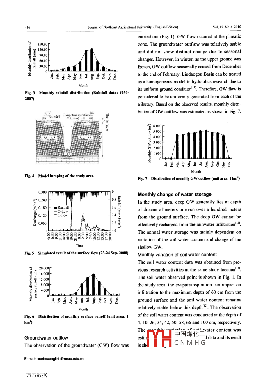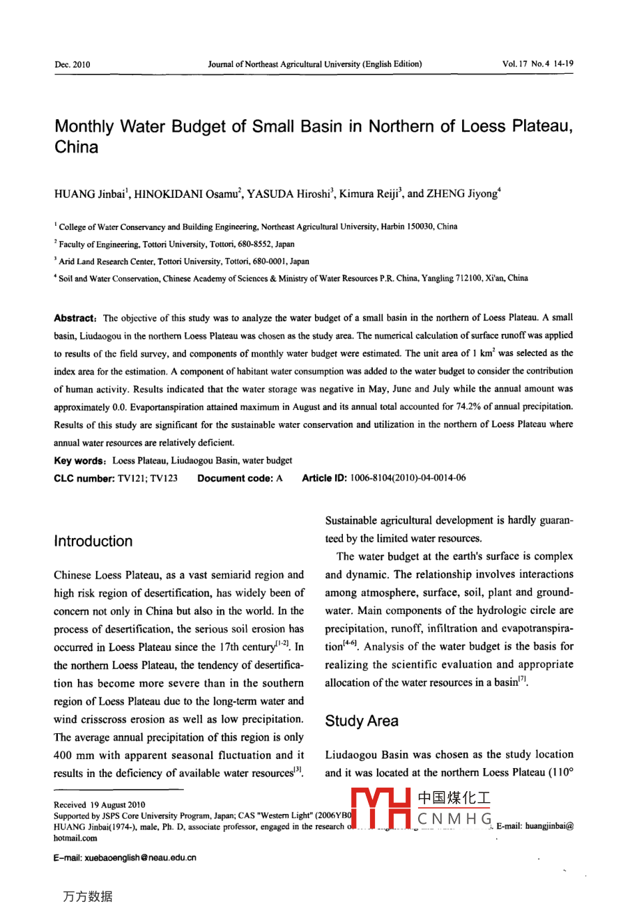 Dec. 2010Journal of Northeast Agricultural University (English Edition)Vol.17 No.4 14.19Monthly Water Budget of Small Basin in Northern of Loess Plateau,ChinaHUANG Jinbai', HINOKIDANI Osamu', YASUDA Hiroshi', Kimura Reij', and ZHENG Jiyong*' College of Water Conservancy and Building Engineering, Northeast Agricultural University, Harbin 150030, China'Faculty of Engineeing, Tottori University, Ttr, 680-8552, Japan' Arid Land Research Center, Tottori University, Tottori, 680-0001, Japan* Soil and Water Conservation, Chinese Academy of Sciences & Ministry of Water Resources P.R China, Yangling 712100, Xian, ChinaAbstract: The objective of this study was to analyze the water budget of a small basin in the northern of Loess Plateau. A smallbasin, Liudaogou in the northerm Loess Plateau was chosen as the study area. The numerical calculation of surface runoff was appliedto results of the field survey, and components of monthly water budget were estimated. The unit area of I km2 was selected as theindex area for the estimation. A component of habitant water consumption was added to the water budget to consider the contributionof human activity. Results indicated that the water storage was negative in May, June and July while the annual amount wasapproximately 0.0. Evaportanspiration attained maximum in August and its annual total accounted for 74.2% of annual precipitation.Results of this study are significant for the sustainable water conservation and utilization in the northem of Loess Plateau whereannual water resources are relatively deficient.Key words: Loess Plateau, Liudaogou Basin, water budgetCLC number: TV121; TV123Document code: A Article ID: 1006-8104(2010)-04 0014-06Sustainable agricultural development is hardly guaran-Introductionteed by the limited water resources.The water budget at the earth's surface is complexChinese Loess Plateau, as a vast semiarid region and and dynamic. The relationship involves interactionshigh risk region of desertification, has widely been ofamong atmosphere, surface, soil, plant and ground-concem not only in China but also in the world. In thewater. Main components of the hydrologic circle areprocess of desertification, the serious soil erosion hasprecipitation, runoff, infiltration and evapotranspira-occurred in Loess Plateau since the 17th centuryl2. In tion'+6!. Analysis of the water budget is the basis forthe northem Loess Plateau, the tendency of desertifica- realizing the scientific evaluation and appropriatetion has become more severe than in the southernallocation of the water resources in a basin'".region of Loess Plateau due to the long term water andwind crisscross erosion as well as low precipitation.Study AreaThe average annual precipitation of this region is only400 mm with apparent seasonal fluctuation and itLiudaogou Basin was chosen as the study locationresults in the deficiency of available water resources'!.and it was located at the northem Loess Plateau (110°中國煤化工Received 19 August 2010Supported by JSPS Core University Program, Japan; CAS "Westem Light" (2006YB0JMYHCNMHGE-mail: buangjinbai@HUANG Jinbai(1974-). male, Ph. D, associate professor, engaged in the research ohotmail.comE-mail: xuebaoengish@neau. edu.cnHUANG Jinbai et al. Monthly Water Budget of Small Basin in Norhermn of Loess Plateau, China.15.21'-1 10°23' E longitude and 38946'-38051' N lati-budget formula:tude, area: 6.89 km') (Fig. 1). Average annual rain-OW=P- -R- ET-U(1)fall is 430 mm and more than 70% of the total isreceived in the rainy season from June to Septem-Where, P is precipitation; R is runoff which includesber. Annual potential evapotranspiration generallysurface runoff and groundwater (GW) outflow; △W isexceeds 1 000 mm. The rigorous water and windchange of water storage; ET is evapotranspiration; U iscrisscross erosion causes severe degradation of thehabitant water consumption. The general distributionsecological environment and high risk of the desertifica-of water components of the water budget in the studytion. The population of Liudaogou Basin is 533 andlocation can be depicted by a schematic illustrationit has remained stable in recent years. The irrigated(Fig. 2). As an index, the water budget for the unit area,farmland area is 20.6 hm2. Vegetation cover only1 km', was evaluated in the present study.accounts for about 25 % of the total basin area.The field observation was conducted at the studyComponents of monthly water budgetarea mainly on rainfall, groundwater level and soilMonthly water incomewater content. Arrangement of the field observation isIn the closed basin, monthly water income refers toshown in Fig. 1.the precipitation received in every month. Accordingto rainfall data from 1956 to 2007, monthly rainfall110*21'Small rervoirdistribution was estimated as shown in Fig. 3.Dum-RunoffSurface runoffThe surface runoff was estimated by using a numericalWell No2calculation model which was developed by kinematicwave theory and channel networks. The study area,+ 38946'o Kainfll* Soil water contontLiudaogou Basin, was lumped to channel networks in: Grudwuerteve Groundwaer flowthe previous study (Fig. 4)"0.Fig. 1 Location of Liudaogou BasinThe validity of this runoff calculation mode1 wasverified by numerical simulation of the observed dataMethodology(observation point, Fig.1). The simulated result isshown in Fig. 5. Based on numerical calculation resultsEquation for water budget estimationof surface runoff from 2005 to 2008, the annual runoffConsidering habitant water consumption in the studyrate was estimated to 12%. Its monthly distribution isarea, a new factor U is added to the common water shown in Fig. 6.( Precipitation )↓(Evapotranspiration( Water storage)( RunoffWater uiztion「廠↓「Evaporation TranpirationSoil water change(Gw chang) Surface中國煤化工)rigatioYHCNMHGFig. 2 Schematic ilustration of water budgethttp: /pubish.neau.edu.cn.16.Joumal of Northeast Agricultural University (English Edition)Vol. 17 No.4 2010c
